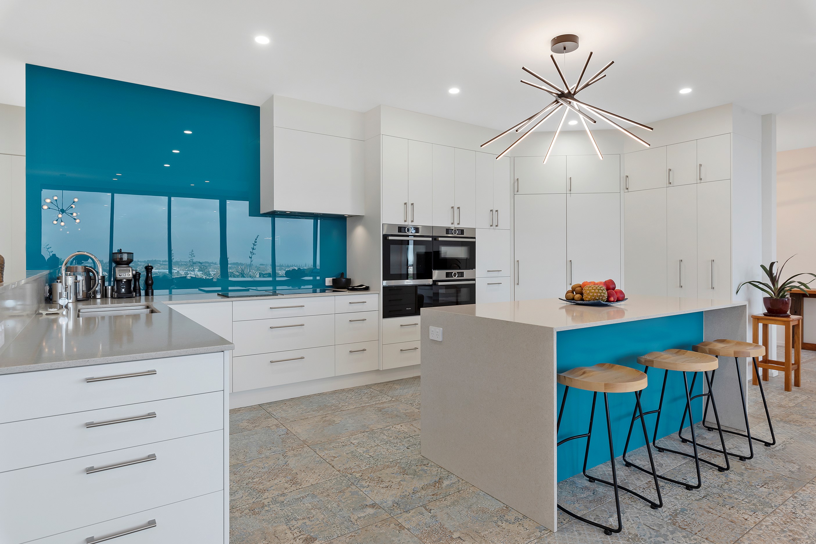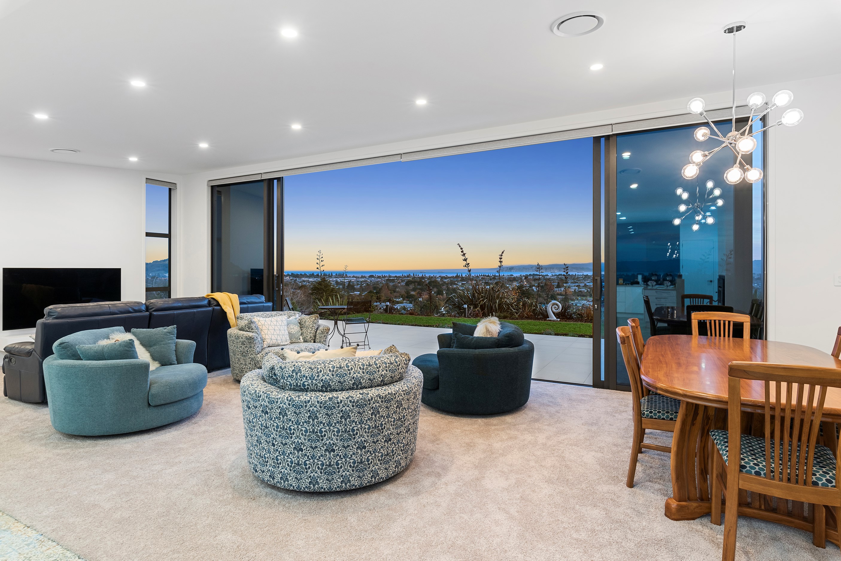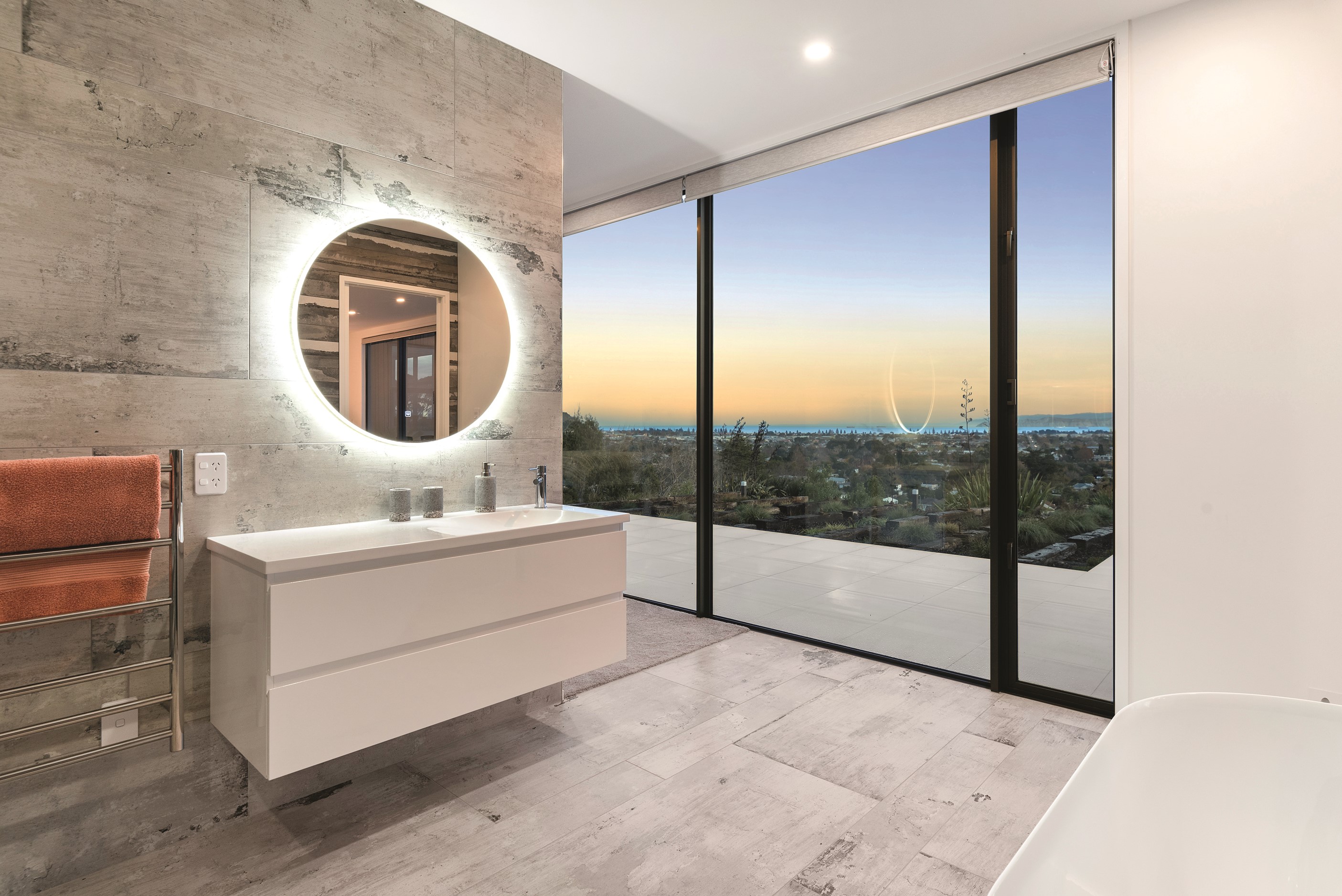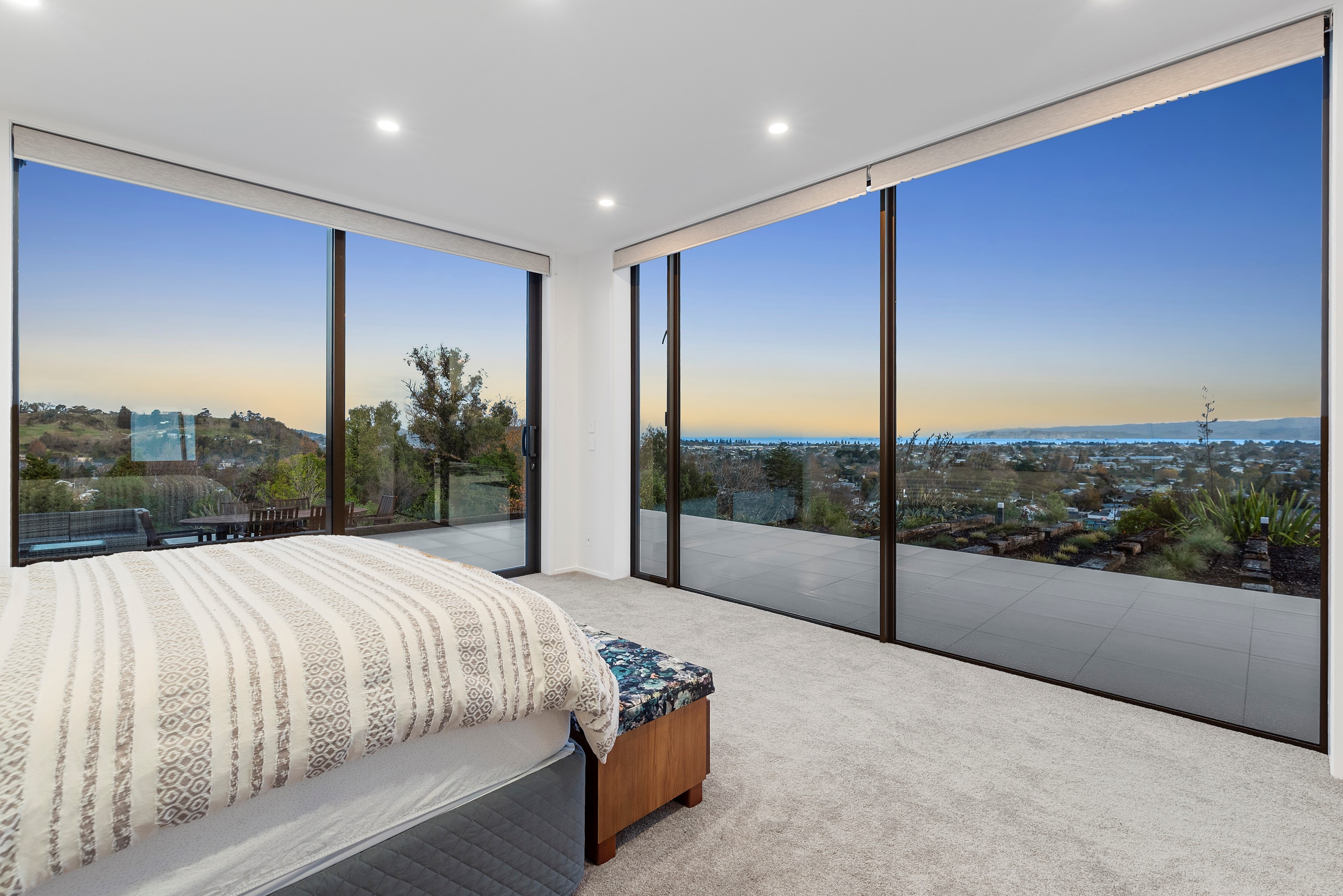 Enjoying hilltop positioning, this striking three-bedroom home has been built to capture picturesque views overlooking Tūranganui-a-Kiwa, Poverty Bay. Generously proportioned and precisely engineered glazing makes the most of the tranquil vista, while ample eaves provide shelter. Designed solely for two, the majority of the home’s 272sqm floorplan has been dedicated to the kitchen, living area and main bedroom wing. Two spare bedrooms and a large office allow ample space for the owners to work from home. Surrounded on two sides with panoramic views, the main bedroom wing is a haven. Floor-to-ceiling full-width glazing opens onto the attractively paved outdoor living area, which wraps its way around the home. The main suite is perfectly partitioned with a dressing room in the centre and the generous ensuite – complete with a freestanding bath – taking up full width at the back. Bold designer tiles, pops of colour in the kitchen and feature wallpaper add interesting touches and express the owners’ creative personalities.