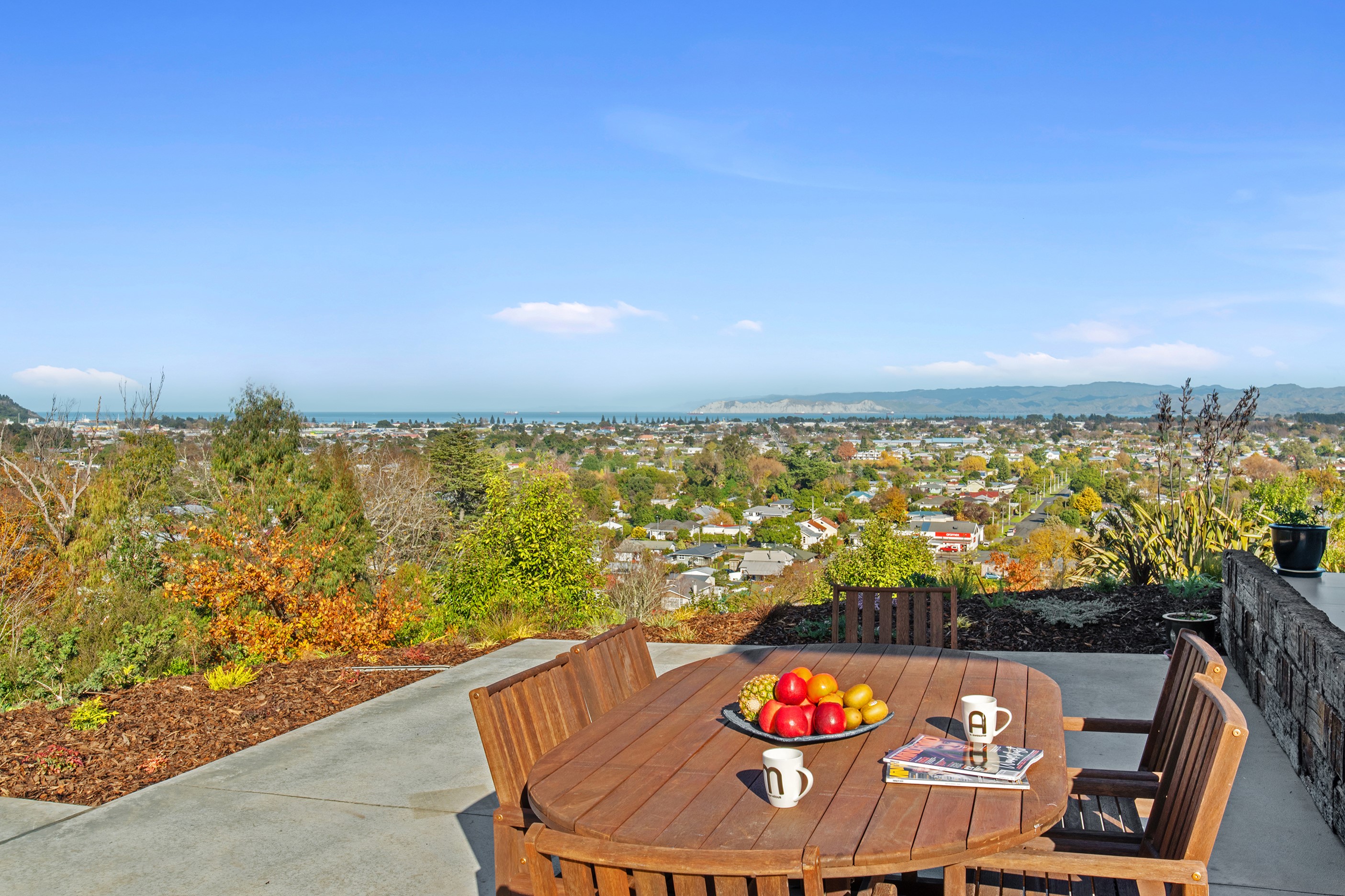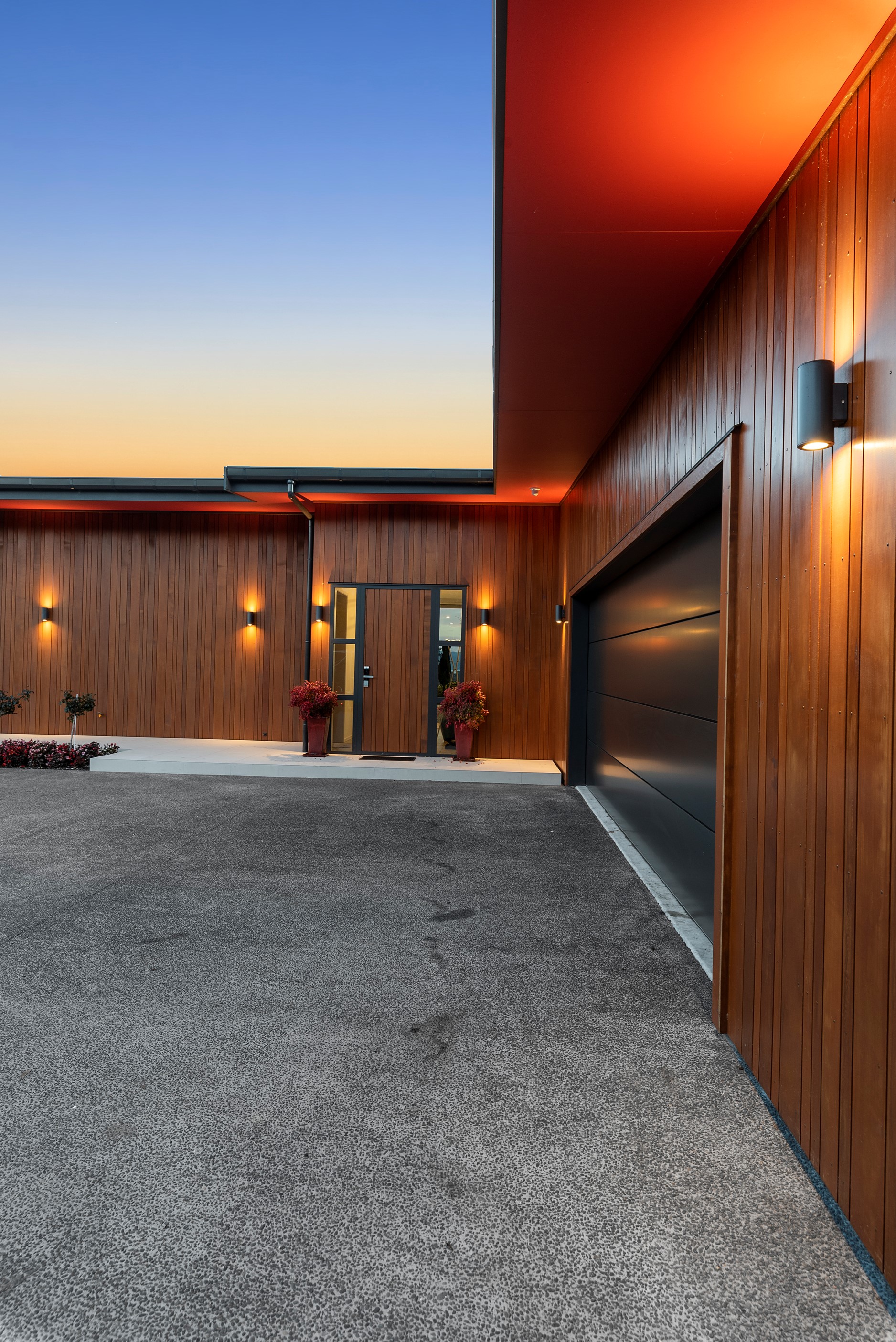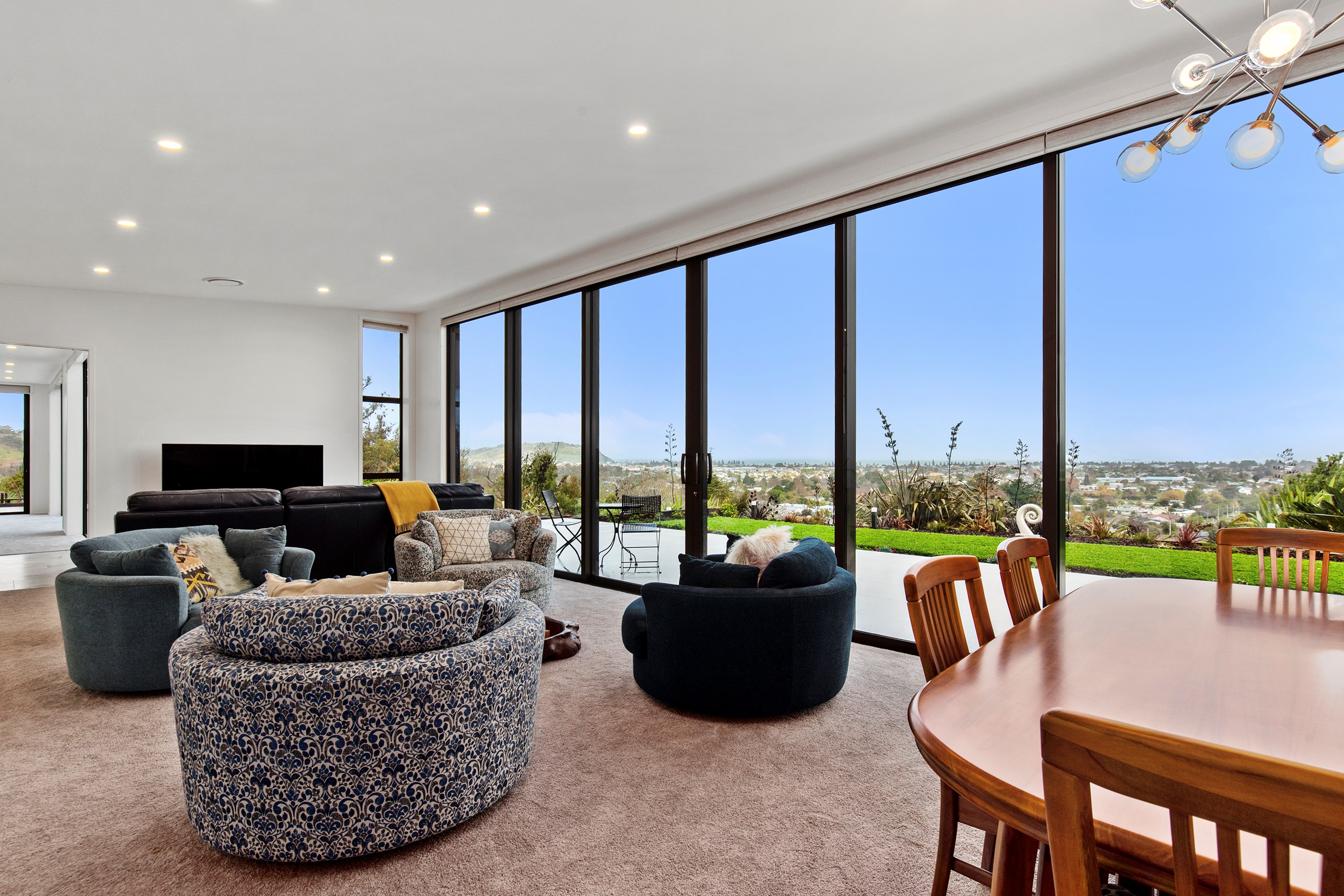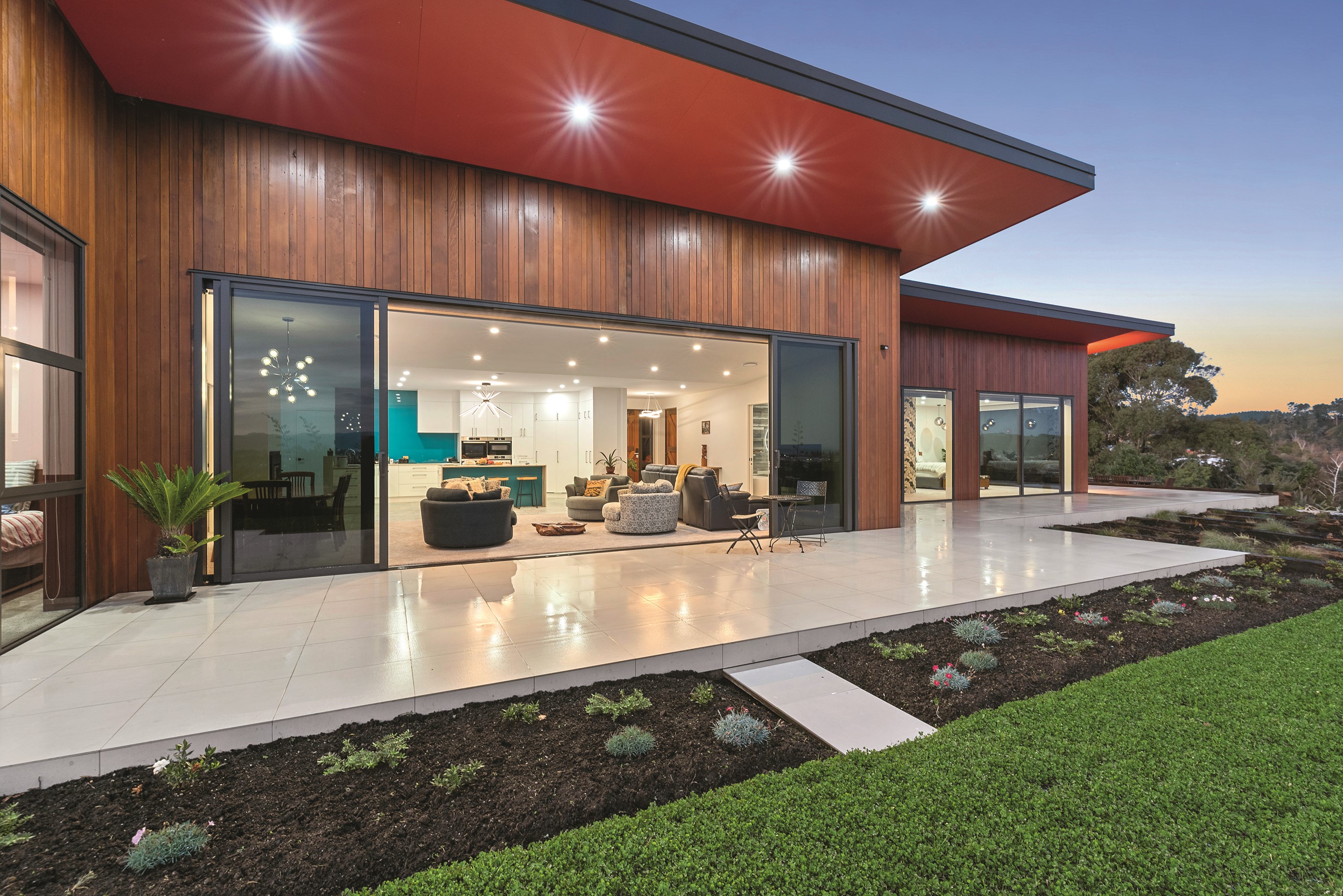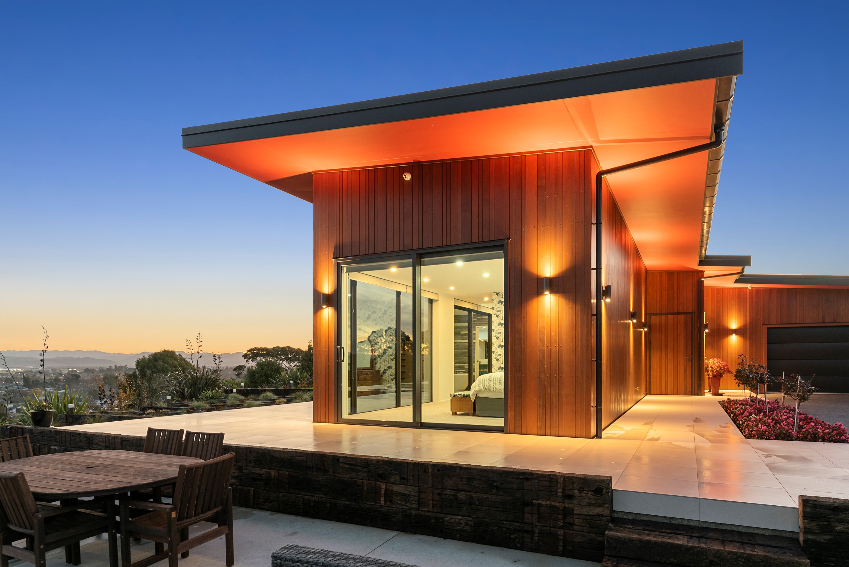Enjoying hilltop positioning, this striking three-bedroom home has been built to capture picturesque views overlooking Tūranganui-a-Kiwa, Poverty Bay. Generously proportioned and precisely engineered glazing makes the most of the tranquil vista, while ample eaves provide shelter. Designed solely for two, the majority of the home’s 272sqm floorplan has been dedicated to the kitchen, living area and main bedroom wing. Two spare bedrooms and a large office allow ample space for the owners to work from home. Surrounded on two sides with panoramic views, the main bedroom wing is a haven. Floor-to-ceiling full-width glazing opens onto the attractively paved outdoor living area, which wraps its way around the home. The main suite is perfectly partitioned with a dressing room in the centre and the generous ensuite – complete with a freestanding bath – taking up full width at the back. Bold designer tiles, pops of colour in the kitchen and feature wallpaper add interesting touches and express the owners’ creative personalities.