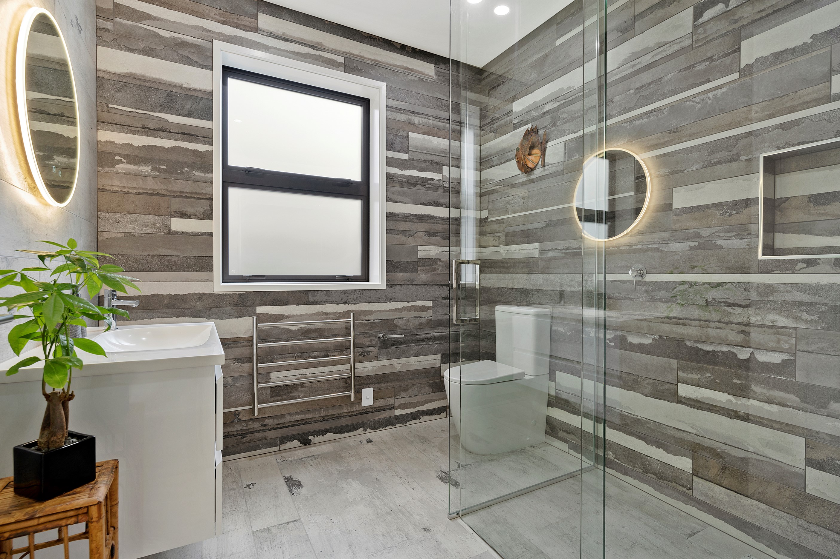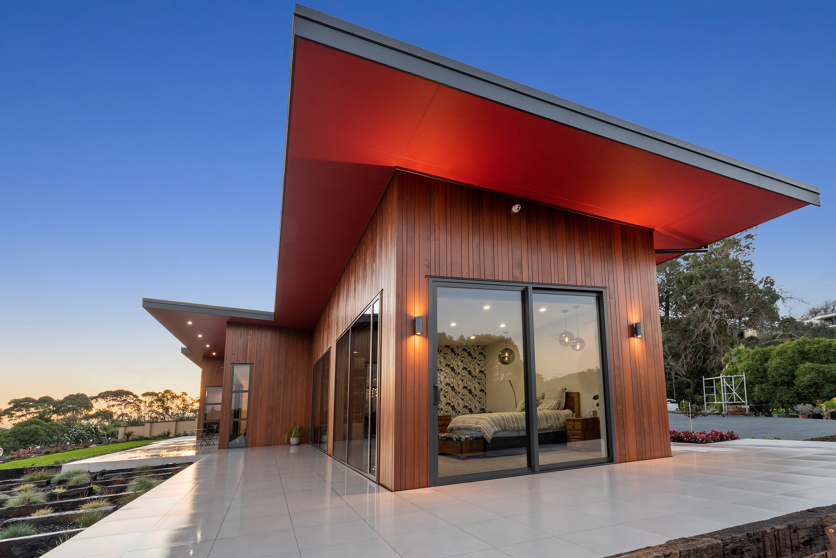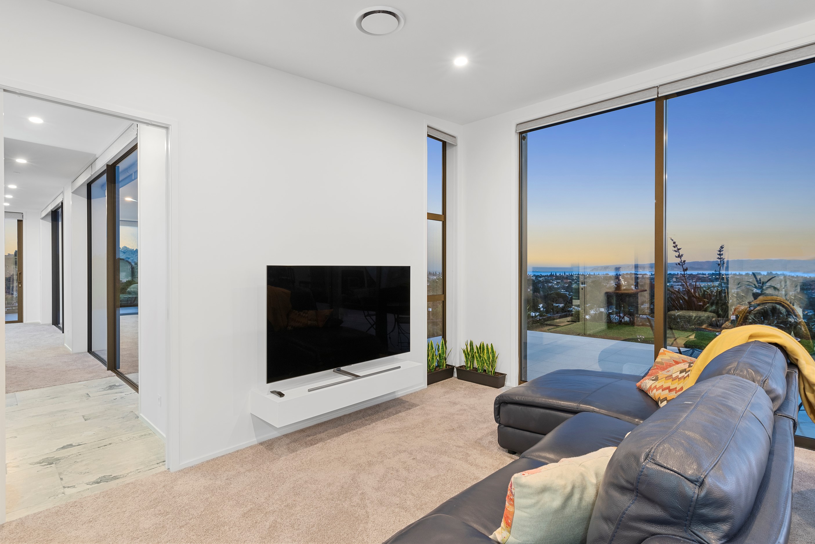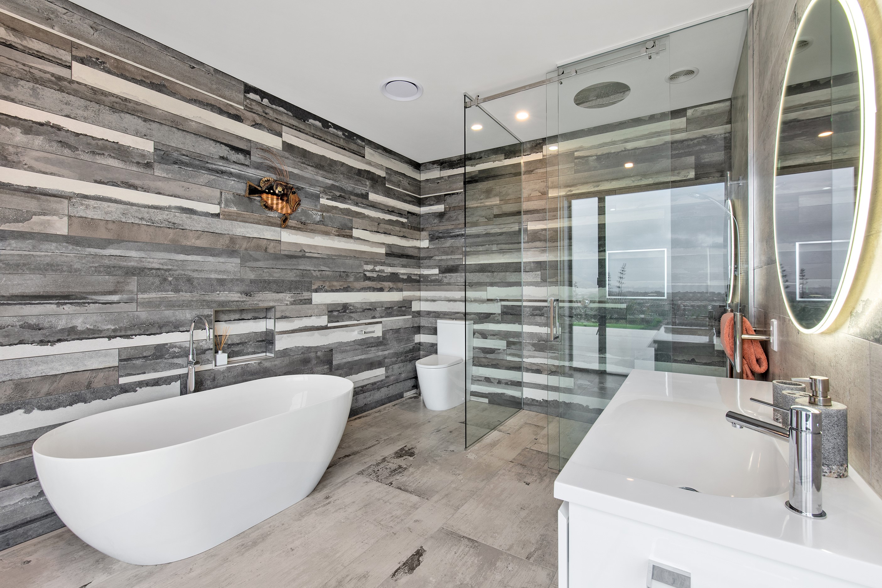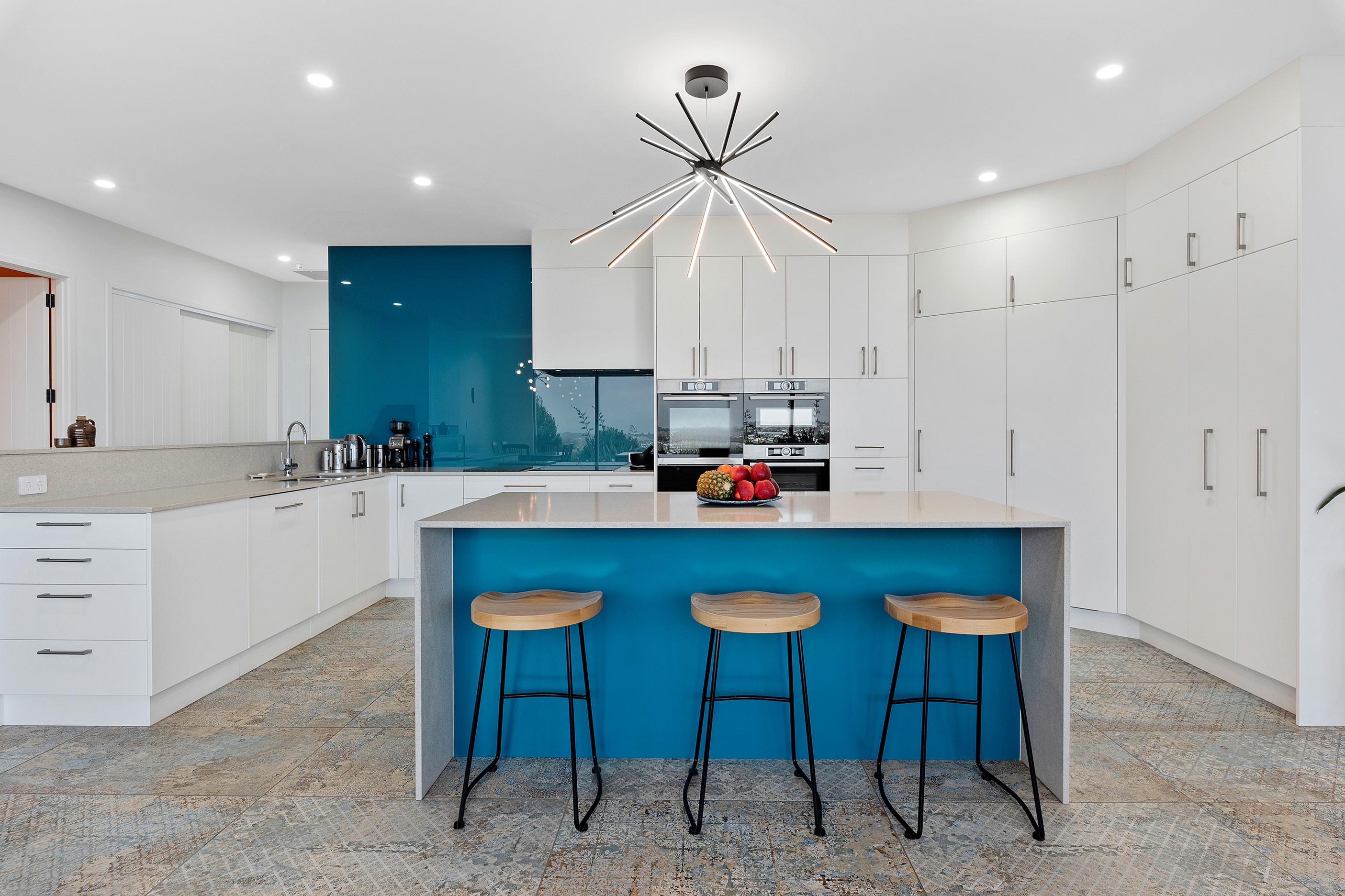Enjoying hilltop positioning, this striking three-bedroom home has been built to capture picturesque views overlooking Tūranganui-a-Kiwa, Poverty Bay. Generously proportioned and precisely engineered glazing makes the most of the tranquil vista, while ample eaves provide shelter. Designed solely for two, the majority of the home’s 272sqm floorplan has been dedicated to the kitchen, living area and main bedroom wing. Two spare bedrooms and a large office allow ample space for the owners to work from home. Surrounded on two sides with panoramic views, the main bedroom wing is a haven. Floor-to-ceiling full-width glazing opens onto the attractively paved outdoor living area, which wraps its way around the home. The main suite is perfectly partitioned with a dressing room in the centre and the generous ensuite – complete with a freestanding bath – taking up full width at the back. Bold designer tiles, pops of colour in the kitchen and feature wallpaper add interesting touches and express the owners’ creative personalities.