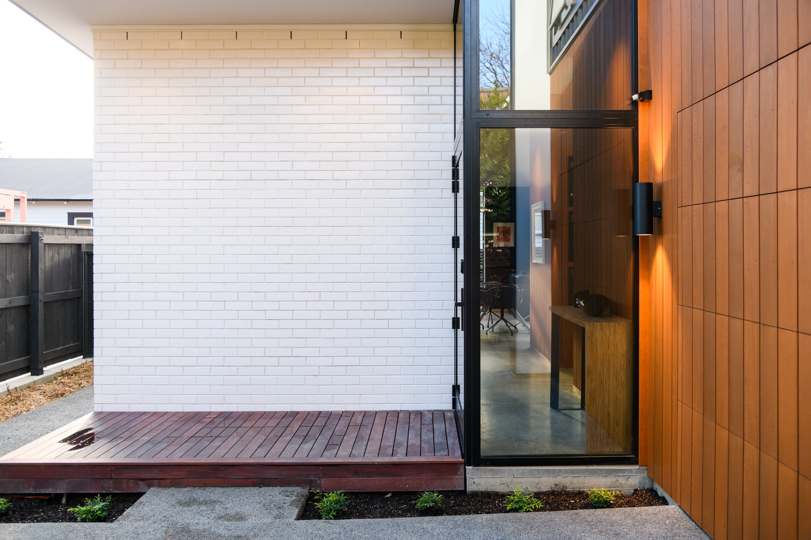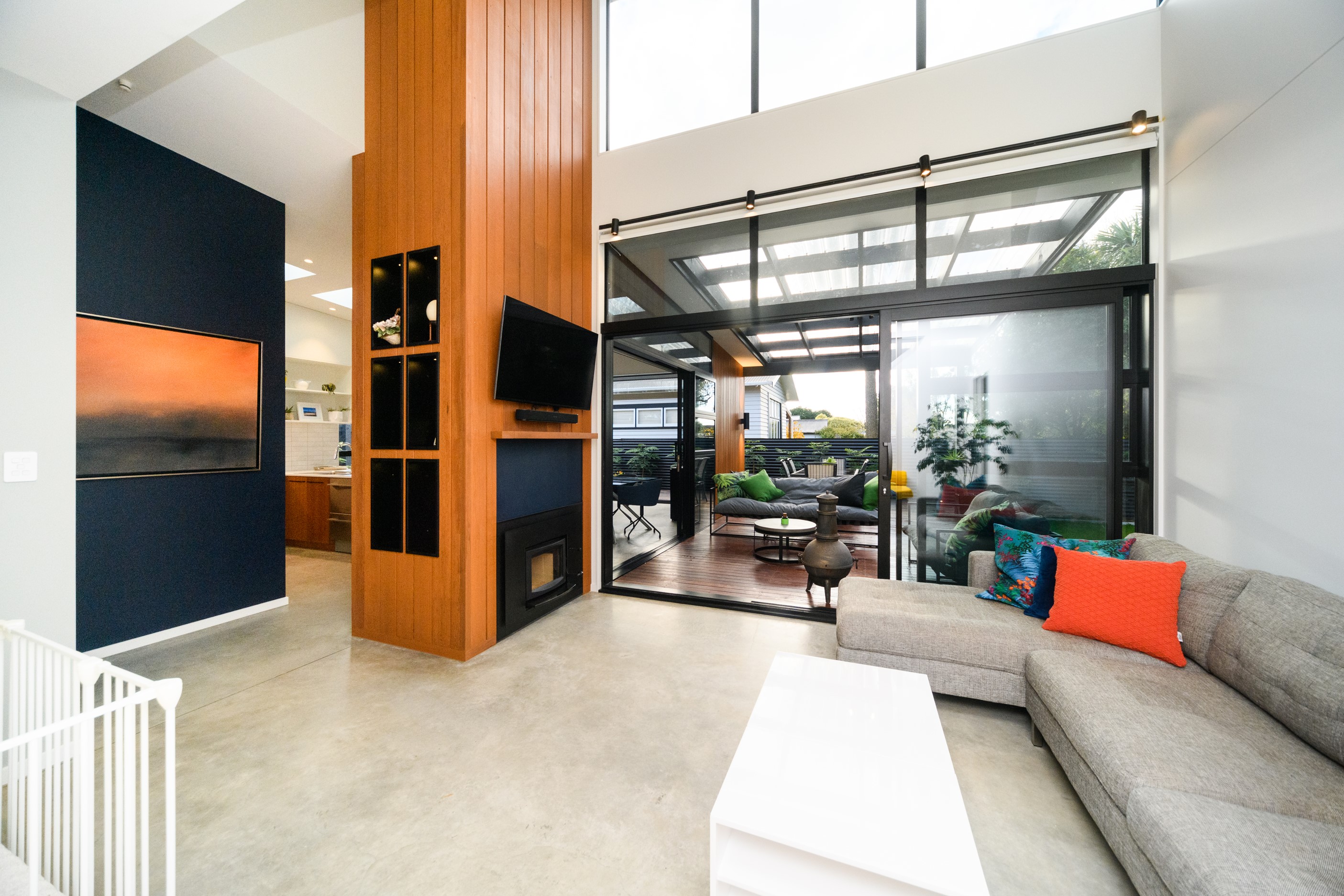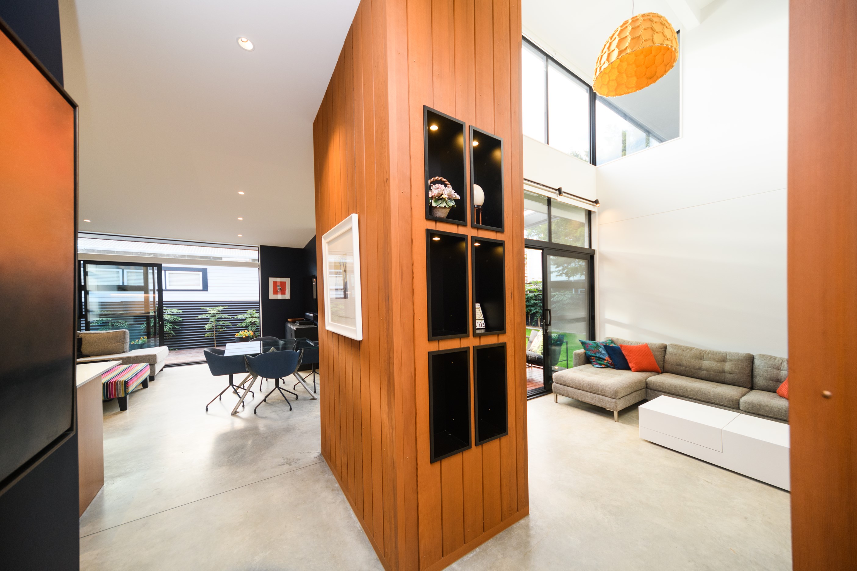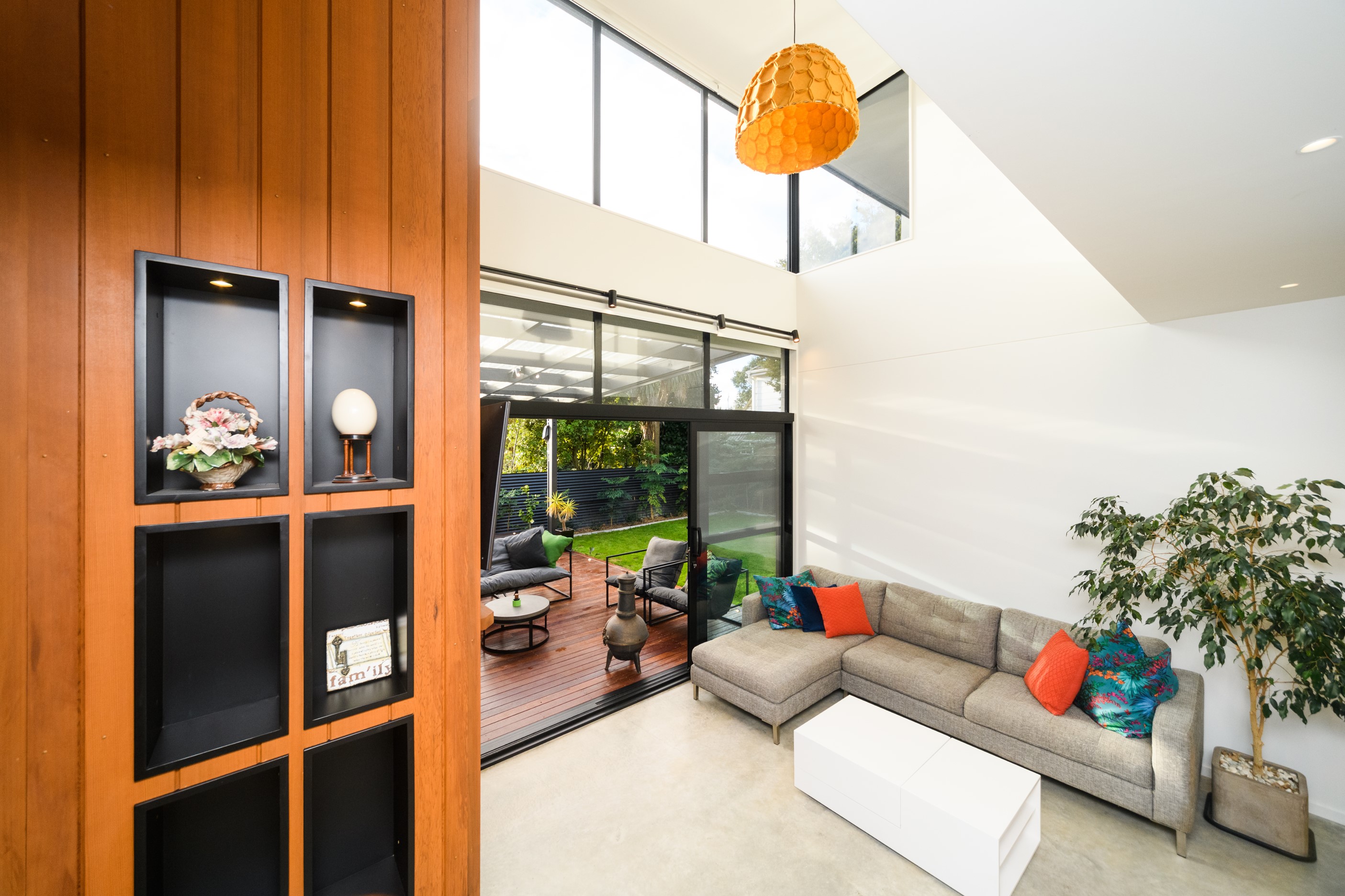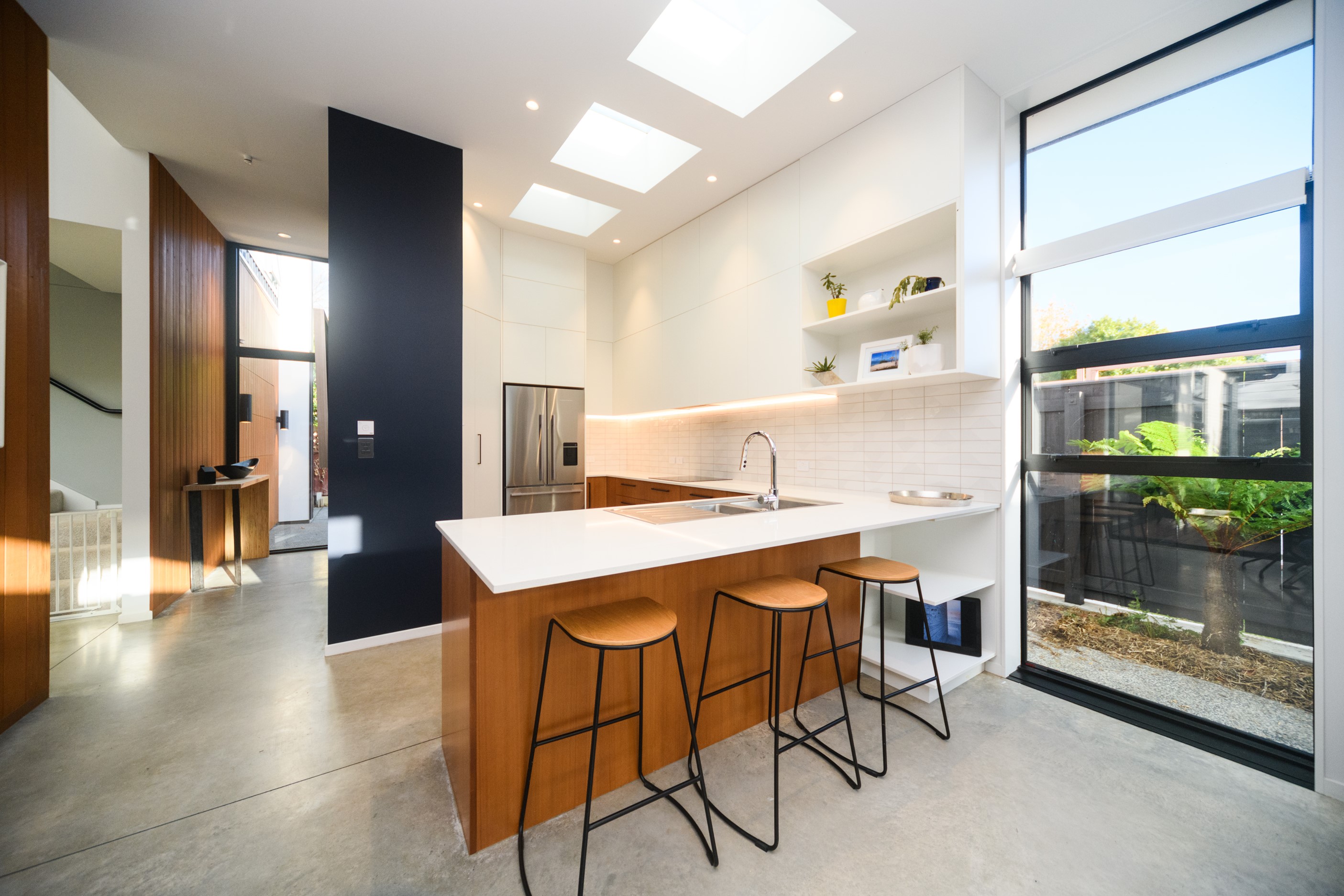This two-level townhouse blends exacting dimensions with clever design elements to maximise a tight site. A variety of cladding materials, including brick, cedar shiplap and coloursteel provide a smart-looking home. The 180sqm floorplan comprises four bedrooms, two living areas and two bathrooms. Careful consideration has been given to relaxed, year-round outdoor living with a north-facing decked area. Inside, superb use of height in the two-storey home creates an impressive sense of space. Exposed concrete flooring partners with caramel tones of cedar and crisp white to create a neutral canvas for bursts of colour in the owners’ furnishings and artworks. A floor-to-ceiling cedar partition between the kitchen and living area serves to house a fireplace and television, as well as provide attractive recessed shelving to showcase collectibles. Elegant stairs lead to the second level, where the main suite is all about luxury. The impressive ensuite combines functionality and beauty with a luxurious shower. A separate bath has a feature wall of jade-green tiles that bring nature’s colour indoors.