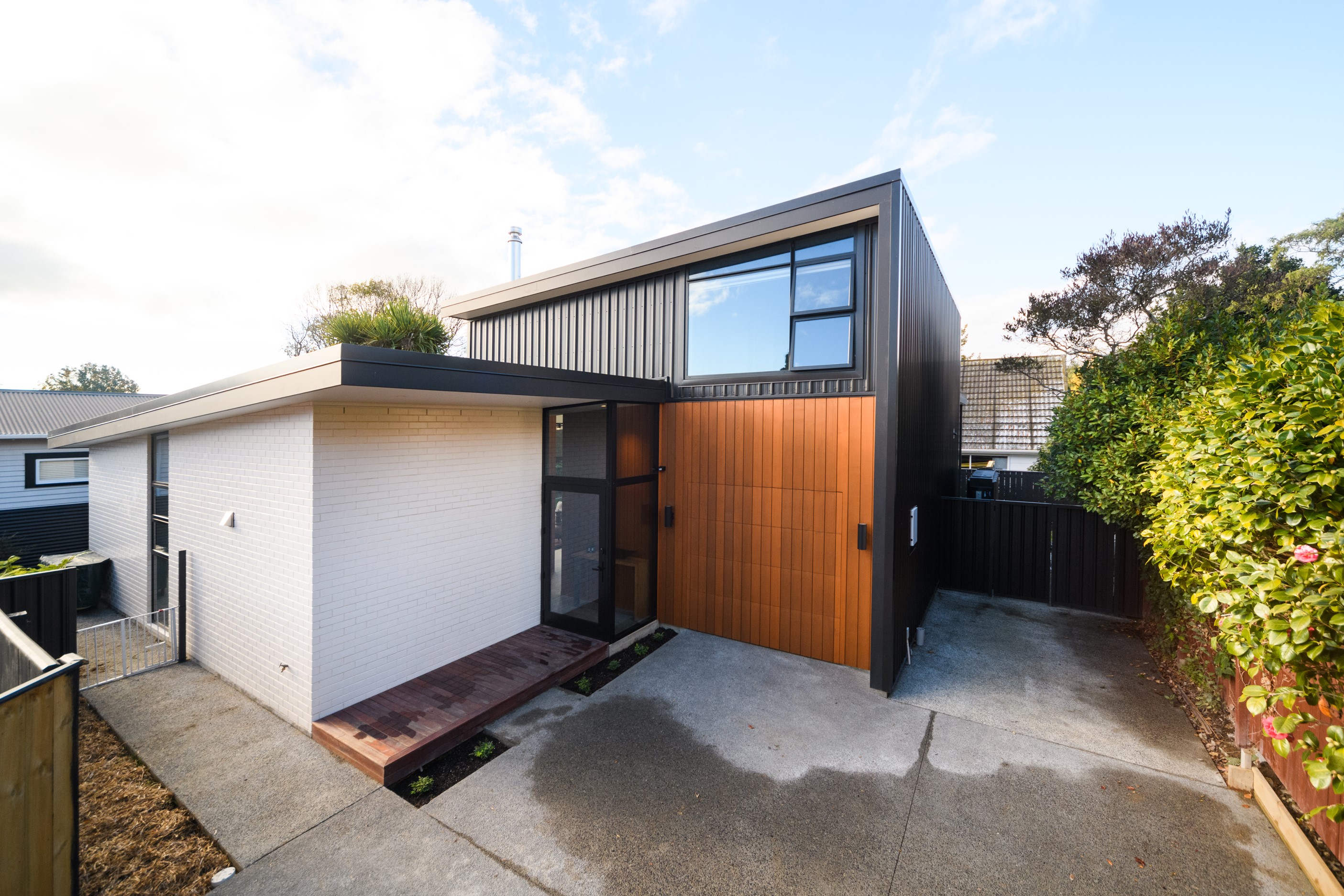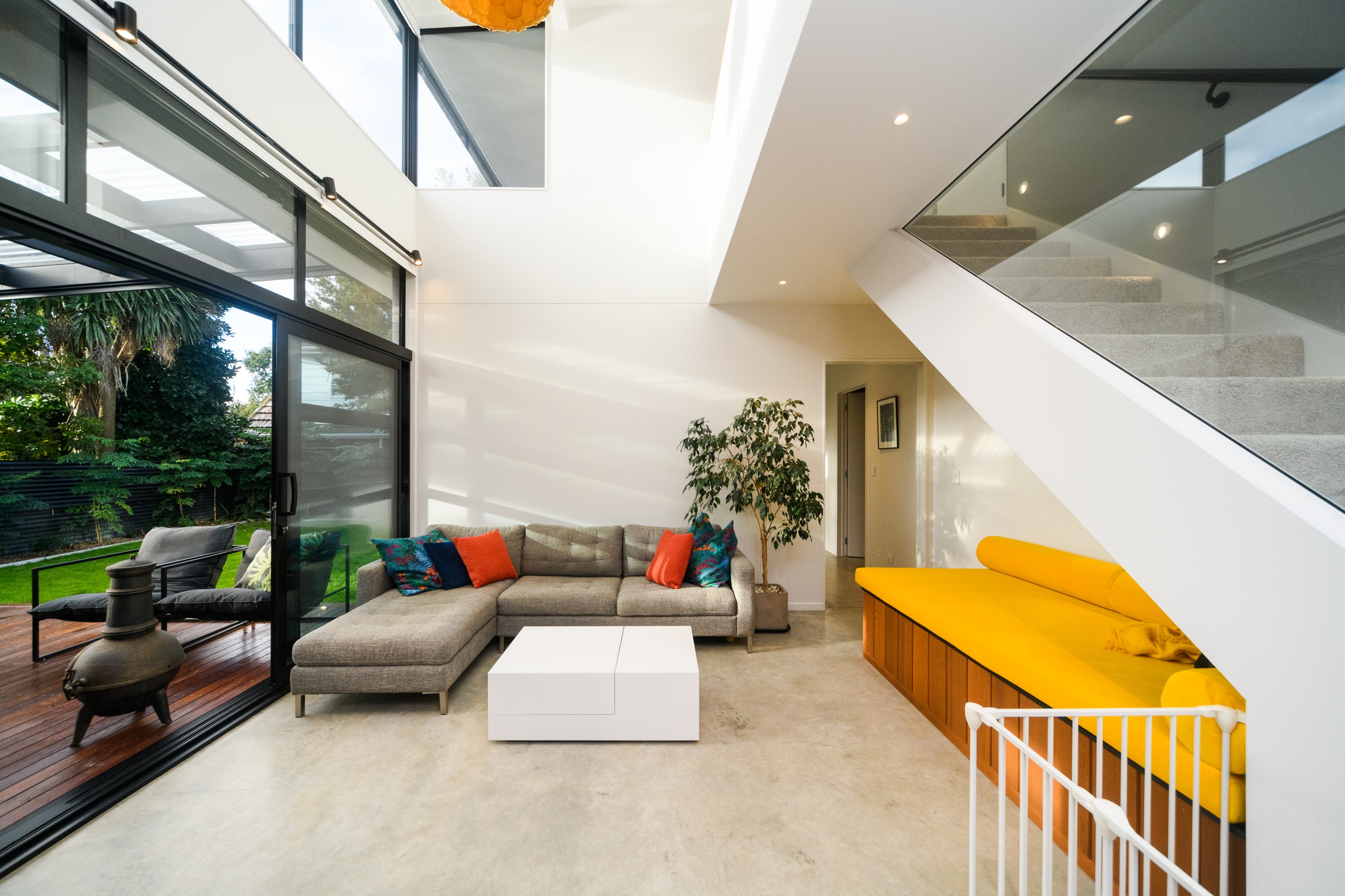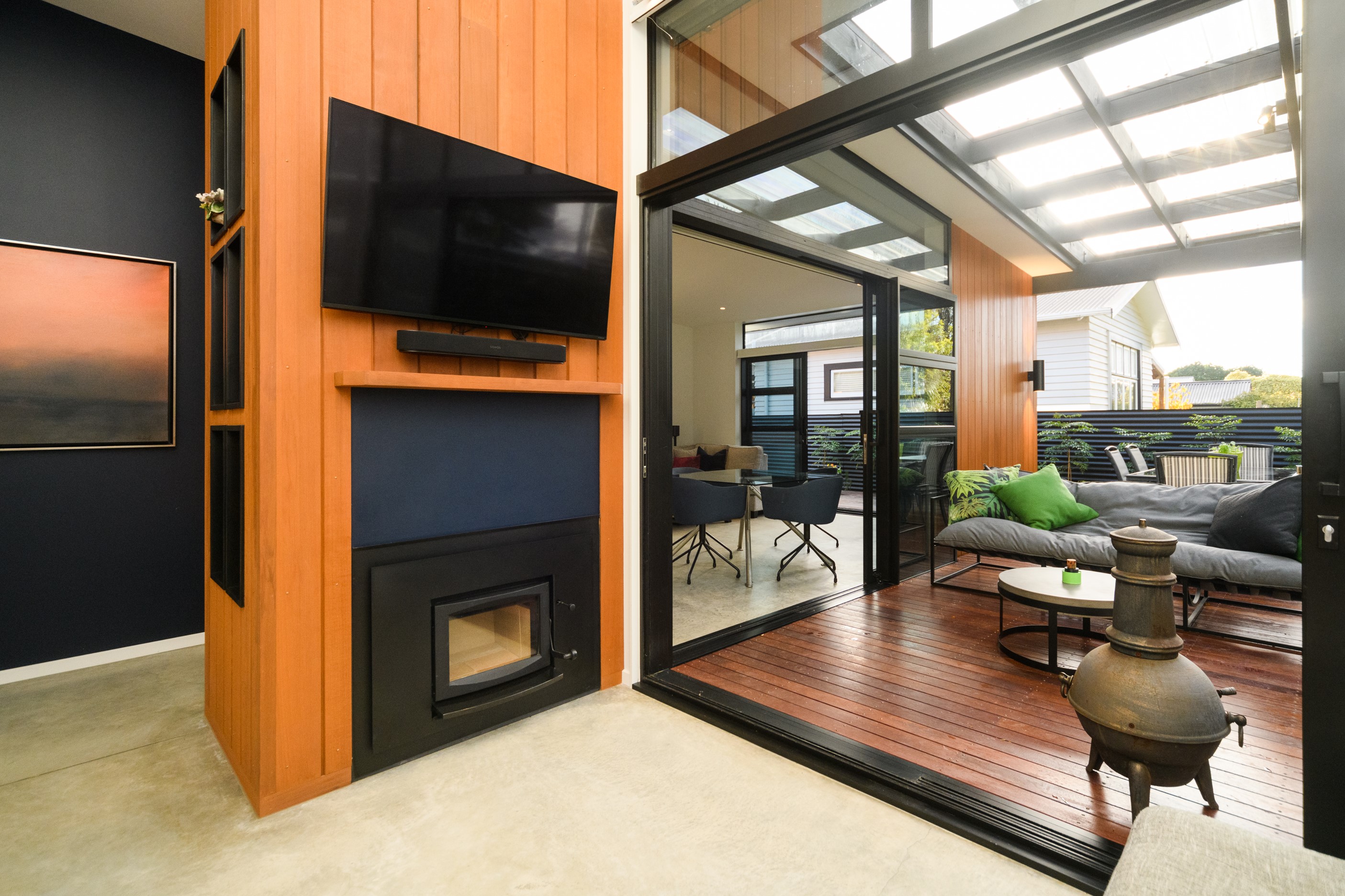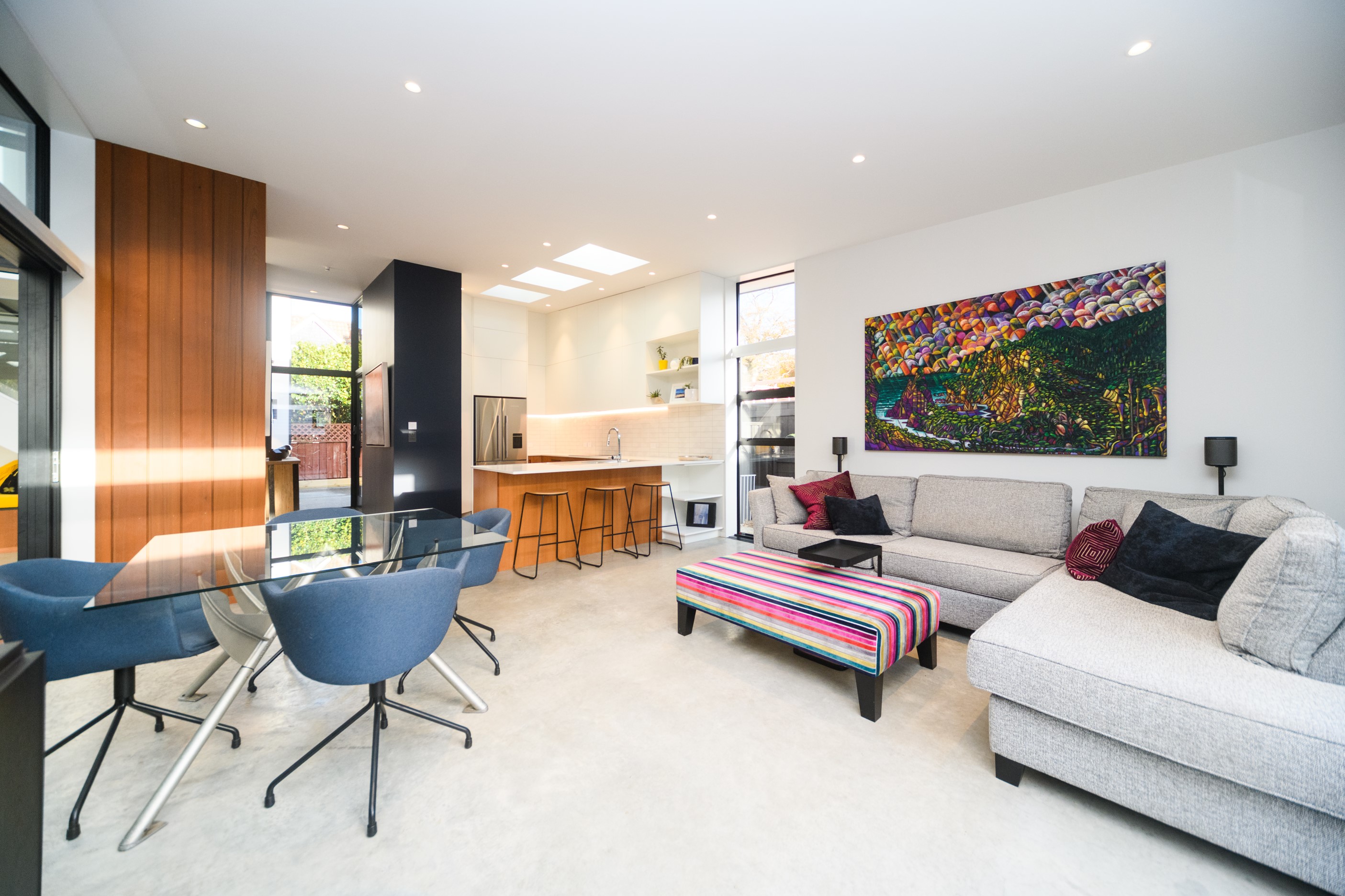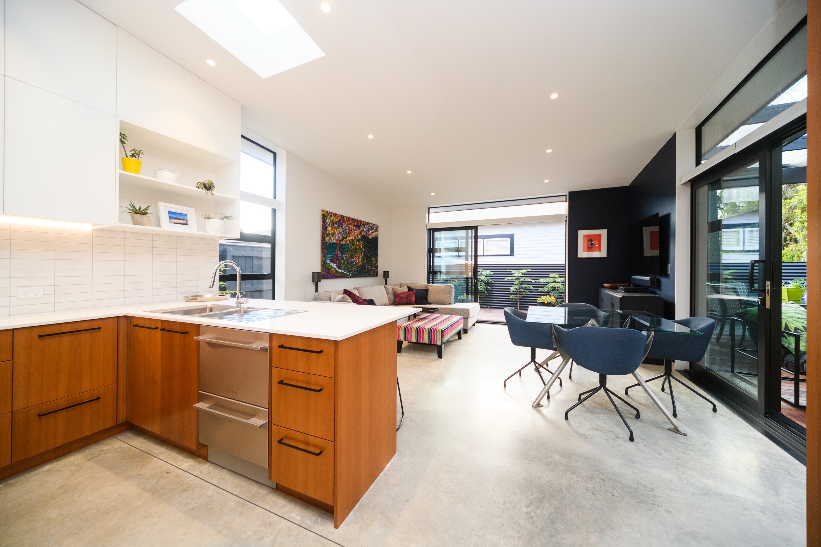 This two-level townhouse blends exacting dimensions with clever design elements to maximise a tight site. A variety of cladding materials, including brick, cedar shiplap and coloursteel provide a smart-looking home. The 180sqm floorplan comprises four bedrooms, two living areas and two bathrooms. Careful consideration has been given to relaxed, year-round outdoor living with a north-facing decked area. Inside, superb use of height in the two-storey home creates an impressive sense of space. Exposed concrete flooring partners with caramel tones of cedar and crisp white to create a neutral canvas for bursts of colour in the owners’ furnishings and artworks. A floor-to-ceiling cedar partition between the kitchen and living area serves to house a fireplace and television, as well as provide attractive recessed shelving to showcase collectibles. Elegant stairs lead to the second level, where the main suite is all about luxury. The impressive ensuite combines functionality and beauty with a luxurious shower. A separate bath has a feature wall of jade-green tiles that bring nature’s colour indoors.