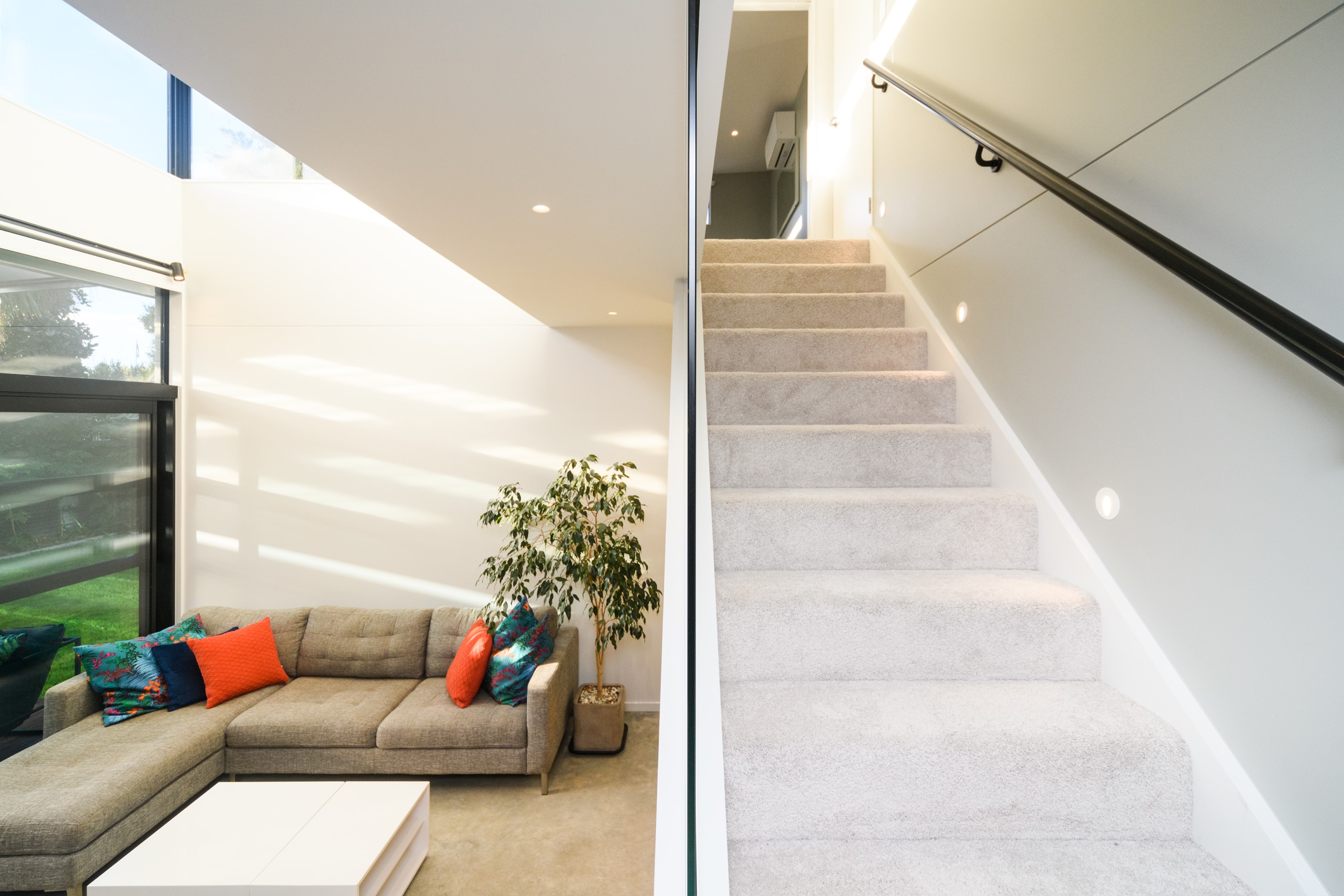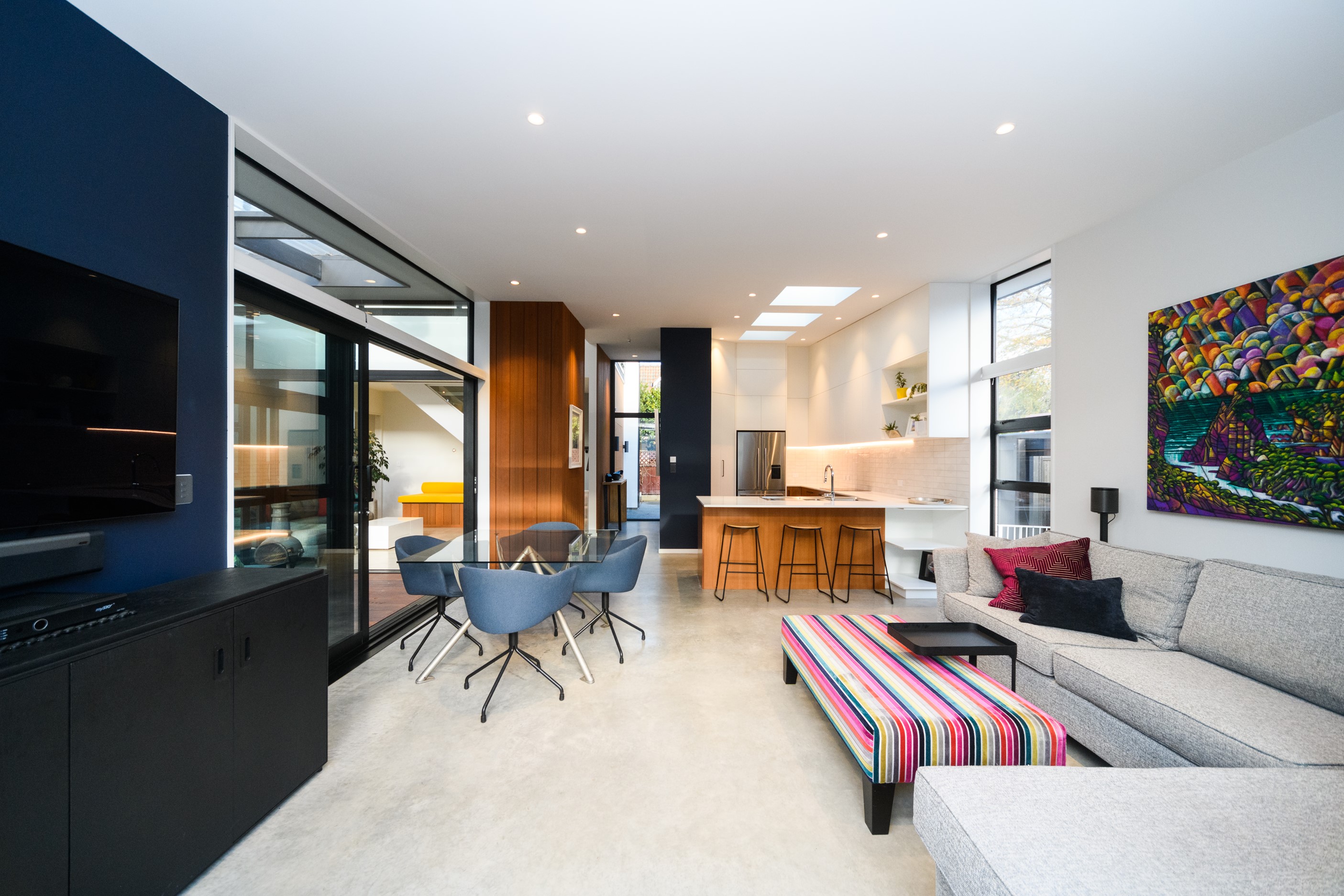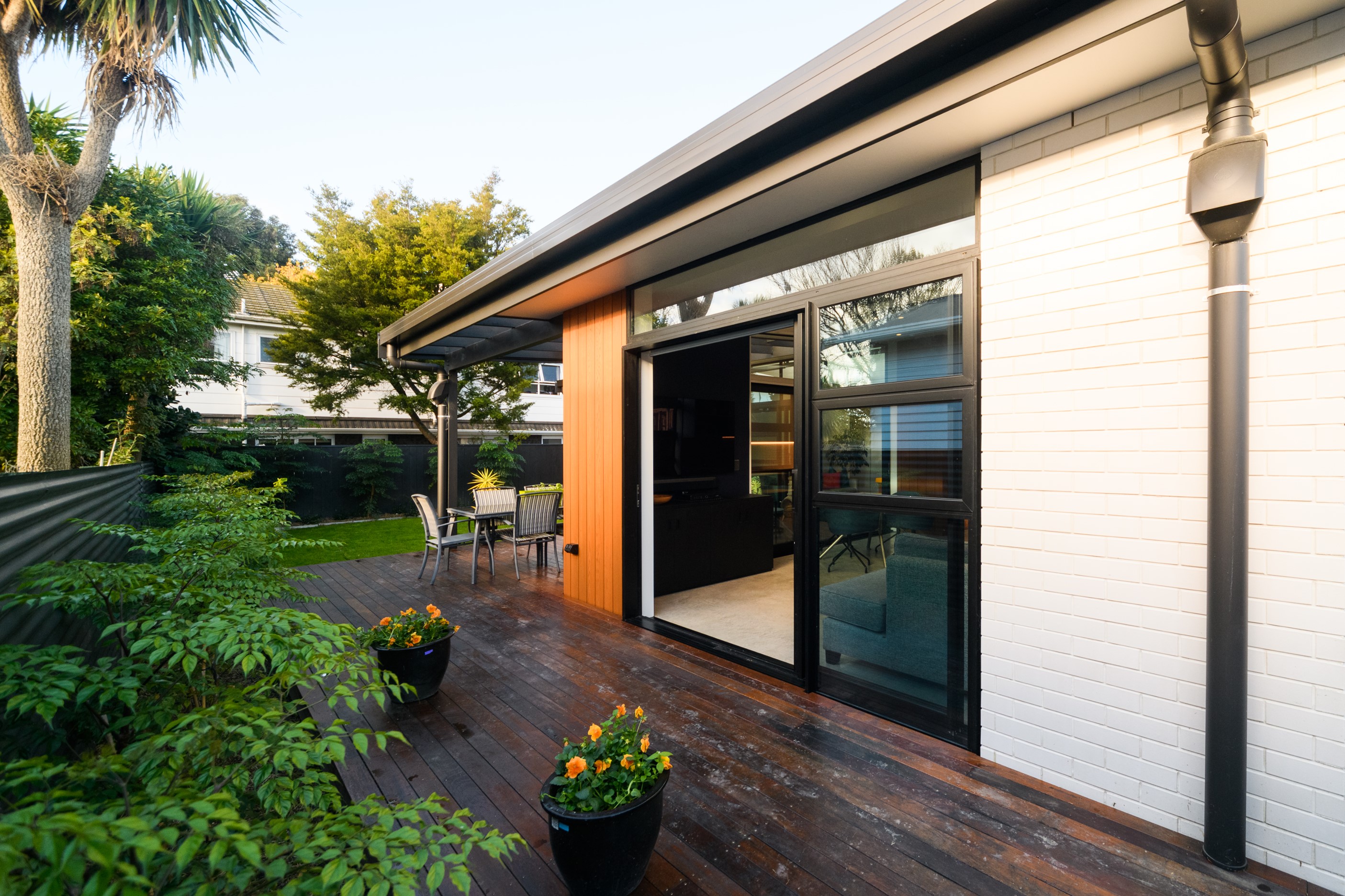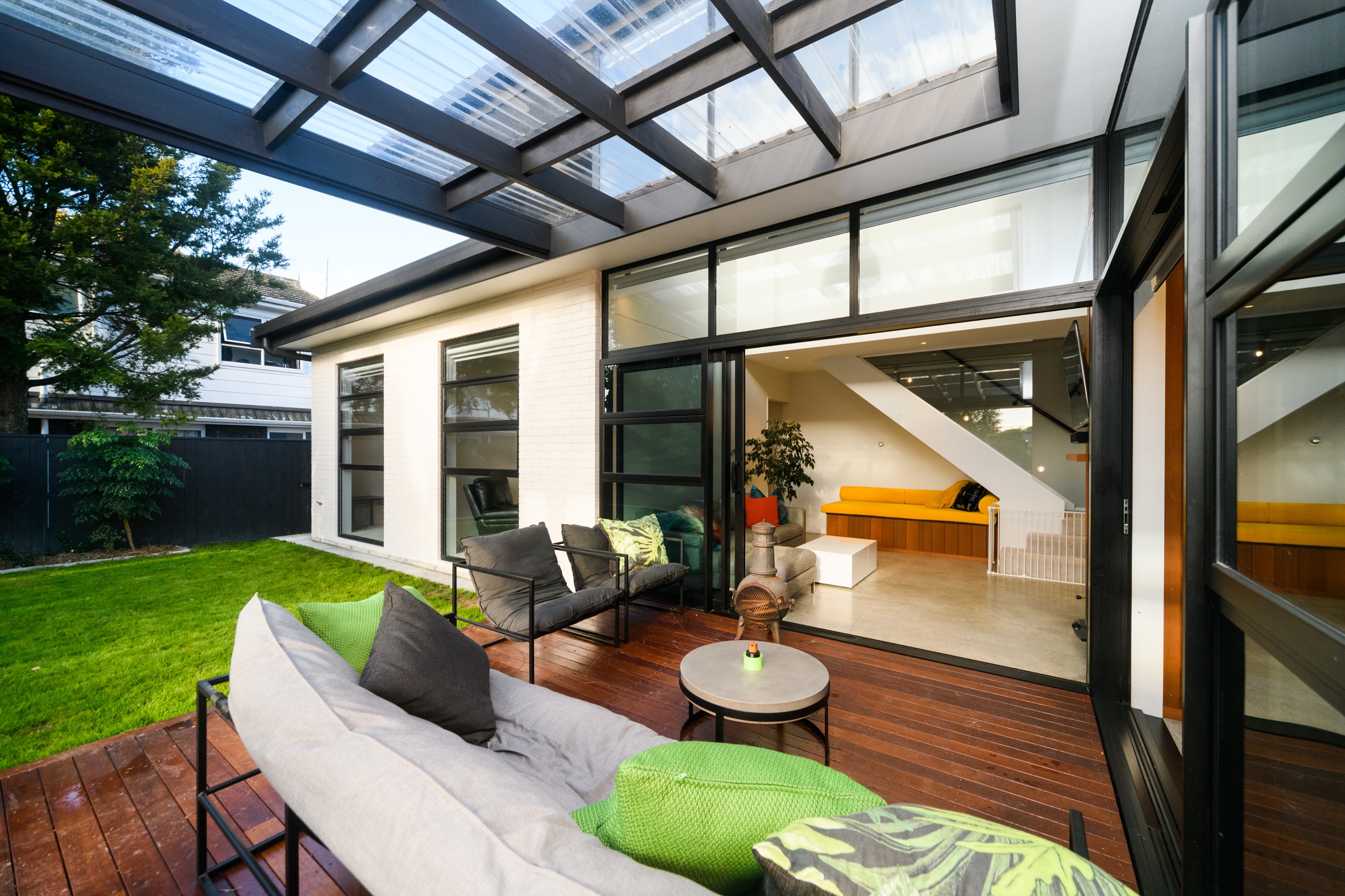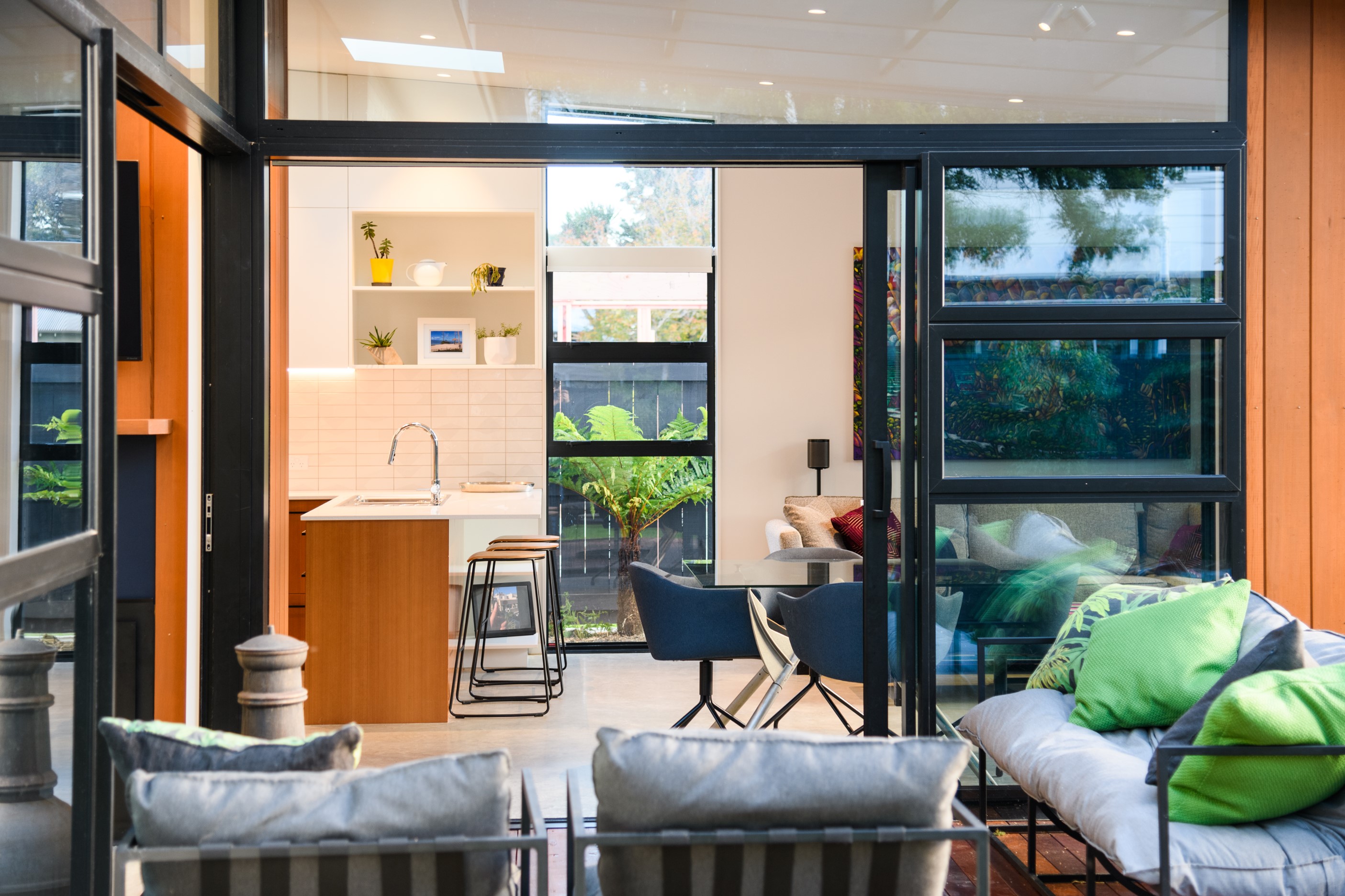 This two-level townhouse blends exacting dimensions with clever design elements to maximise a tight site. A variety of cladding materials, including brick, cedar shiplap and coloursteel provide a smart-looking home. The 180sqm floorplan comprises four bedrooms, two living areas and two bathrooms. Careful consideration has been given to relaxed, year-round outdoor living with a north-facing decked area. Inside, superb use of height in the two-storey home creates an impressive sense of space. Exposed concrete flooring partners with caramel tones of cedar and crisp white to create a neutral canvas for bursts of colour in the owners’ furnishings and artworks. A floor-to-ceiling cedar partition between the kitchen and living area serves to house a fireplace and television, as well as provide attractive recessed shelving to showcase collectibles. Elegant stairs lead to the second level, where the main suite is all about luxury. The impressive ensuite combines functionality and beauty with a luxurious shower. A separate bath has a feature wall of jade-green tiles that bring nature’s colour indoors.
