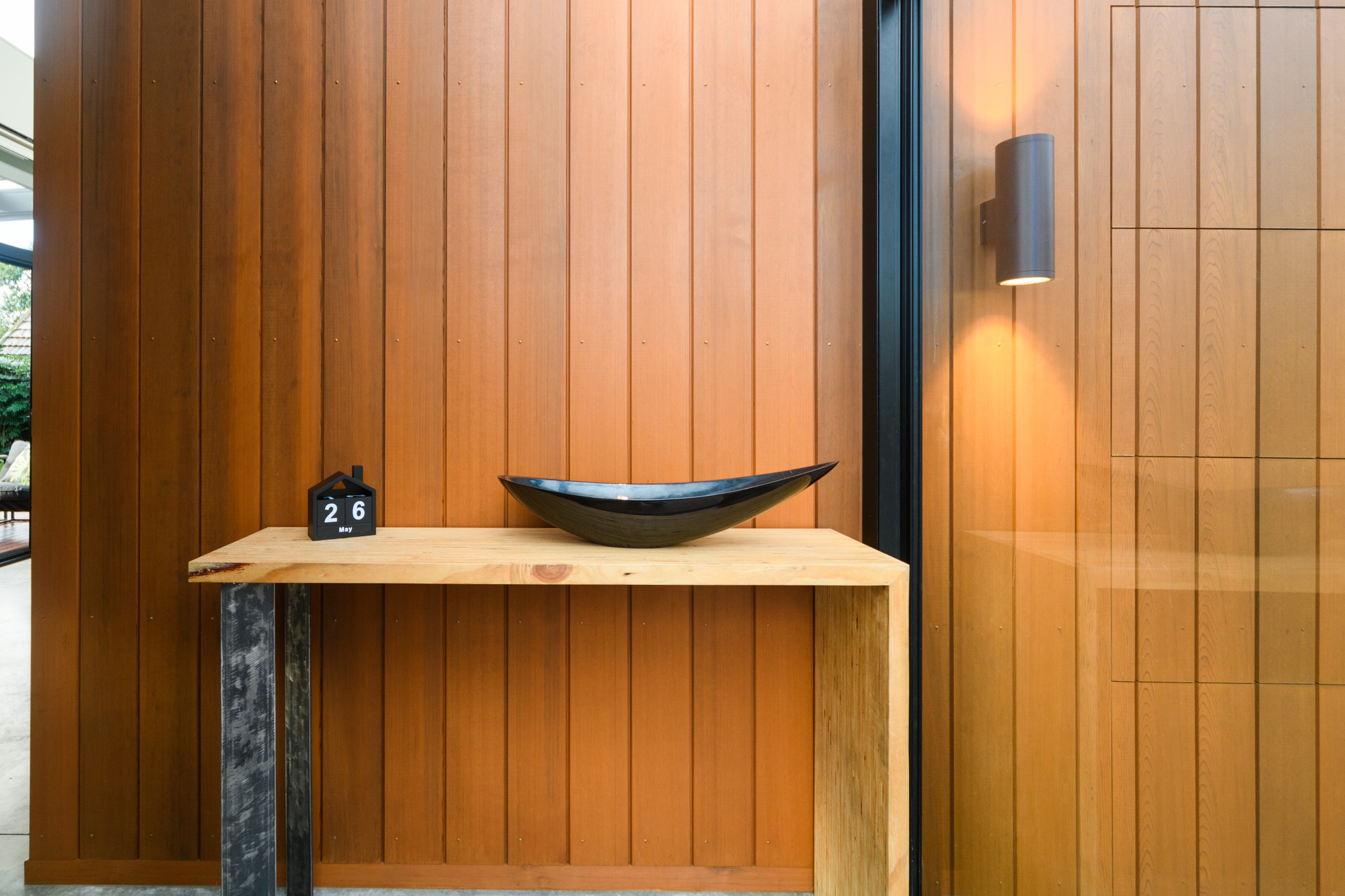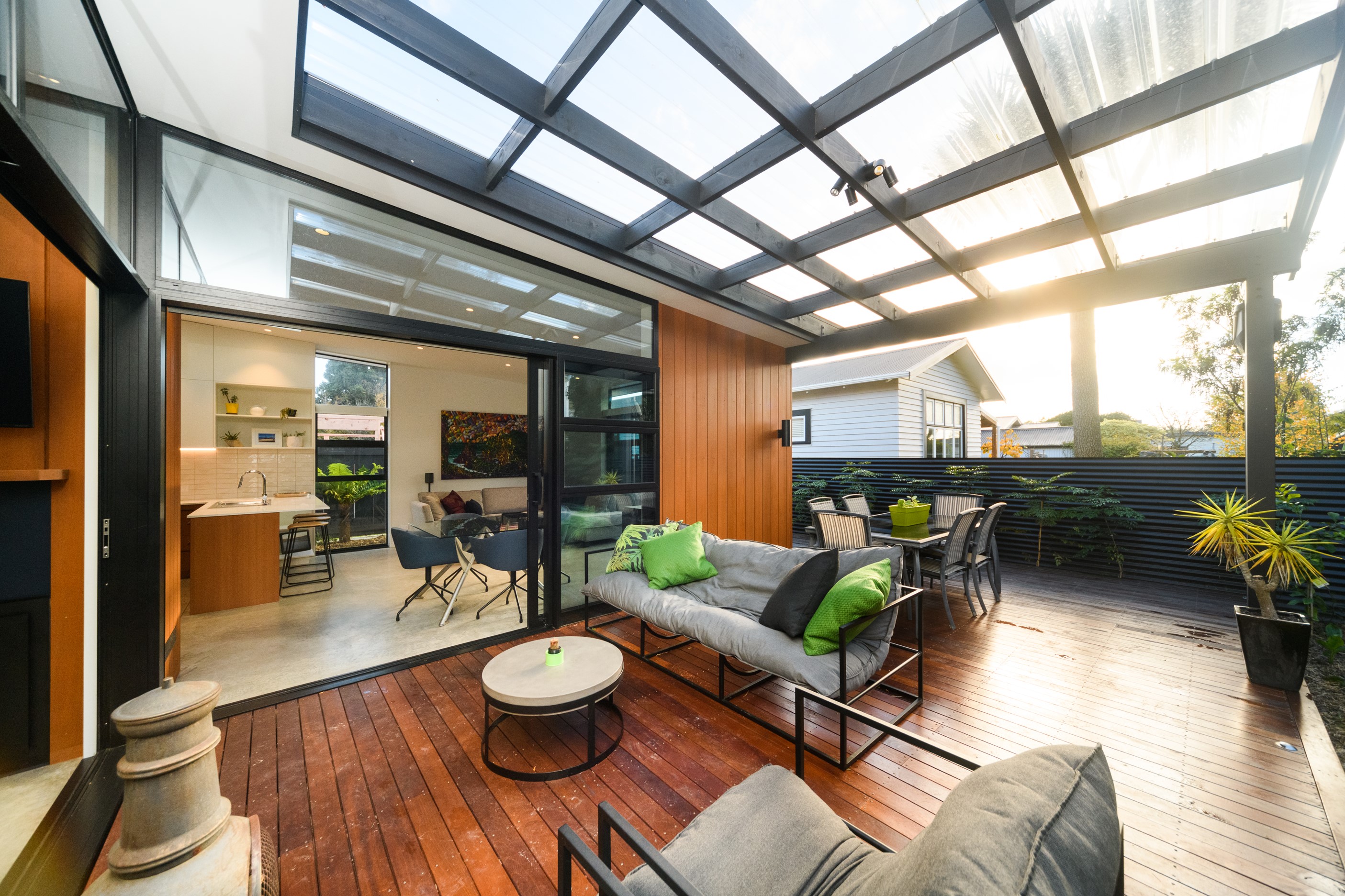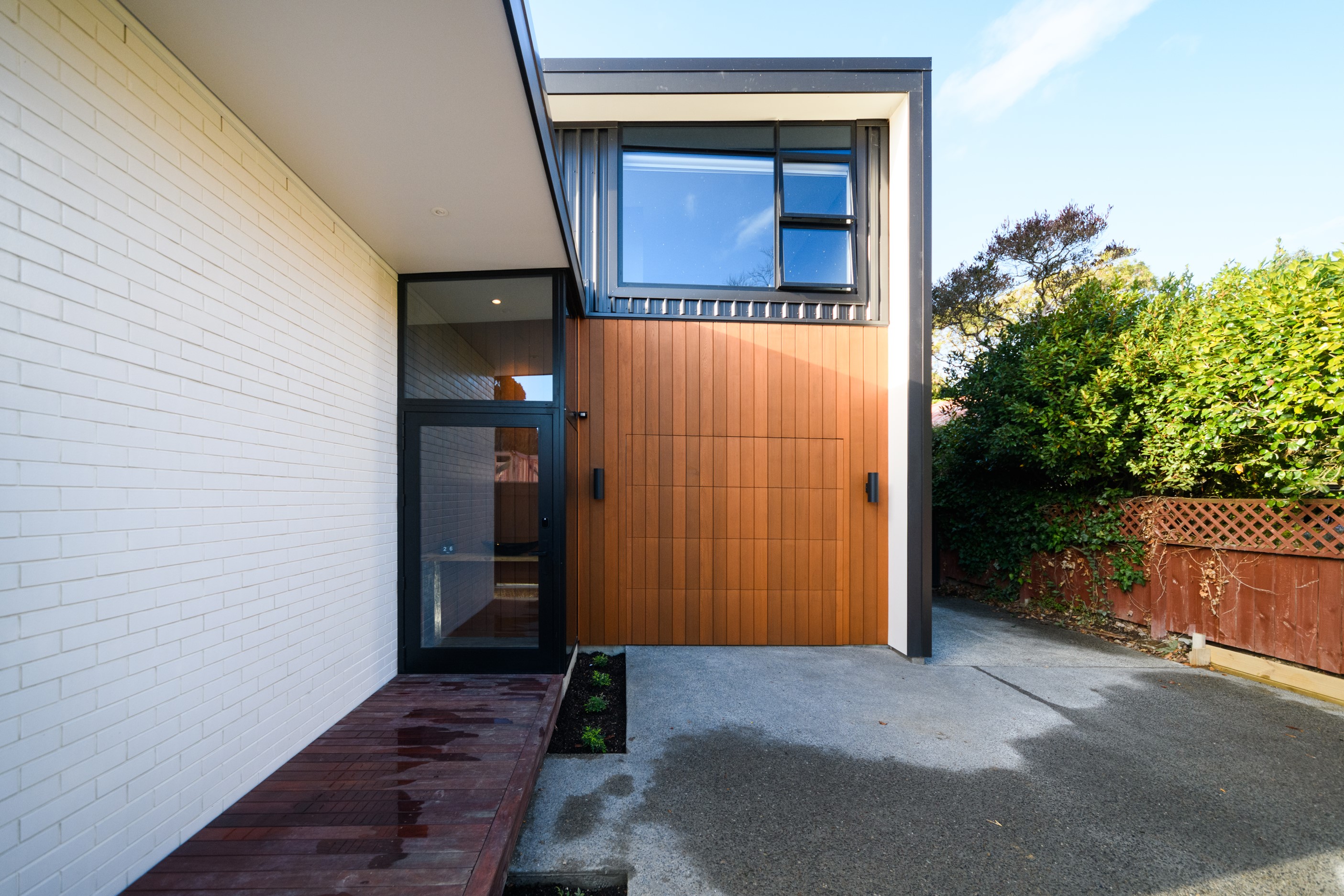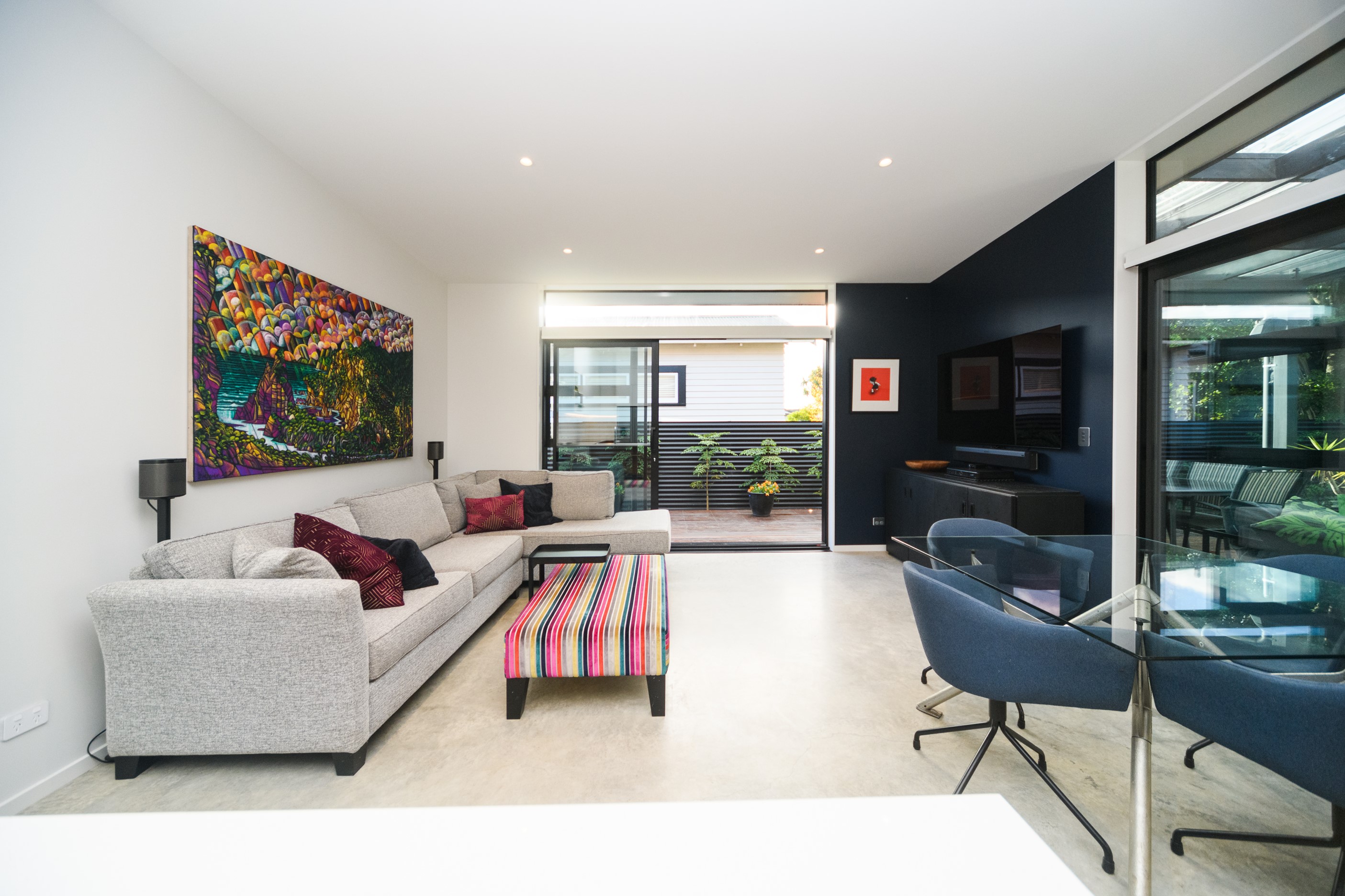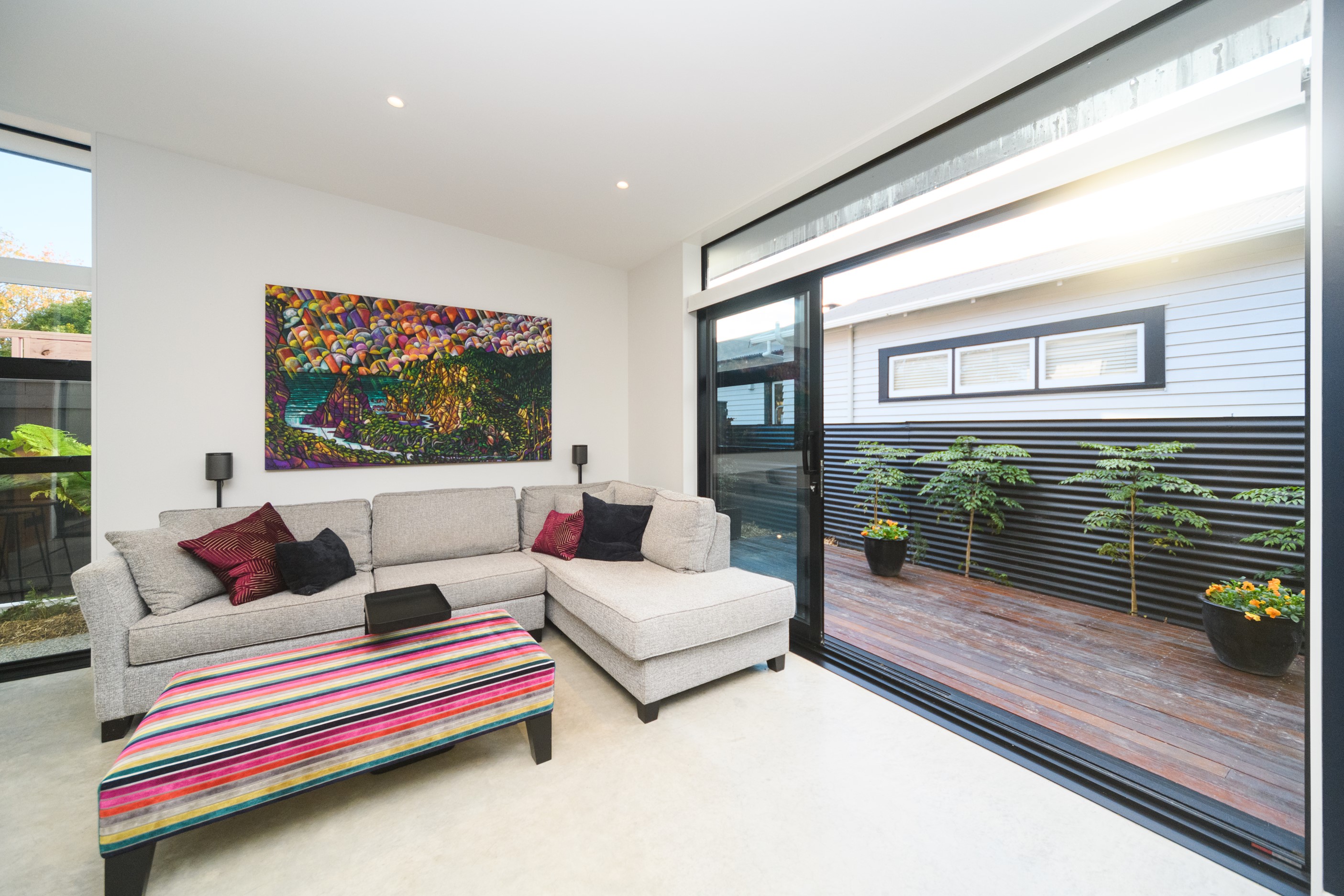 This two-level townhouse blends exacting dimensions with clever design elements to maximise a tight site. A variety of cladding materials, including brick, cedar shiplap and coloursteel provide a smart-looking home. The 180sqm floorplan comprises four bedrooms, two living areas and two bathrooms. Careful consideration has been given to relaxed, year-round outdoor living with a north-facing decked area. Inside, superb use of height in the two-storey home creates an impressive sense of space. Exposed concrete flooring partners with caramel tones of cedar and crisp white to create a neutral canvas for bursts of colour in the owners’ furnishings and artworks. A floor-to-ceiling cedar partition between the kitchen and living area serves to house a fireplace and television, as well as provide attractive recessed shelving to showcase collectibles. Elegant stairs lead to the second level, where the main suite is all about luxury. The impressive ensuite combines functionality and beauty with a luxurious shower. A separate bath has a feature wall of jade-green tiles that bring nature’s colour indoors.