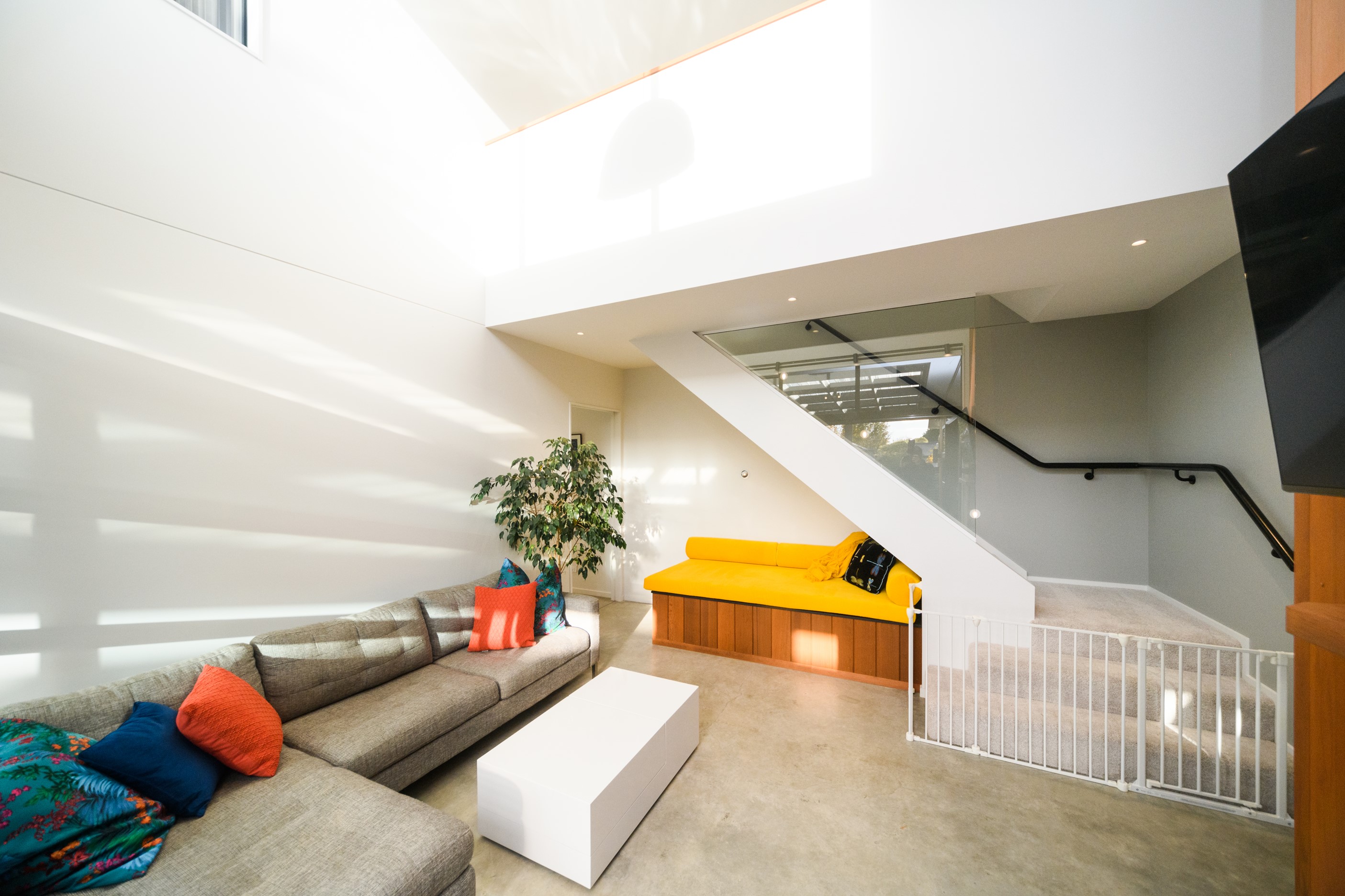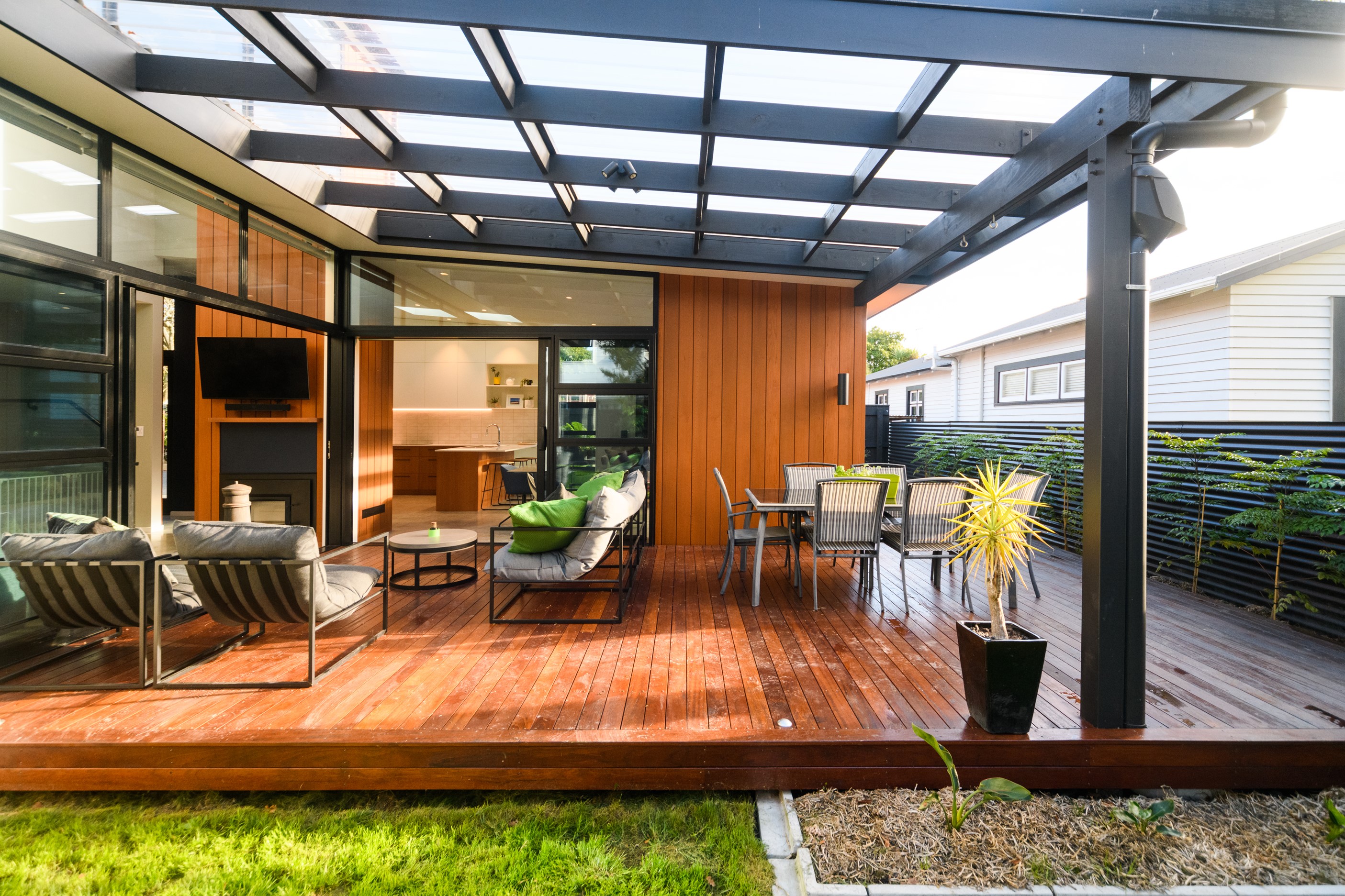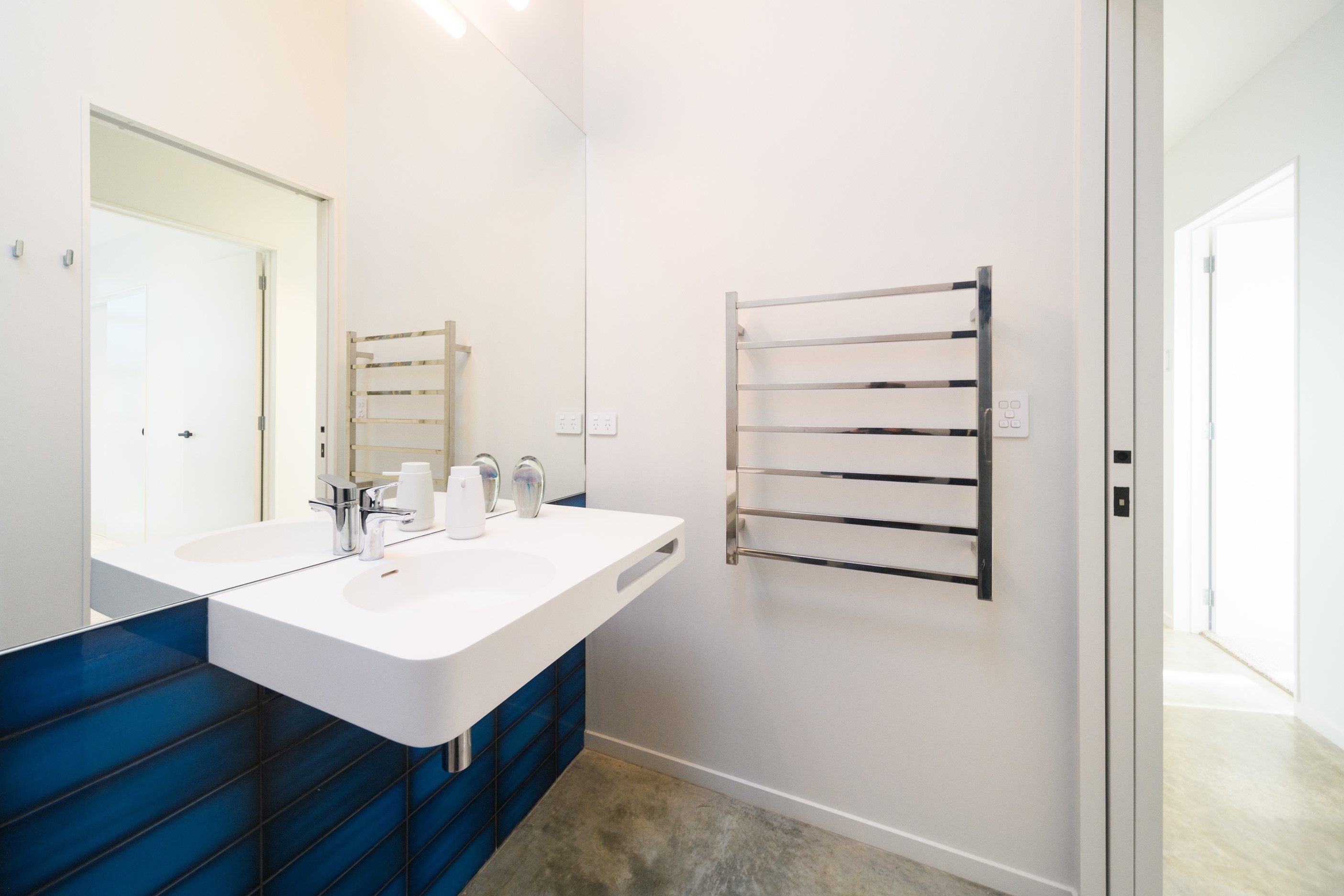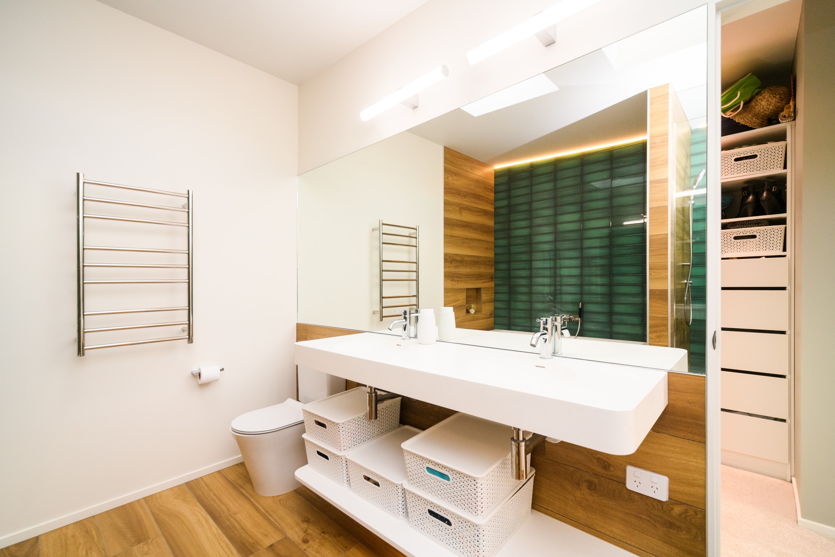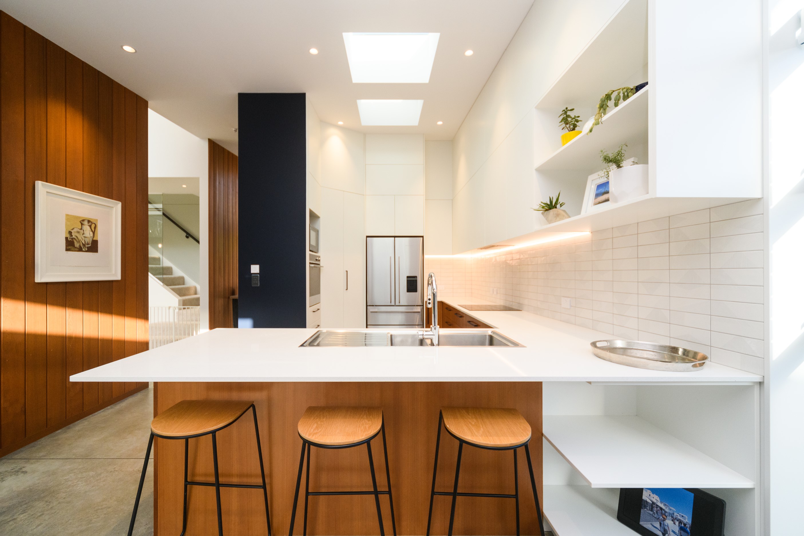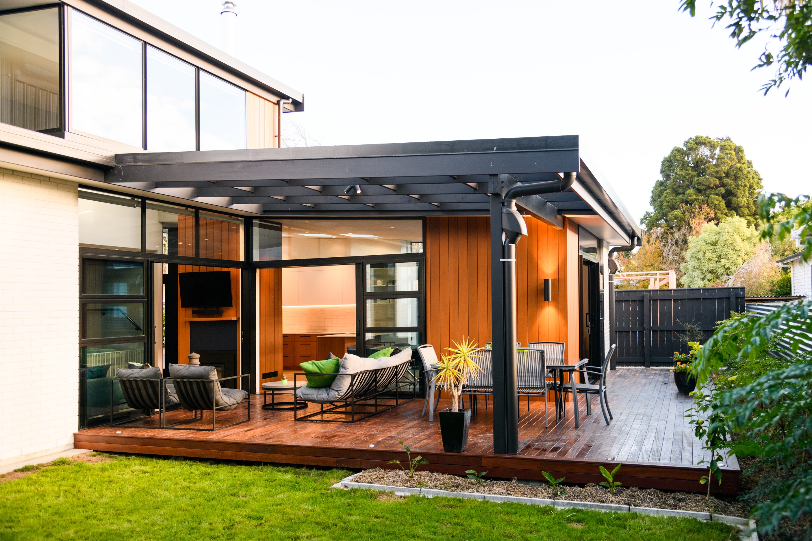 This two-level townhouse blends exacting dimensions with clever design elements to maximise a tight site. A variety of cladding materials, including brick, cedar shiplap and coloursteel provide a smart-looking home. The 180sqm floorplan comprises four bedrooms, two living areas and two bathrooms. Careful consideration has been given to relaxed, year-round outdoor living with a north-facing decked area. Inside, superb use of height in the two-storey home creates an impressive sense of space. Exposed concrete flooring partners with caramel tones of cedar and crisp white to create a neutral canvas for bursts of colour in the owners’ furnishings and artworks. A floor-to-ceiling cedar partition between the kitchen and living area serves to house a fireplace and television, as well as provide attractive recessed shelving to showcase collectibles. Elegant stairs lead to the second level, where the main suite is all about luxury. The impressive ensuite combines functionality and beauty with a luxurious shower. A separate bath has a feature wall of jade-green tiles that bring nature’s colour indoors.