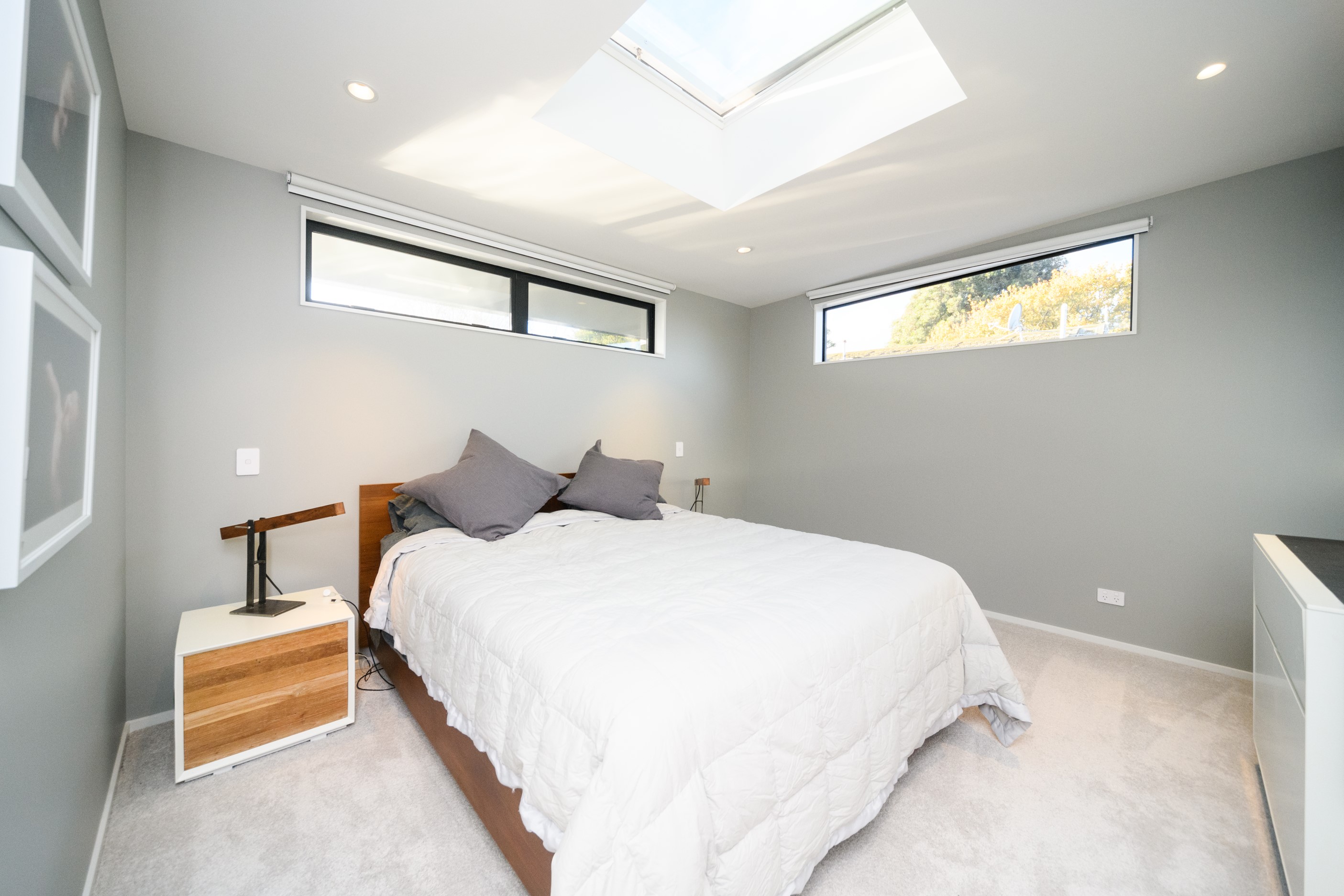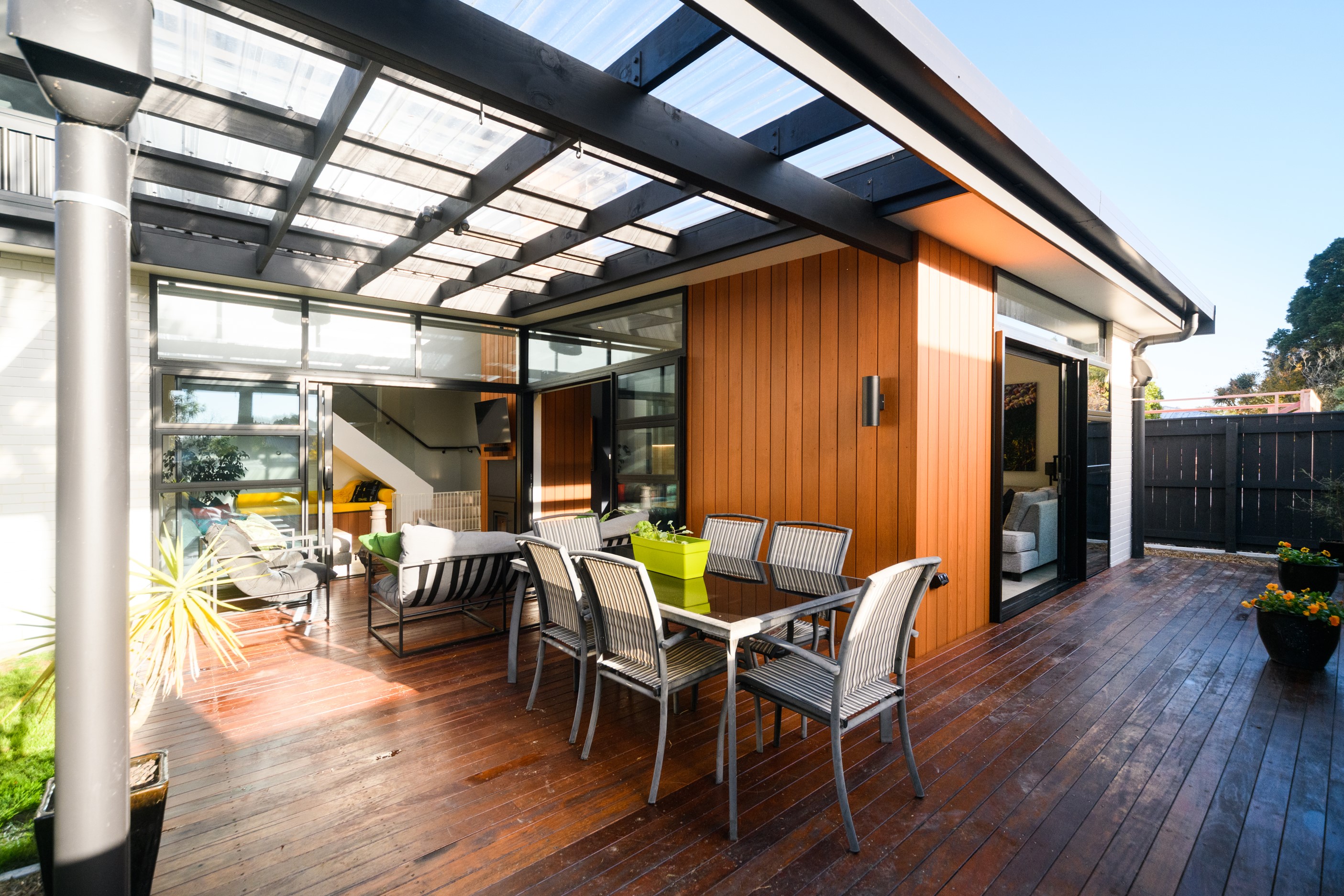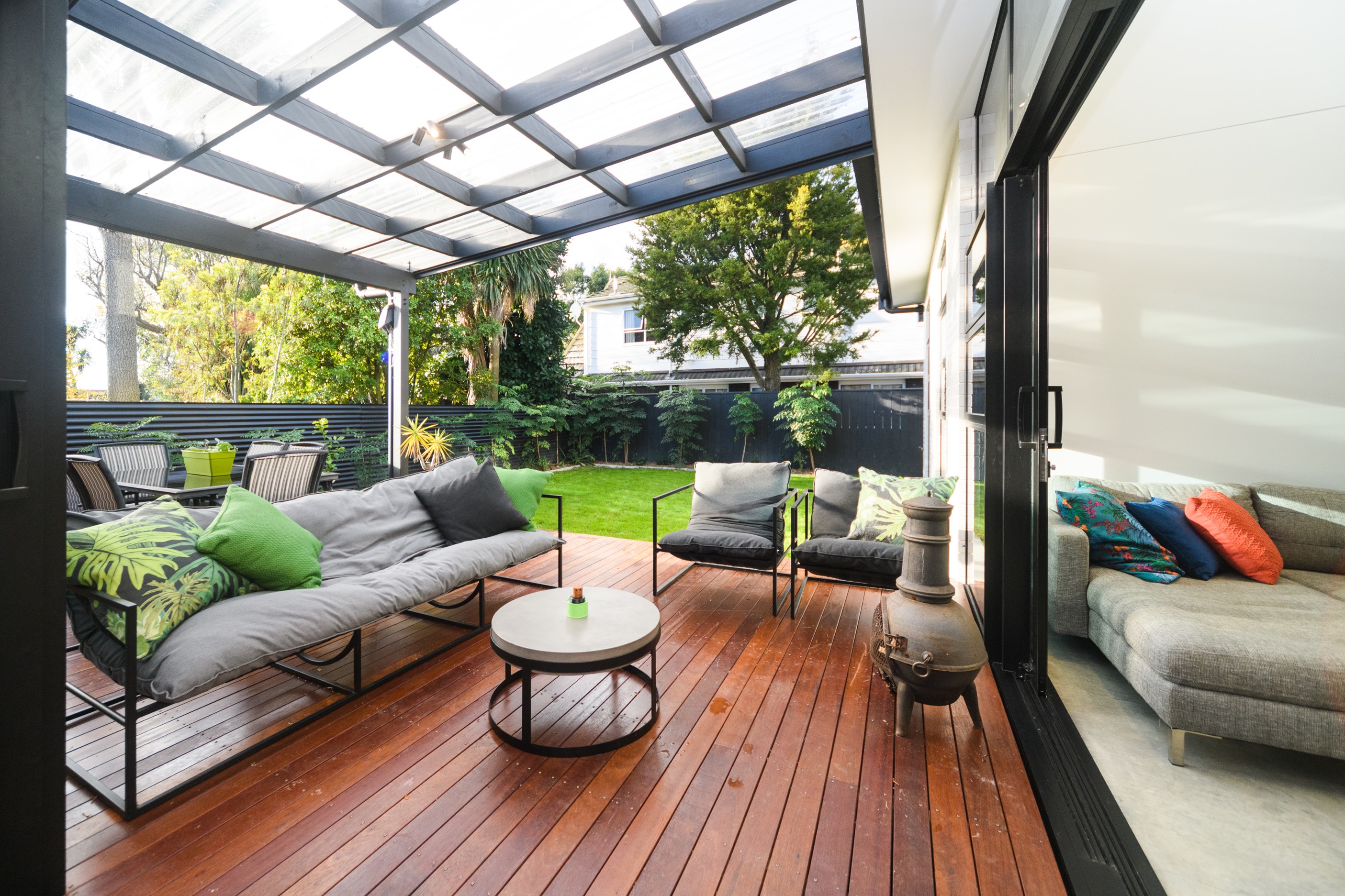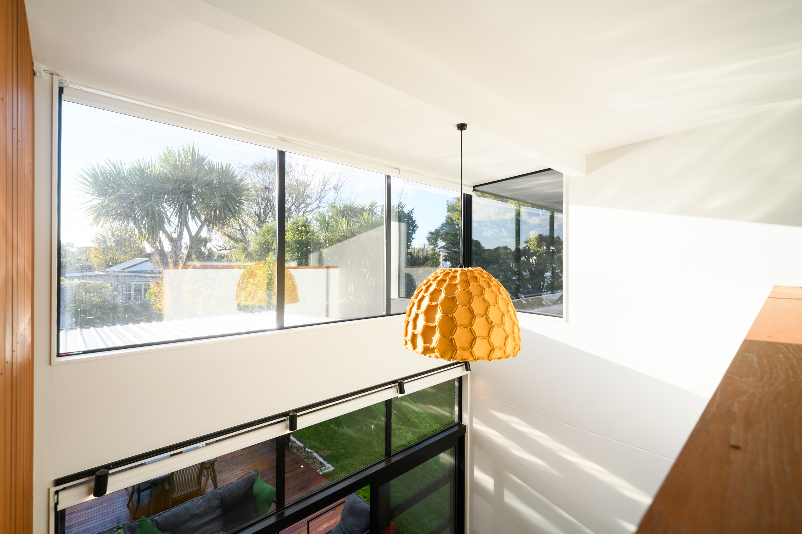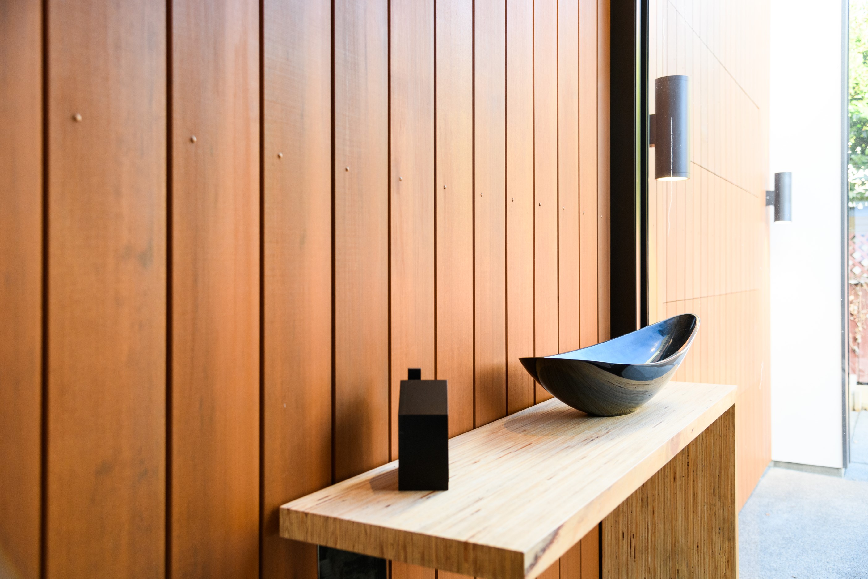 This two-level townhouse blends exacting dimensions with clever design elements to maximise a tight site. A variety of cladding materials, including brick, cedar shiplap and coloursteel provide a smart-looking home. The 180sqm floorplan comprises four bedrooms, two living areas and two bathrooms. Careful consideration has been given to relaxed, year-round outdoor living with a north-facing decked area. Inside, superb use of height in the two-storey home creates an impressive sense of space. Exposed concrete flooring partners with caramel tones of cedar and crisp white to create a neutral canvas for bursts of colour in the owners’ furnishings and artworks. A floor-to-ceiling cedar partition between the kitchen and living area serves to house a fireplace and television, as well as provide attractive recessed shelving to showcase collectibles. Elegant stairs lead to the second level, where the main suite is all about luxury. The impressive ensuite combines functionality and beauty with a luxurious shower. A separate bath has a feature wall of jade-green tiles that bring nature’s colour indoors.