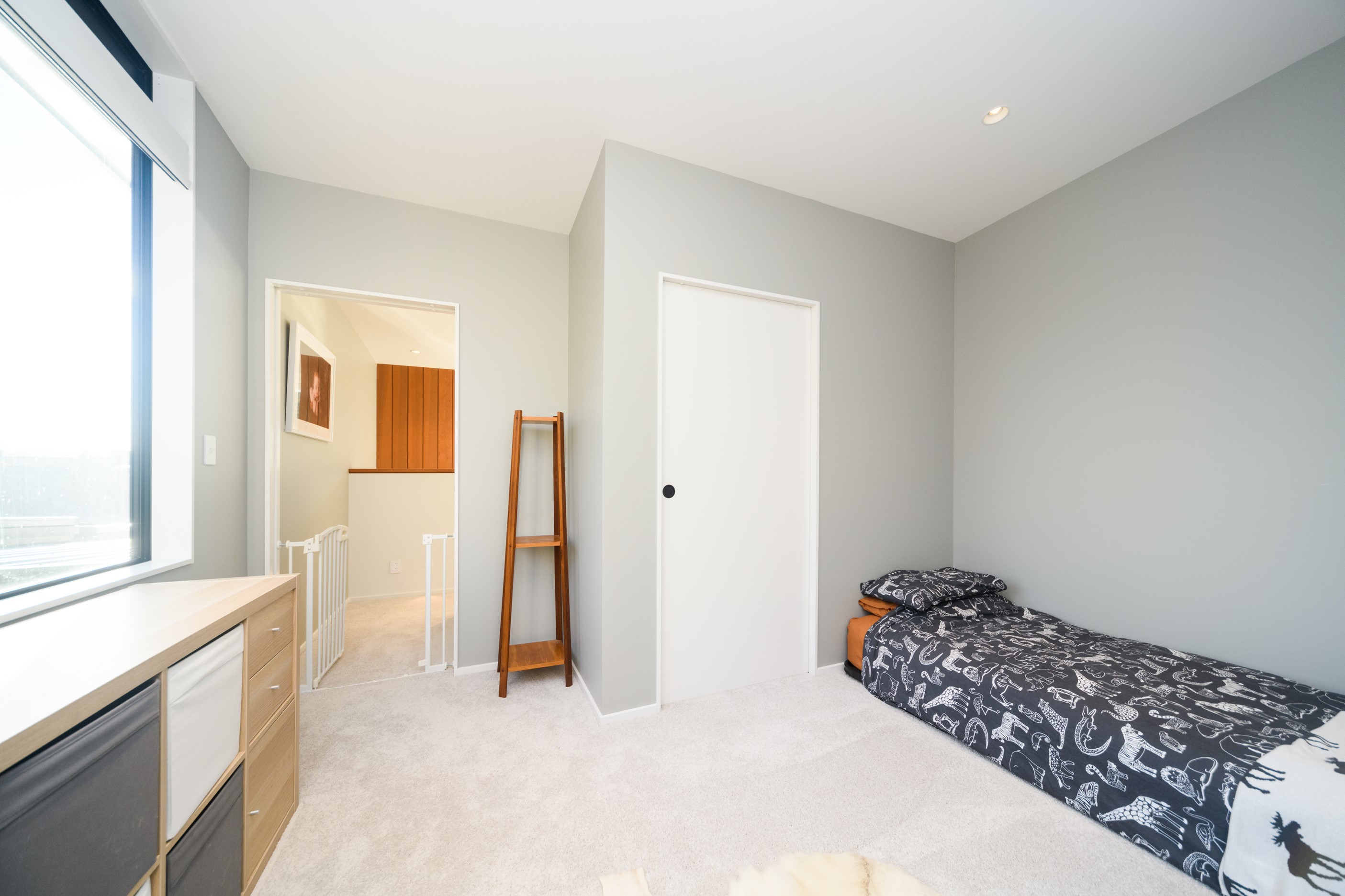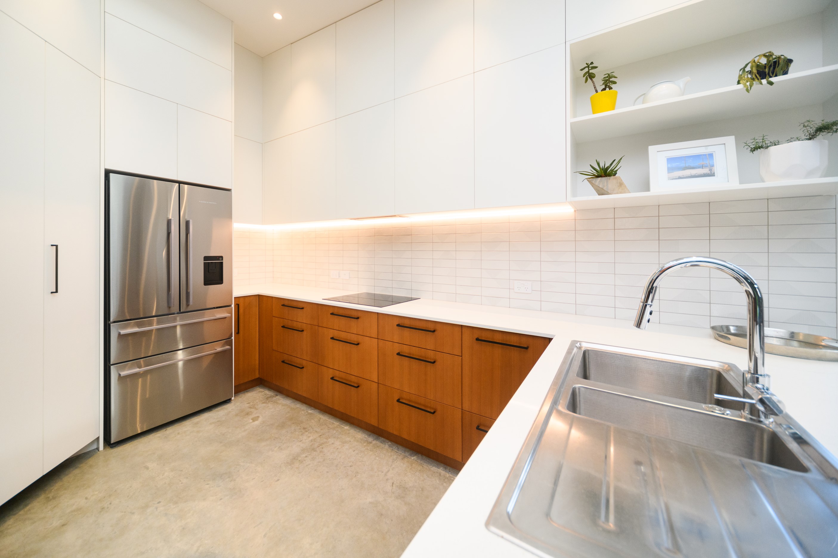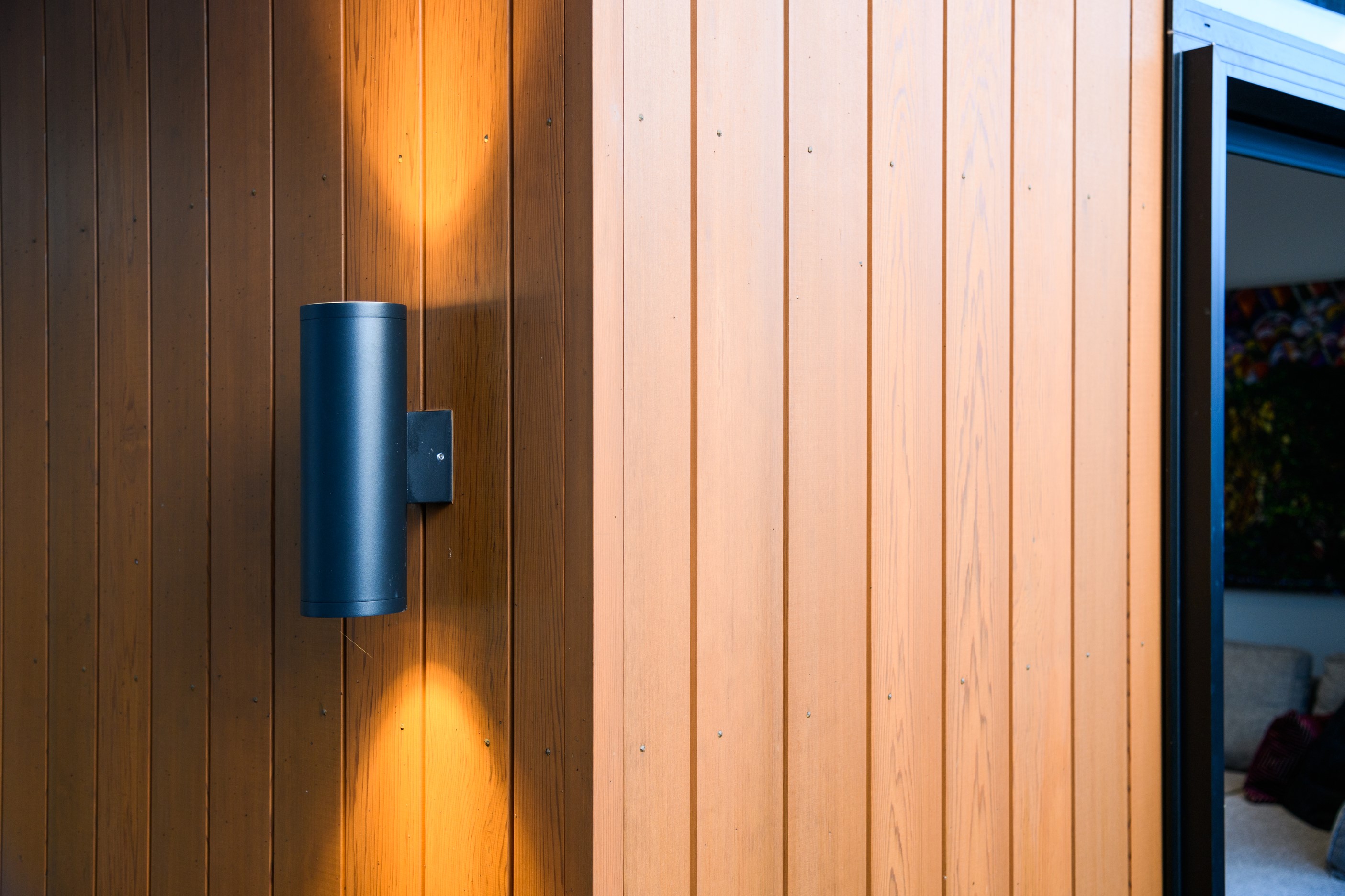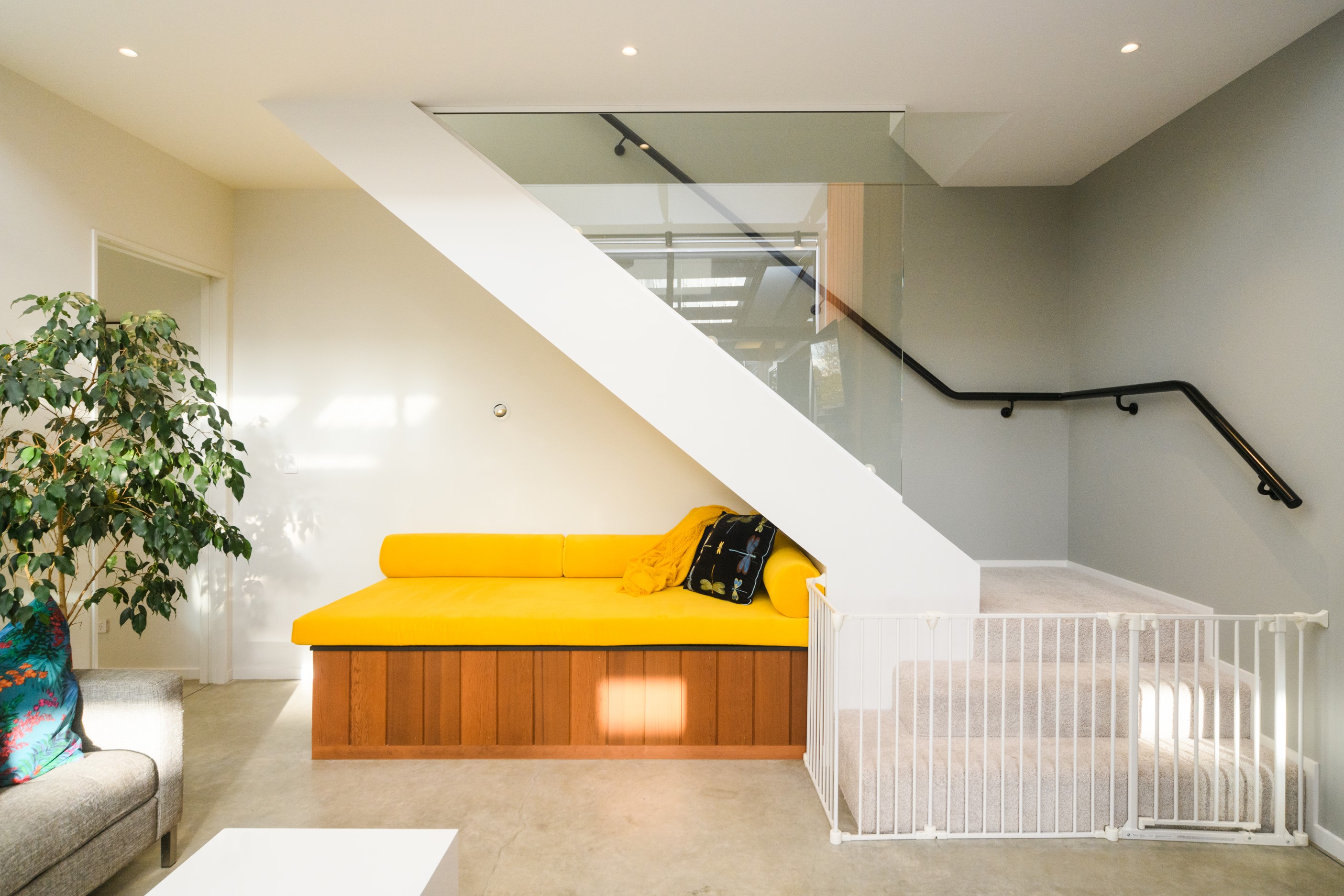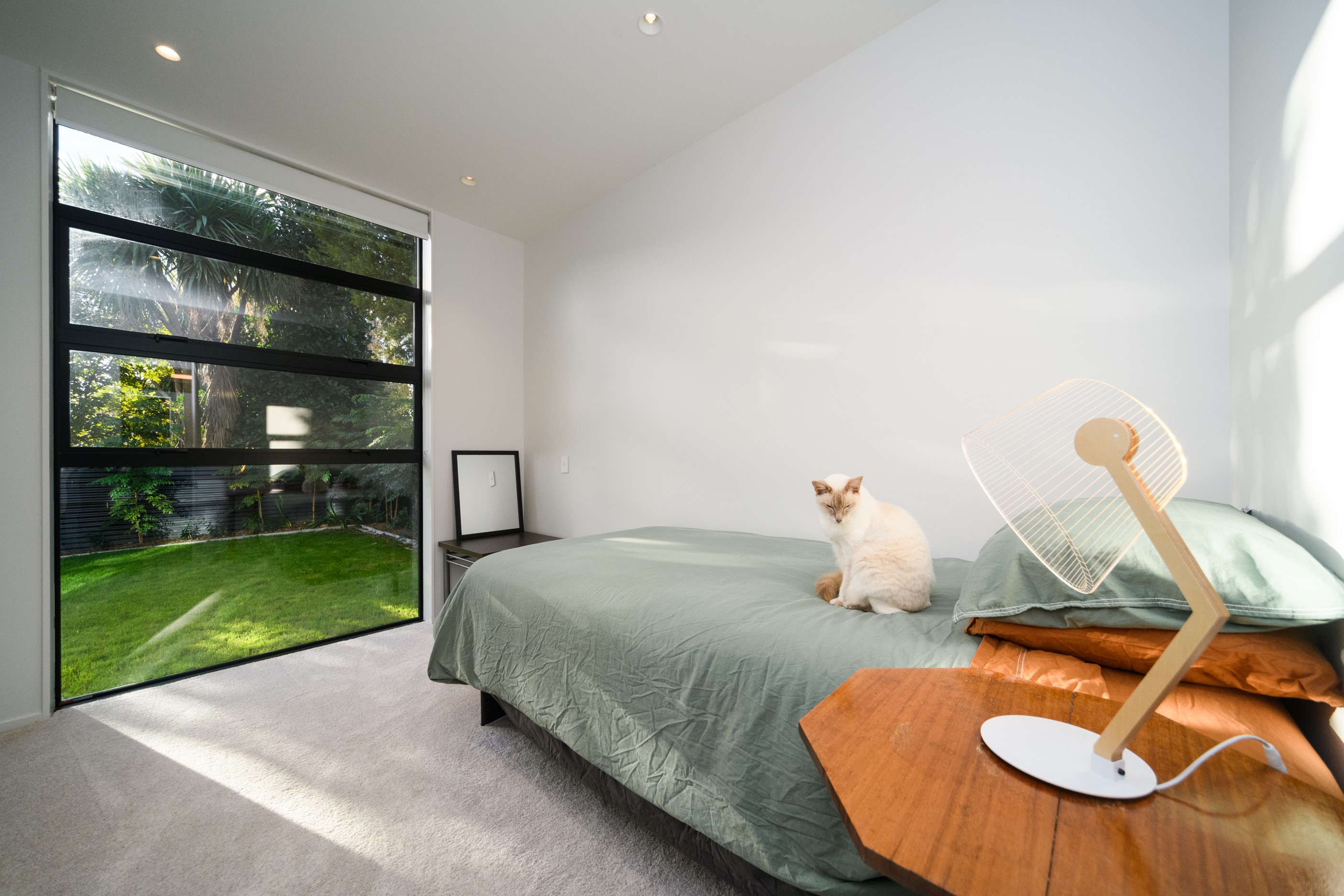 This two-level townhouse blends exacting dimensions with clever design elements to maximise a tight site. A variety of cladding materials, including brick, cedar shiplap and coloursteel provide a smart-looking home. The 180sqm floorplan comprises four bedrooms, two living areas and two bathrooms. Careful consideration has been given to relaxed, year-round outdoor living with a north-facing decked area. Inside, superb use of height in the two-storey home creates an impressive sense of space. Exposed concrete flooring partners with caramel tones of cedar and crisp white to create a neutral canvas for bursts of colour in the owners’ furnishings and artworks. A floor-to-ceiling cedar partition between the kitchen and living area serves to house a fireplace and television, as well as provide attractive recessed shelving to showcase collectibles. Elegant stairs lead to the second level, where the main suite is all about luxury. The impressive ensuite combines functionality and beauty with a luxurious shower. A separate bath has a feature wall of jade-green tiles that bring nature’s colour indoors.