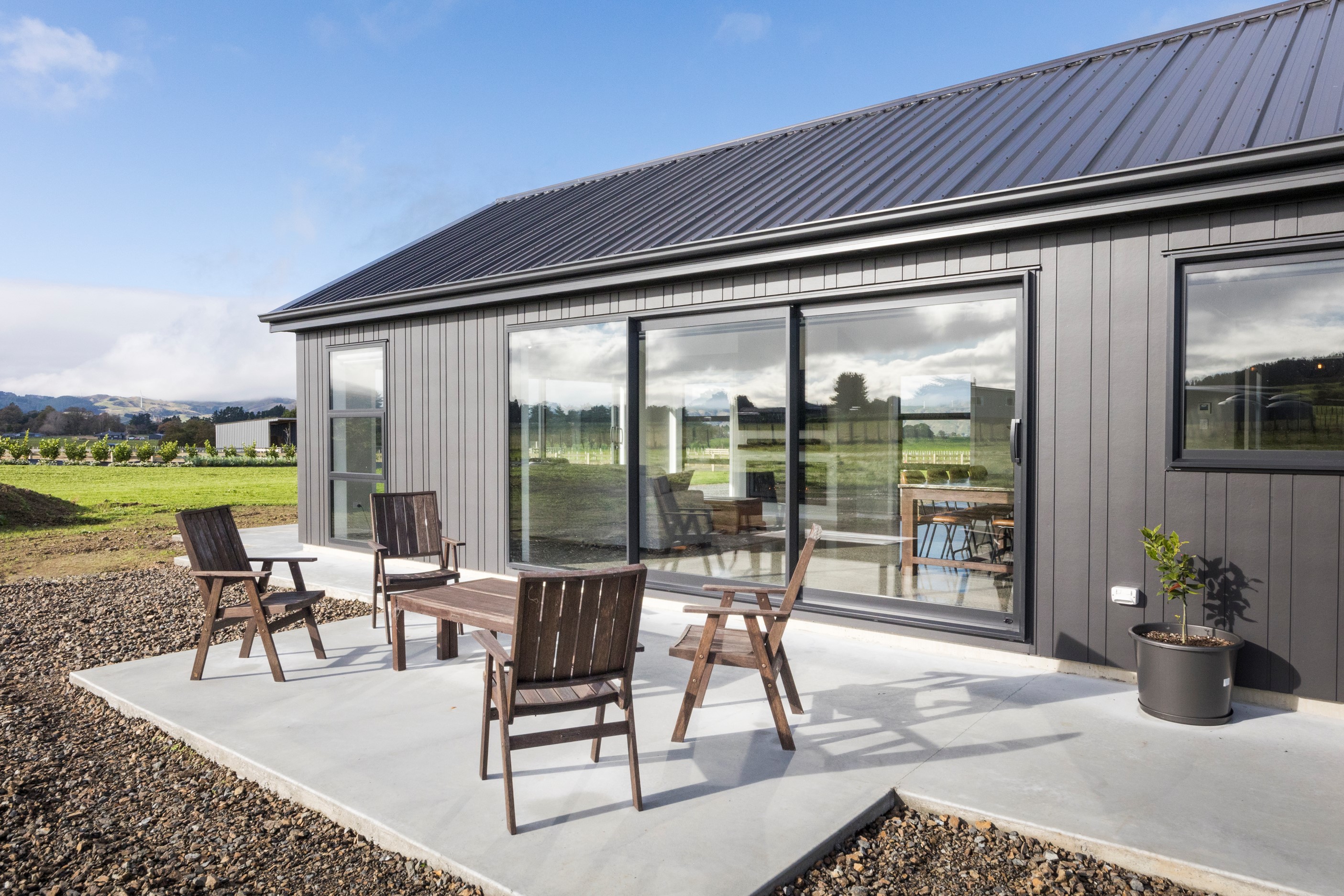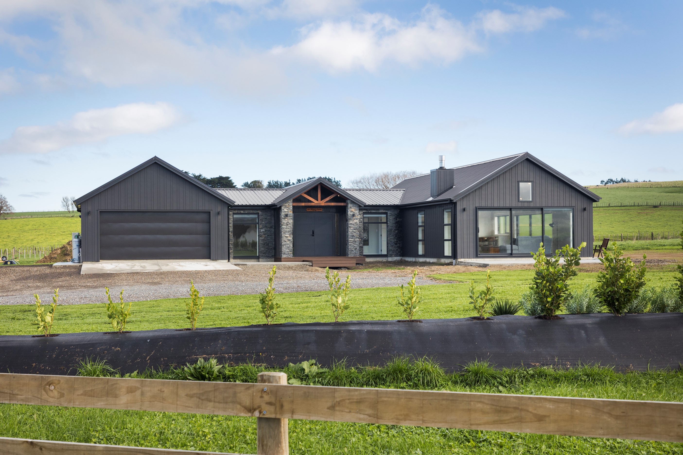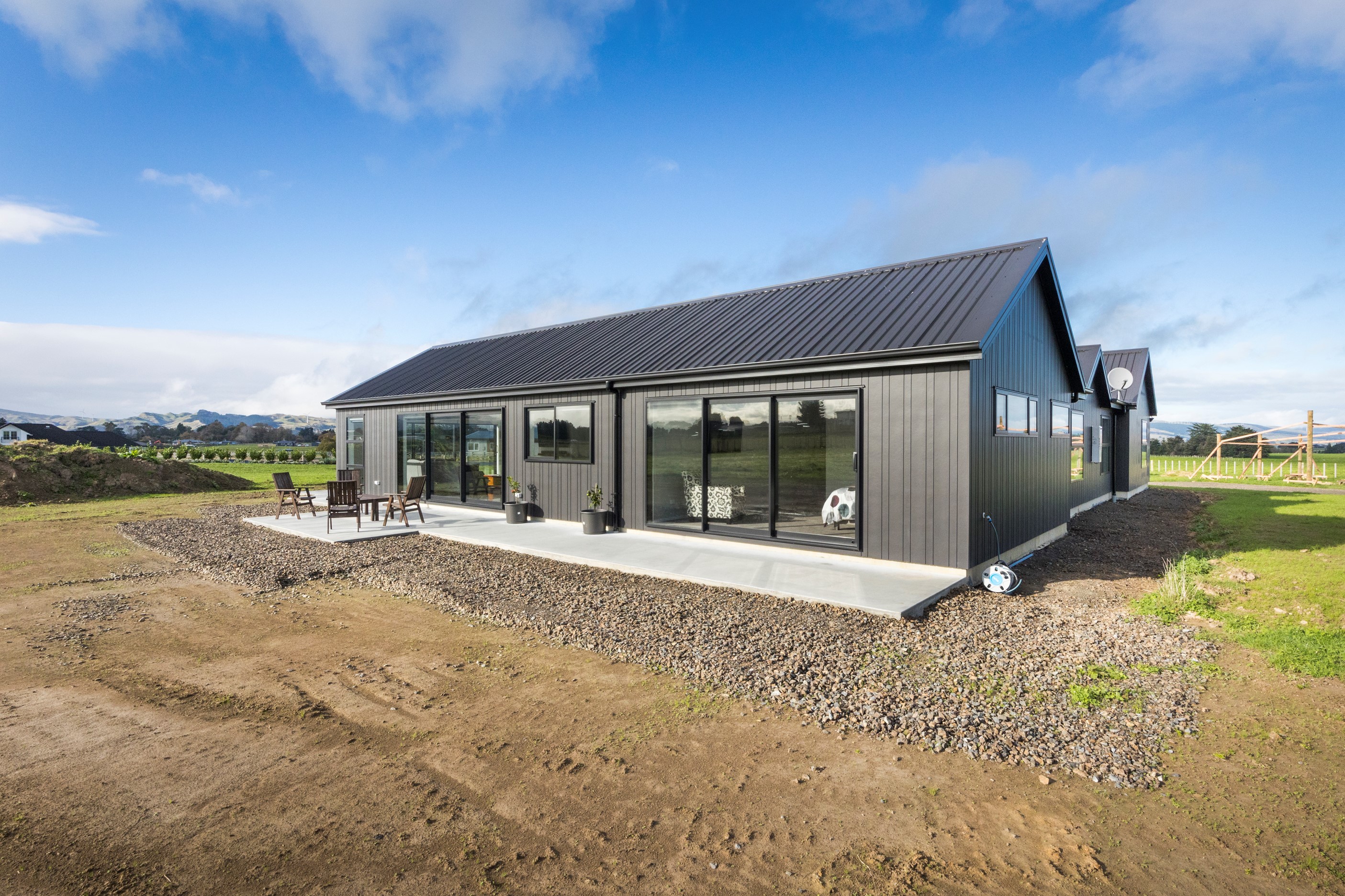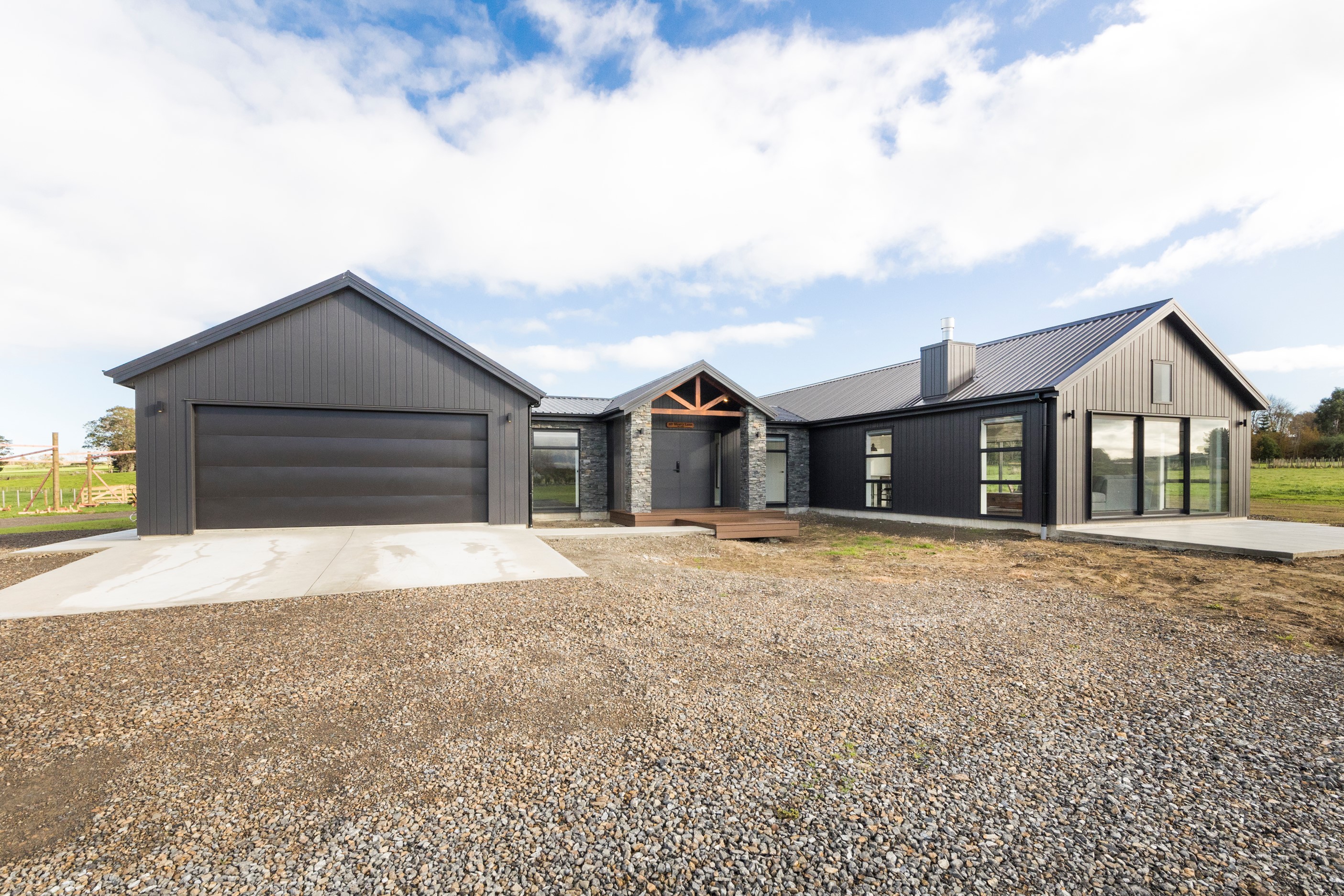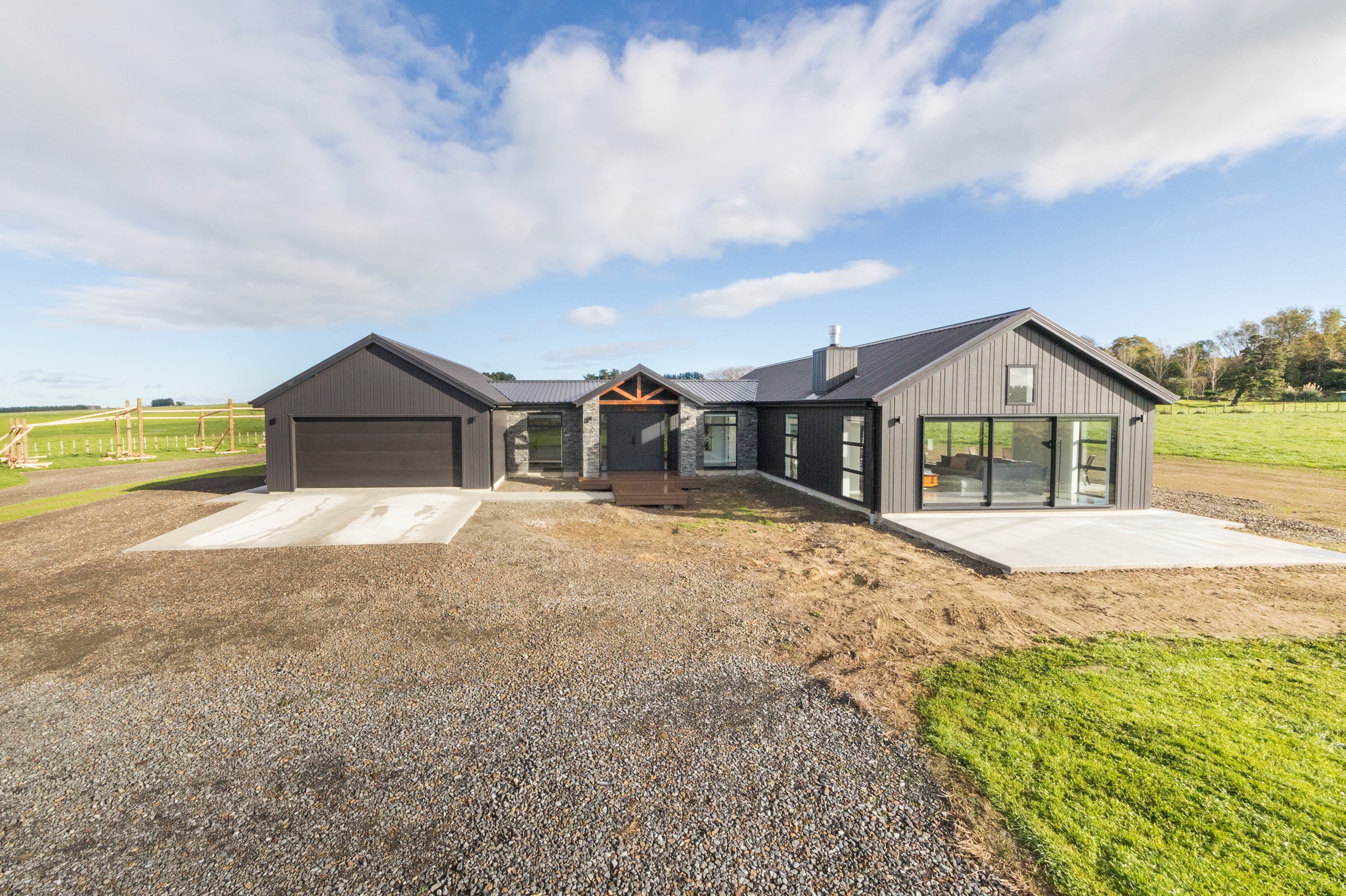 With its three elegant gables and beautiful black exterior, this 271sqm family residence combines the warmth and character of a farm-style home with contemporary design flair. The central gable makes a statement with reclaimed timber as a truss at the entrance. Schist veneer pillars draw further attention to the grand front door. Encompassing four bedrooms and two bathrooms, the home has been designed with comfort, practicality and quality at every turn. As you step inside, the beautifully executed polished concrete floor is just one example of the precision craftsmanship to be found. Large windows and sliders throughout the home fill the interior with natural sunlight and views. The north-facing living area captures picturesque views of the Ruahine Range, while the bedrooms enjoy a vista of the Tararua Range and surrounding farmland. In the main living wing, high scissor truss ceilings add to the sense of space in this already generous open-plan area. To ensure warmth all year round, the home has an underfloor hydronic heating system, and a gas fire in the lounge enhances the cosy ambience.