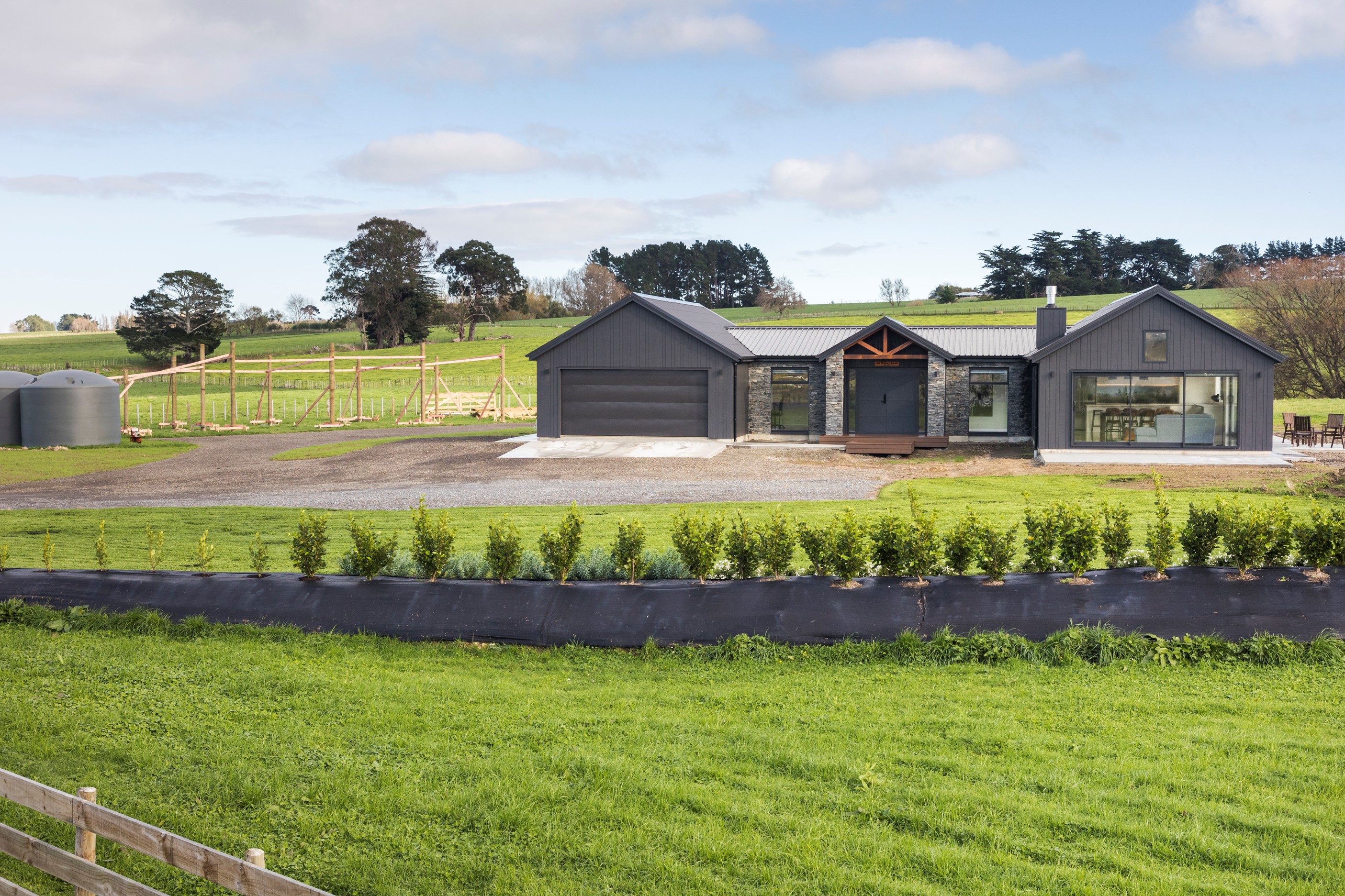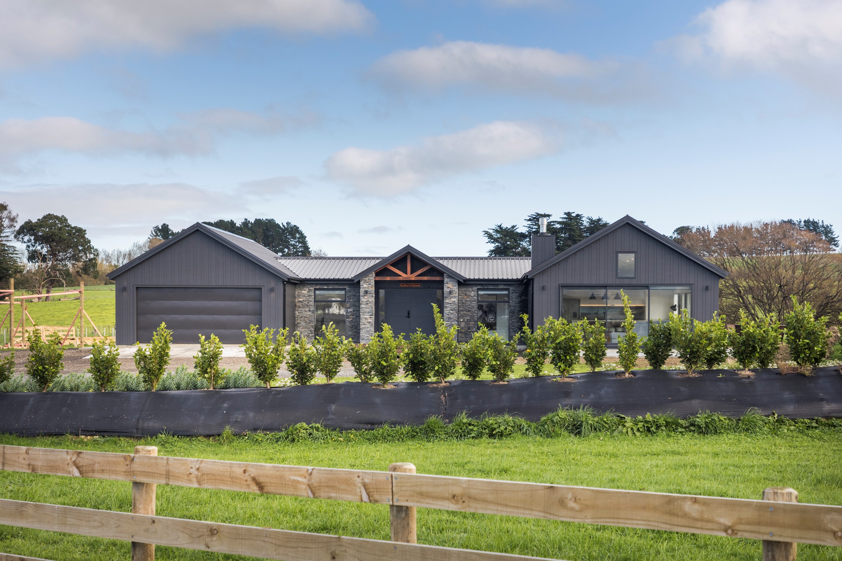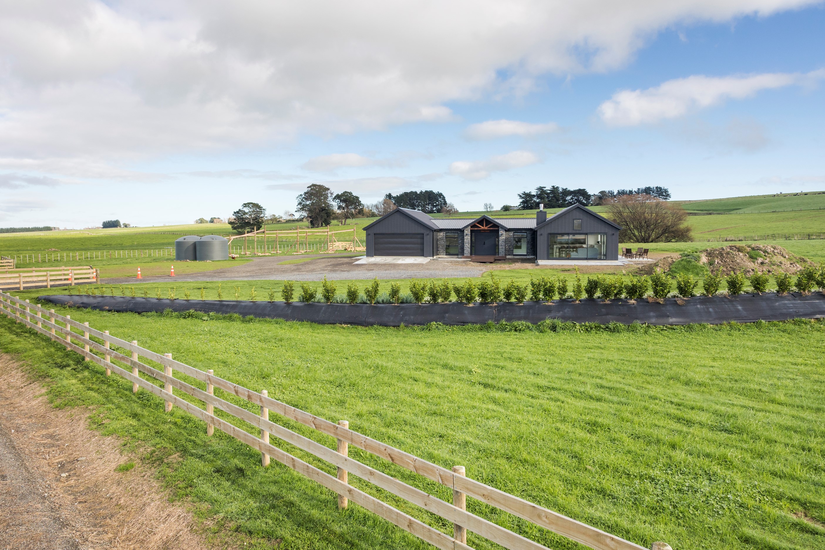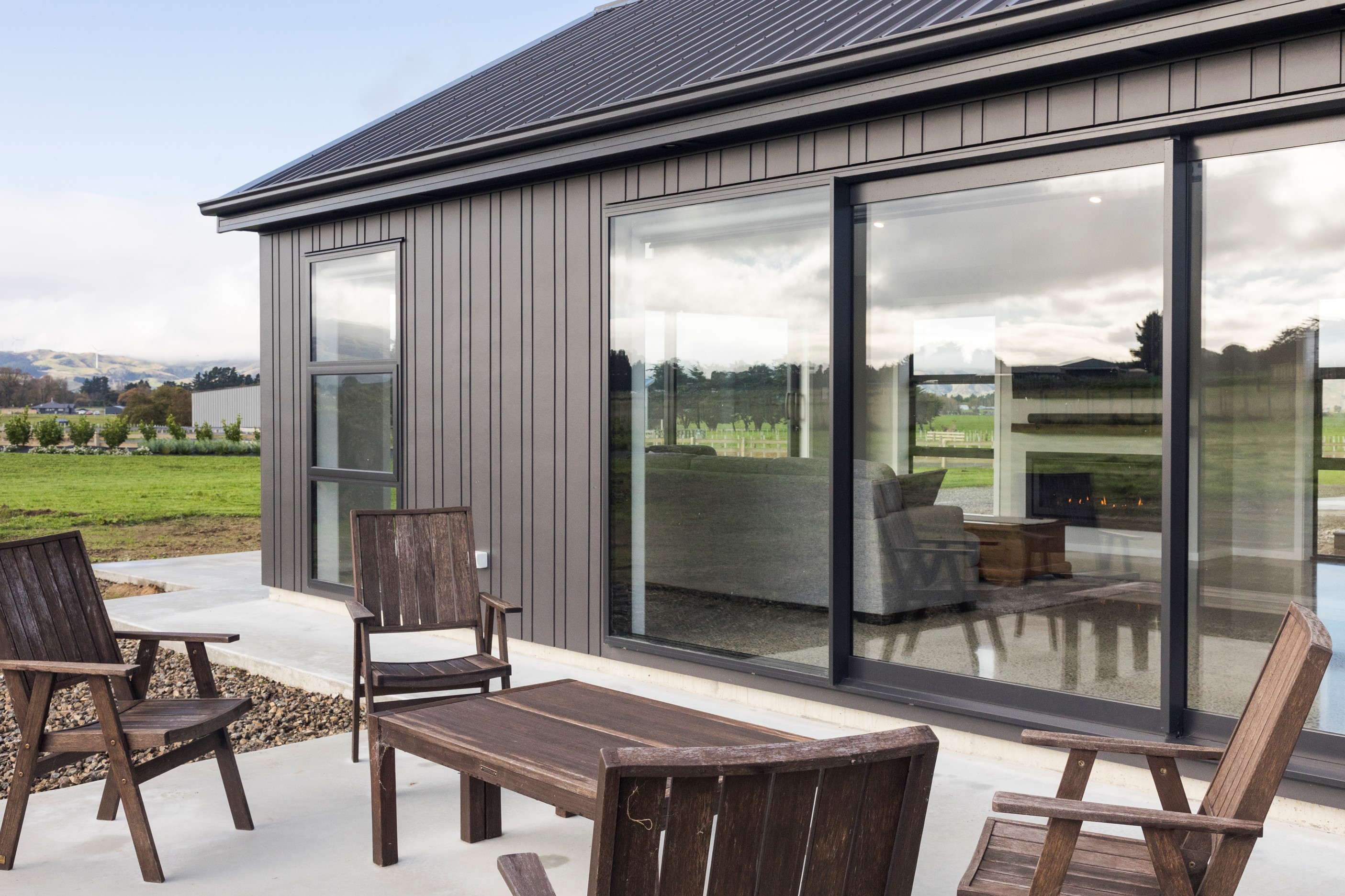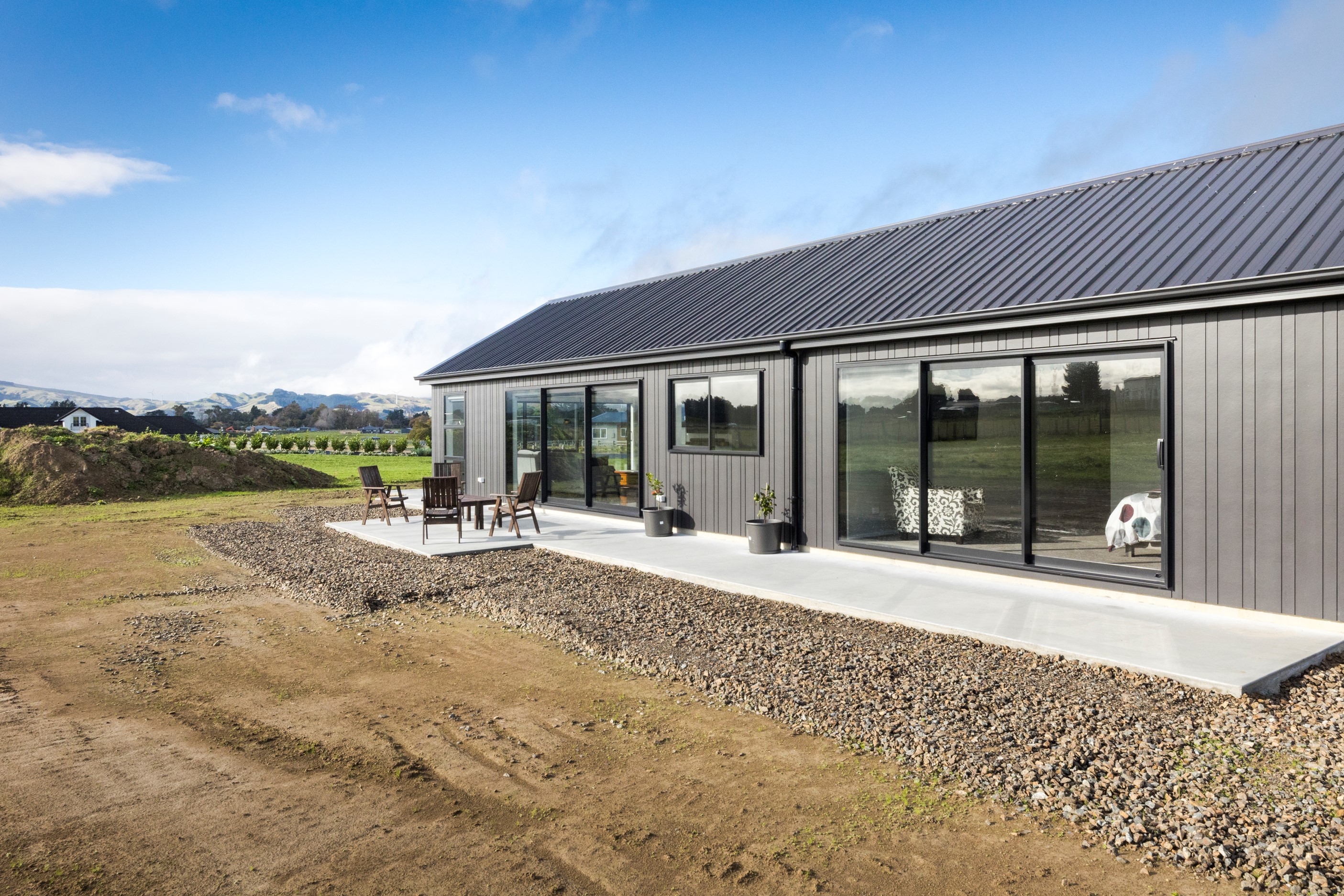 With its three elegant gables and beautiful black exterior, this 271sqm family residence combines the warmth and character of a farm-style home with contemporary design flair. The central gable makes a statement with reclaimed timber as a truss at the entrance. Schist veneer pillars draw further attention to the grand front door. Encompassing four bedrooms and two bathrooms, the home has been designed with comfort, practicality and quality at every turn. As you step inside, the beautifully executed polished concrete floor is just one example of the precision craftsmanship to be found. Large windows and sliders throughout the home fill the interior with natural sunlight and views. The north-facing living area captures picturesque views of the Ruahine Range, while the bedrooms enjoy a vista of the Tararua Range and surrounding farmland. In the main living wing, high scissor truss ceilings add to the sense of space in this already generous open-plan area. To ensure warmth all year round, the home has an underfloor hydronic heating system, and a gas fire in the lounge enhances the cosy ambience.