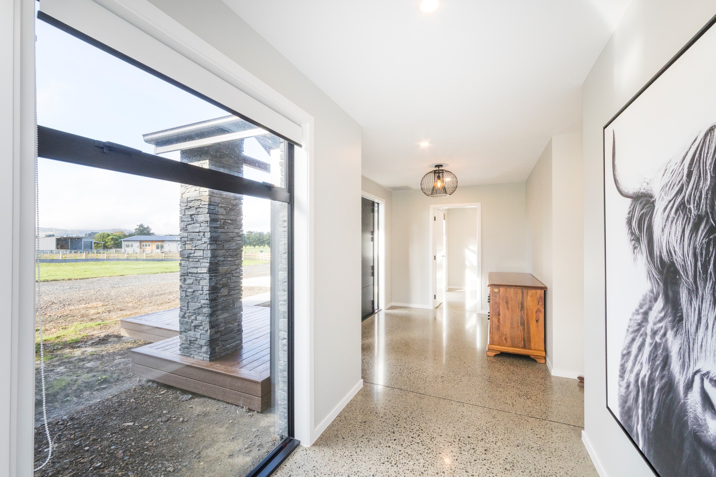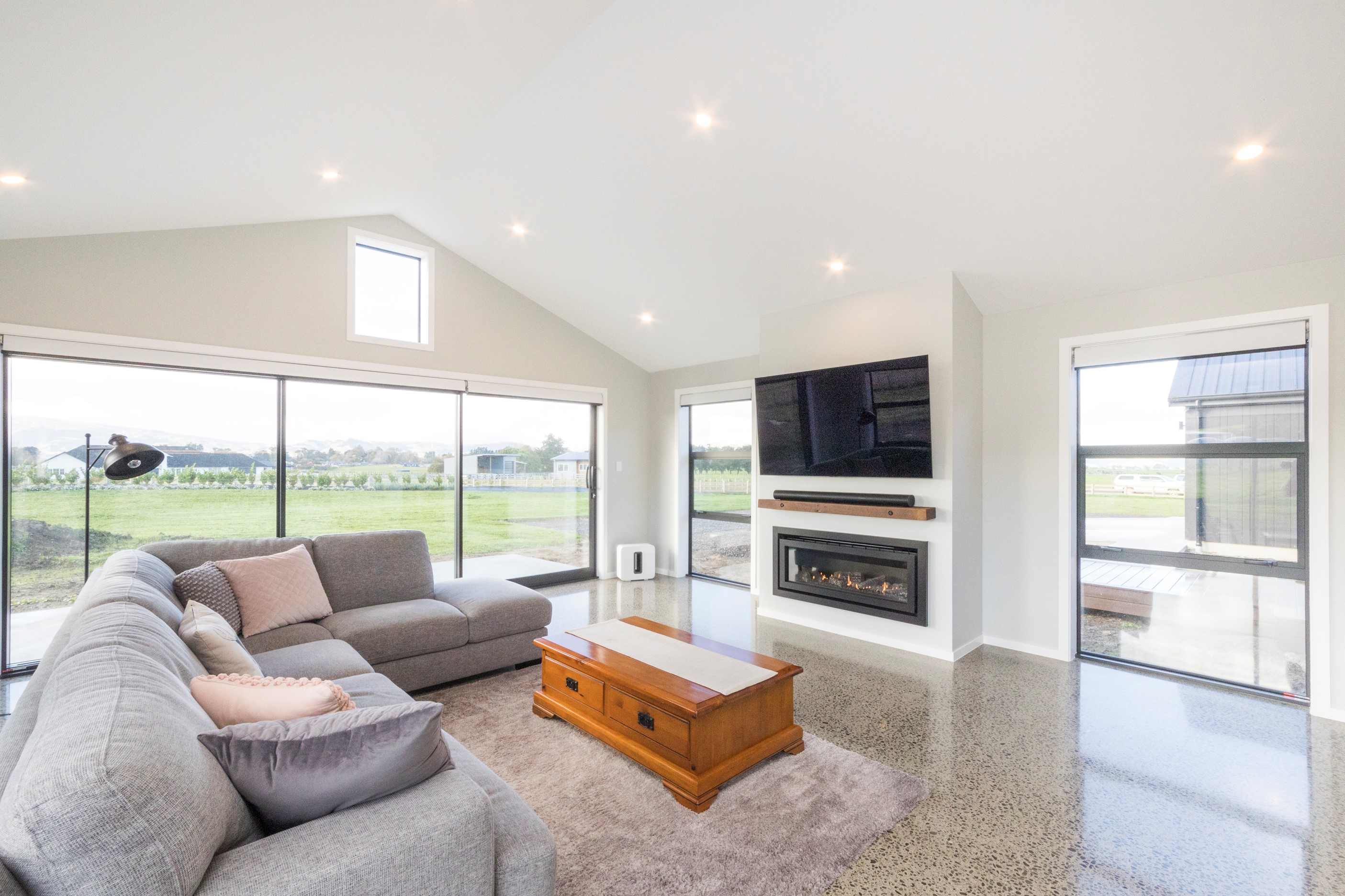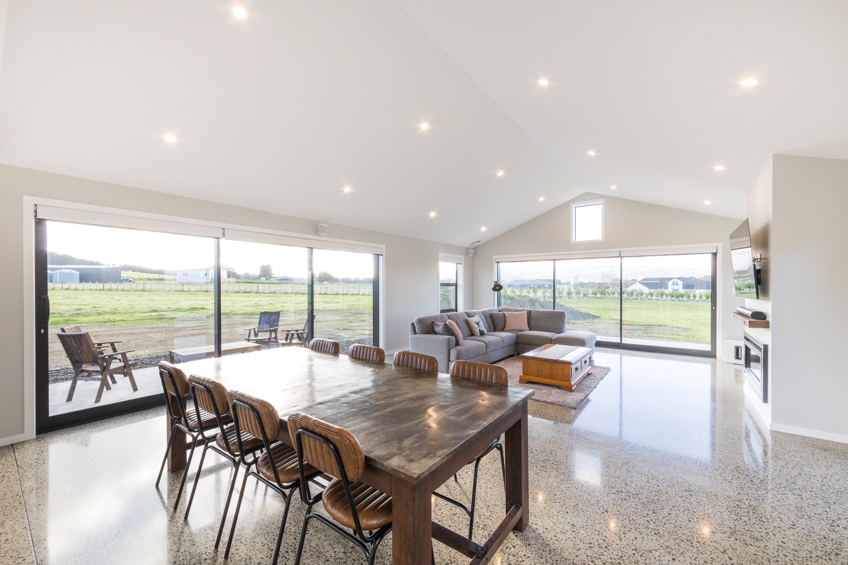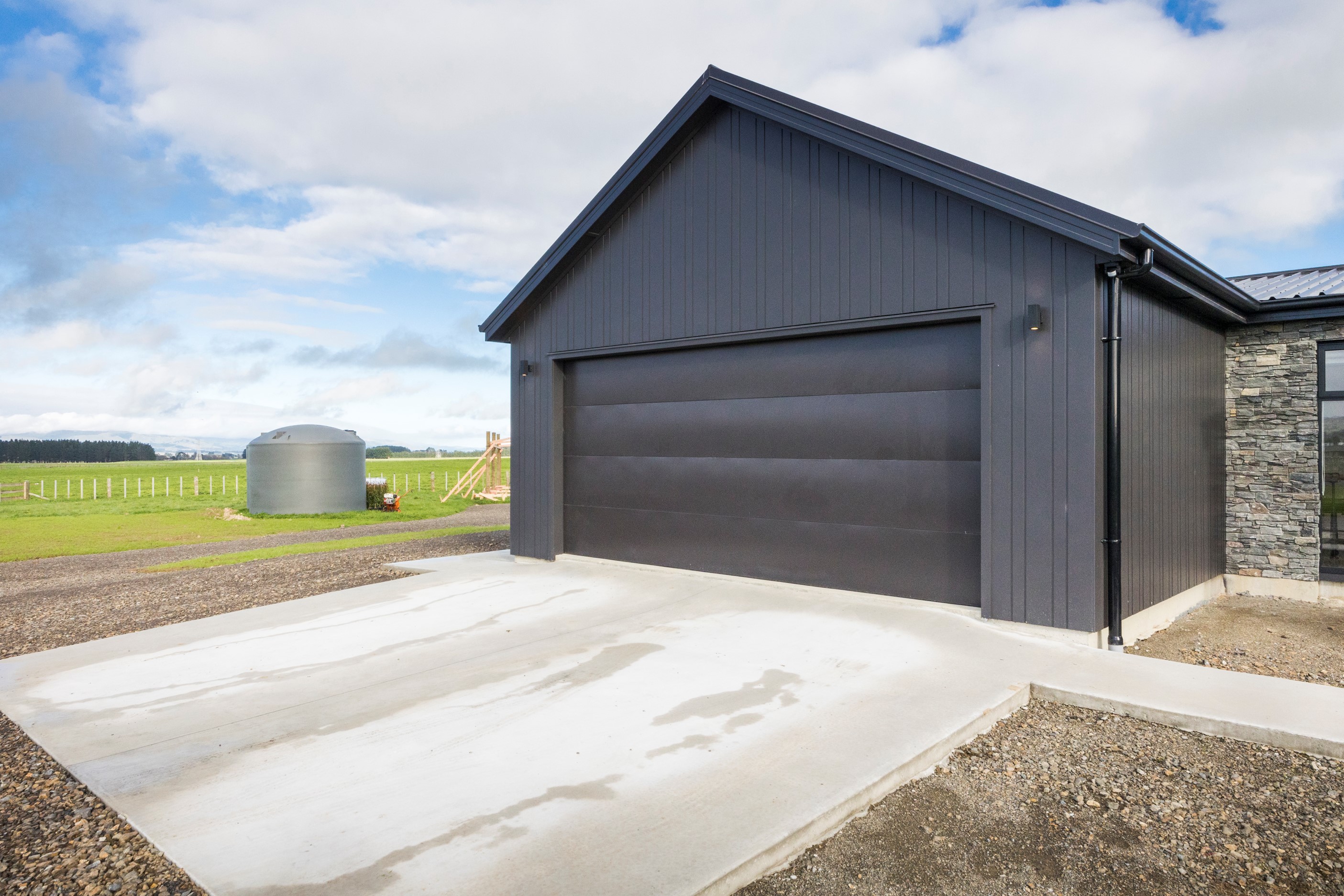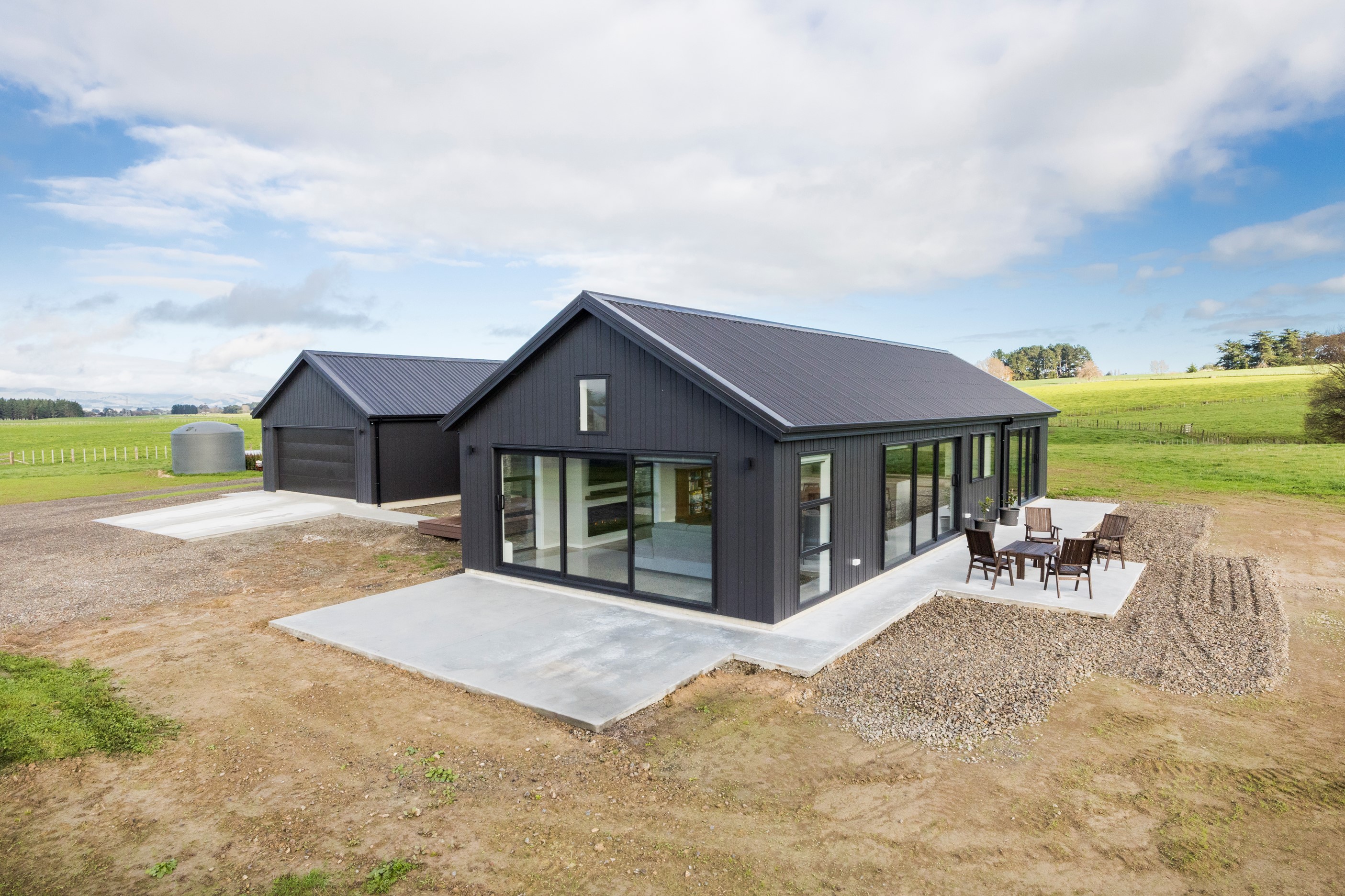 With its three elegant gables and beautiful black exterior, this 271sqm family residence combines the warmth and character of a farm-style home with contemporary design flair. The central gable makes a statement with reclaimed timber as a truss at the entrance. Schist veneer pillars draw further attention to the grand front door. Encompassing four bedrooms and two bathrooms, the home has been designed with comfort, practicality and quality at every turn. As you step inside, the beautifully executed polished concrete floor is just one example of the precision craftsmanship to be found. Large windows and sliders throughout the home fill the interior with natural sunlight and views. The north-facing living area captures picturesque views of the Ruahine Range, while the bedrooms enjoy a vista of the Tararua Range and surrounding farmland. In the main living wing, high scissor truss ceilings add to the sense of space in this already generous open-plan area. To ensure warmth all year round, the home has an underfloor hydronic heating system, and a gas fire in the lounge enhances the cosy ambience.