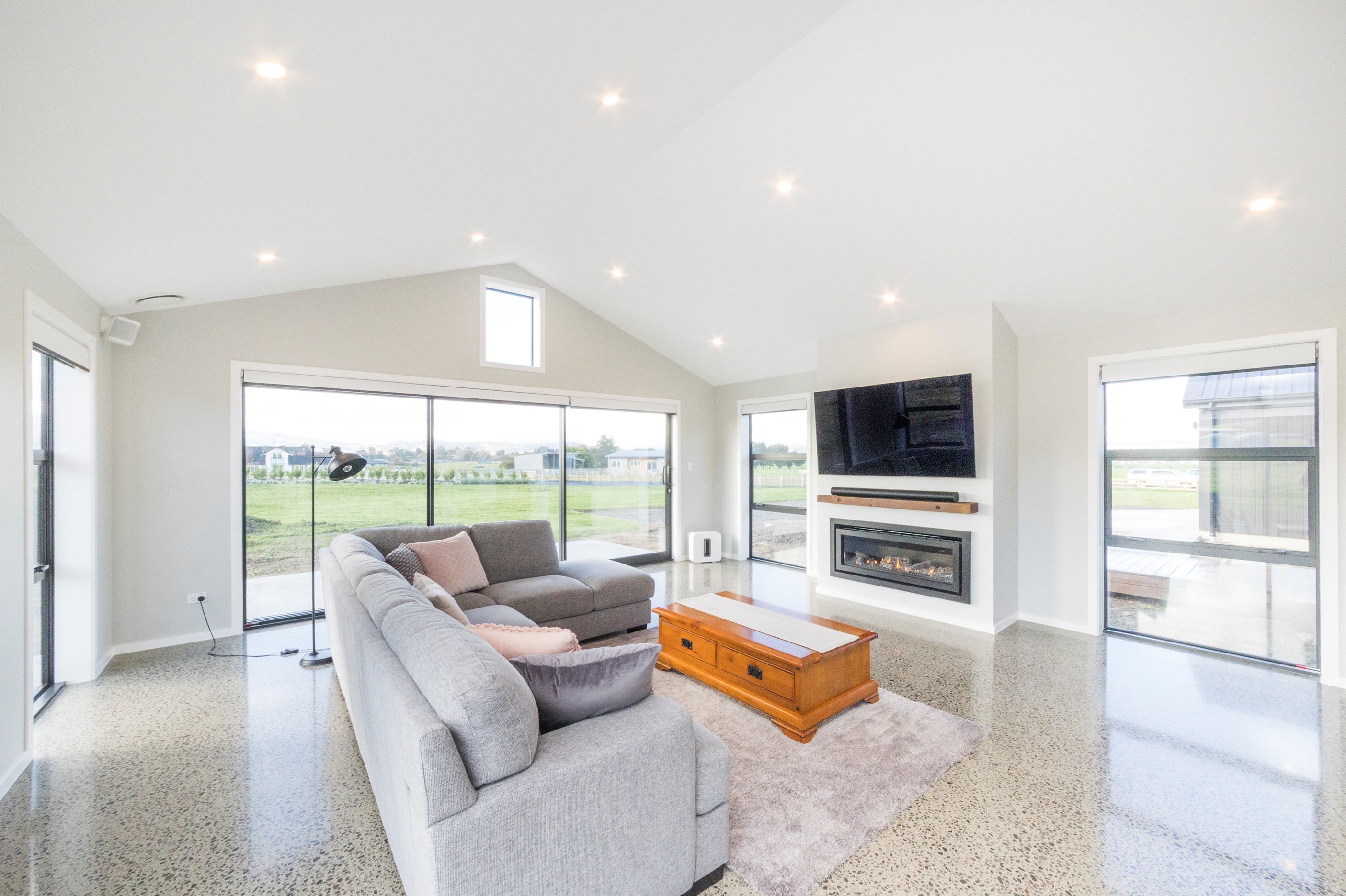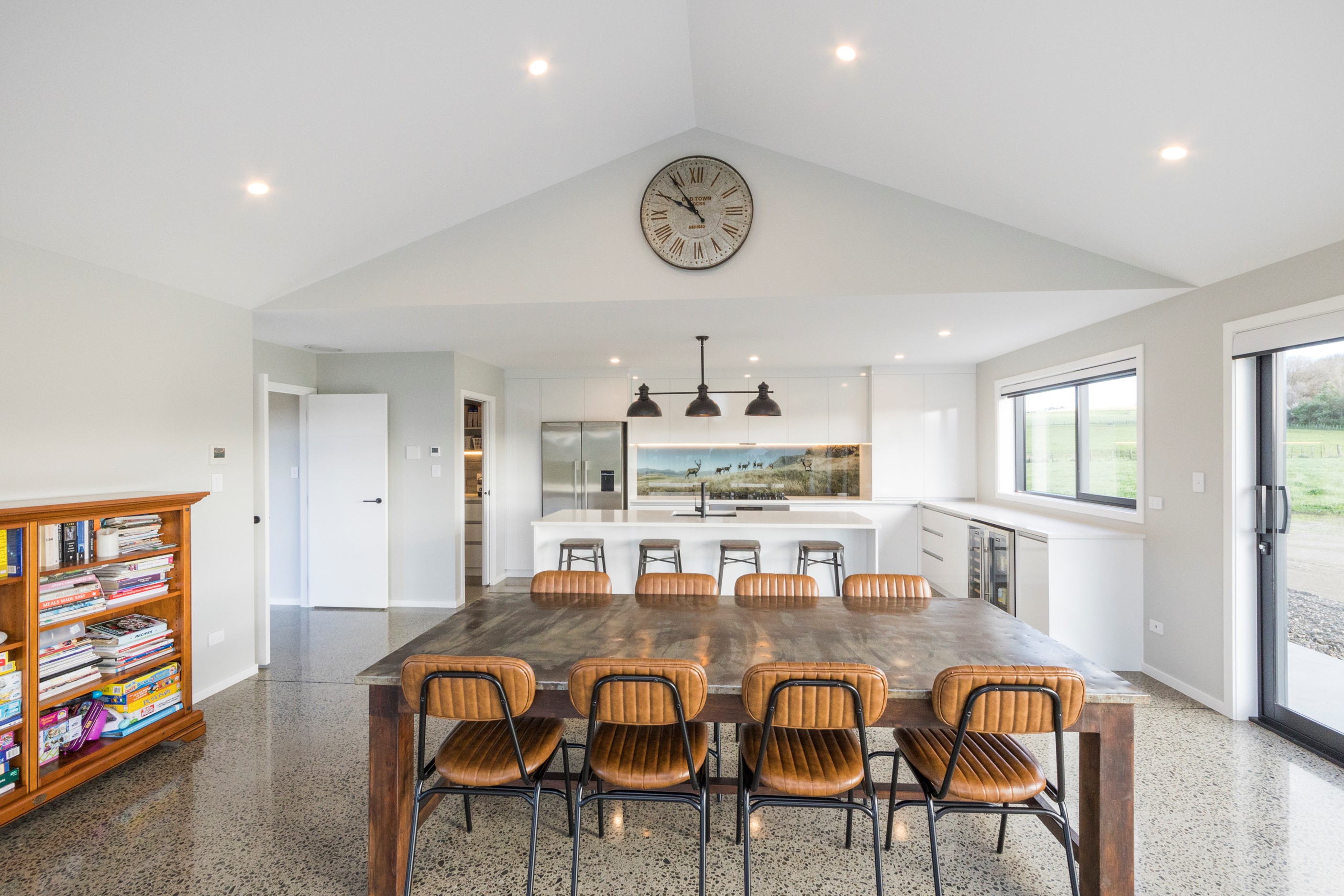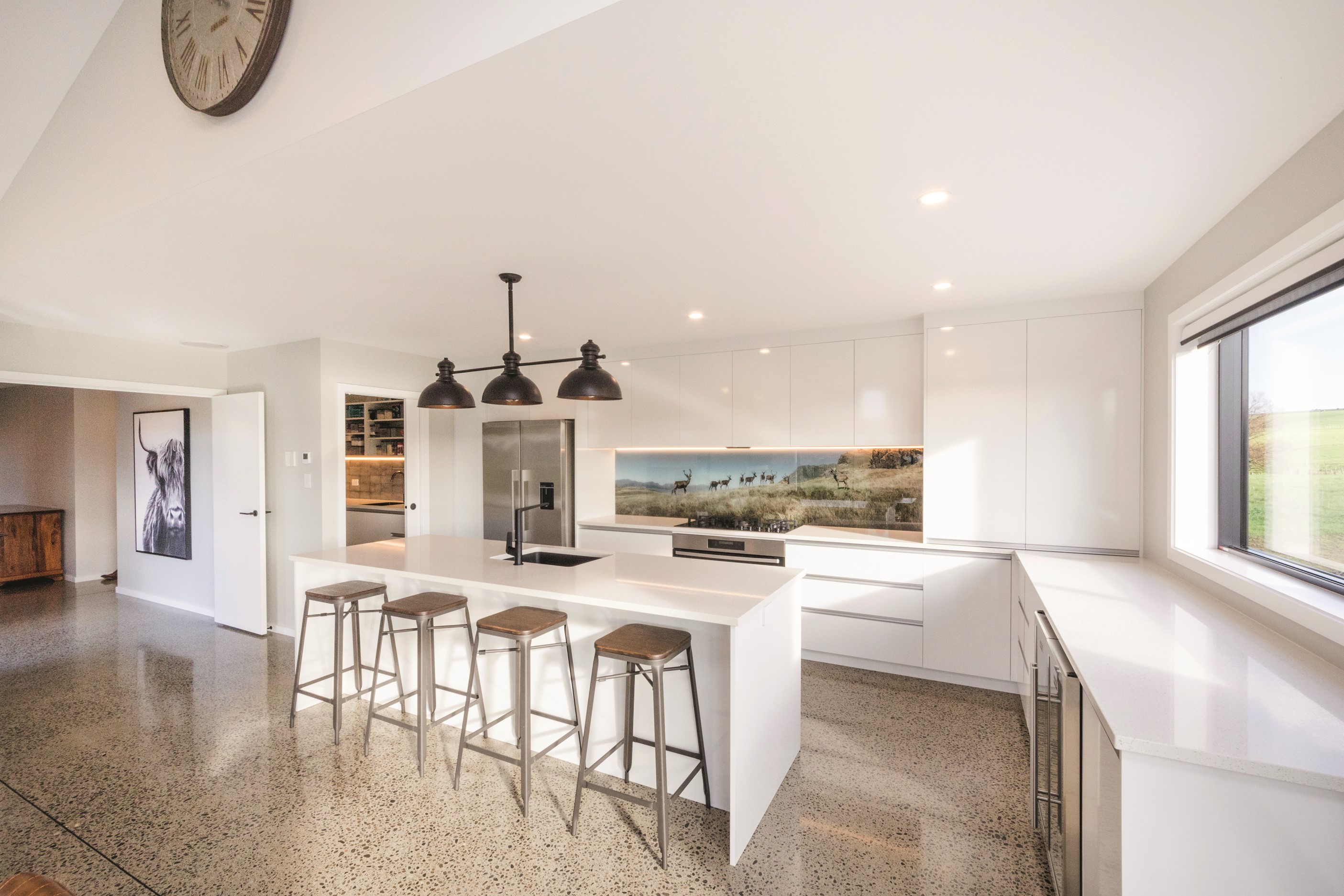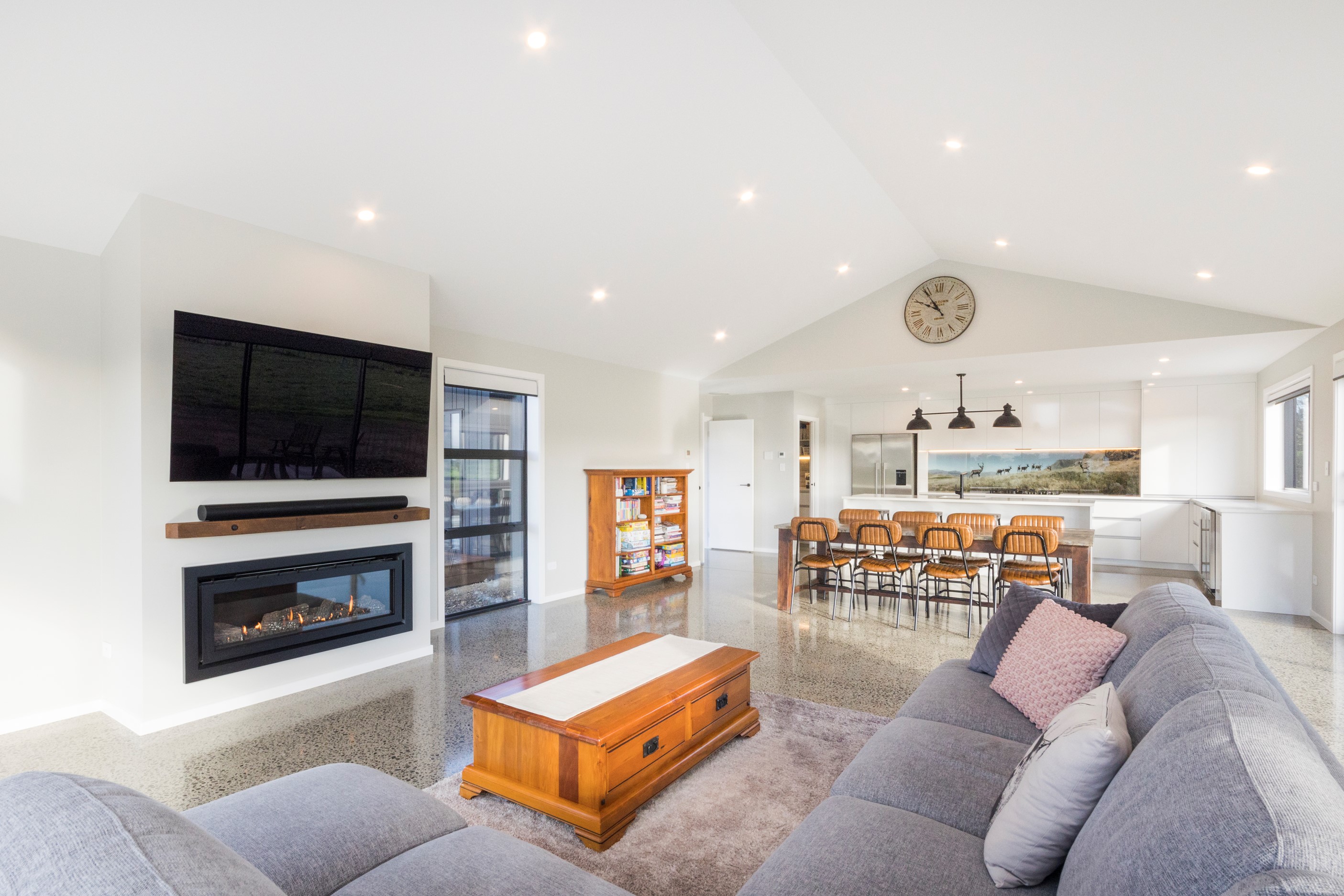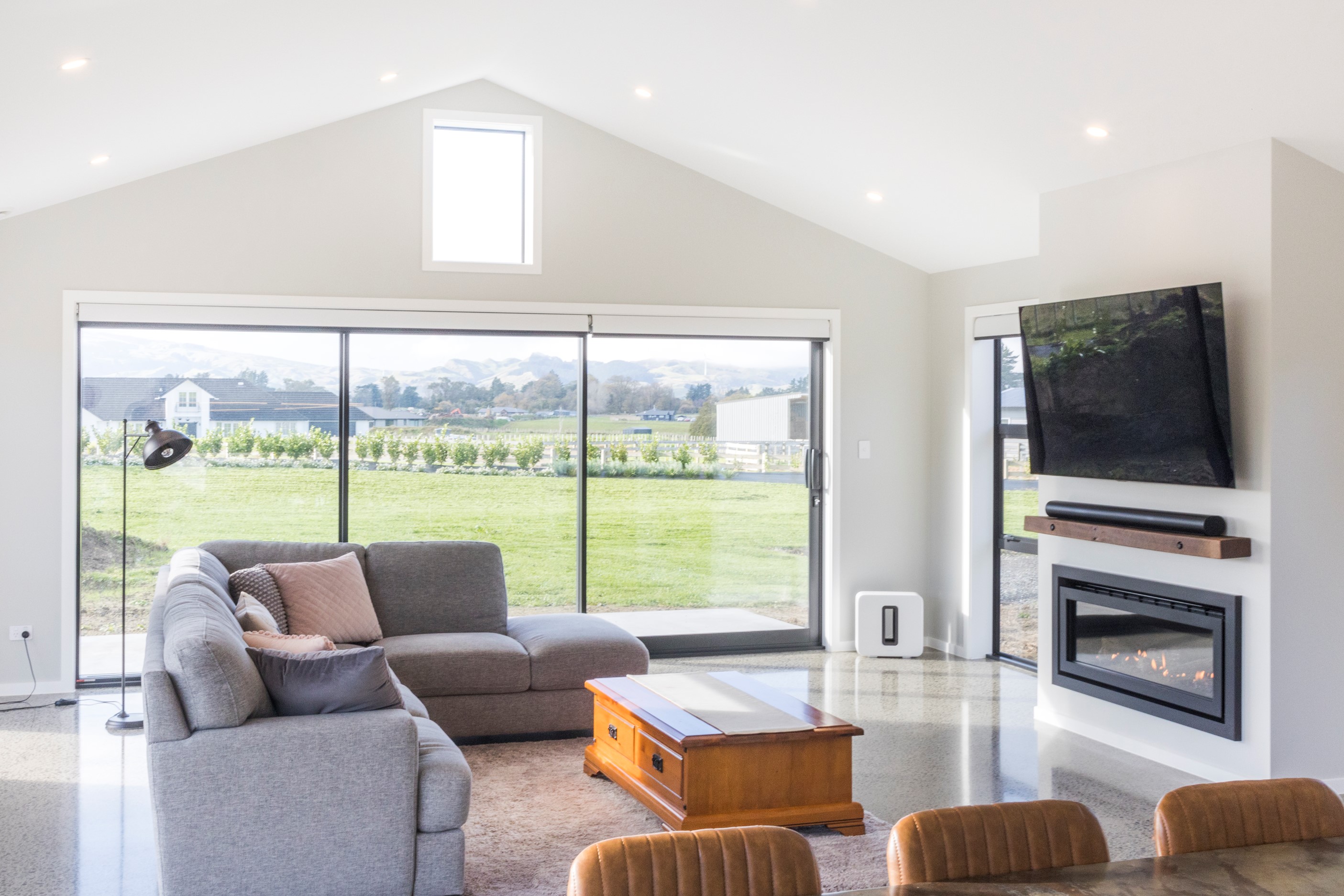 With its three elegant gables and beautiful black exterior, this 271sqm family residence combines the warmth and character of a farm-style home with contemporary design flair. The central gable makes a statement with reclaimed timber as a truss at the entrance. Schist veneer pillars draw further attention to the grand front door. Encompassing four bedrooms and two bathrooms, the home has been designed with comfort, practicality and quality at every turn. As you step inside, the beautifully executed polished concrete floor is just one example of the precision craftsmanship to be found. Large windows and sliders throughout the home fill the interior with natural sunlight and views. The north-facing living area captures picturesque views of the Ruahine Range, while the bedrooms enjoy a vista of the Tararua Range and surrounding farmland. In the main living wing, high scissor truss ceilings add to the sense of space in this already generous open-plan area. To ensure warmth all year round, the home has an underfloor hydronic heating system, and a gas fire in the lounge enhances the cosy ambience.