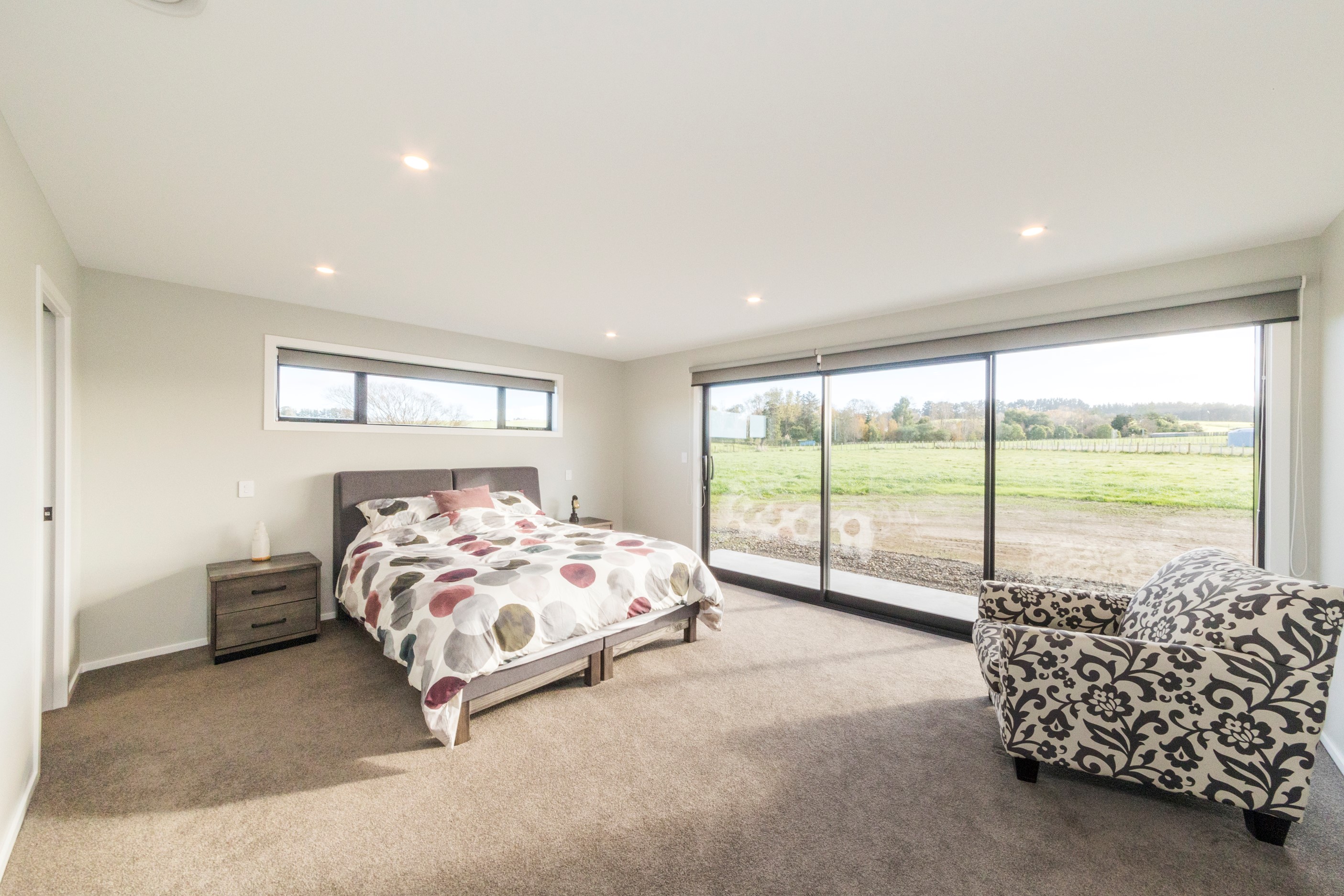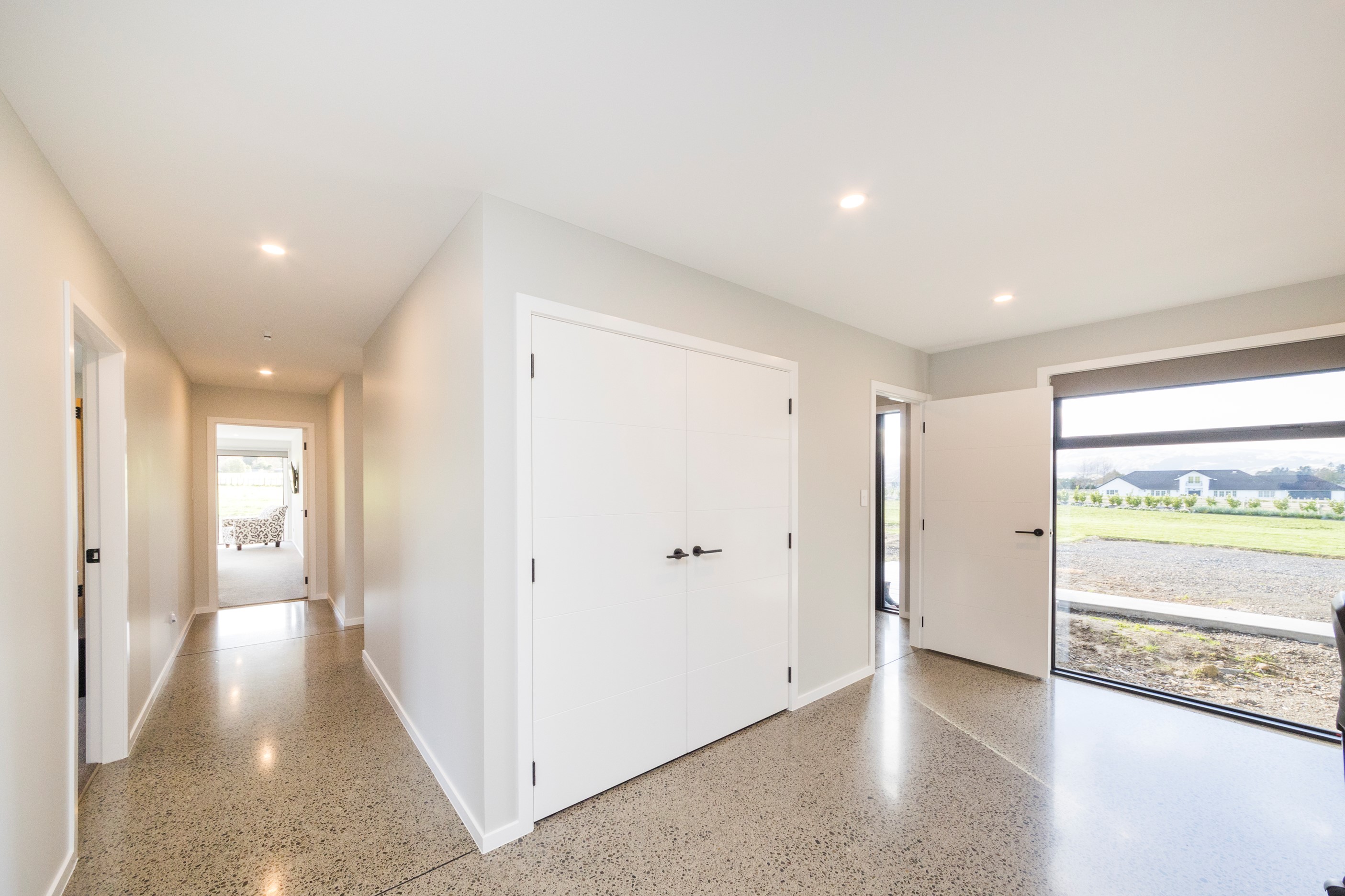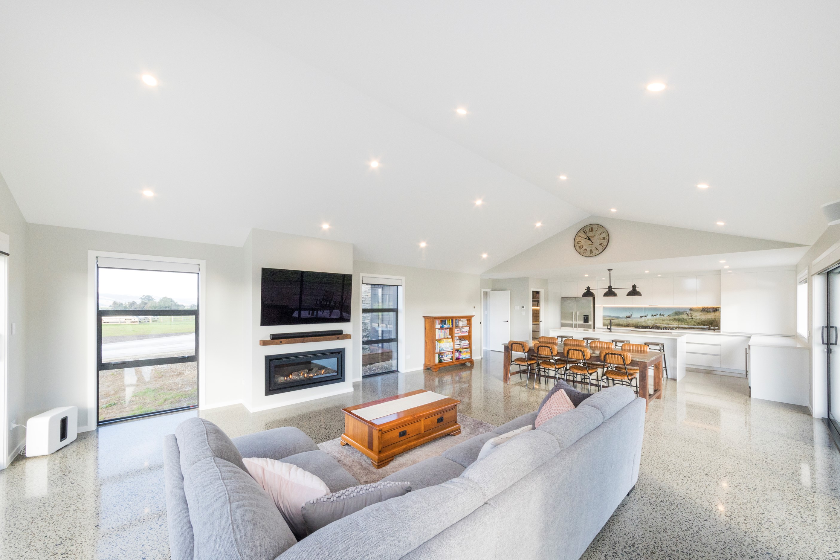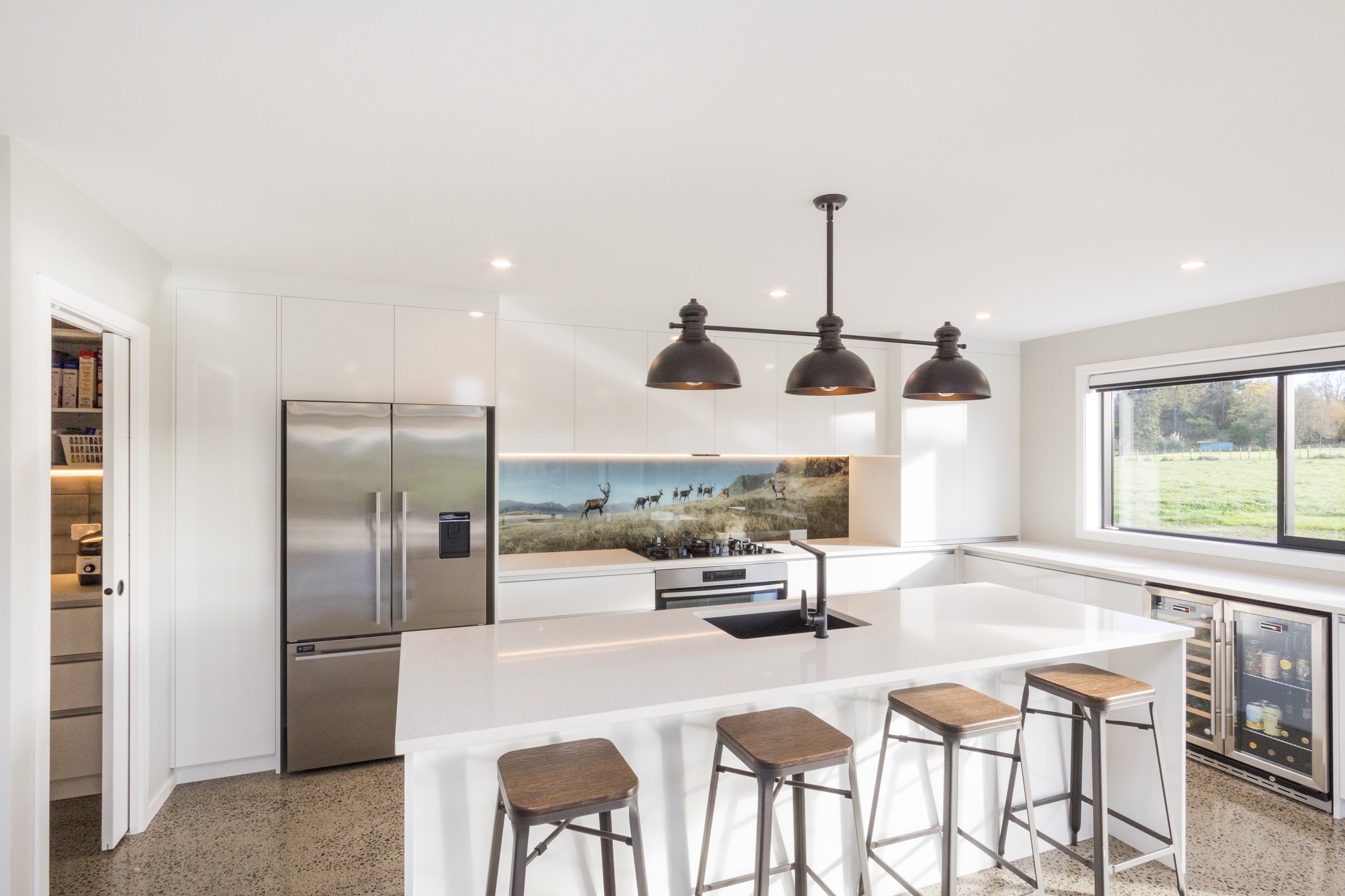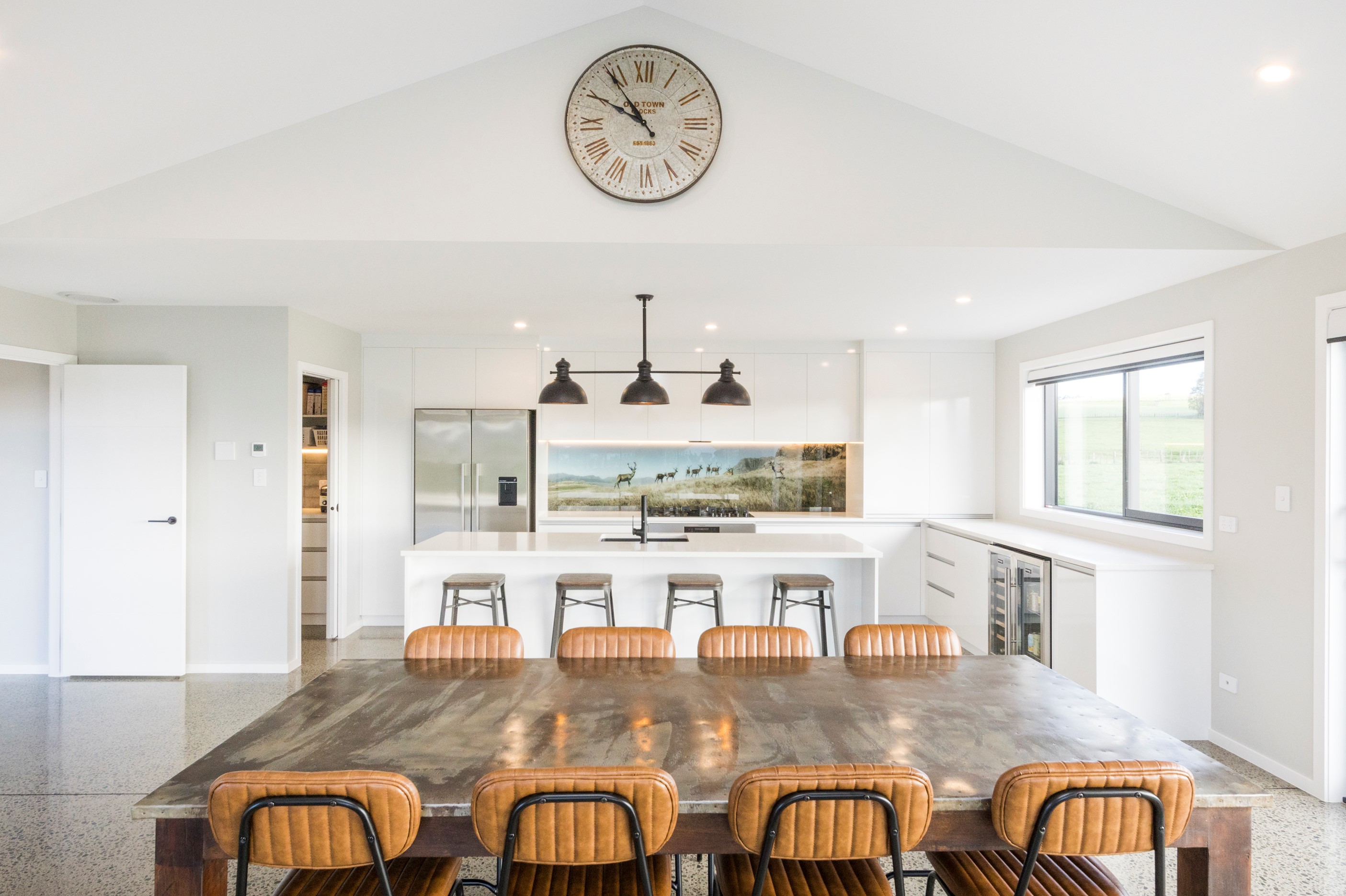 With its three elegant gables and beautiful black exterior, this 271sqm family residence combines the warmth and character of a farm-style home with contemporary design flair. The central gable makes a statement with reclaimed timber as a truss at the entrance. Schist veneer pillars draw further attention to the grand front door. Encompassing four bedrooms and two bathrooms, the home has been designed with comfort, practicality and quality at every turn. As you step inside, the beautifully executed polished concrete floor is just one example of the precision craftsmanship to be found. Large windows and sliders throughout the home fill the interior with natural sunlight and views. The north-facing living area captures picturesque views of the Ruahine Range, while the bedrooms enjoy a vista of the Tararua Range and surrounding farmland. In the main living wing, high scissor truss ceilings add to the sense of space in this already generous open-plan area. To ensure warmth all year round, the home has an underfloor hydronic heating system, and a gas fire in the lounge enhances the cosy ambience.