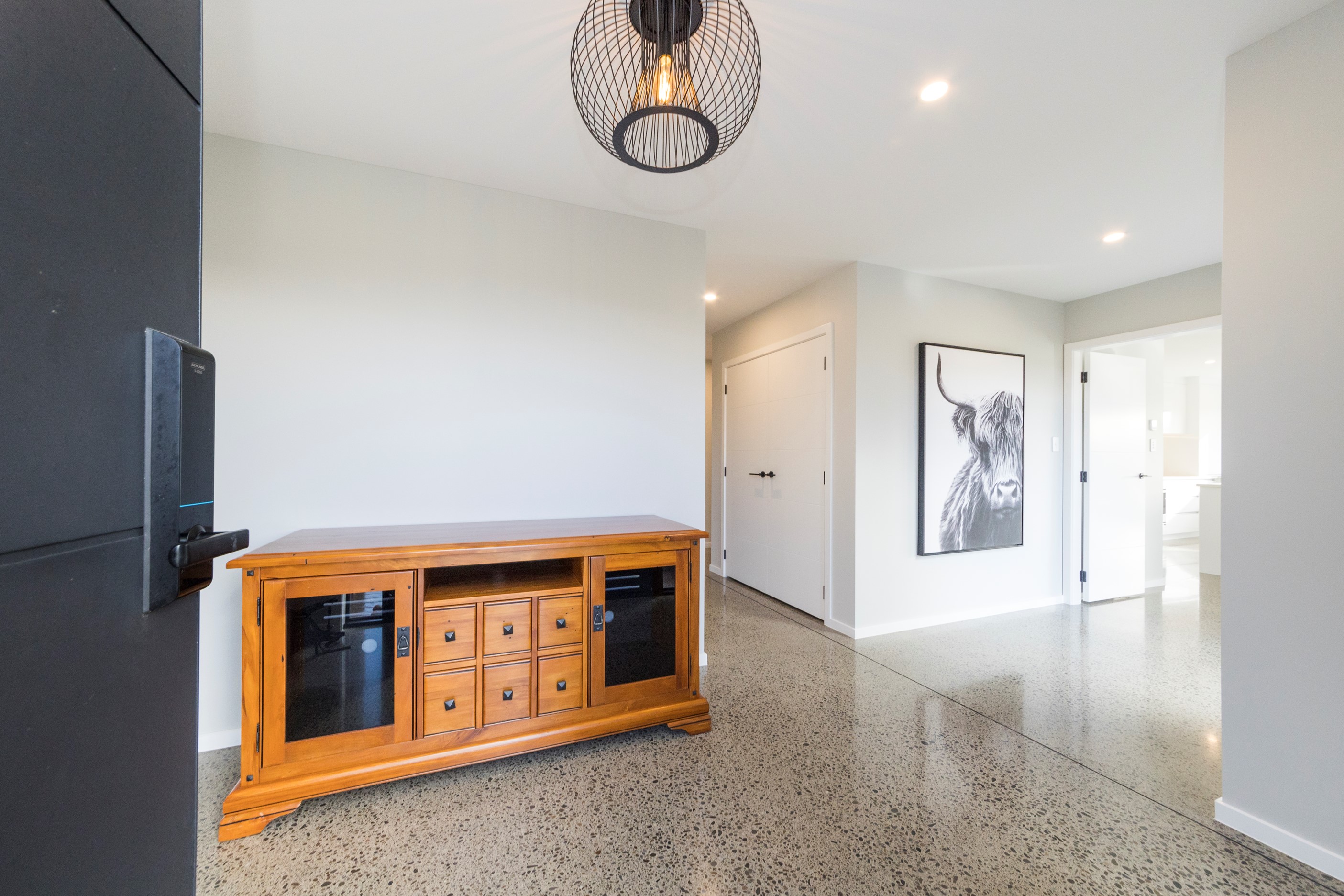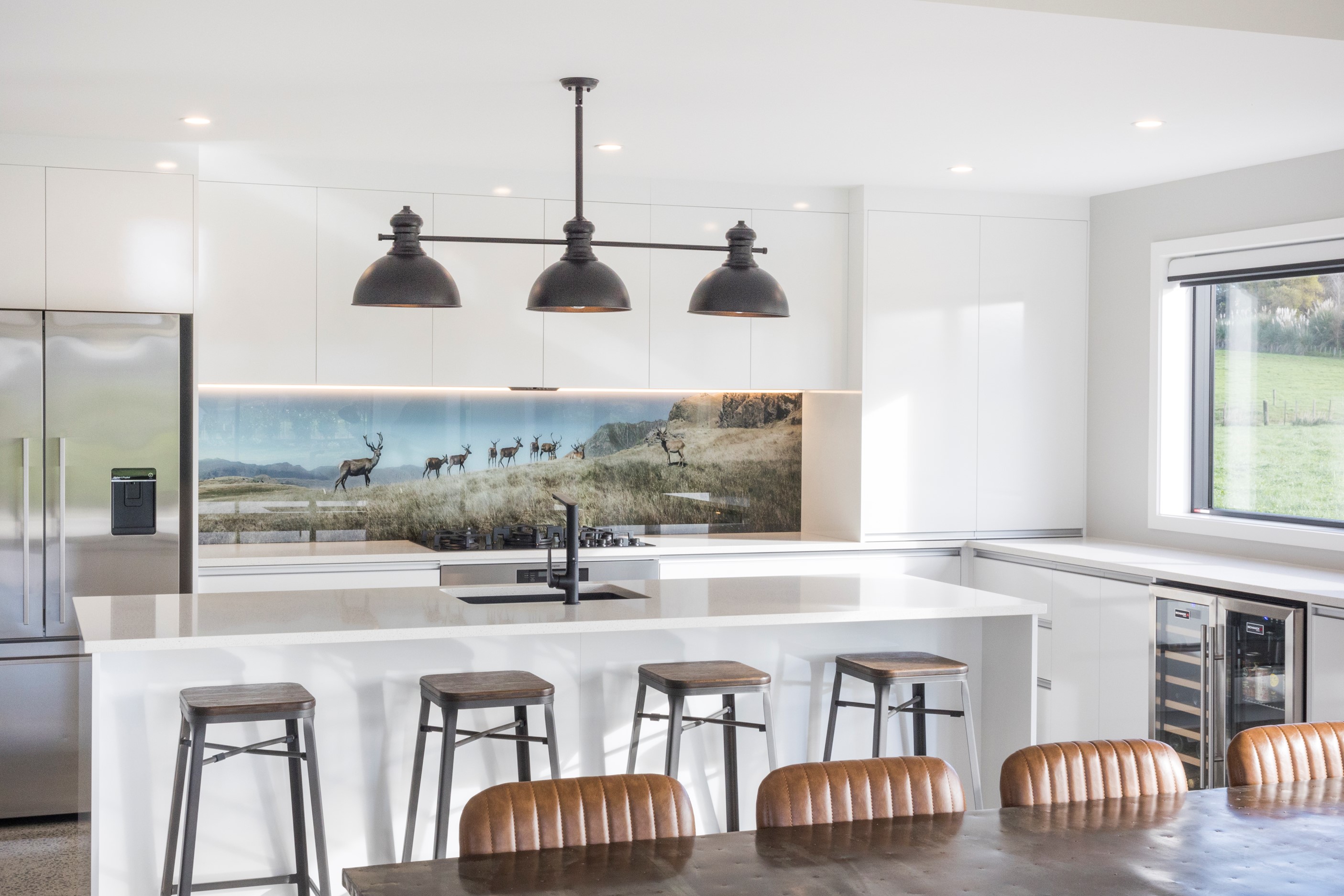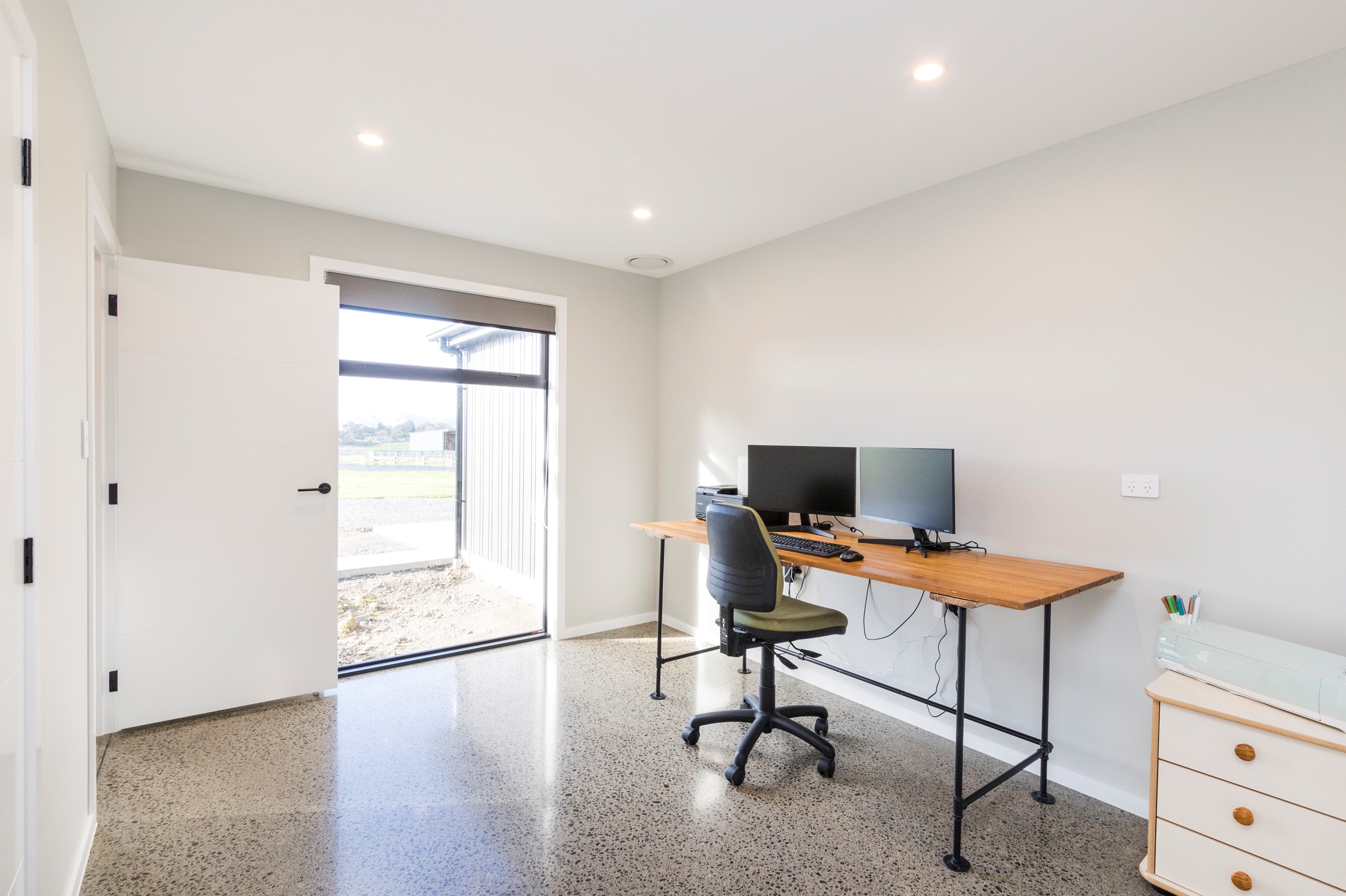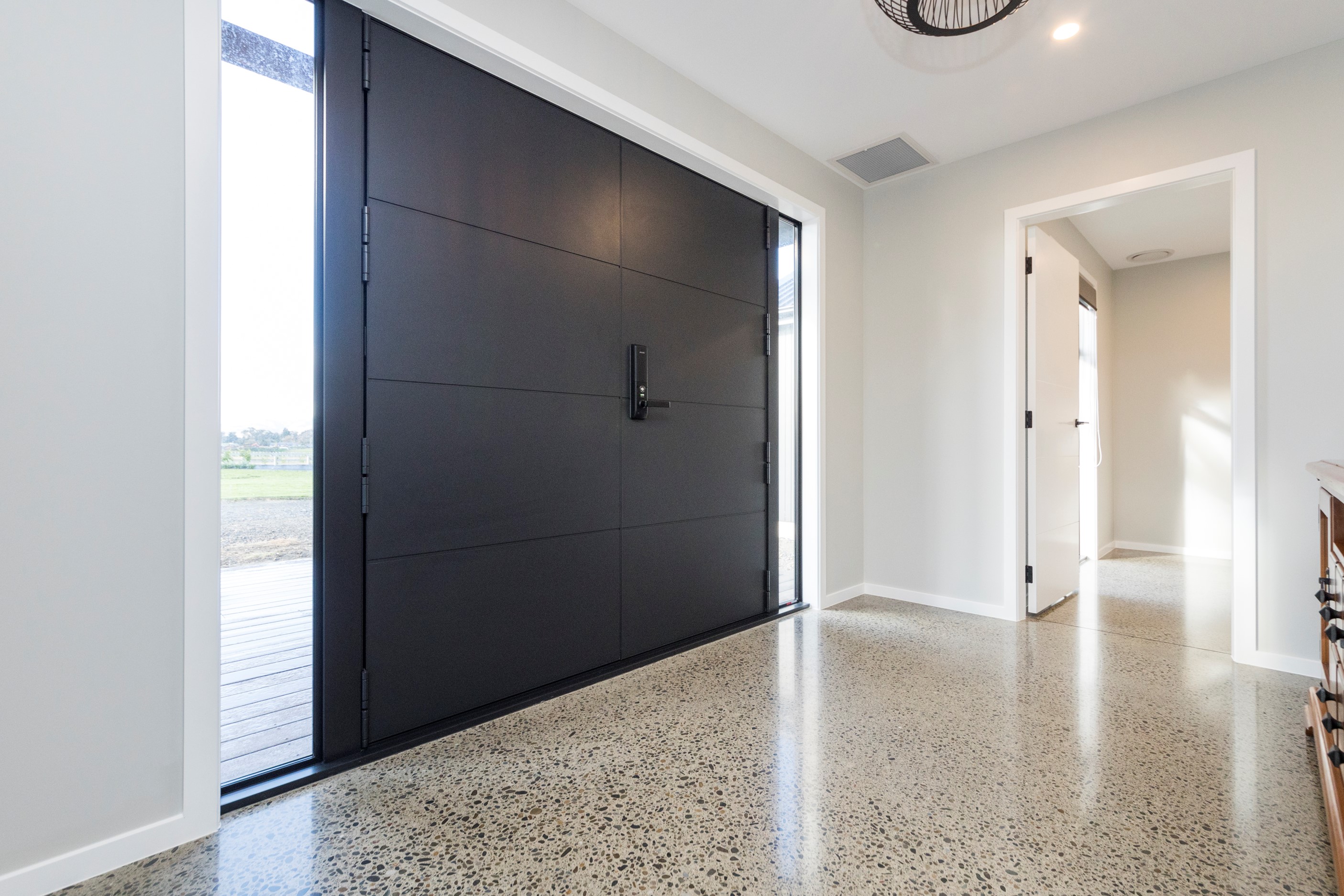 With its three elegant gables and beautiful black exterior, this 271sqm family residence combines the warmth and character of a farm-style home with contemporary design flair. The central gable makes a statement with reclaimed timber as a truss at the entrance. Schist veneer pillars draw further attention to the grand front door. Encompassing four bedrooms and two bathrooms, the home has been designed with comfort, practicality and quality at every turn. As you step inside, the beautifully executed polished concrete floor is just one example of the precision craftsmanship to be found. Large windows and sliders throughout the home fill the interior with natural sunlight and views. The north-facing living area captures picturesque views of the Ruahine Range, while the bedrooms enjoy a vista of the Tararua Range and surrounding farmland. In the main living wing, high scissor truss ceilings add to the sense of space in this already generous open-plan area. To ensure warmth all year round, the home has an underfloor hydronic heating system, and a gas fire in the lounge enhances the cosy ambience.