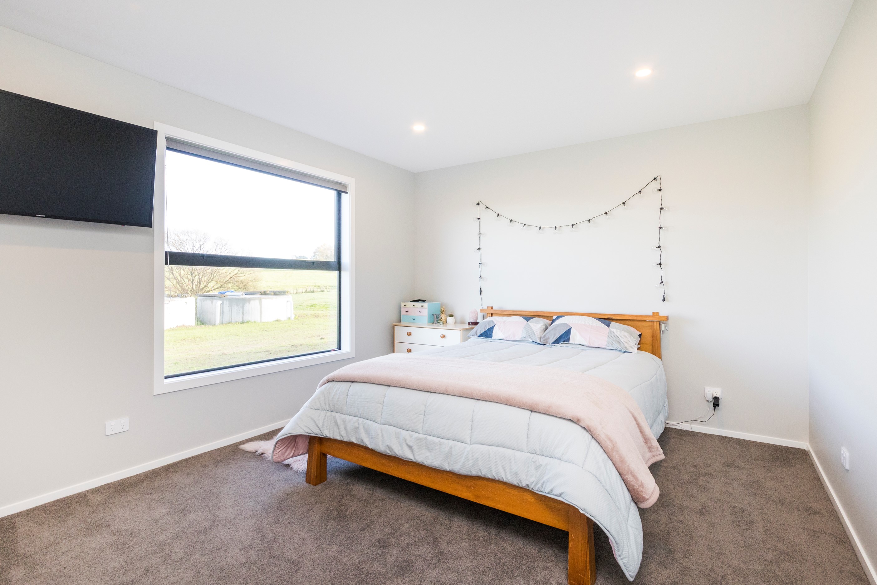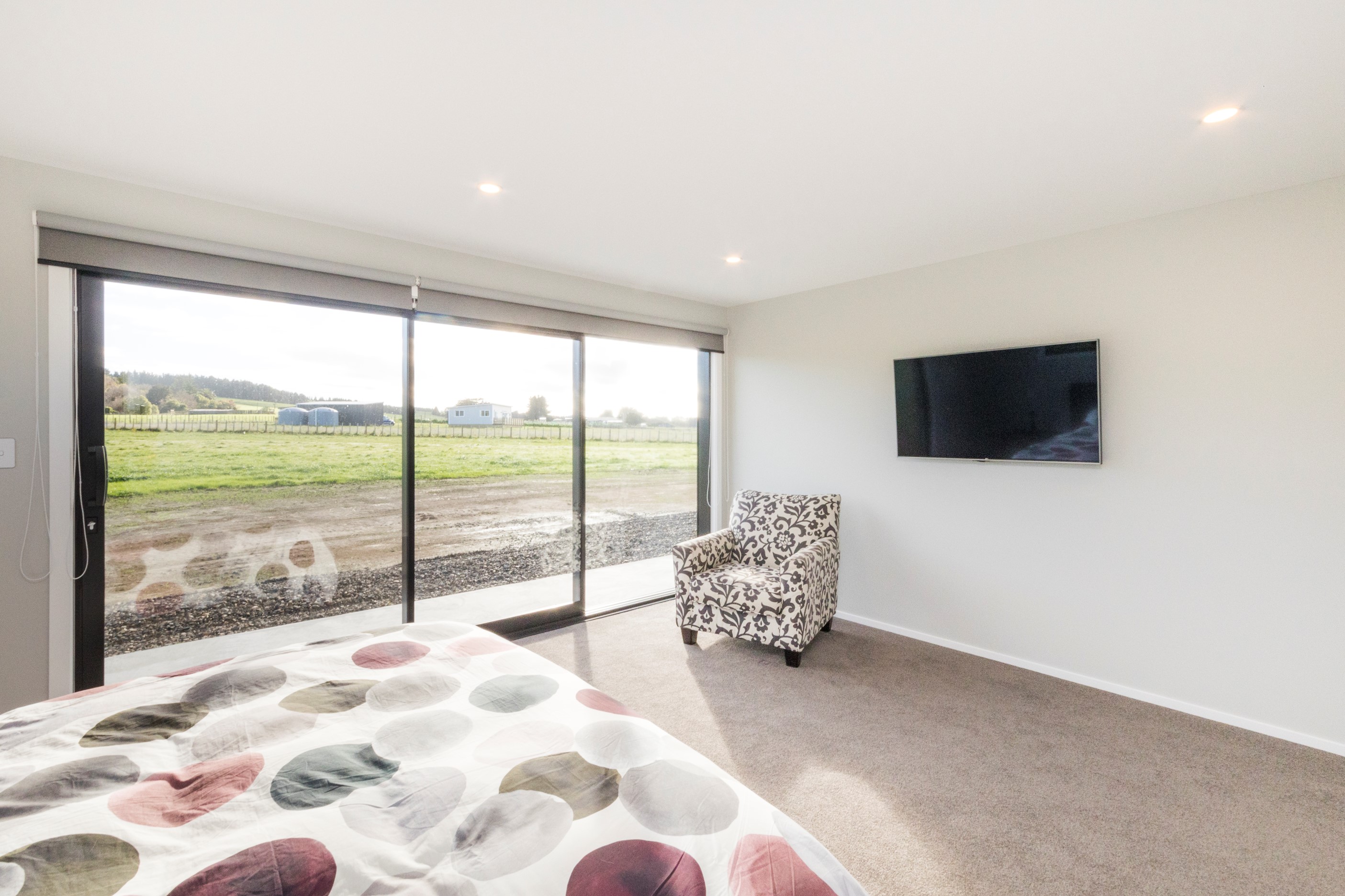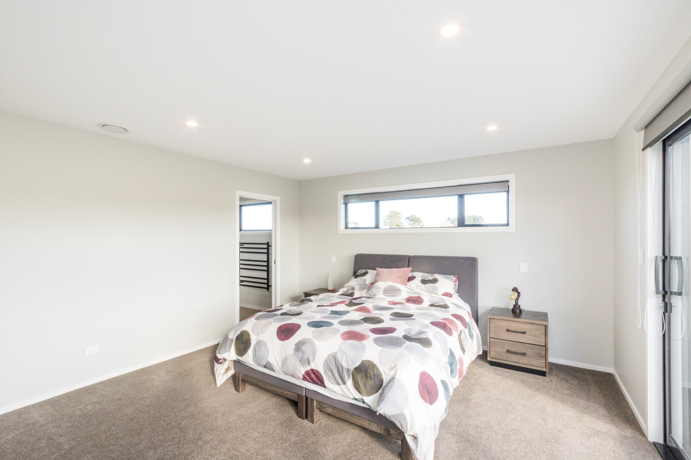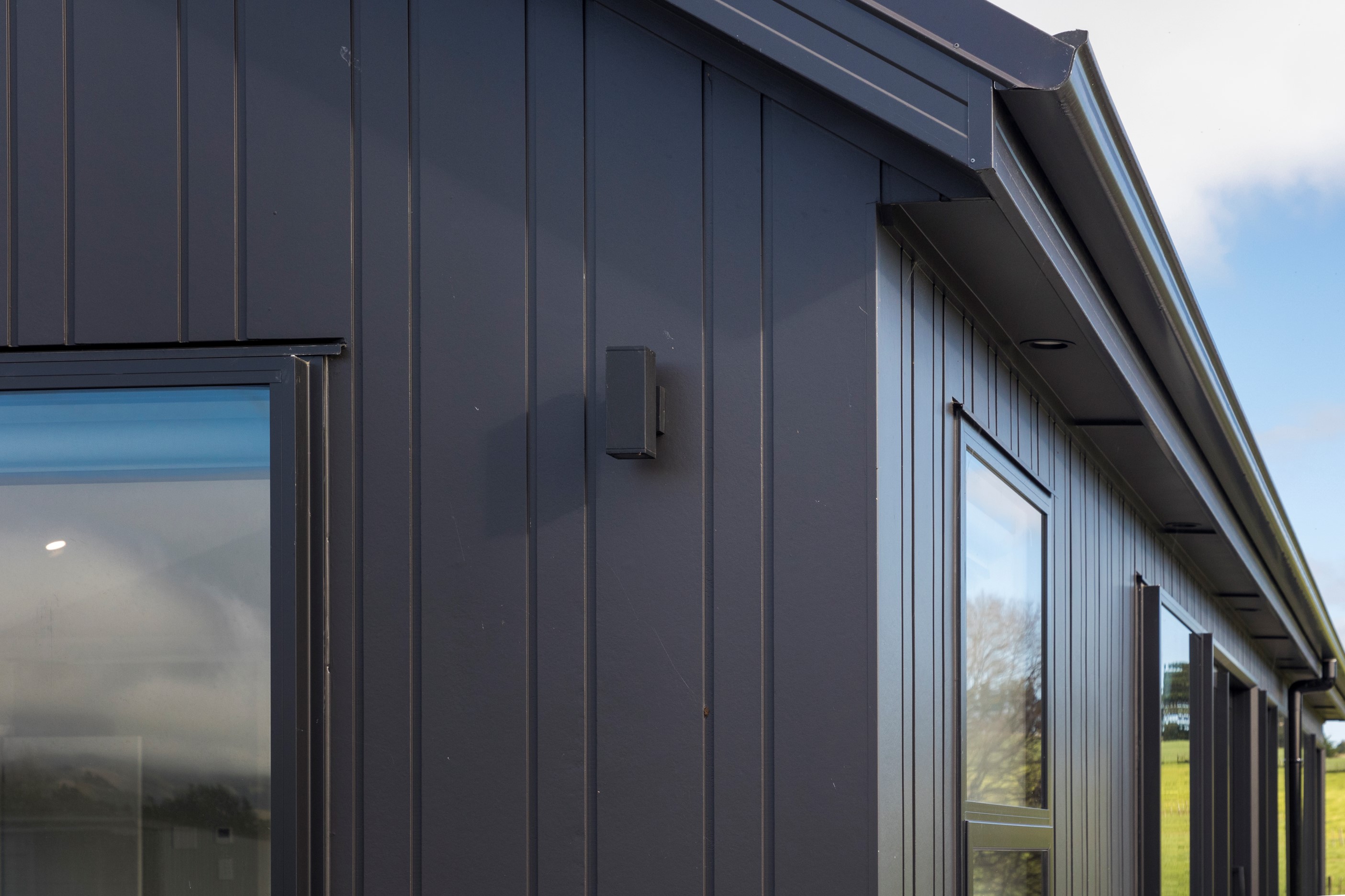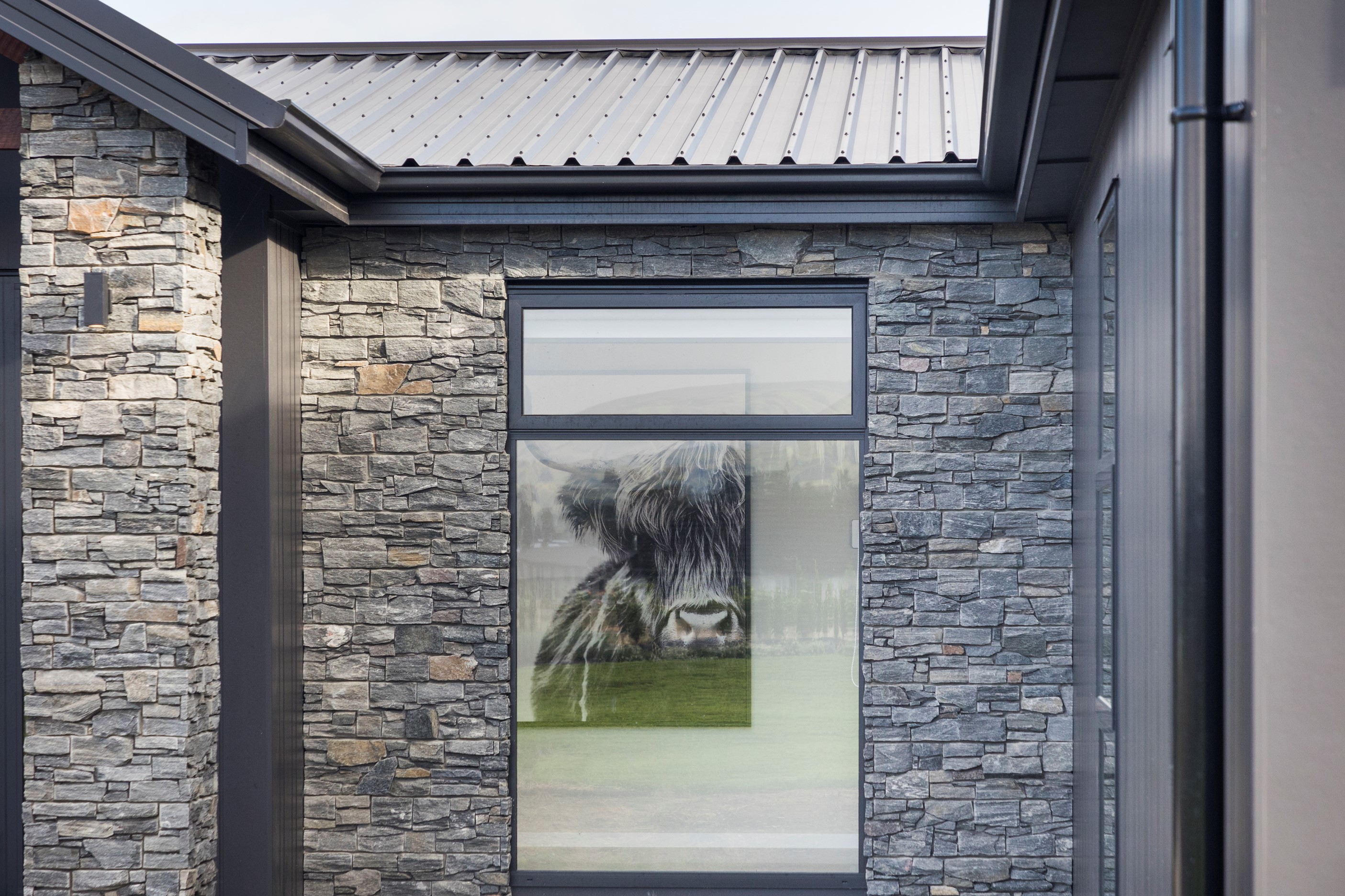 With its three elegant gables and beautiful black exterior, this 271sqm family residence combines the warmth and character of a farm-style home with contemporary design flair. The central gable makes a statement with reclaimed timber as a truss at the entrance. Schist veneer pillars draw further attention to the grand front door. Encompassing four bedrooms and two bathrooms, the home has been designed with comfort, practicality and quality at every turn. As you step inside, the beautifully executed polished concrete floor is just one example of the precision craftsmanship to be found. Large windows and sliders throughout the home fill the interior with natural sunlight and views. The north-facing living area captures picturesque views of the Ruahine Range, while the bedrooms enjoy a vista of the Tararua Range and surrounding farmland. In the main living wing, high scissor truss ceilings add to the sense of space in this already generous open-plan area. To ensure warmth all year round, the home has an underfloor hydronic heating system, and a gas fire in the lounge enhances the cosy ambience.