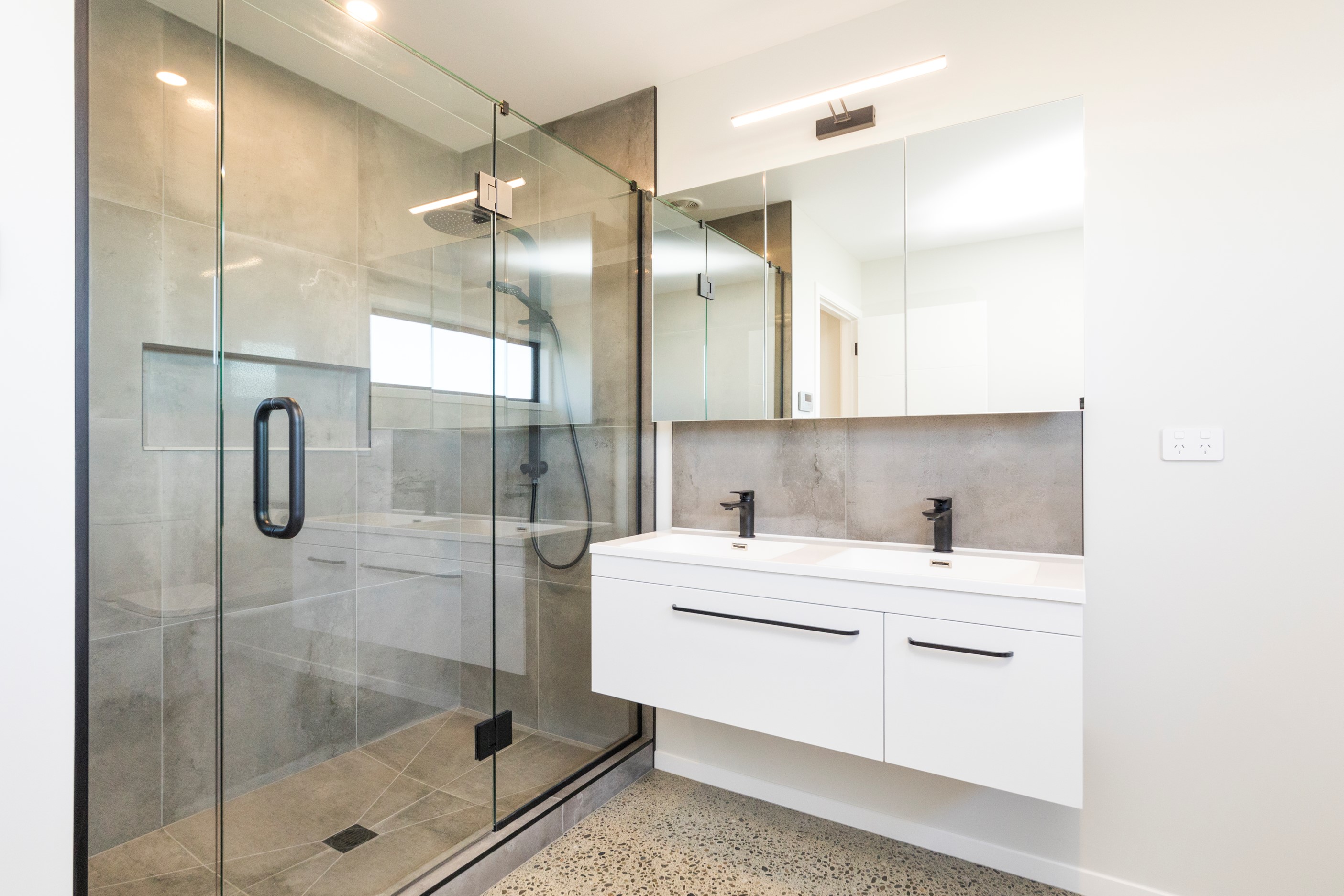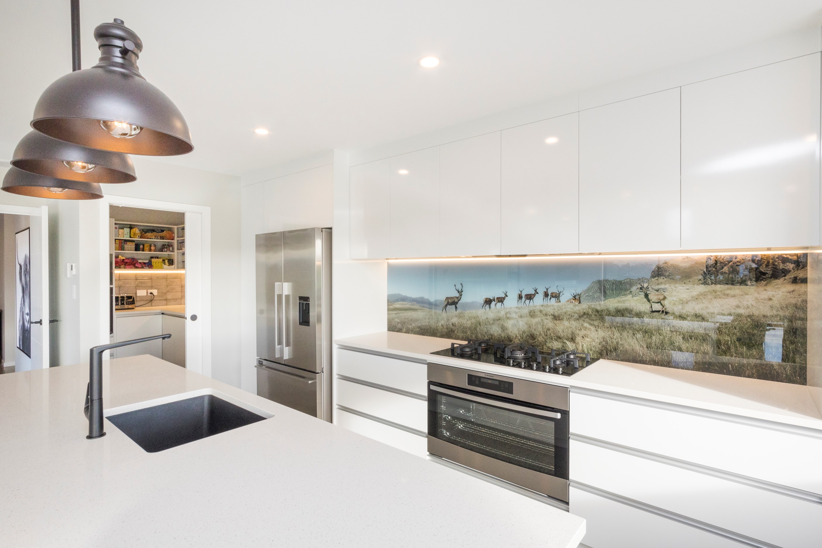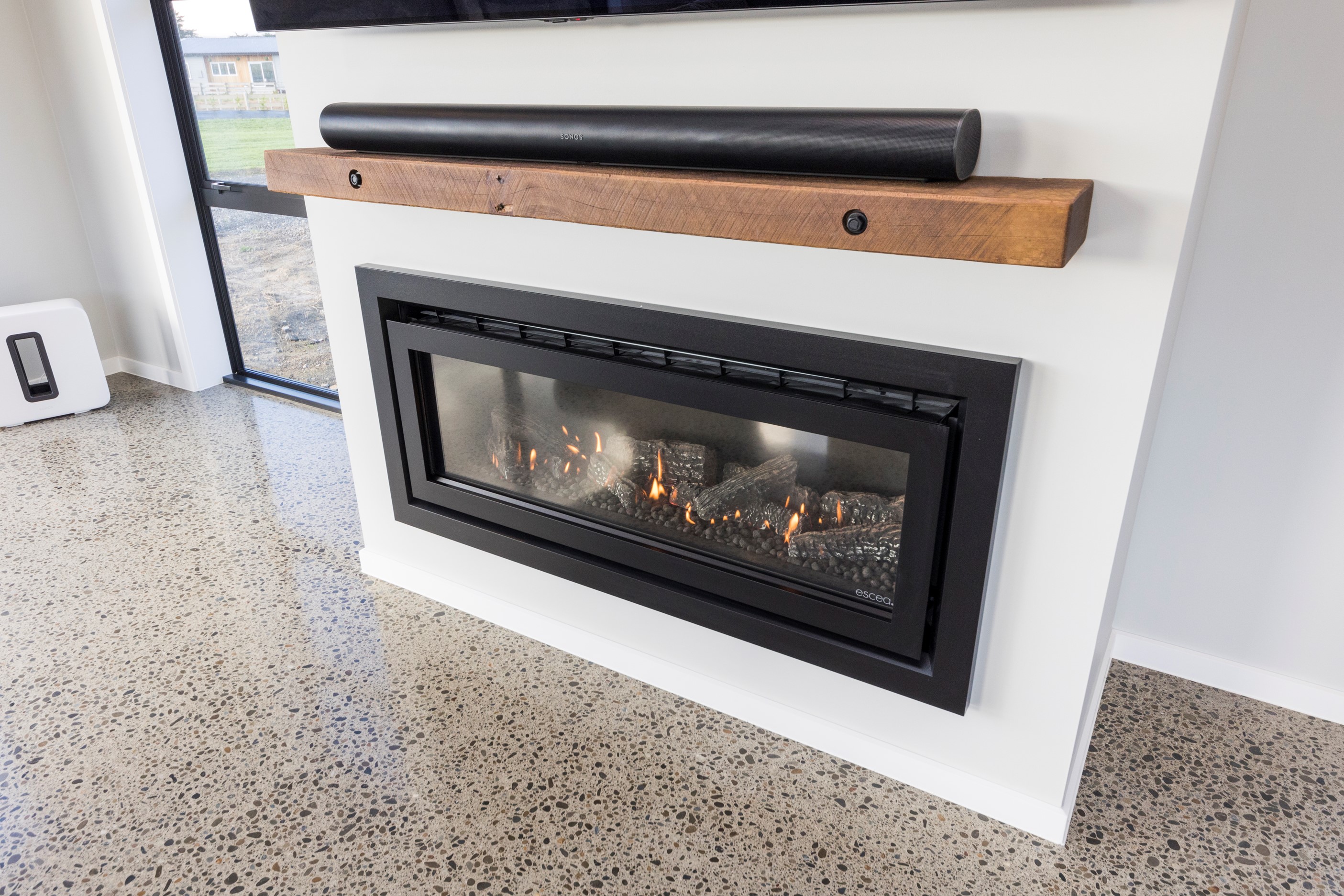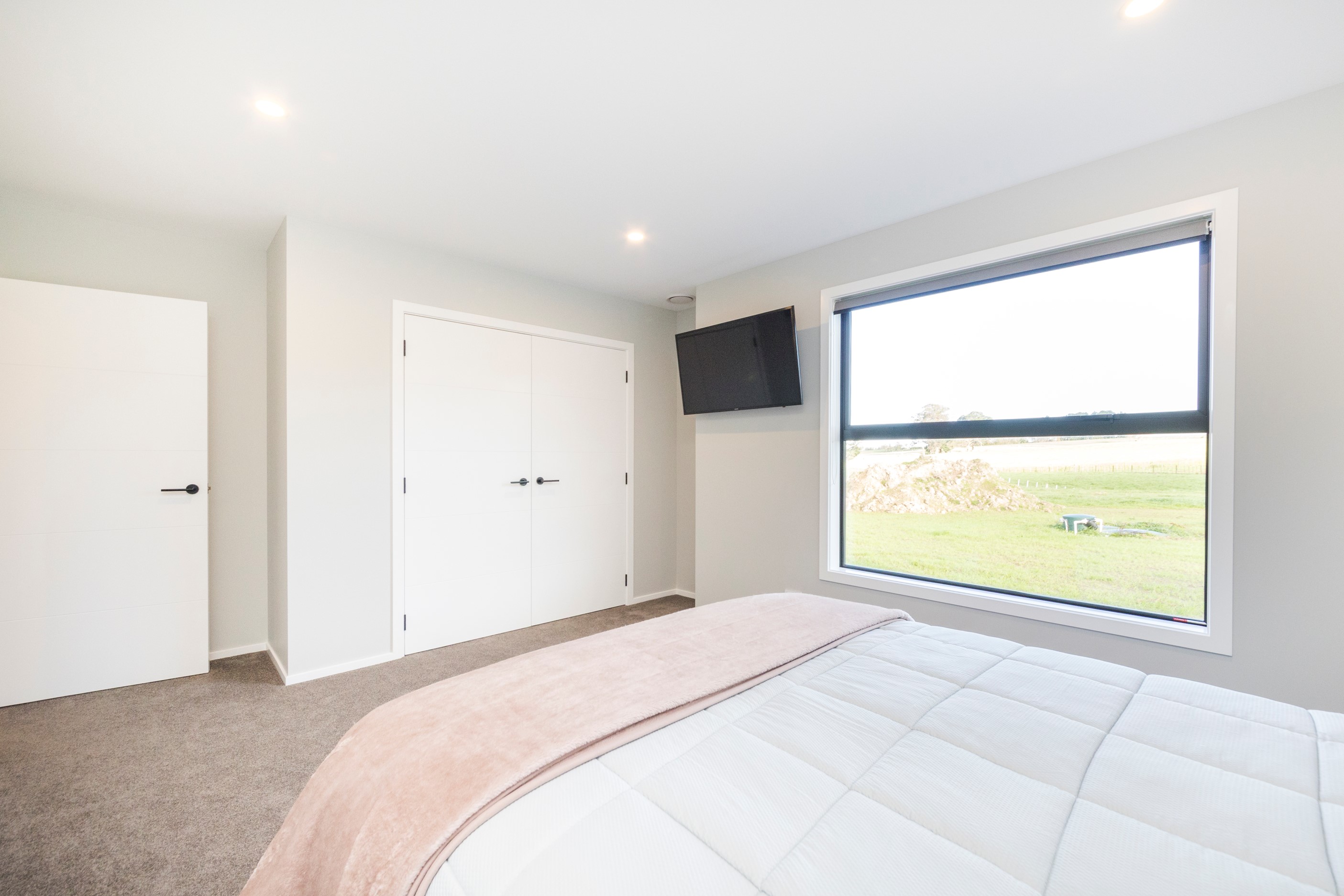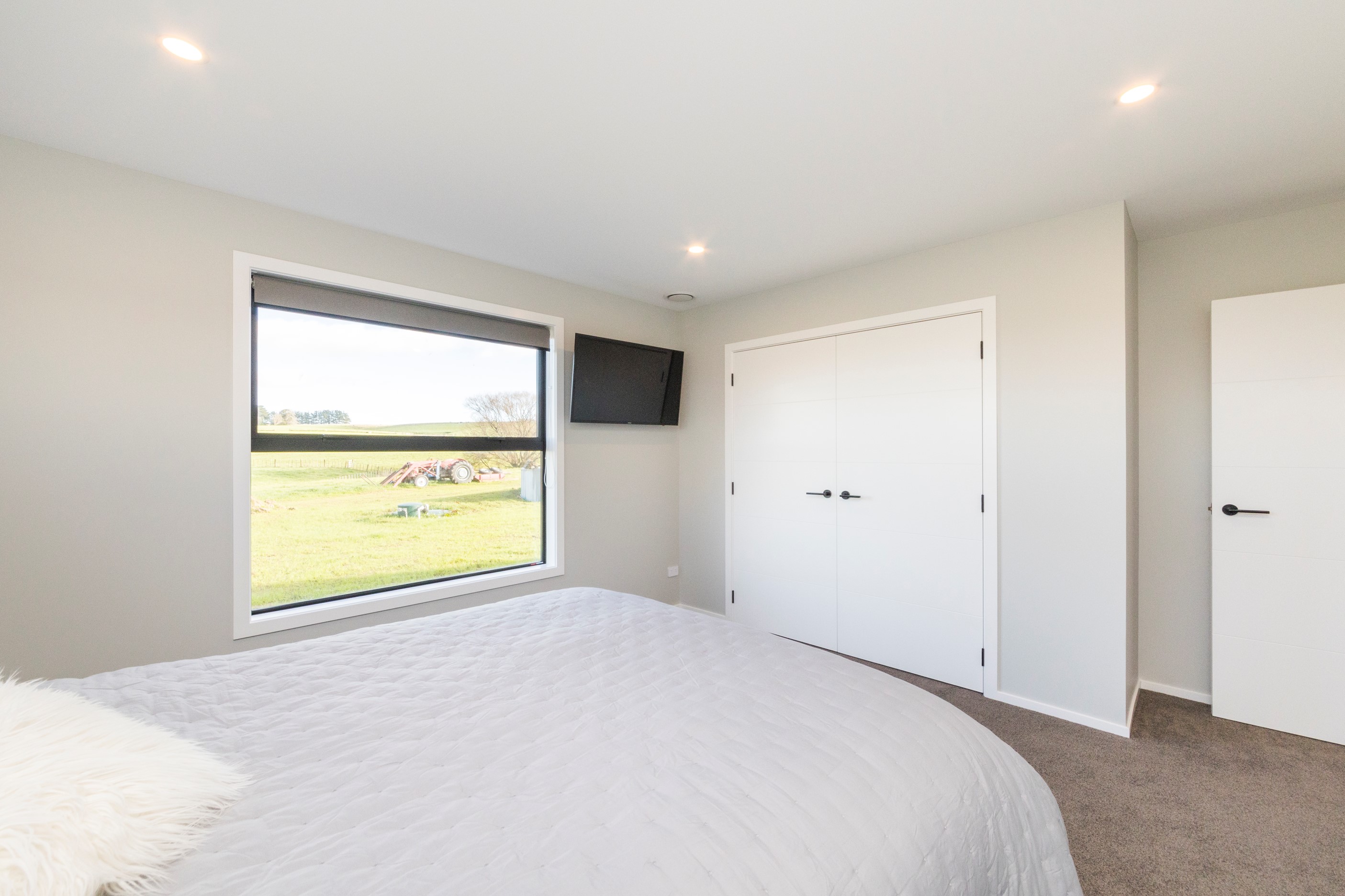With its three elegant gables and beautiful black exterior, this 271sqm family residence combines the warmth and character of a farm-style home with contemporary design flair. The central gable makes a statement with reclaimed timber as a truss at the entrance. Schist veneer pillars draw further attention to the grand front door. Encompassing four bedrooms and two bathrooms, the home has been designed with comfort, practicality and quality at every turn. As you step inside, the beautifully executed polished concrete floor is just one example of the precision craftsmanship to be found. Large windows and sliders throughout the home fill the interior with natural sunlight and views. The north-facing living area captures picturesque views of the Ruahine Range, while the bedrooms enjoy a vista of the Tararua Range and surrounding farmland. In the main living wing, high scissor truss ceilings add to the sense of space in this already generous open-plan area. To ensure warmth all year round, the home has an underfloor hydronic heating system, and a gas fire in the lounge enhances the cosy ambience.