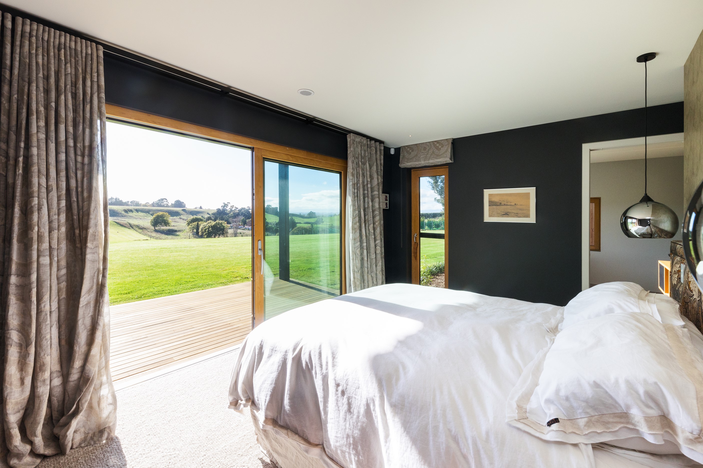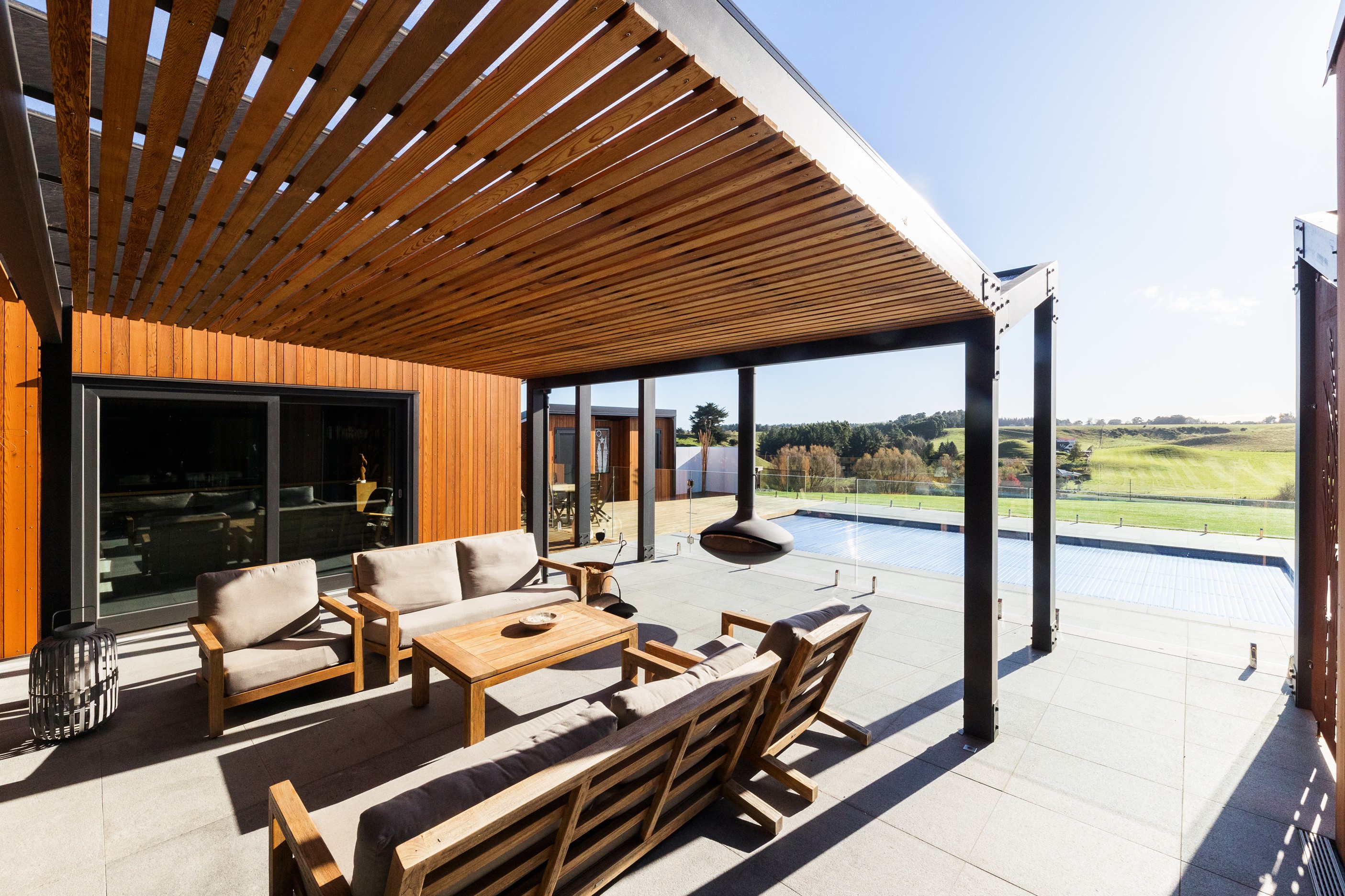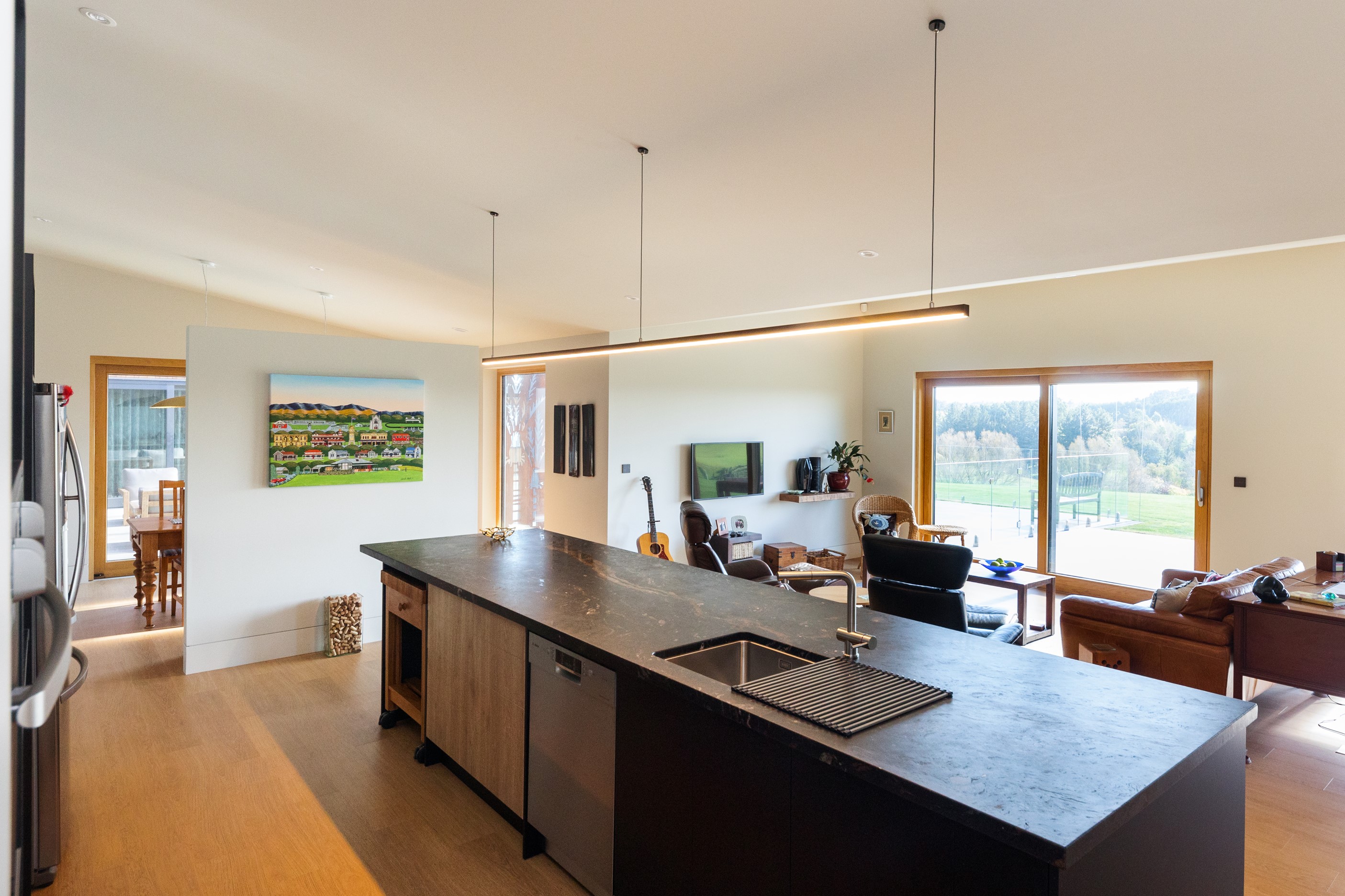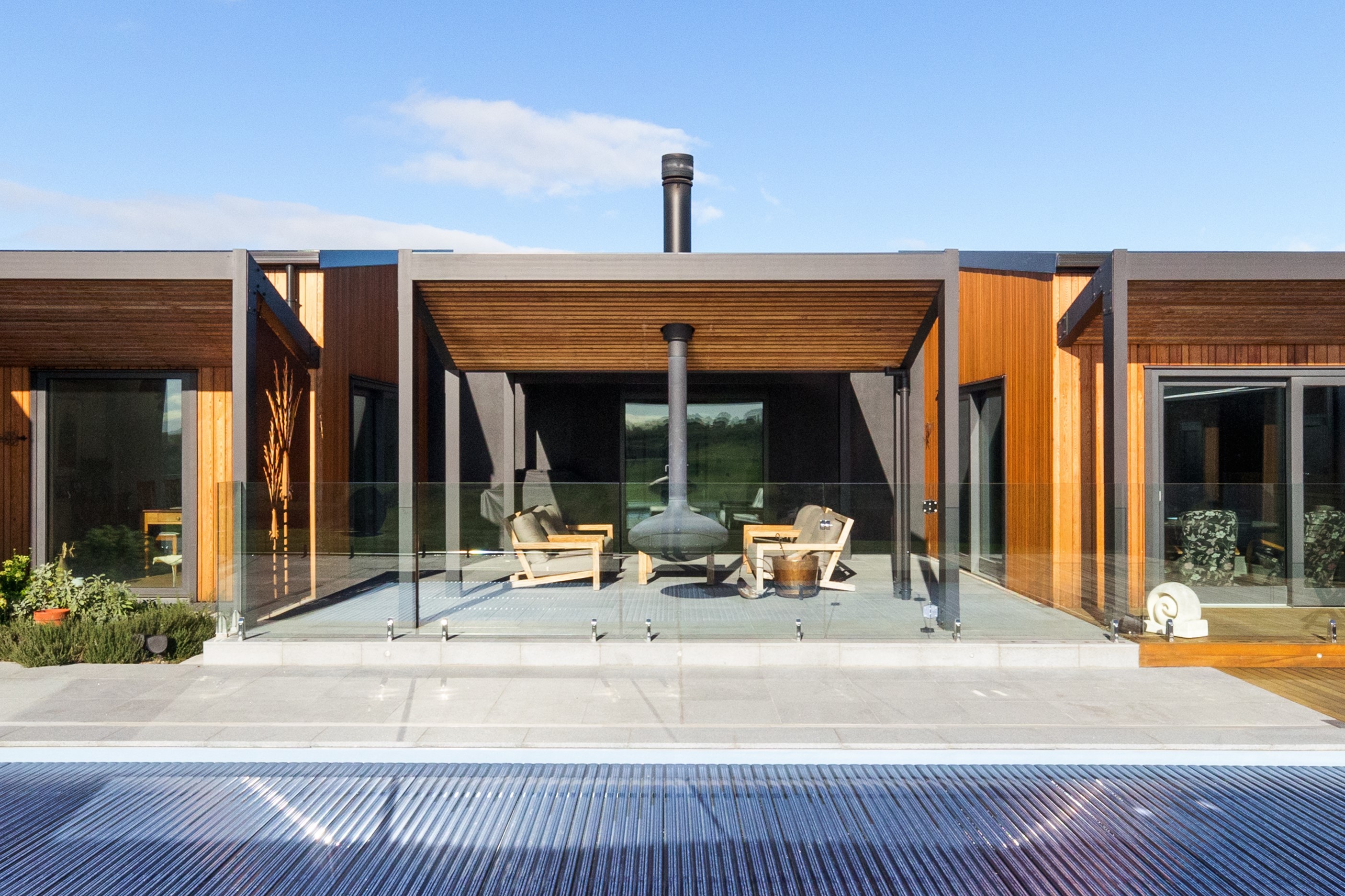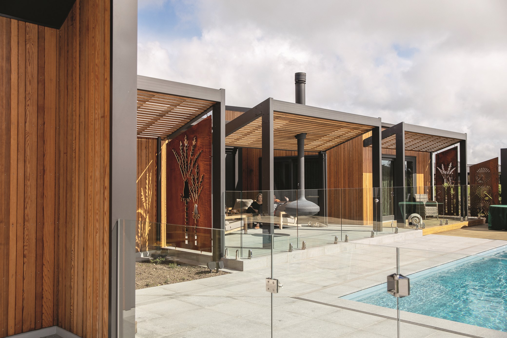 When visitors step into this large and long three-bedroom home, they are greeted with a framed view. They see the contemporary outdoor lounge, featuring a suspended fireplace and an inviting pool area, all backdropped by the green landscape. From here, they’re guided through to the main living and dining area under a prism of oak plywood ceilings. A simple layout and intricate design coupled with clever detailing and artistic panache elevate this 355sqm property into something special. The main bedroom suite opens out onto its own deck, taking in the lush outlook. The ensuite is simply sublime, with a luxurious bath that also captures the stunning rural view. The design challenge for this particular build was to create a home that took advantage of the vista of rolling hills, without succumbing to the mighty winds that sweep in from all directions. Exterior cladding, including Otago schist; vertical shiplap cedar; and high-quality, high-pressure laminate panels, complement the surroundings. Negative detailing on interior walls keeps things contemporary.