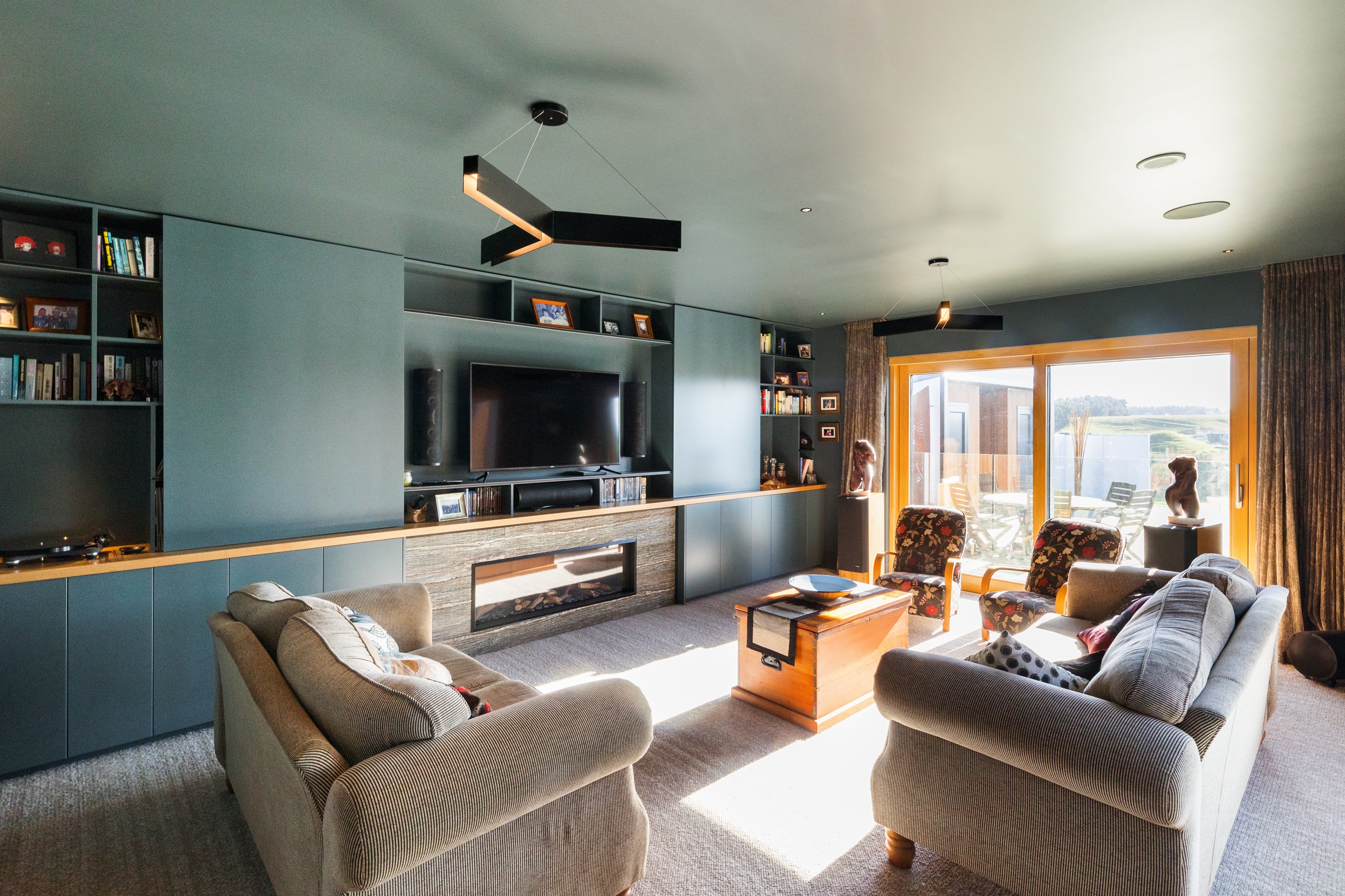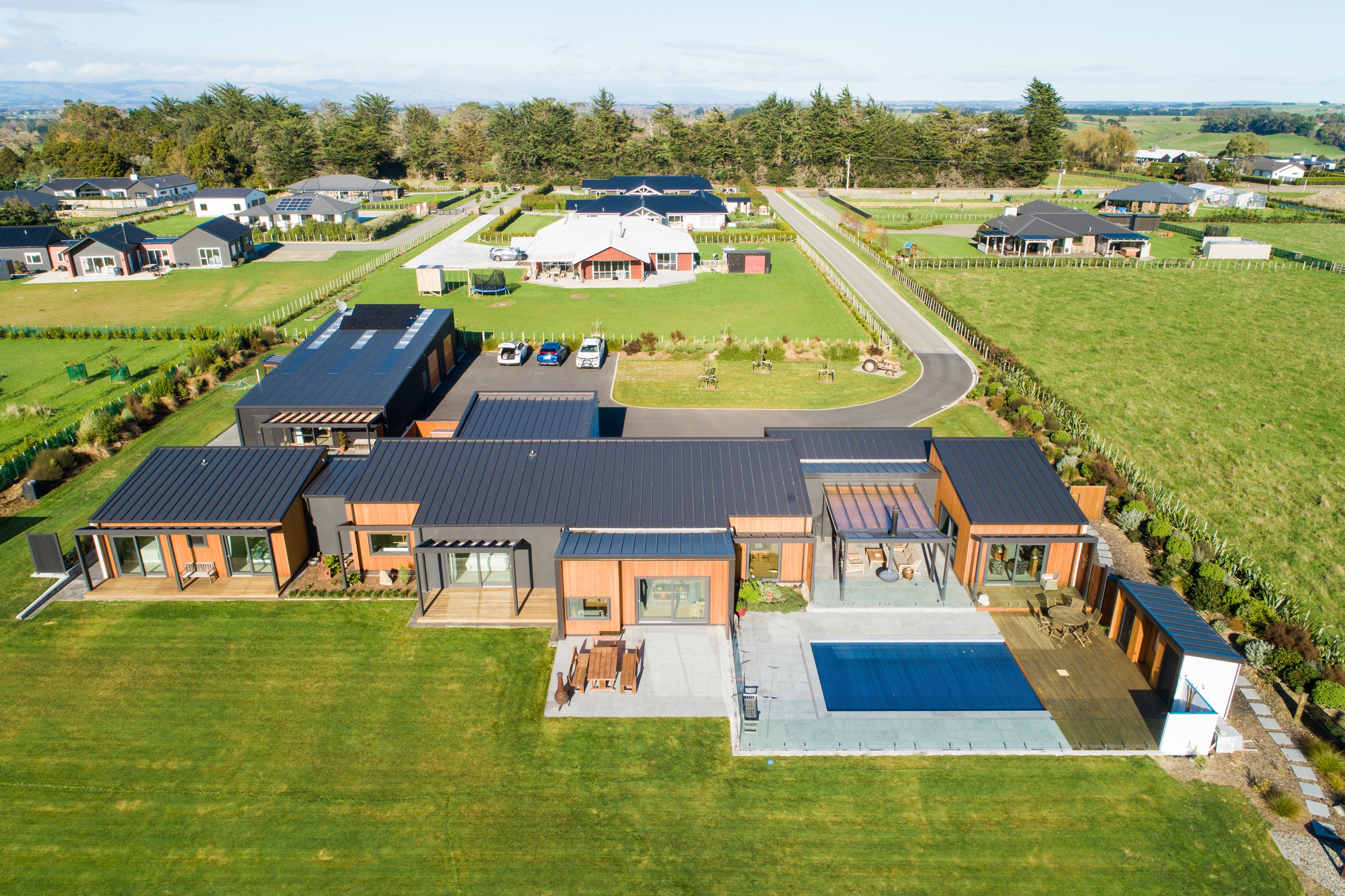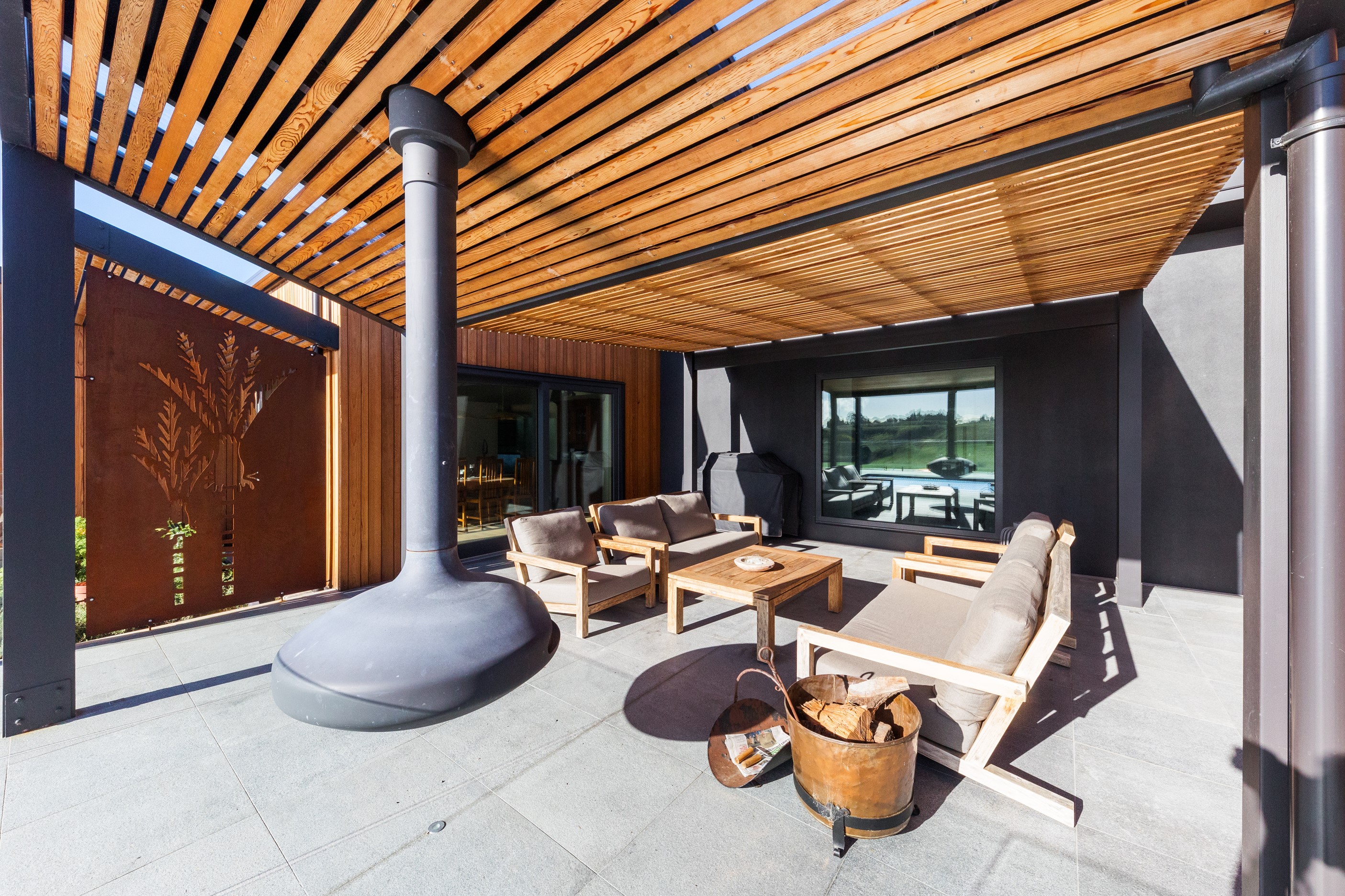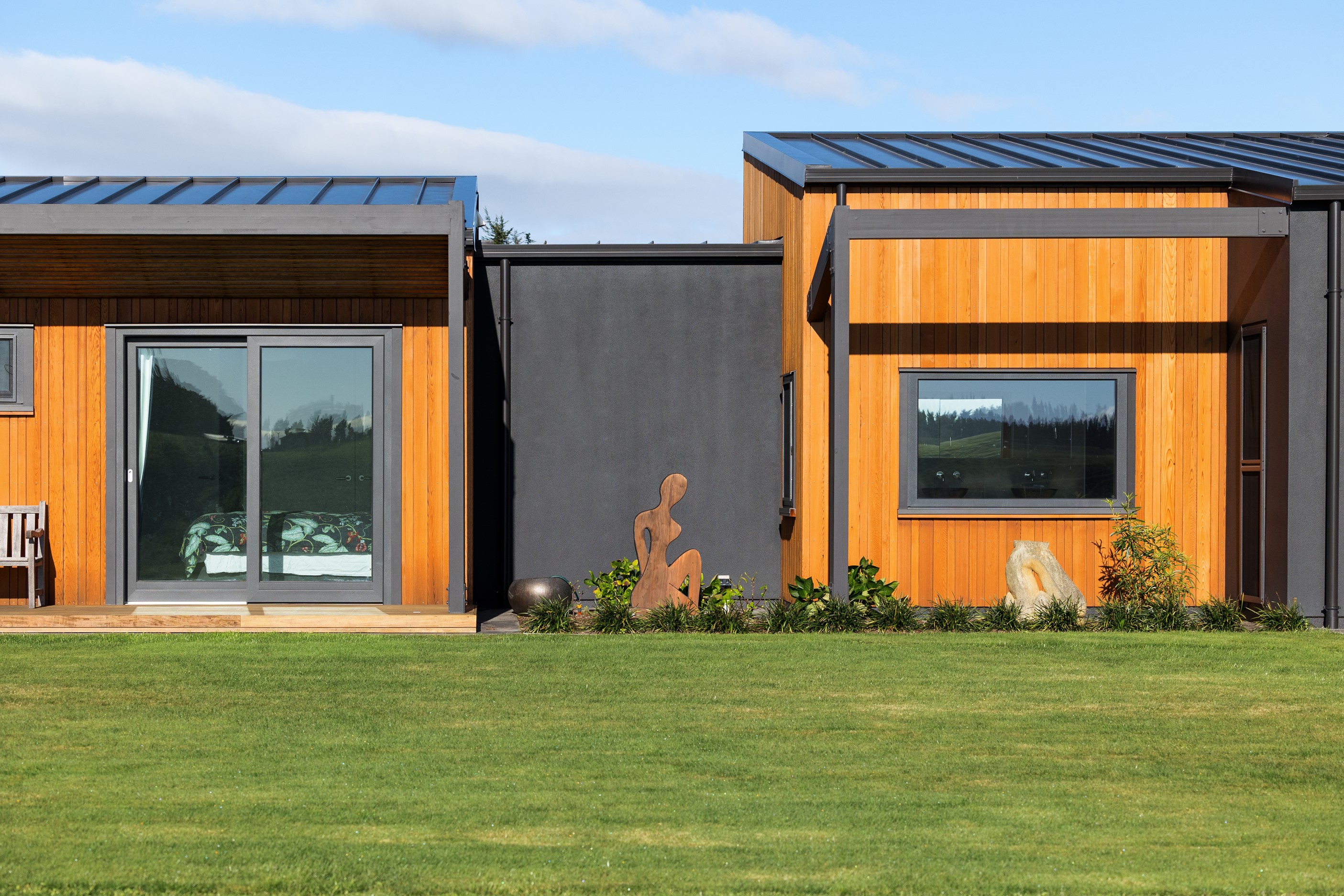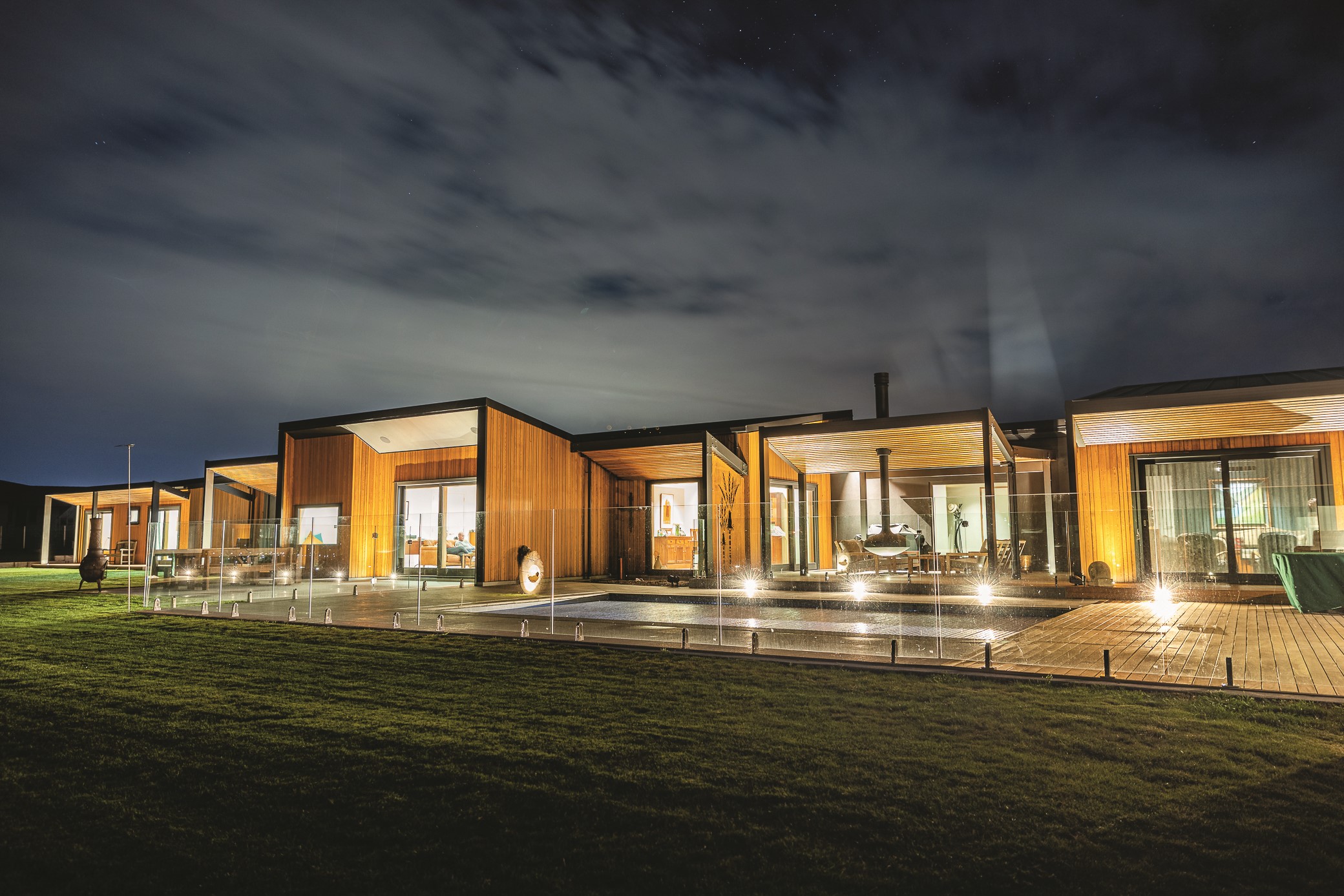 When visitors step into this large and long three-bedroom home, they are greeted with a framed view. They see the contemporary outdoor lounge, featuring a suspended fireplace and an inviting pool area, all backdropped by the green landscape. From here, they’re guided through to the main living and dining area under a prism of oak plywood ceilings. A simple layout and intricate design coupled with clever detailing and artistic panache elevate this 355sqm property into something special. The main bedroom suite opens out onto its own deck, taking in the lush outlook. The ensuite is simply sublime, with a luxurious bath that also captures the stunning rural view. The design challenge for this particular build was to create a home that took advantage of the vista of rolling hills, without succumbing to the mighty winds that sweep in from all directions. Exterior cladding, including Otago schist; vertical shiplap cedar; and high-quality, high-pressure laminate panels, complement the surroundings. Negative detailing on interior walls keeps things contemporary.