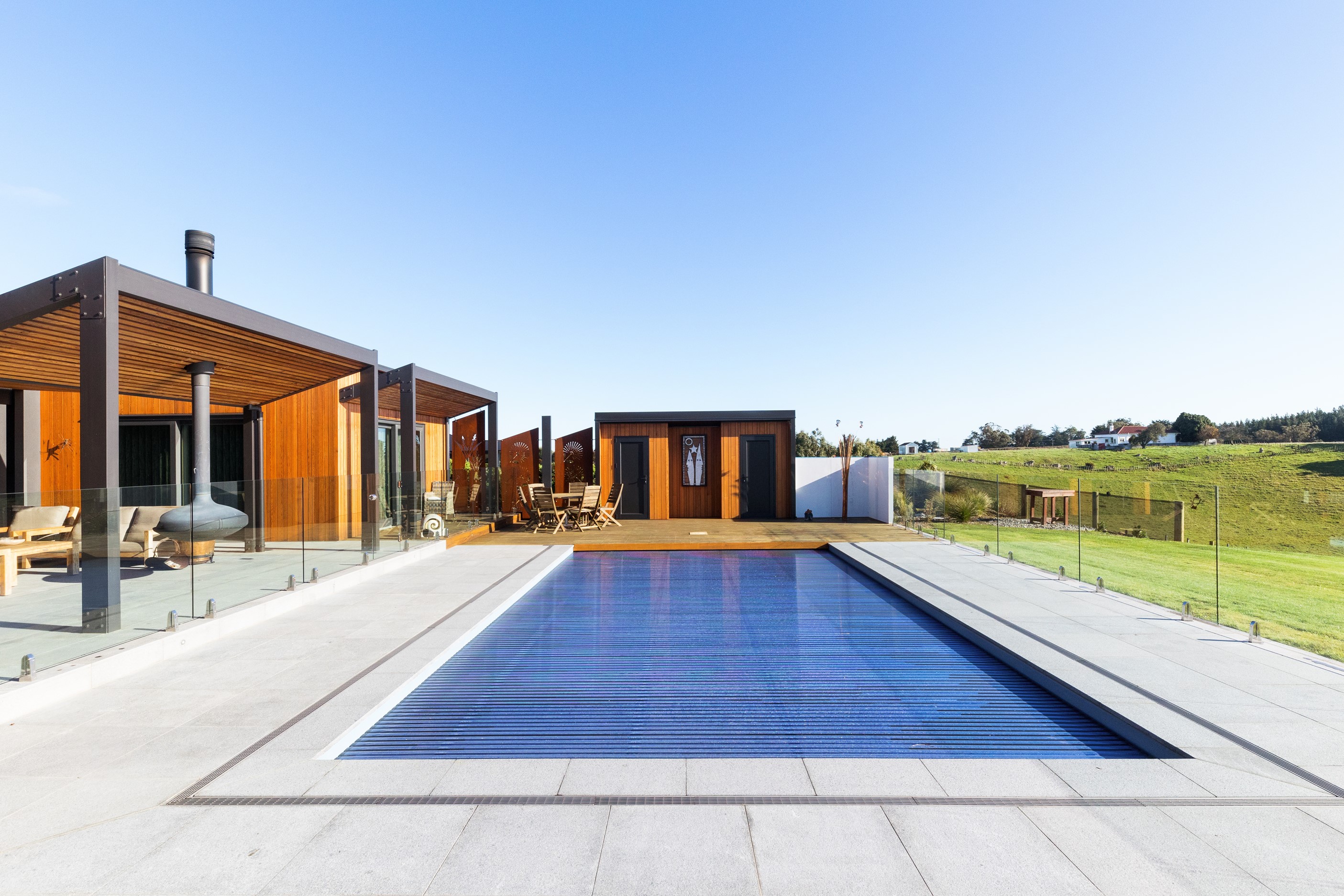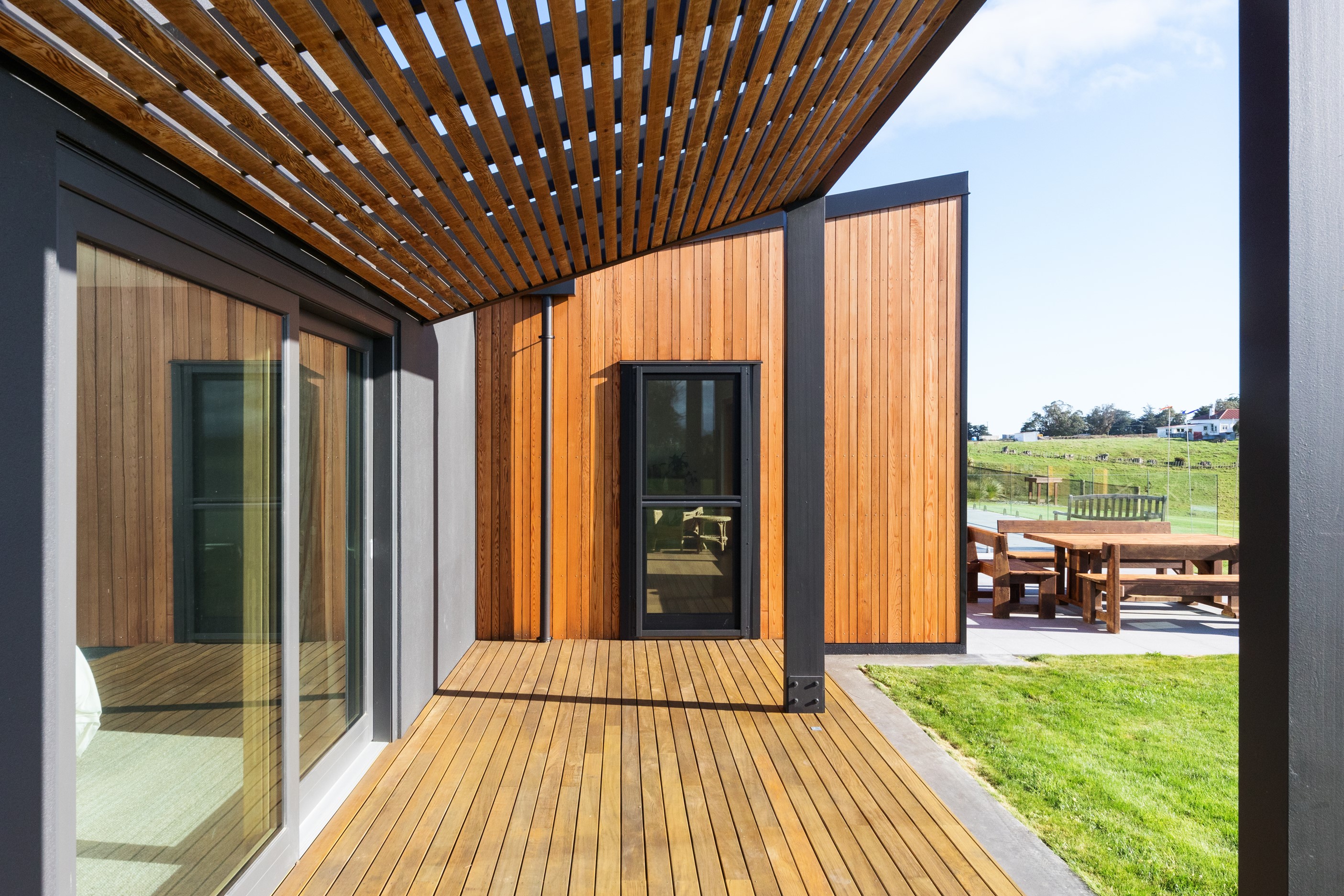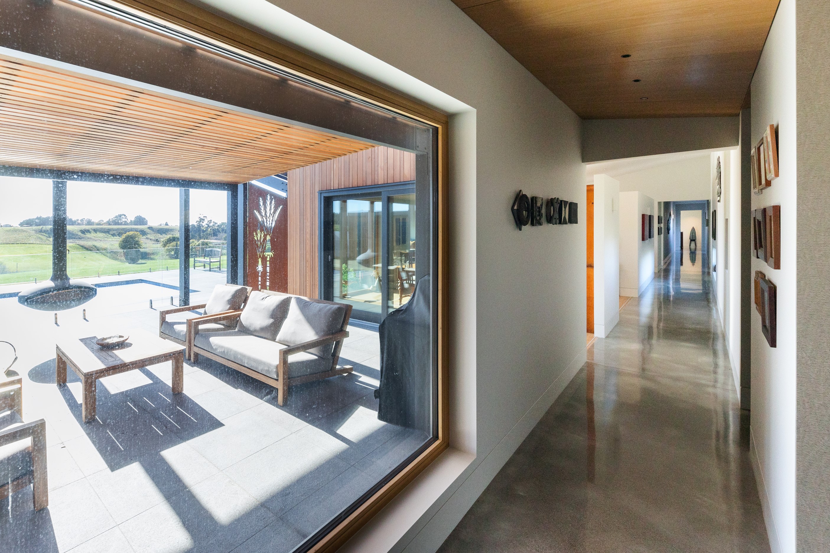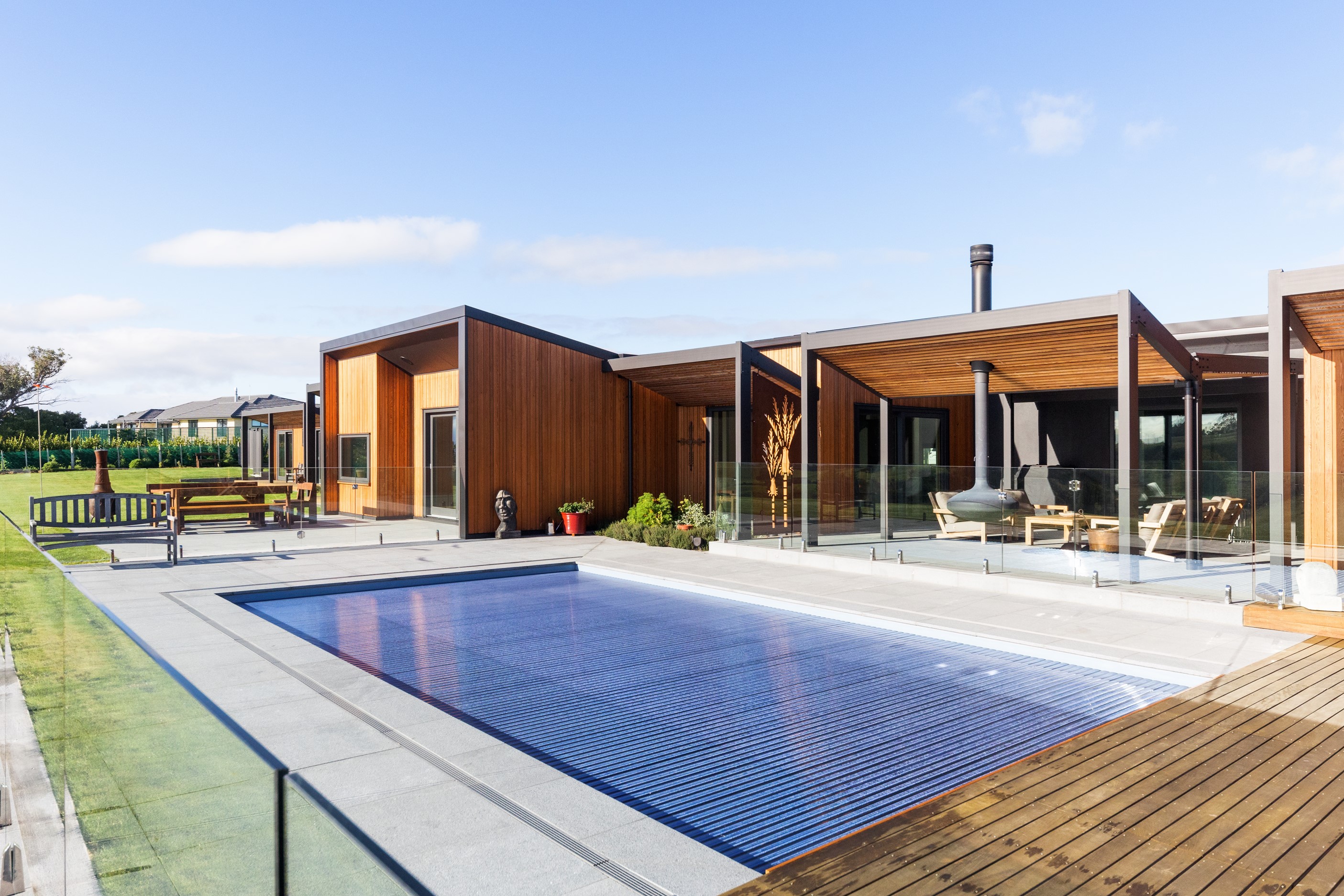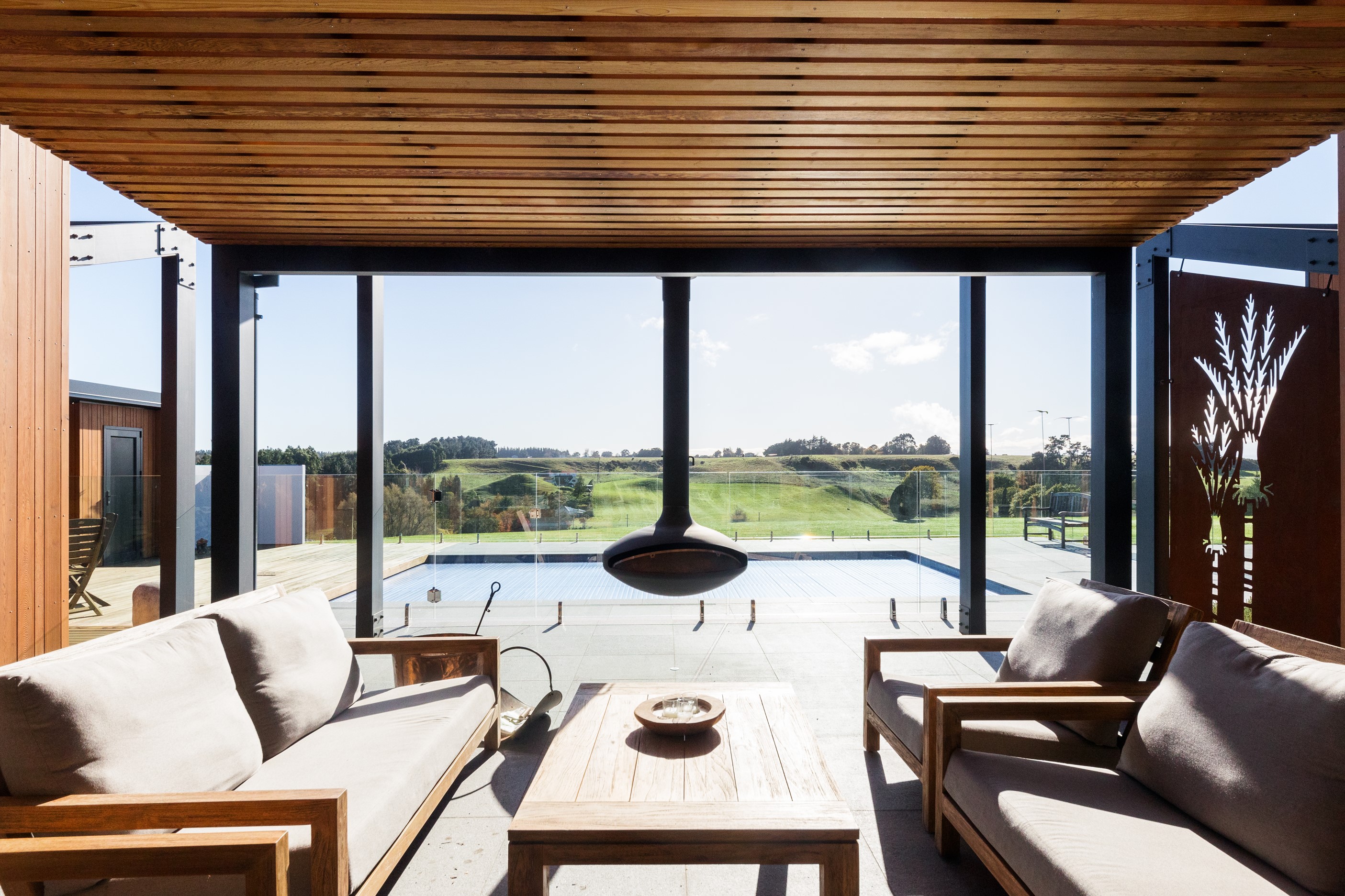 When visitors step into this large and long three-bedroom home, they are greeted with a framed view. They see the contemporary outdoor lounge, featuring a suspended fireplace and an inviting pool area, all backdropped by the green landscape. From here, they’re guided through to the main living and dining area under a prism of oak plywood ceilings. A simple layout and intricate design coupled with clever detailing and artistic panache elevate this 355sqm property into something special. The main bedroom suite opens out onto its own deck, taking in the lush outlook. The ensuite is simply sublime, with a luxurious bath that also captures the stunning rural view. The design challenge for this particular build was to create a home that took advantage of the vista of rolling hills, without succumbing to the mighty winds that sweep in from all directions. Exterior cladding, including Otago schist; vertical shiplap cedar; and high-quality, high-pressure laminate panels, complement the surroundings. Negative detailing on interior walls keeps things contemporary.