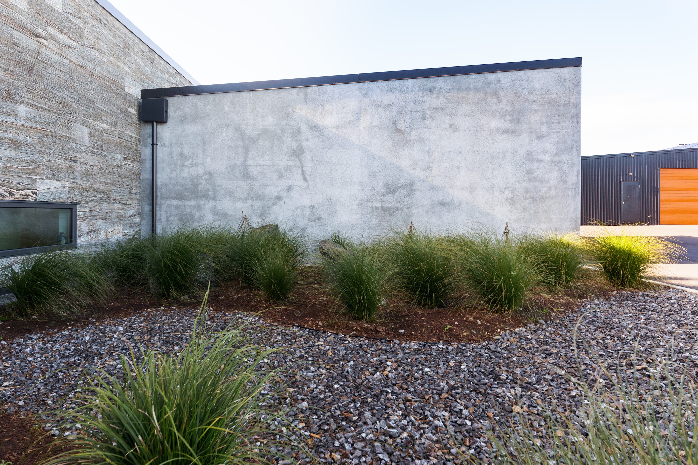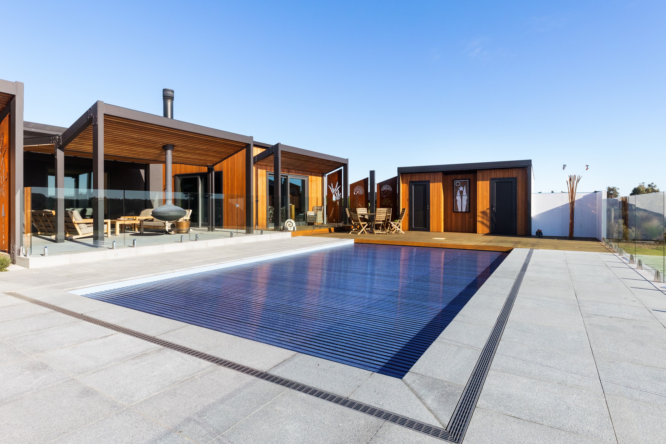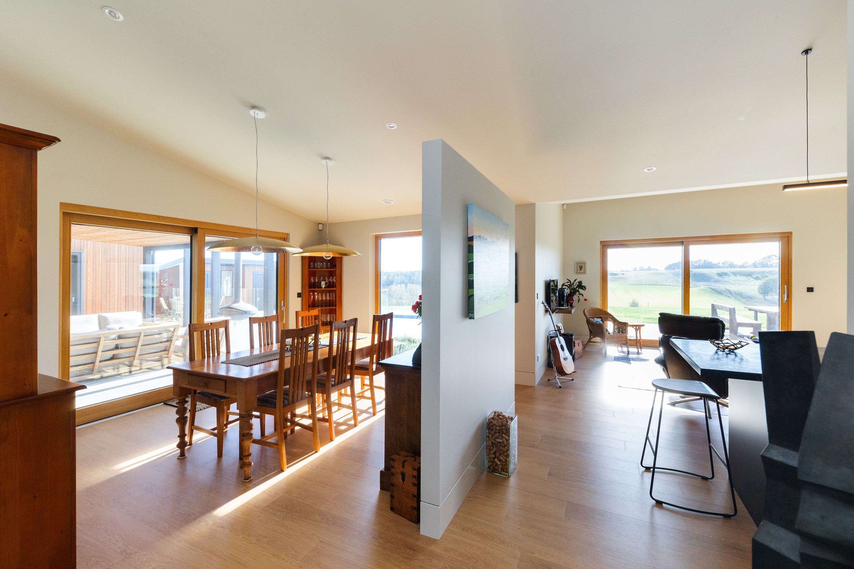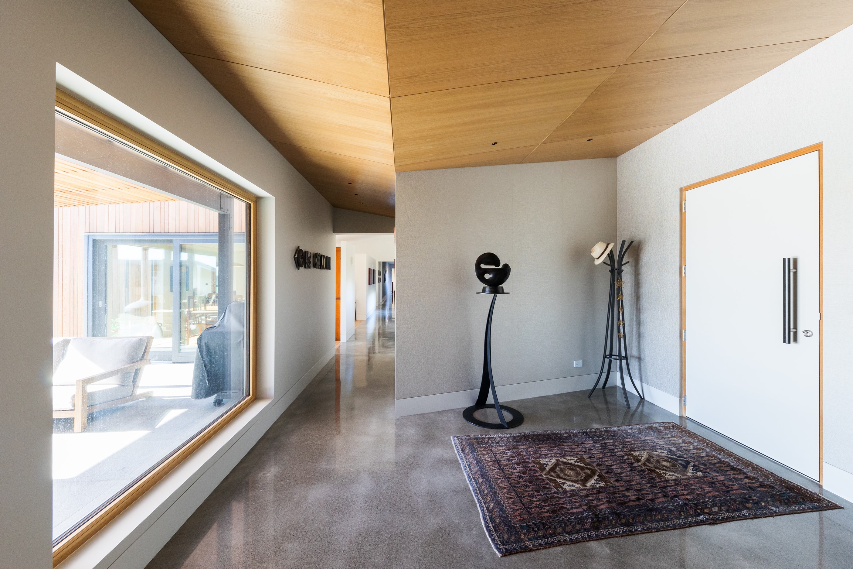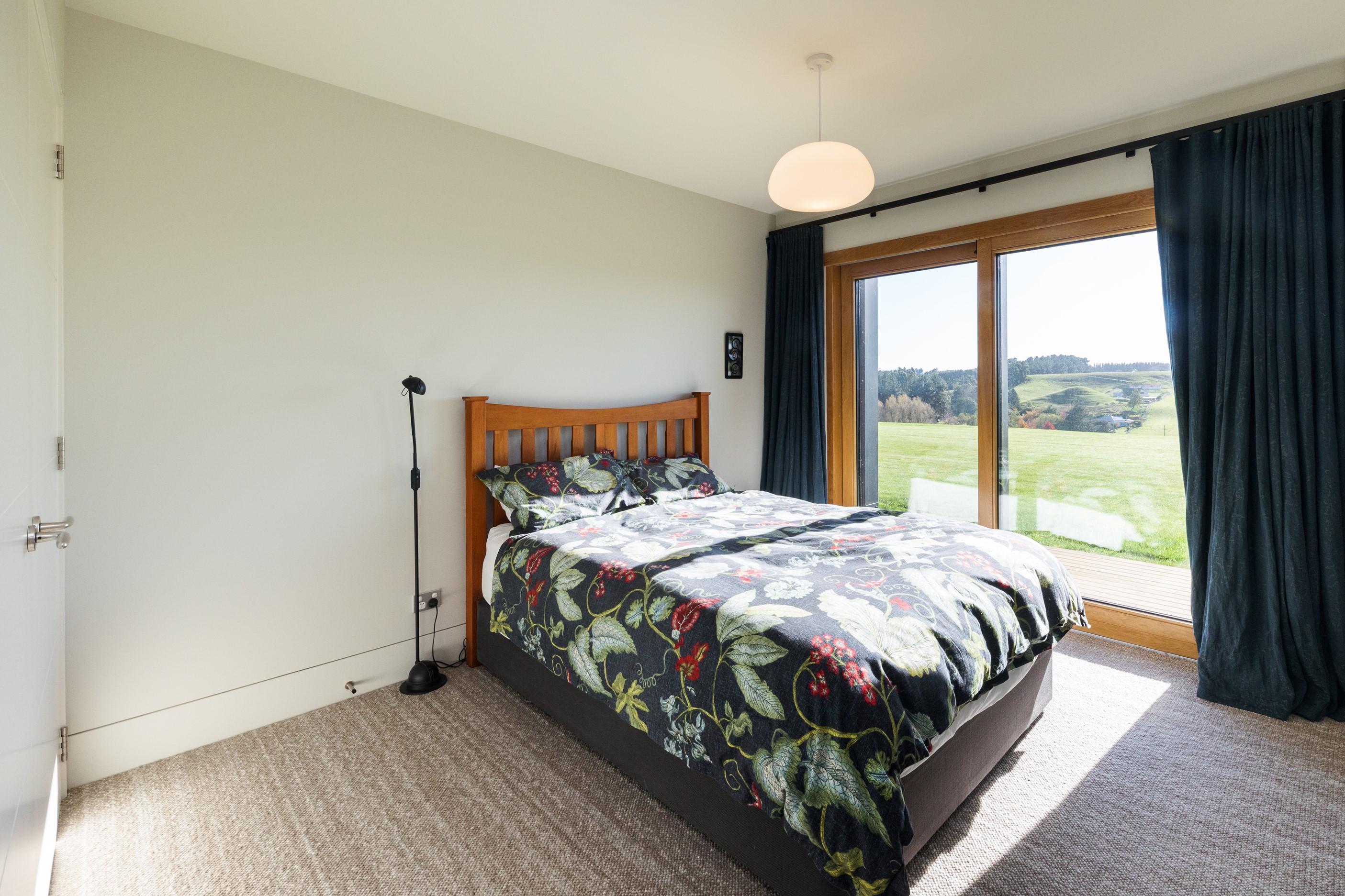 When visitors step into this large and long three-bedroom home, they are greeted with a framed view. They see the contemporary outdoor lounge, featuring a suspended fireplace and an inviting pool area, all backdropped by the green landscape. From here, they’re guided through to the main living and dining area under a prism of oak plywood ceilings. A simple layout and intricate design coupled with clever detailing and artistic panache elevate this 355sqm property into something special. The main bedroom suite opens out onto its own deck, taking in the lush outlook. The ensuite is simply sublime, with a luxurious bath that also captures the stunning rural view. The design challenge for this particular build was to create a home that took advantage of the vista of rolling hills, without succumbing to the mighty winds that sweep in from all directions. Exterior cladding, including Otago schist; vertical shiplap cedar; and high-quality, high-pressure laminate panels, complement the surroundings. Negative detailing on interior walls keeps things contemporary.