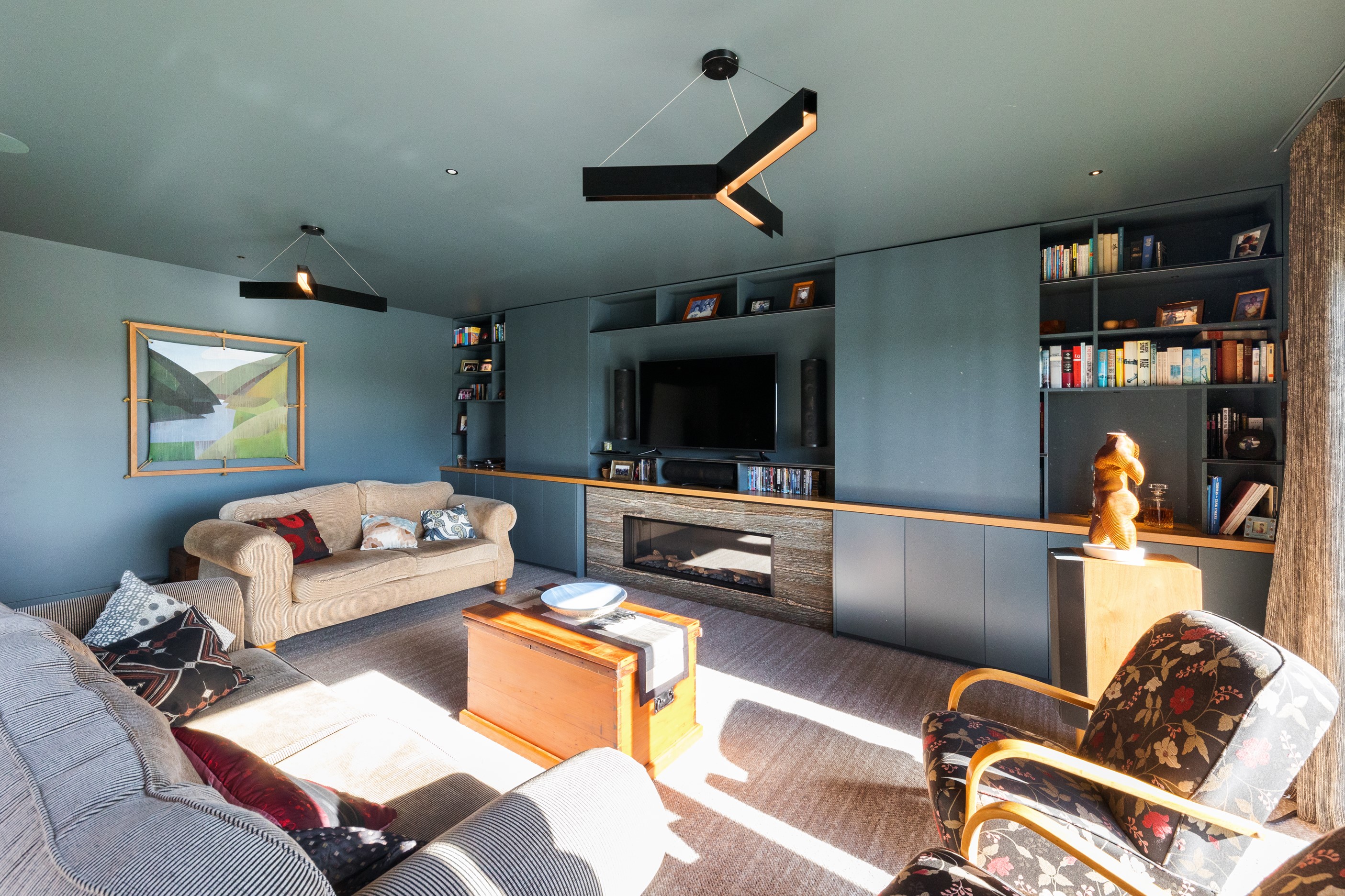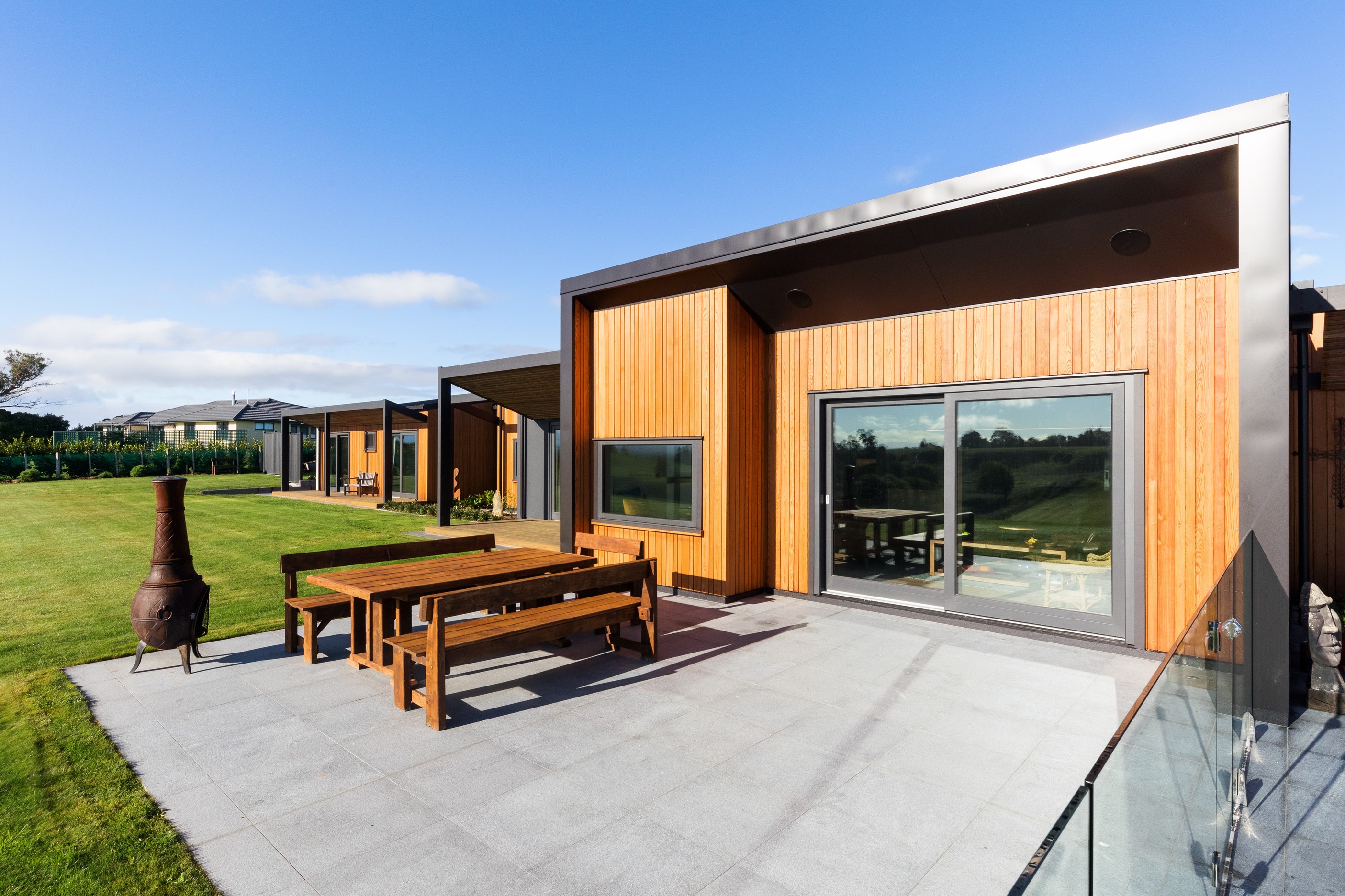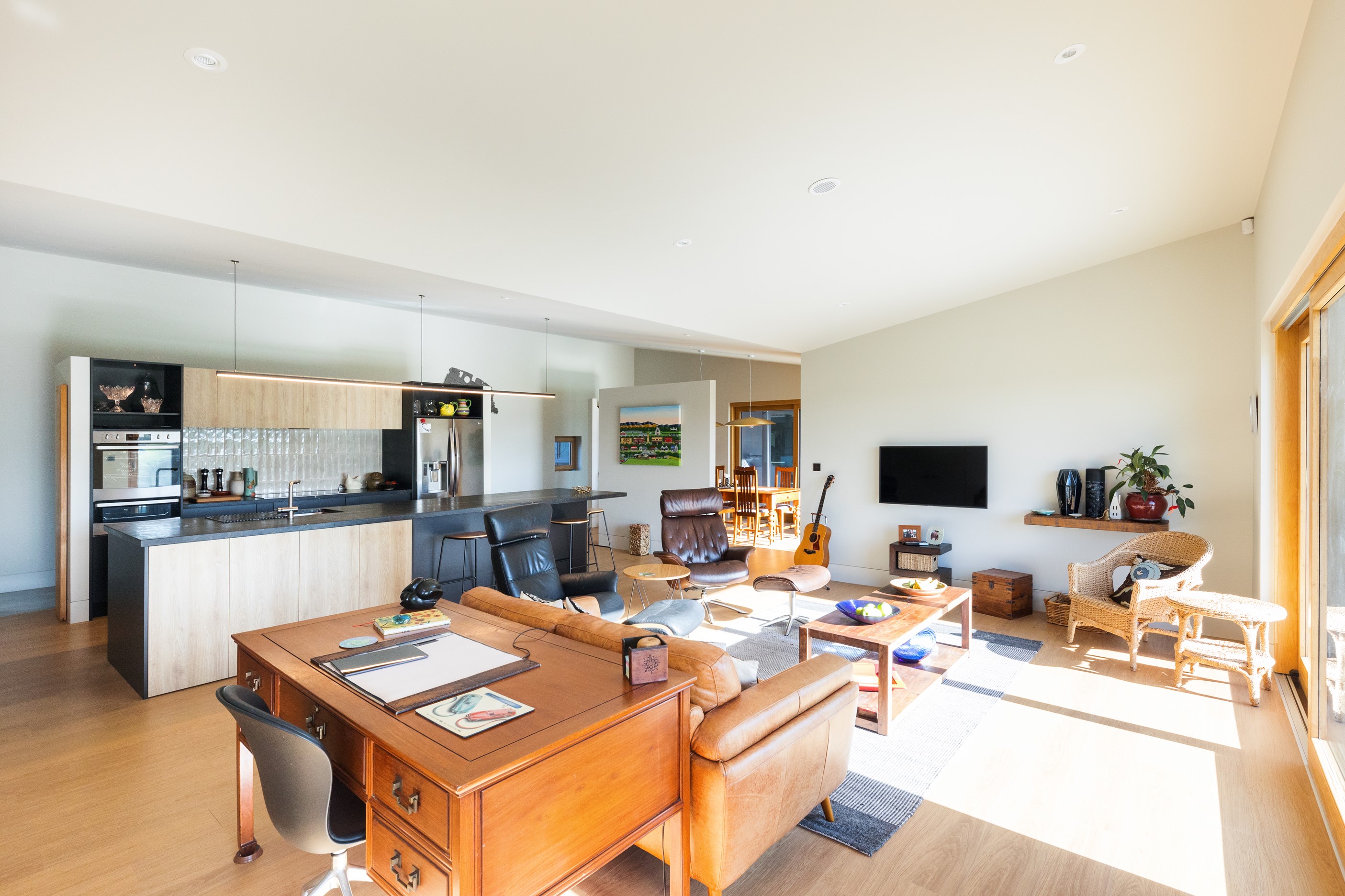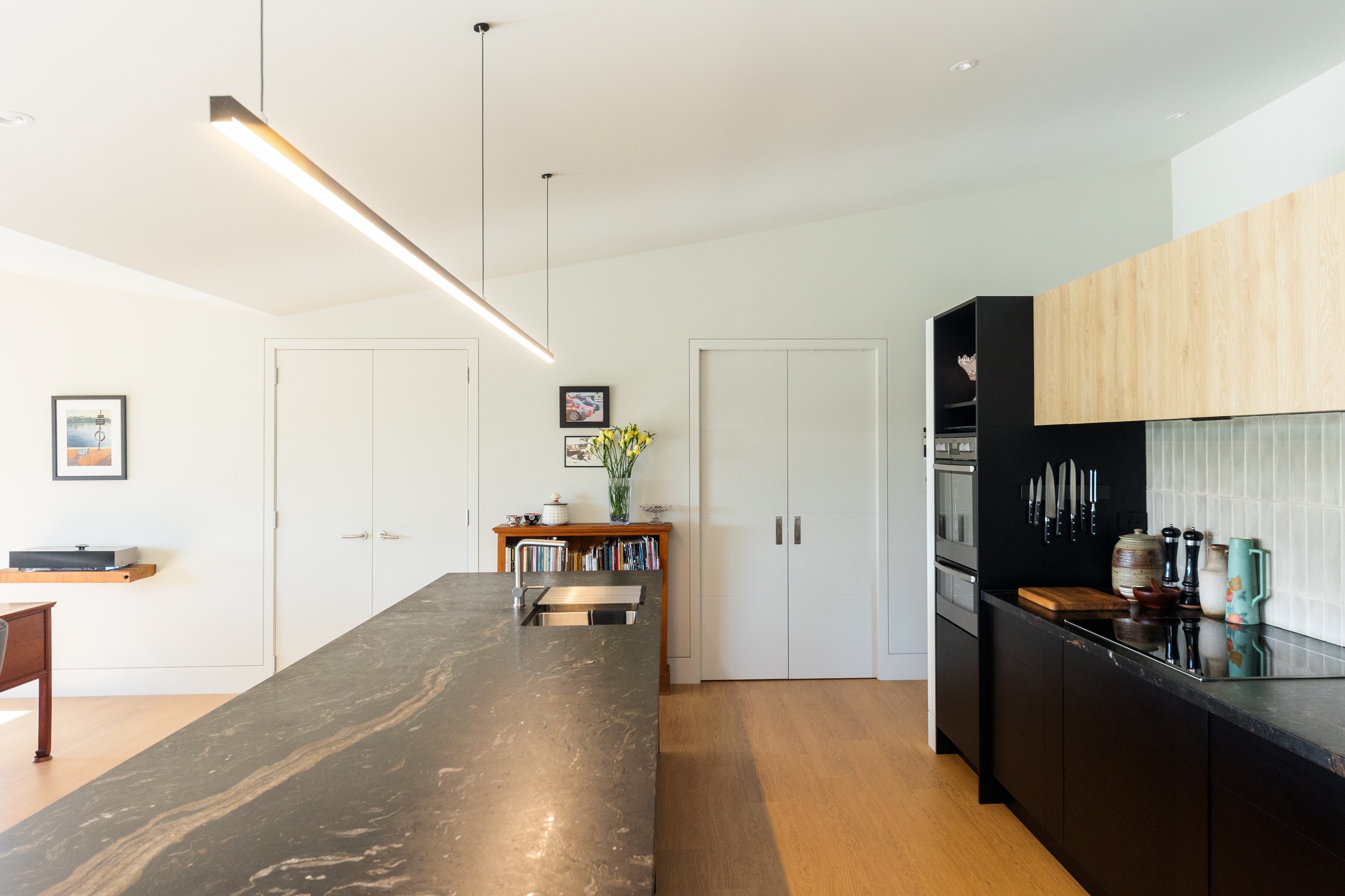 When visitors step into this large and long three-bedroom home, they are greeted with a framed view. They see the contemporary outdoor lounge, featuring a suspended fireplace and an inviting pool area, all backdropped by the green landscape. From here, they’re guided through to the main living and dining area under a prism of oak plywood ceilings. A simple layout and intricate design coupled with clever detailing and artistic panache elevate this 355sqm property into something special. The main bedroom suite opens out onto its own deck, taking in the lush outlook. The ensuite is simply sublime, with a luxurious bath that also captures the stunning rural view. The design challenge for this particular build was to create a home that took advantage of the vista of rolling hills, without succumbing to the mighty winds that sweep in from all directions. Exterior cladding, including Otago schist; vertical shiplap cedar; and high-quality, high-pressure laminate panels, complement the surroundings. Negative detailing on interior walls keeps things contemporary.