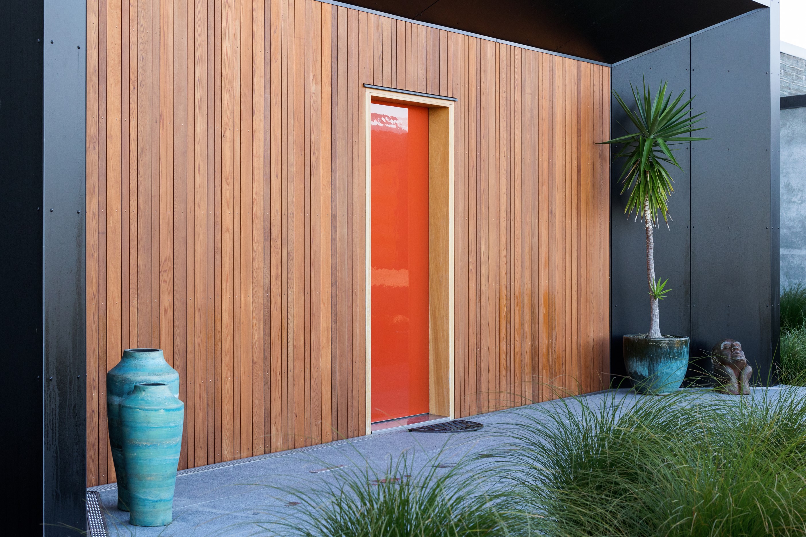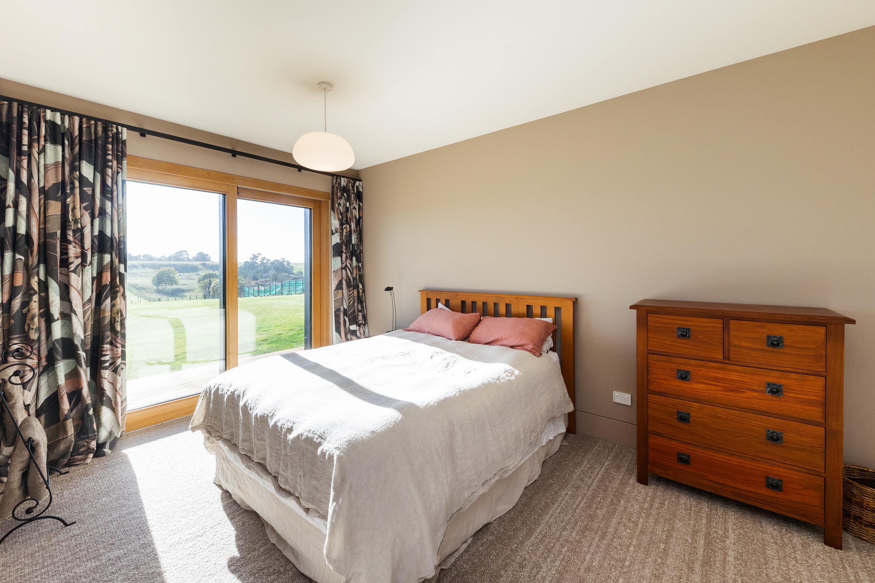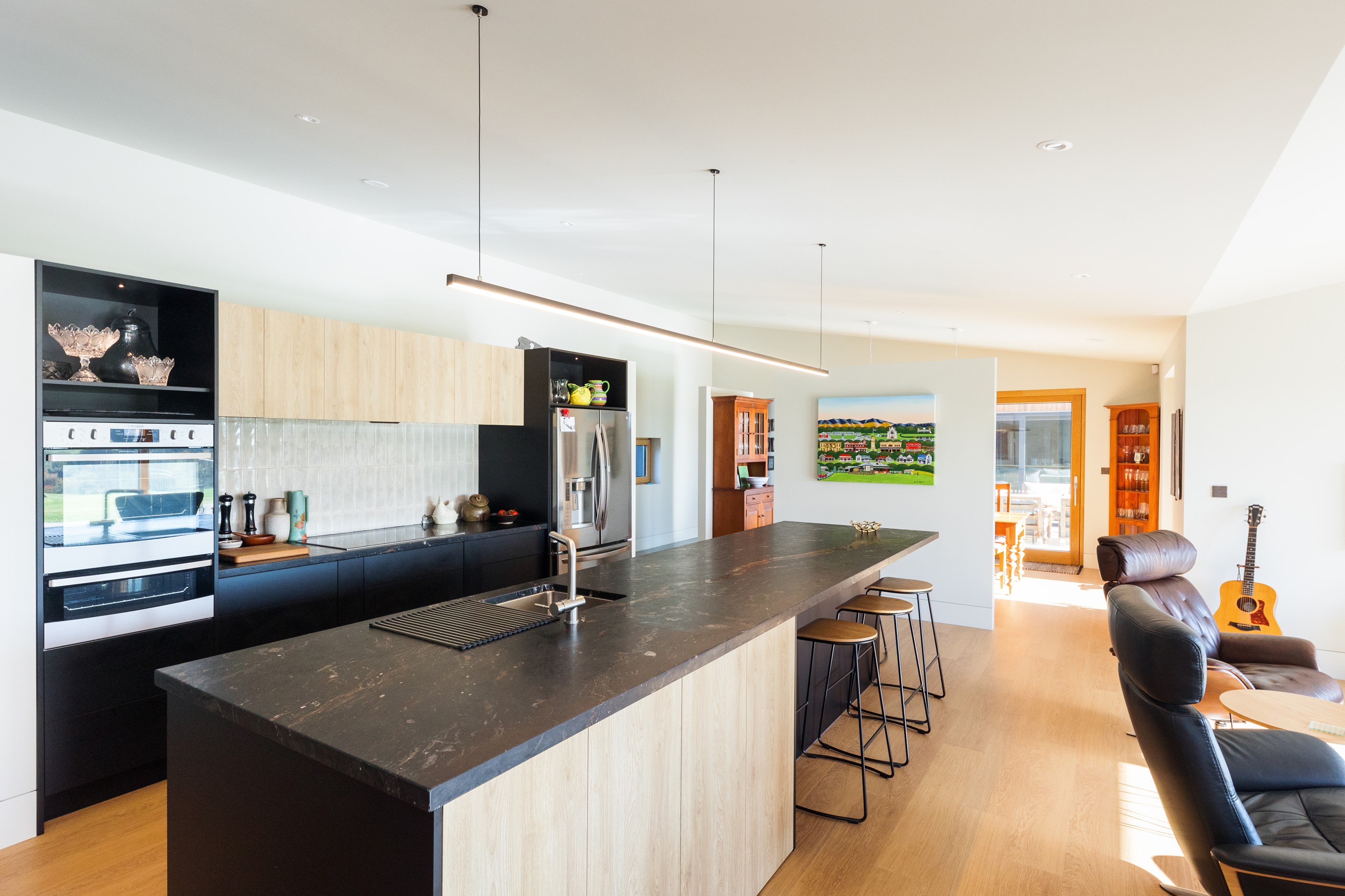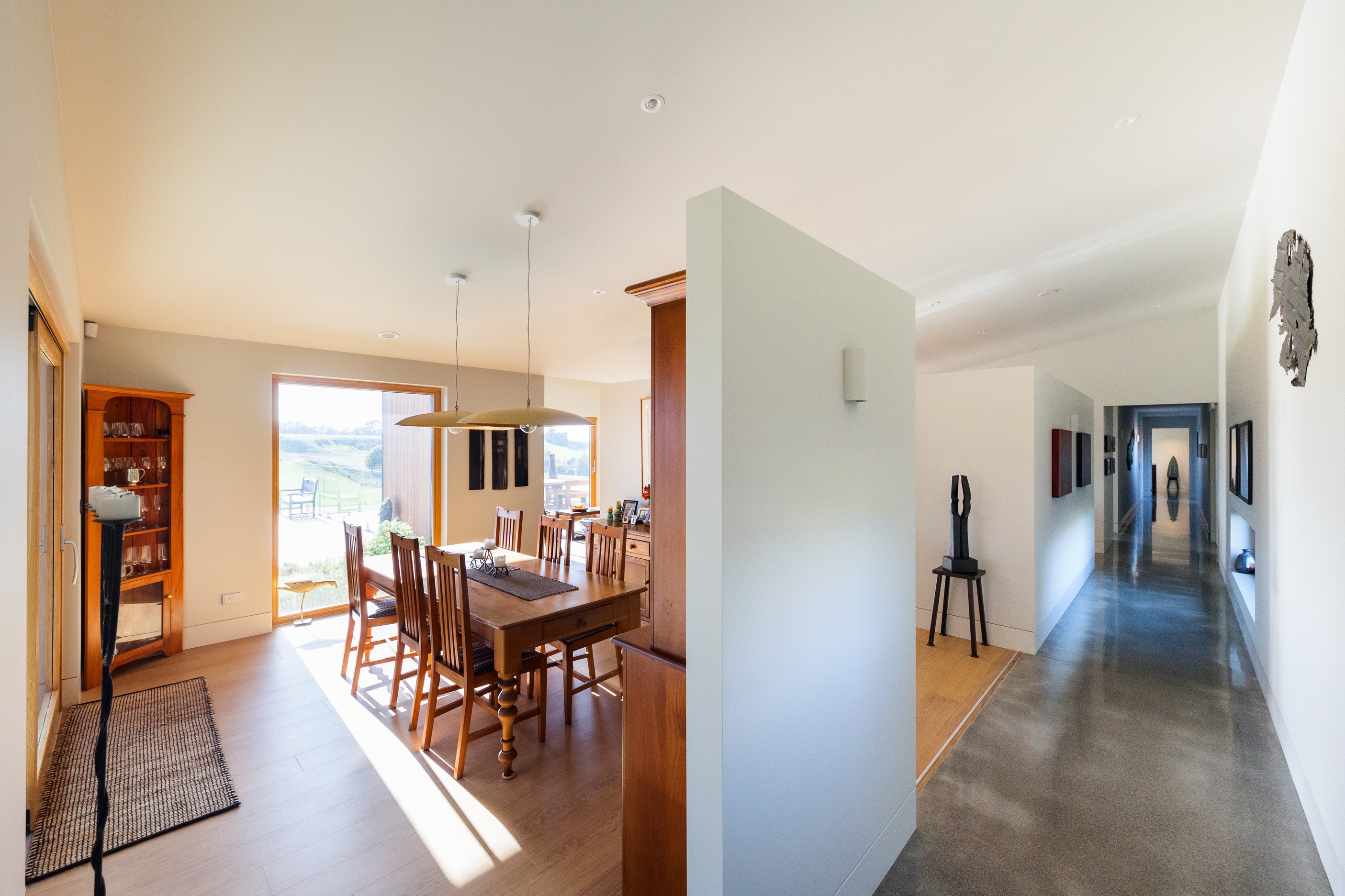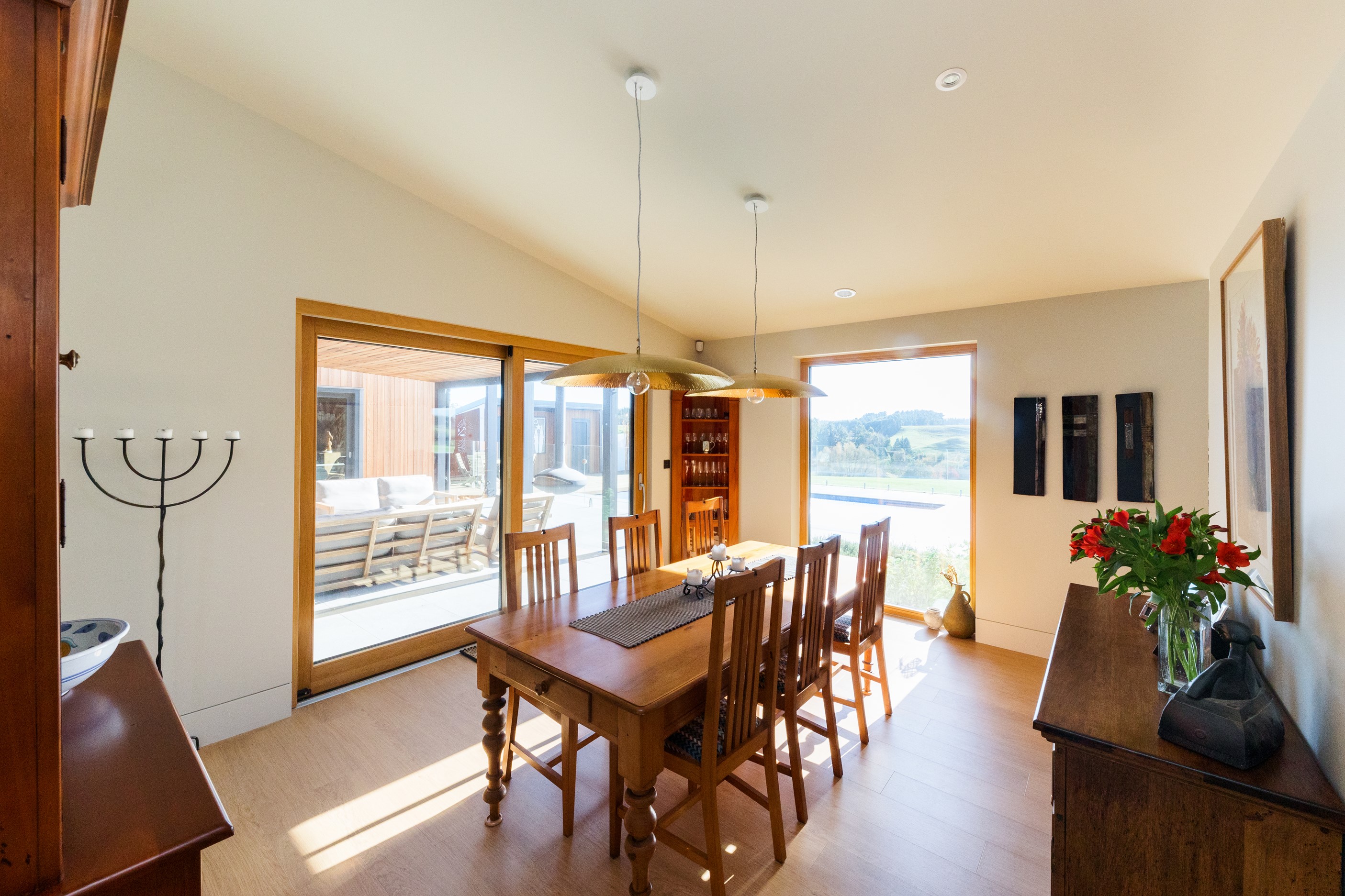 When visitors step into this large and long three-bedroom home, they are greeted with a framed view. They see the contemporary outdoor lounge, featuring a suspended fireplace and an inviting pool area, all backdropped by the green landscape. From here, they’re guided through to the main living and dining area under a prism of oak plywood ceilings. A simple layout and intricate design coupled with clever detailing and artistic panache elevate this 355sqm property into something special. The main bedroom suite opens out onto its own deck, taking in the lush outlook. The ensuite is simply sublime, with a luxurious bath that also captures the stunning rural view. The design challenge for this particular build was to create a home that took advantage of the vista of rolling hills, without succumbing to the mighty winds that sweep in from all directions. Exterior cladding, including Otago schist; vertical shiplap cedar; and high-quality, high-pressure laminate panels, complement the surroundings. Negative detailing on interior walls keeps things contemporary.