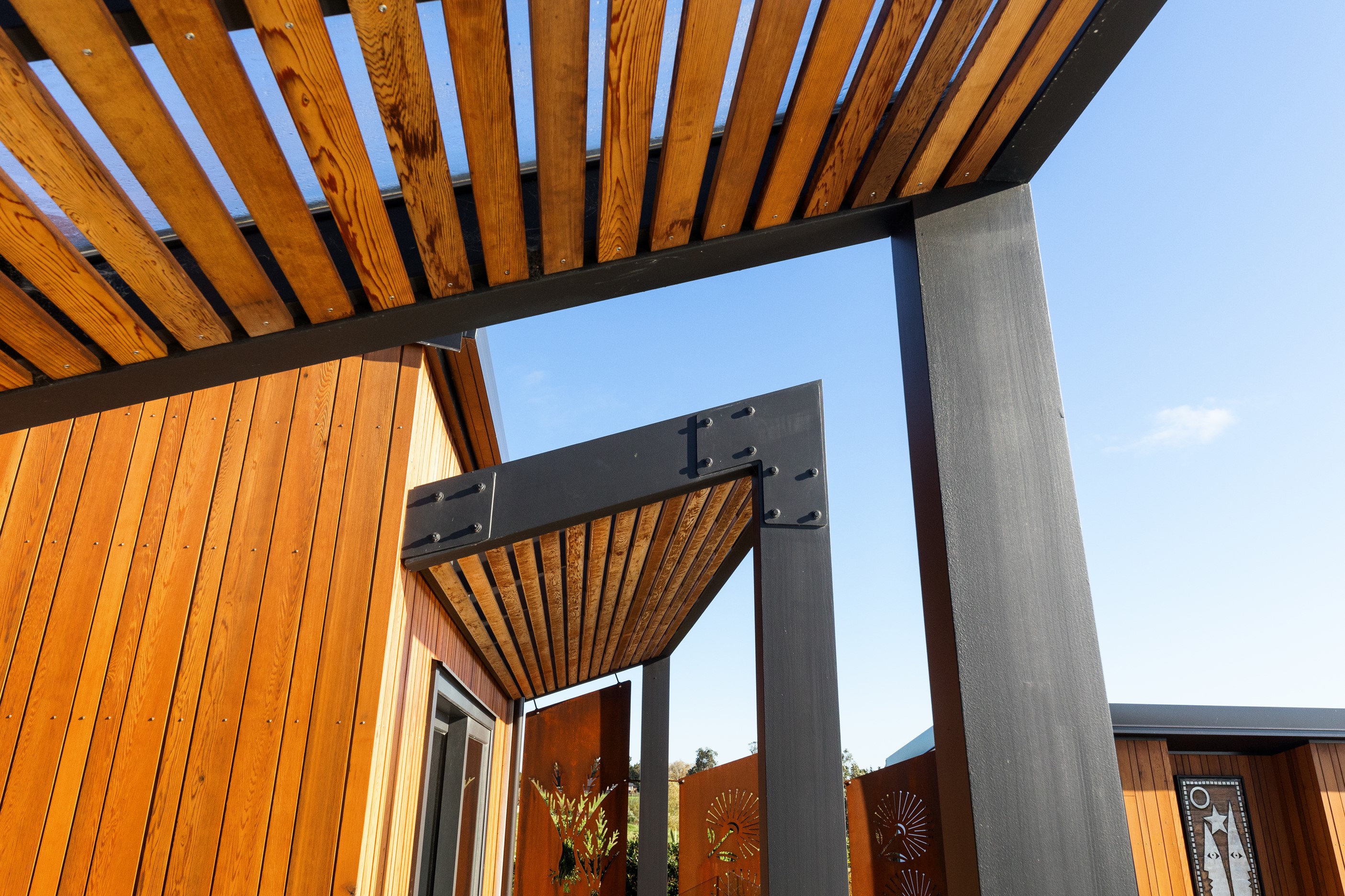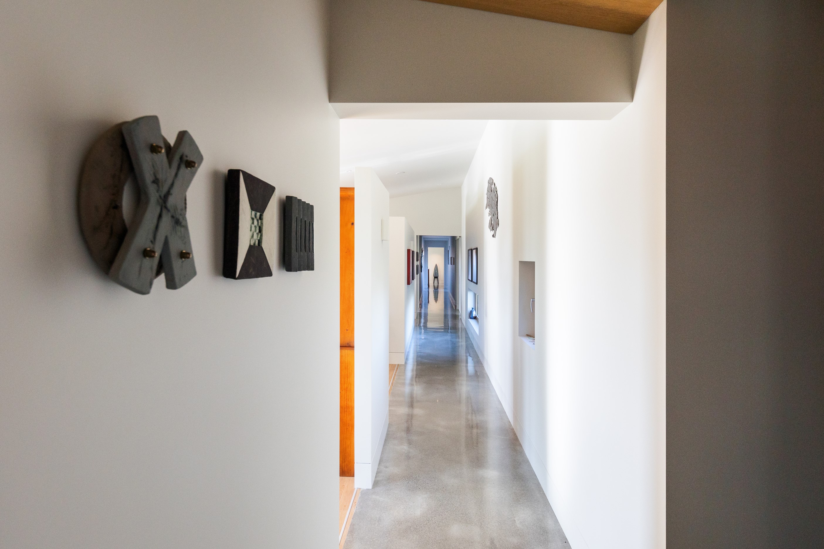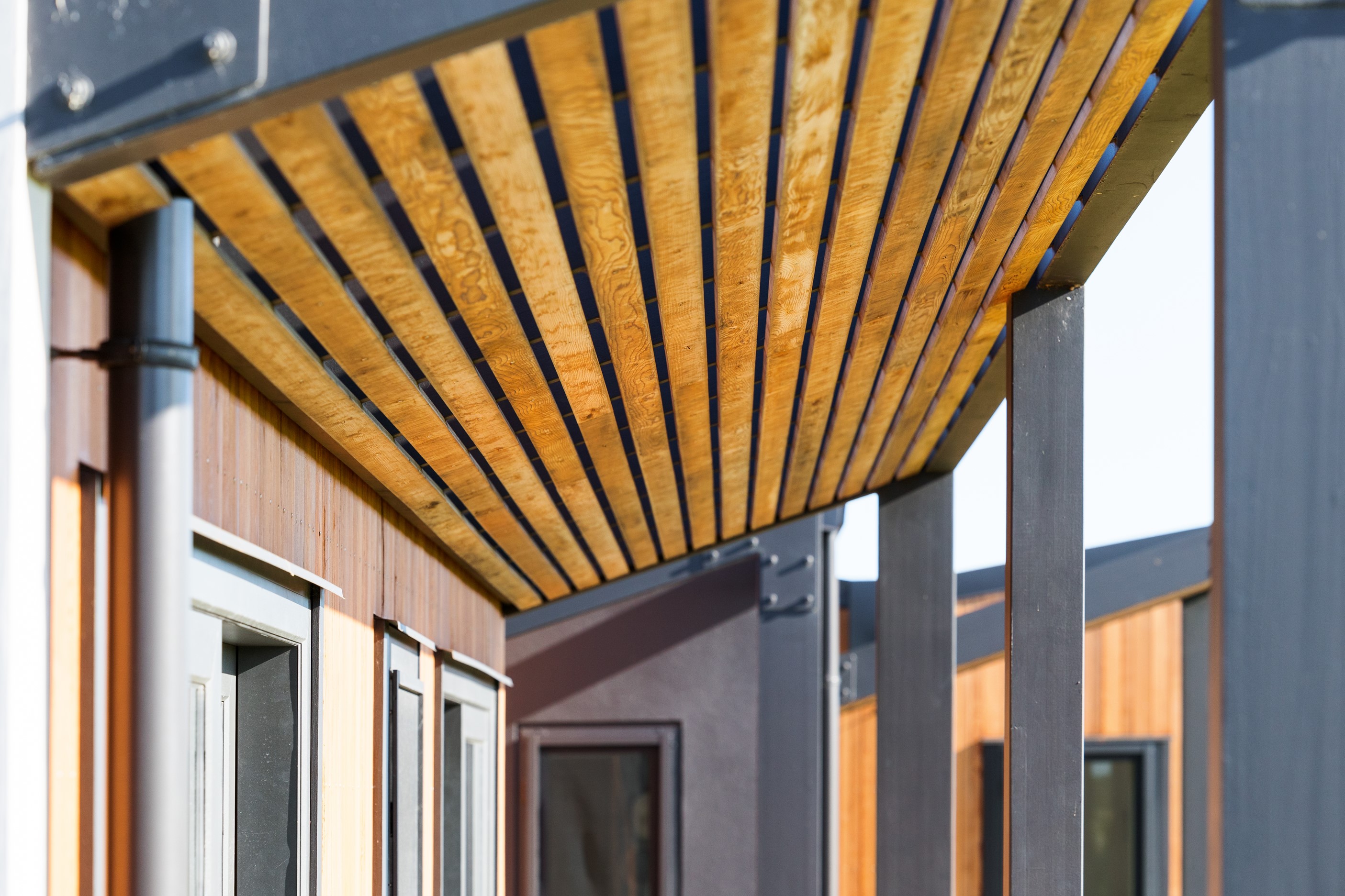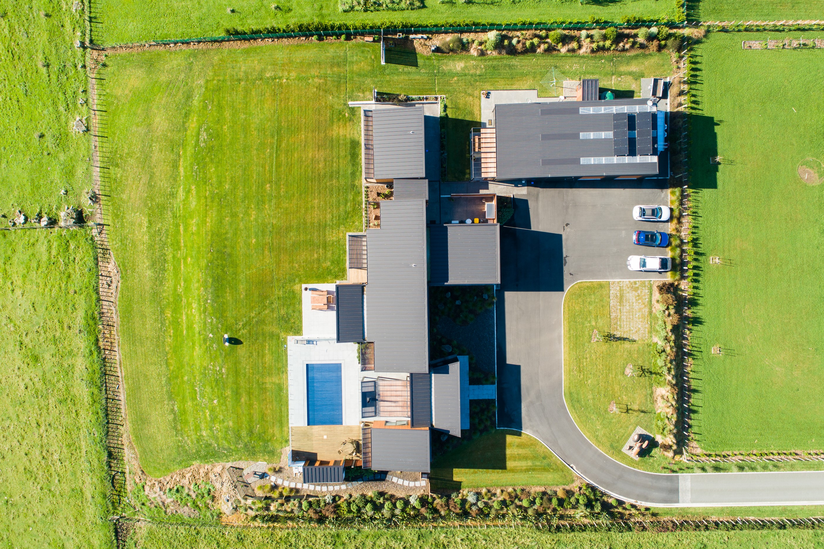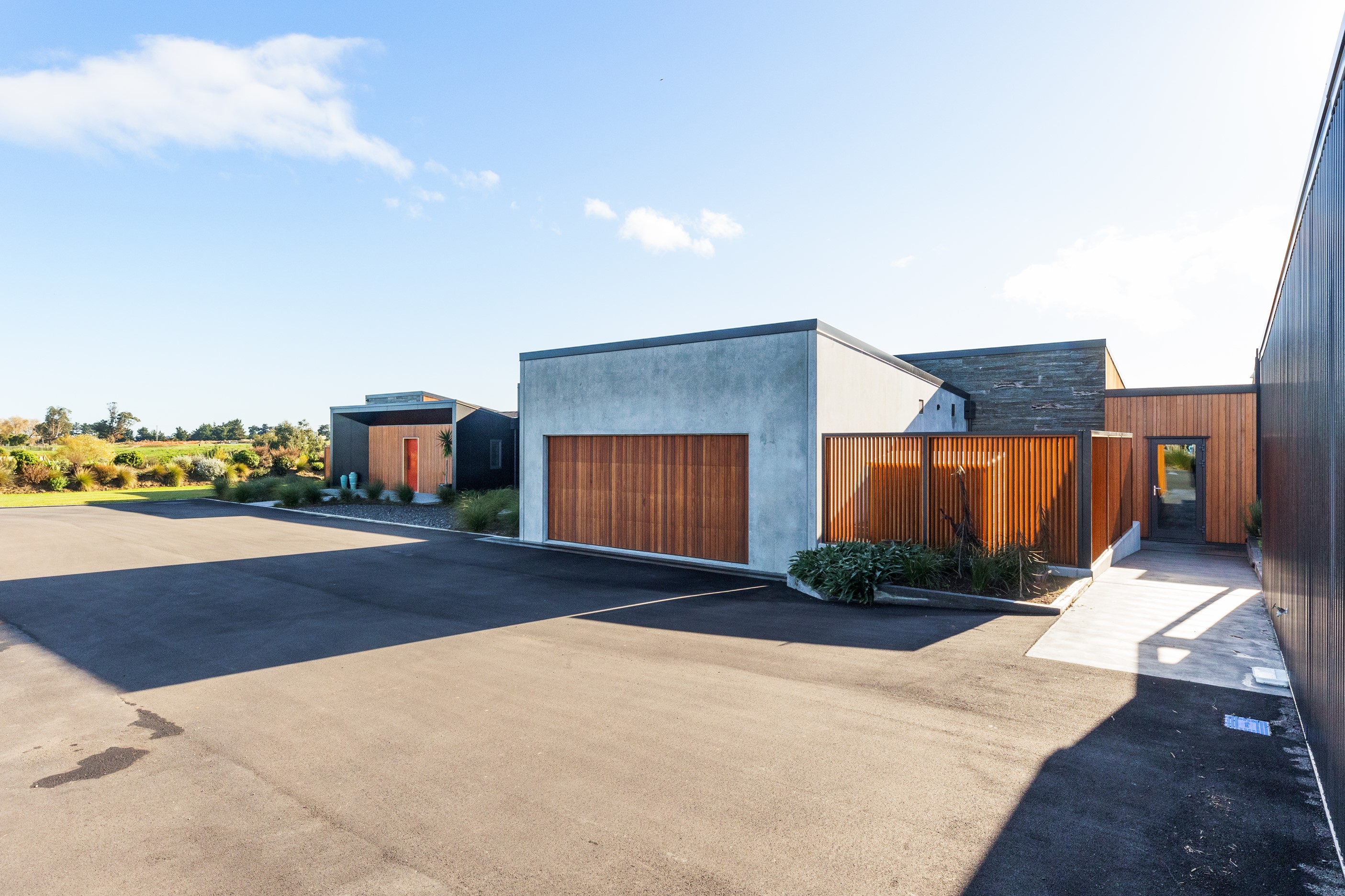 When visitors step into this large and long three-bedroom home, they are greeted with a framed view. They see the contemporary outdoor lounge, featuring a suspended fireplace and an inviting pool area, all backdropped by the green landscape. From here, they’re guided through to the main living and dining area under a prism of oak plywood ceilings. A simple layout and intricate design coupled with clever detailing and artistic panache elevate this 355sqm property into something special. The main bedroom suite opens out onto its own deck, taking in the lush outlook. The ensuite is simply sublime, with a luxurious bath that also captures the stunning rural view. The design challenge for this particular build was to create a home that took advantage of the vista of rolling hills, without succumbing to the mighty winds that sweep in from all directions. Exterior cladding, including Otago schist; vertical shiplap cedar; and high-quality, high-pressure laminate panels, complement the surroundings. Negative detailing on interior walls keeps things contemporary.