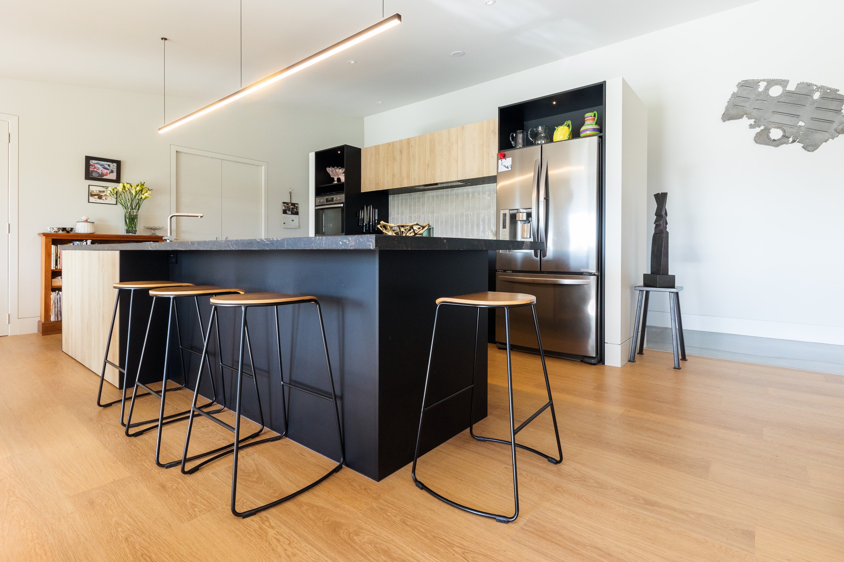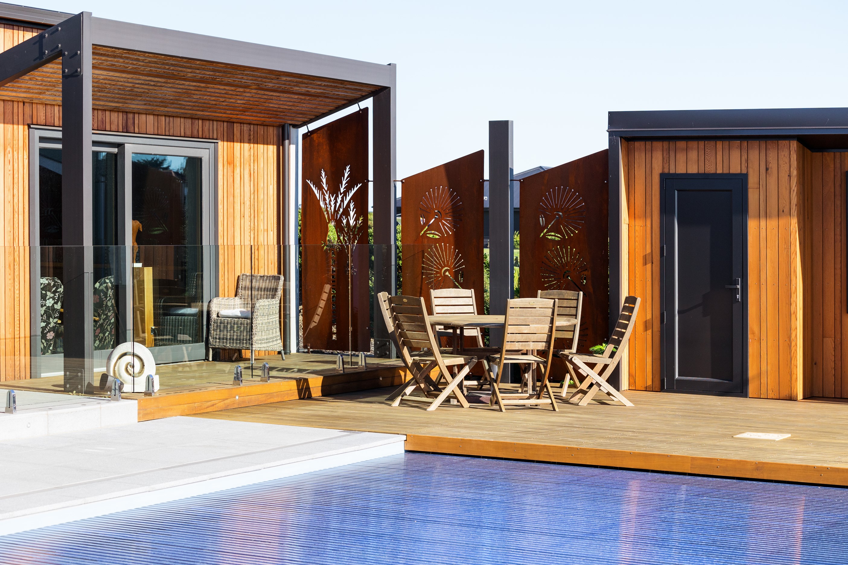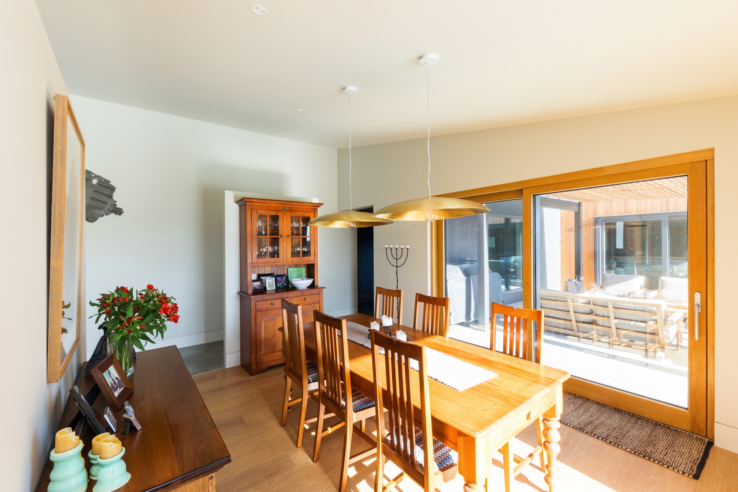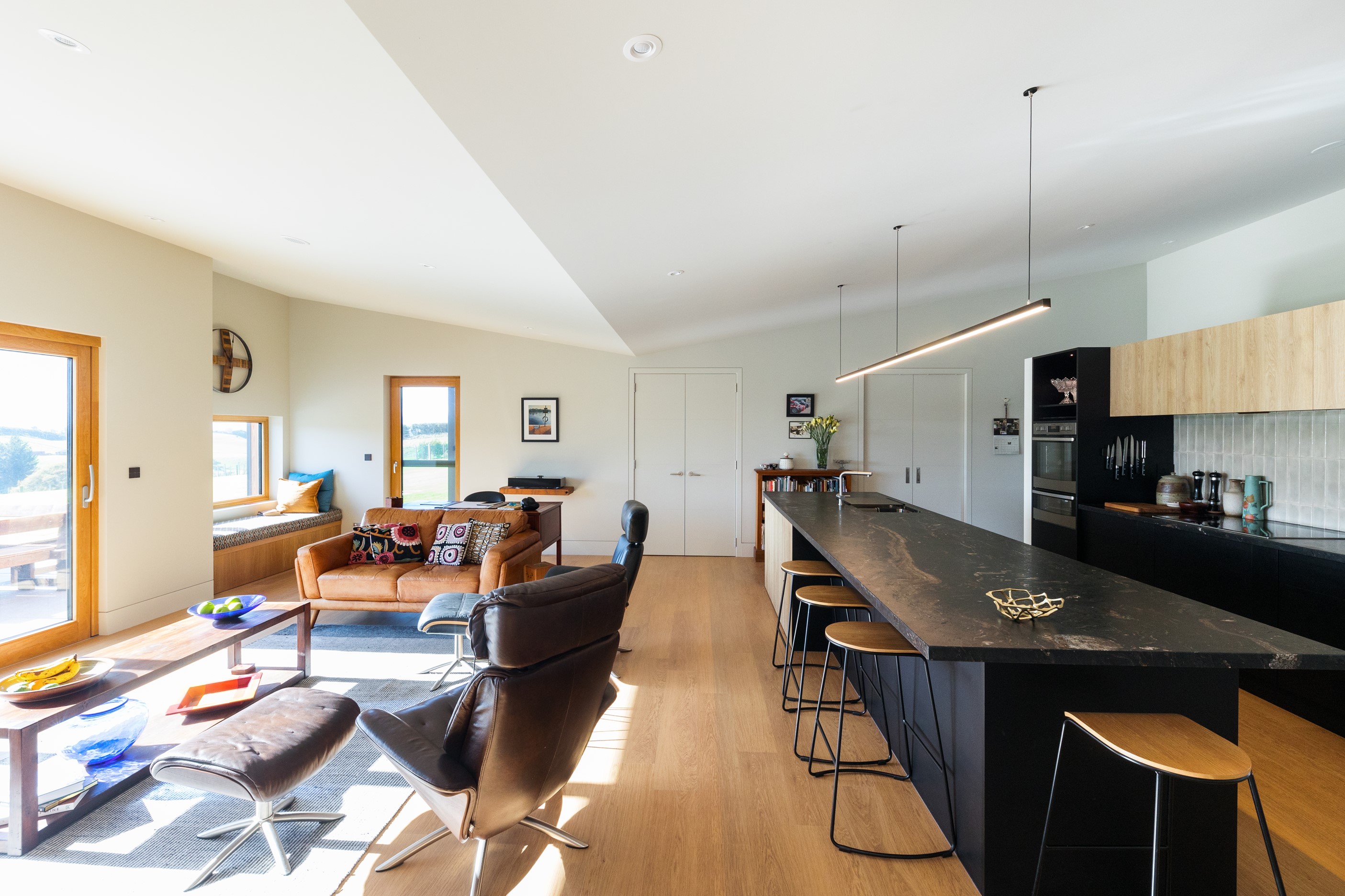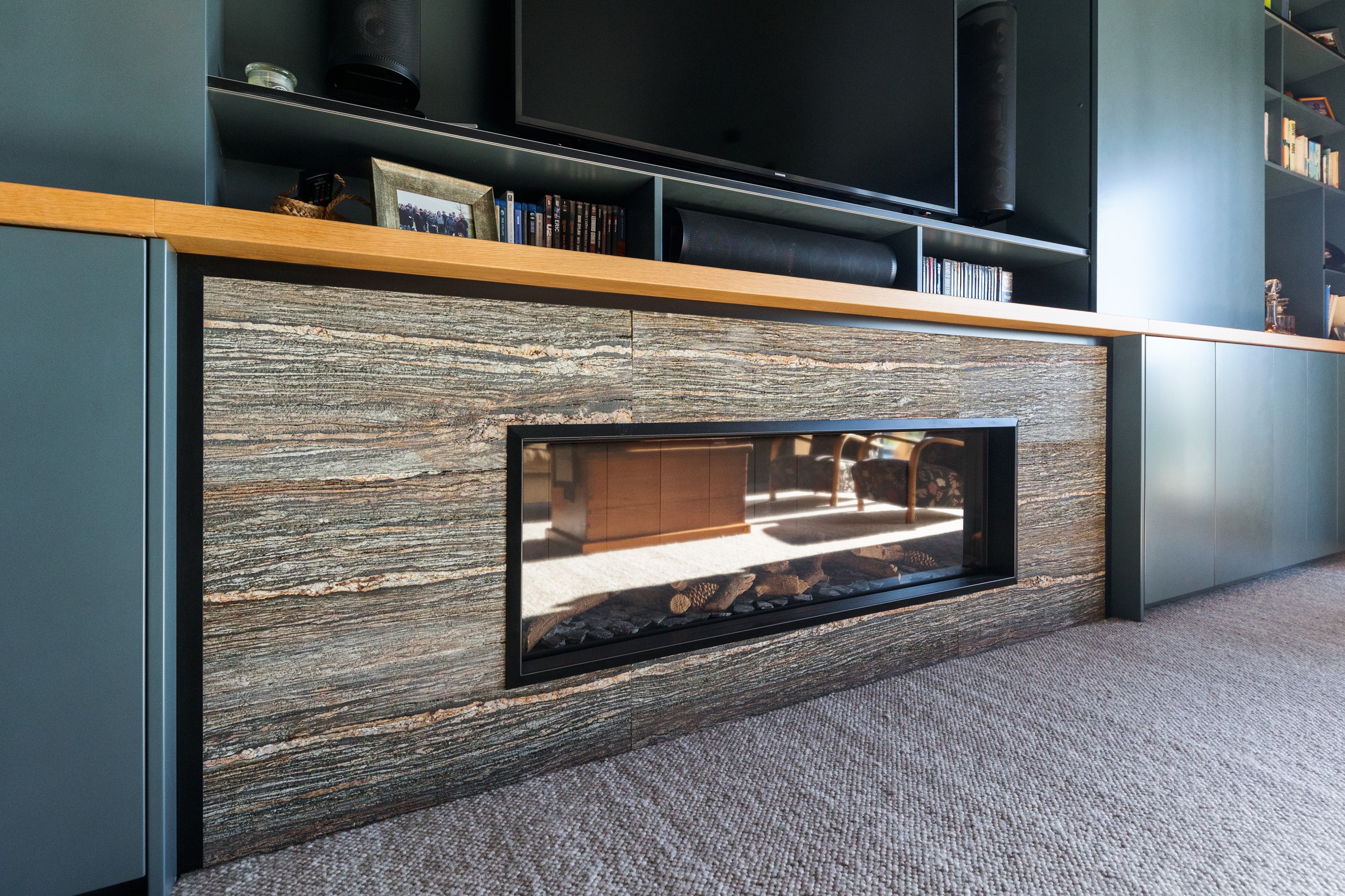 When visitors step into this large and long three-bedroom home, they are greeted with a framed view. They see the contemporary outdoor lounge, featuring a suspended fireplace and an inviting pool area, all backdropped by the green landscape. From here, they’re guided through to the main living and dining area under a prism of oak plywood ceilings. A simple layout and intricate design coupled with clever detailing and artistic panache elevate this 355sqm property into something special. The main bedroom suite opens out onto its own deck, taking in the lush outlook. The ensuite is simply sublime, with a luxurious bath that also captures the stunning rural view. The design challenge for this particular build was to create a home that took advantage of the vista of rolling hills, without succumbing to the mighty winds that sweep in from all directions. Exterior cladding, including Otago schist; vertical shiplap cedar; and high-quality, high-pressure laminate panels, complement the surroundings. Negative detailing on interior walls keeps things contemporary.