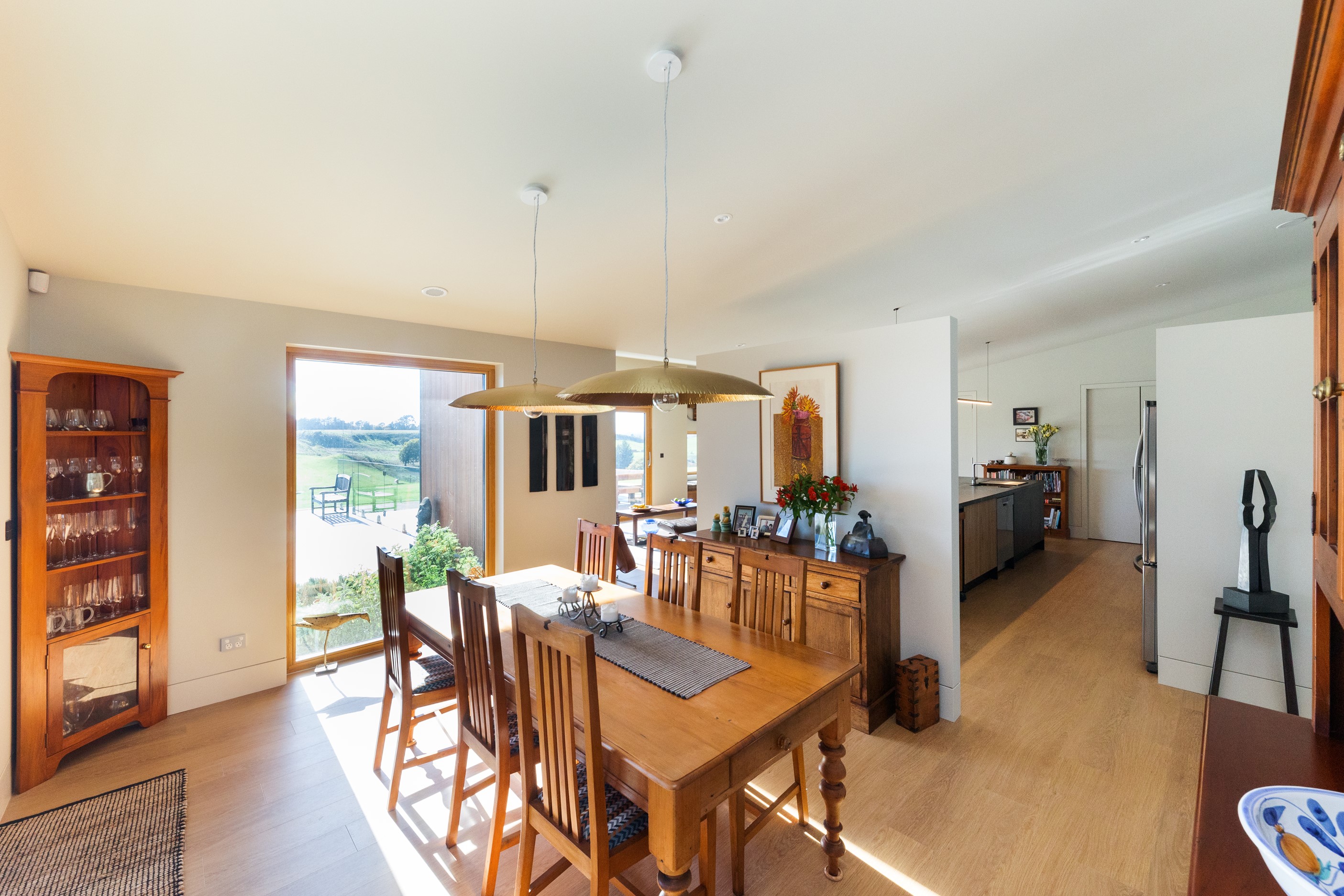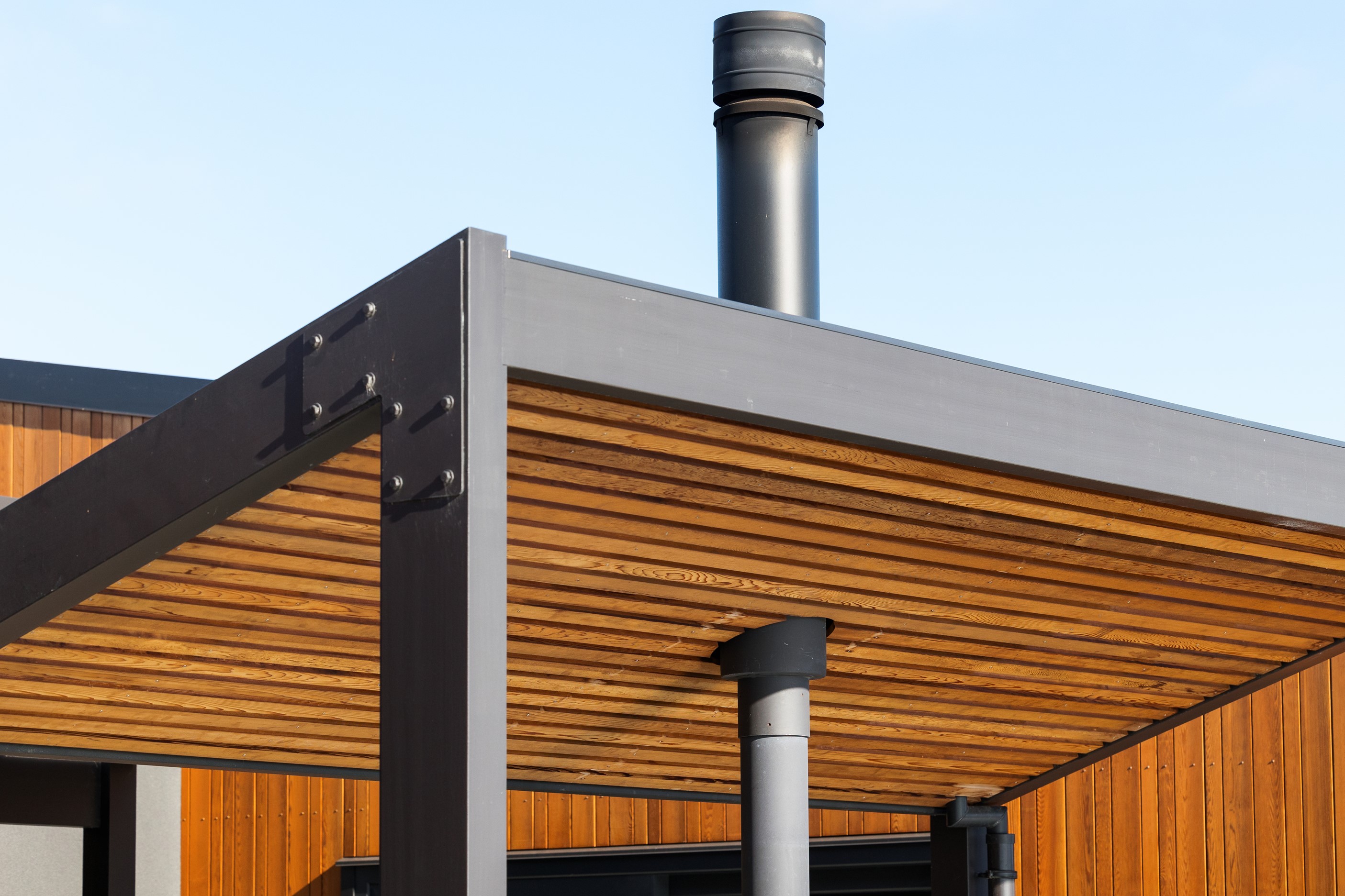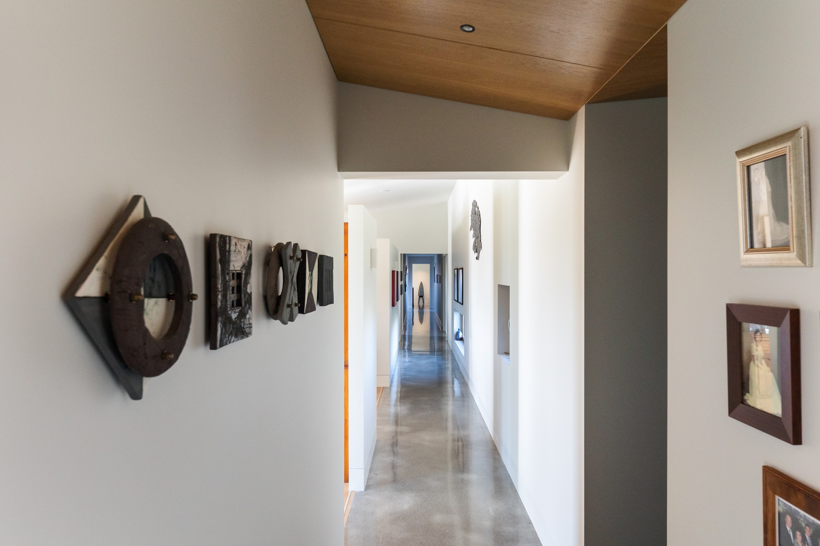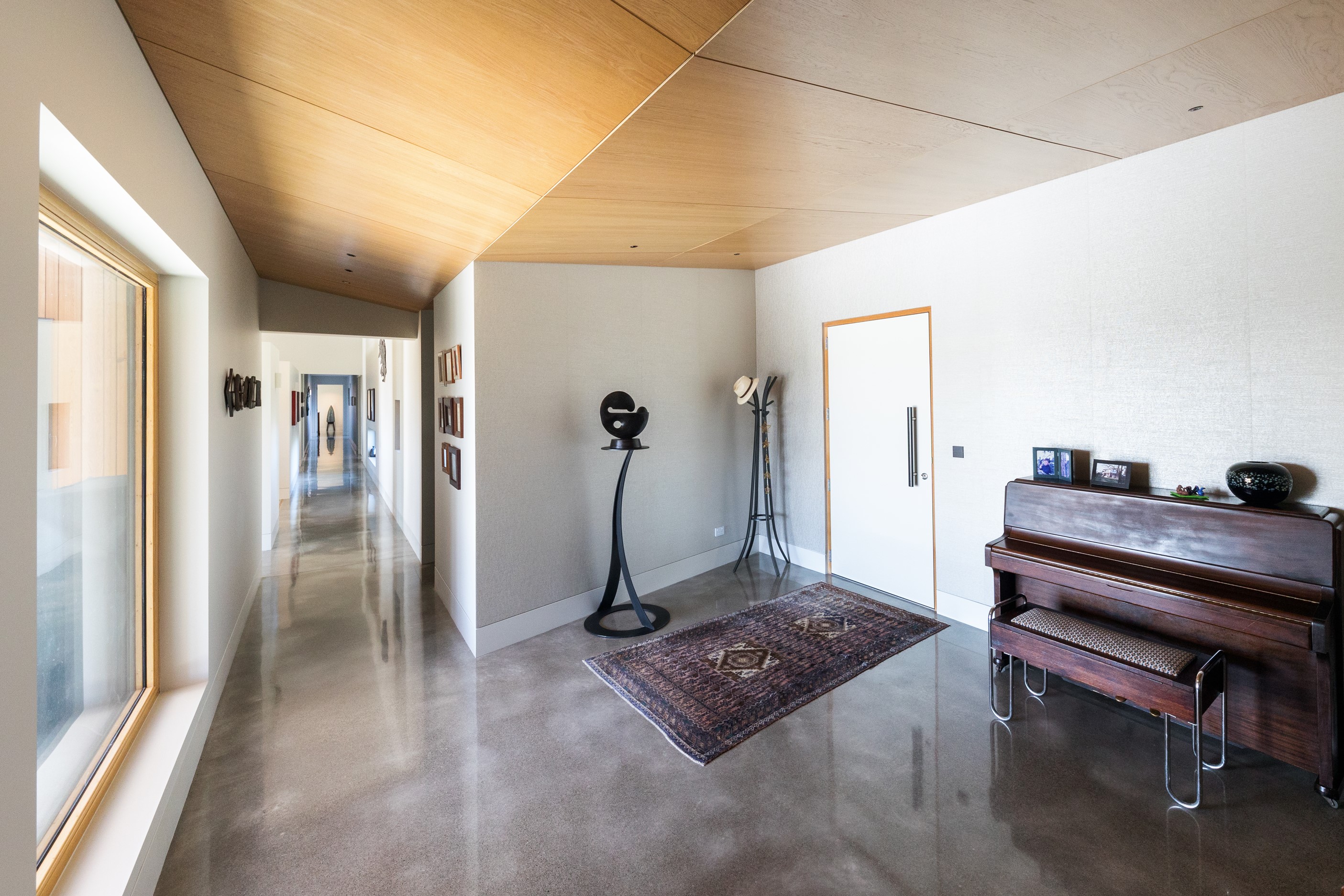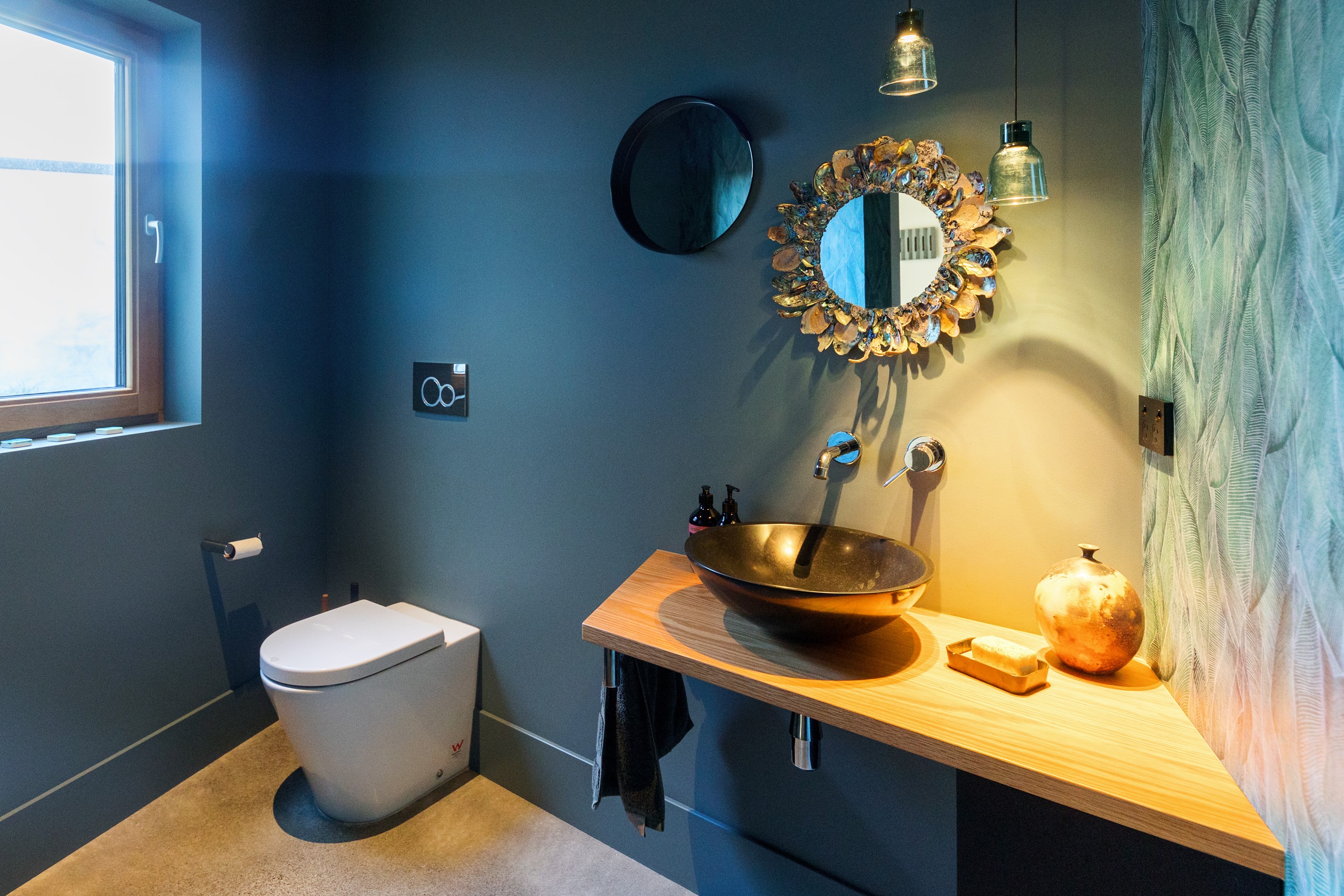 When visitors step into this large and long three-bedroom home, they are greeted with a framed view. They see the contemporary outdoor lounge, featuring a suspended fireplace and an inviting pool area, all backdropped by the green landscape. From here, they’re guided through to the main living and dining area under a prism of oak plywood ceilings. A simple layout and intricate design coupled with clever detailing and artistic panache elevate this 355sqm property into something special. The main bedroom suite opens out onto its own deck, taking in the lush outlook. The ensuite is simply sublime, with a luxurious bath that also captures the stunning rural view. The design challenge for this particular build was to create a home that took advantage of the vista of rolling hills, without succumbing to the mighty winds that sweep in from all directions. Exterior cladding, including Otago schist; vertical shiplap cedar; and high-quality, high-pressure laminate panels, complement the surroundings. Negative detailing on interior walls keeps things contemporary.