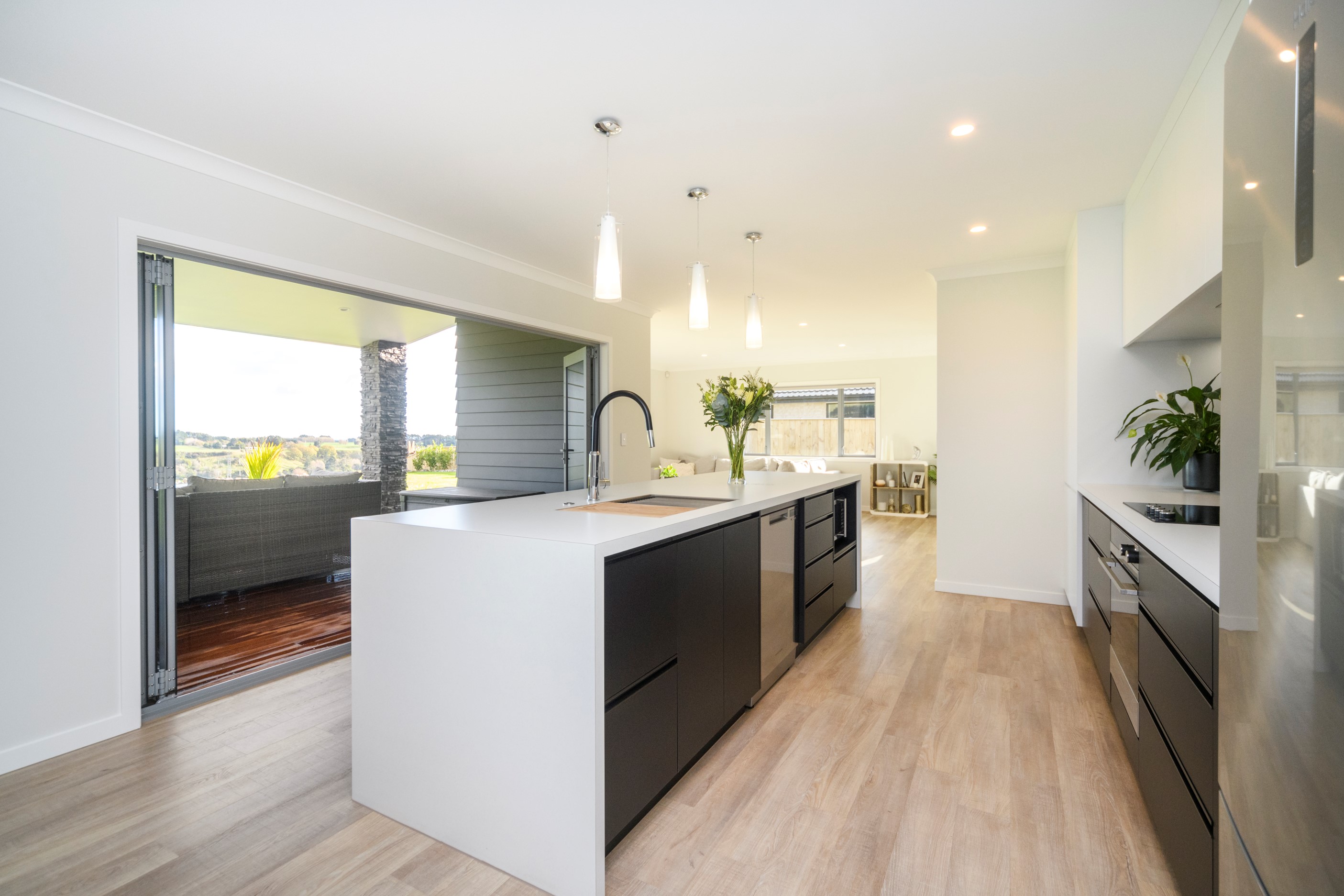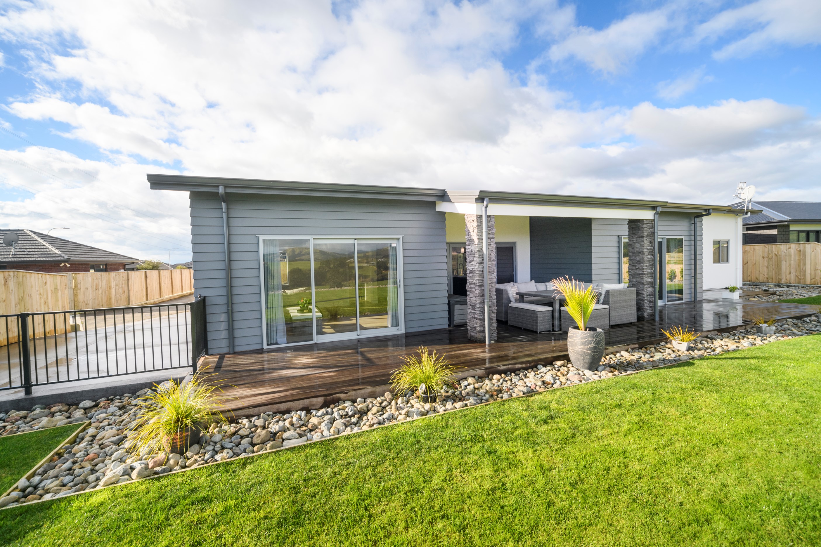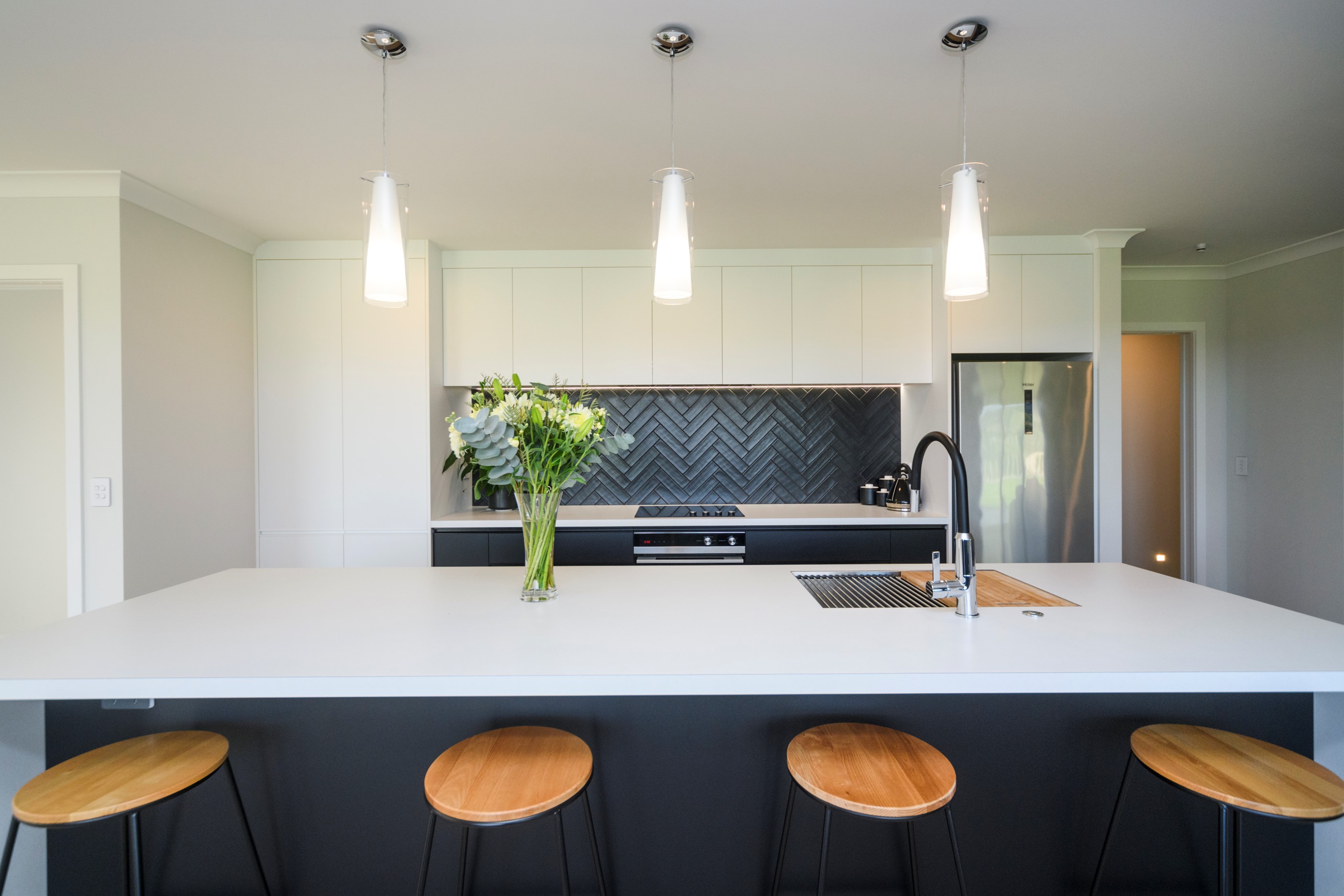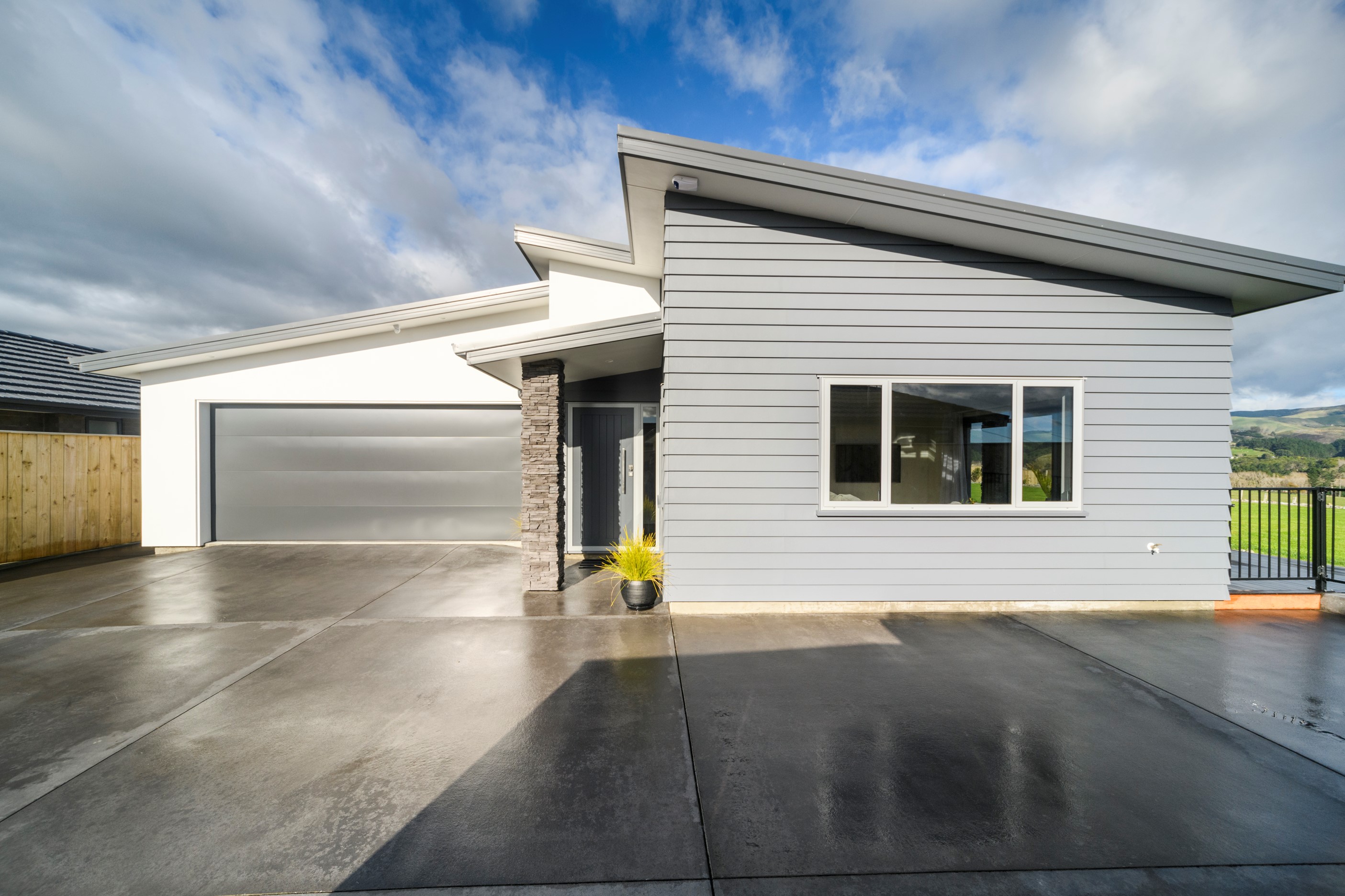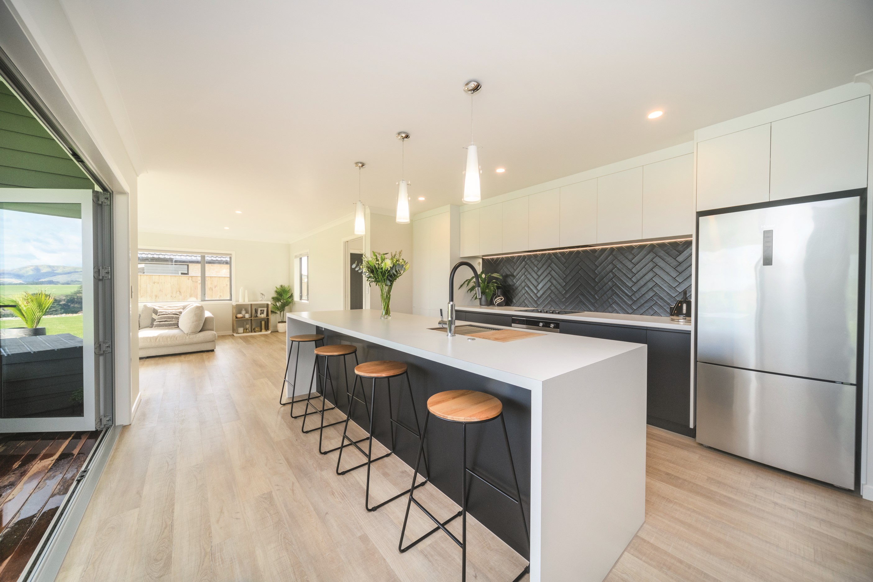 Located on the fringe between city and country, this 201sqm home has been designed to provide a relaxed yet modern sanctuary. On the exterior, a contemporary blend of white Rockcote plaster, grey Linea weatherboards and a hint of schist impress beneath the monopitch roof. With efficient and elegant use of space, this single-level home comfortably provides three bedrooms, two bathrooms and two living areas. Located alongside the living/dining zone, the stylish kitchen is positioned to open up to the covered outdoor living area. With lush green countryside beyond, this space offers a relaxing retreat for those quiet Sunday evenings to enjoy a glass of wine before the new work week begins. The laundry is conveniently tucked away within the internally accessed double garage, where there’s also additional storage space. The main bedroom suite provides ample room with a walk-in wardrobe and fully tiled ensuite, which includes a double-bowl wall-hung vanity and large shower. The family bathroom has been tastefully appointed with an elegant freestanding bath and separate shower.