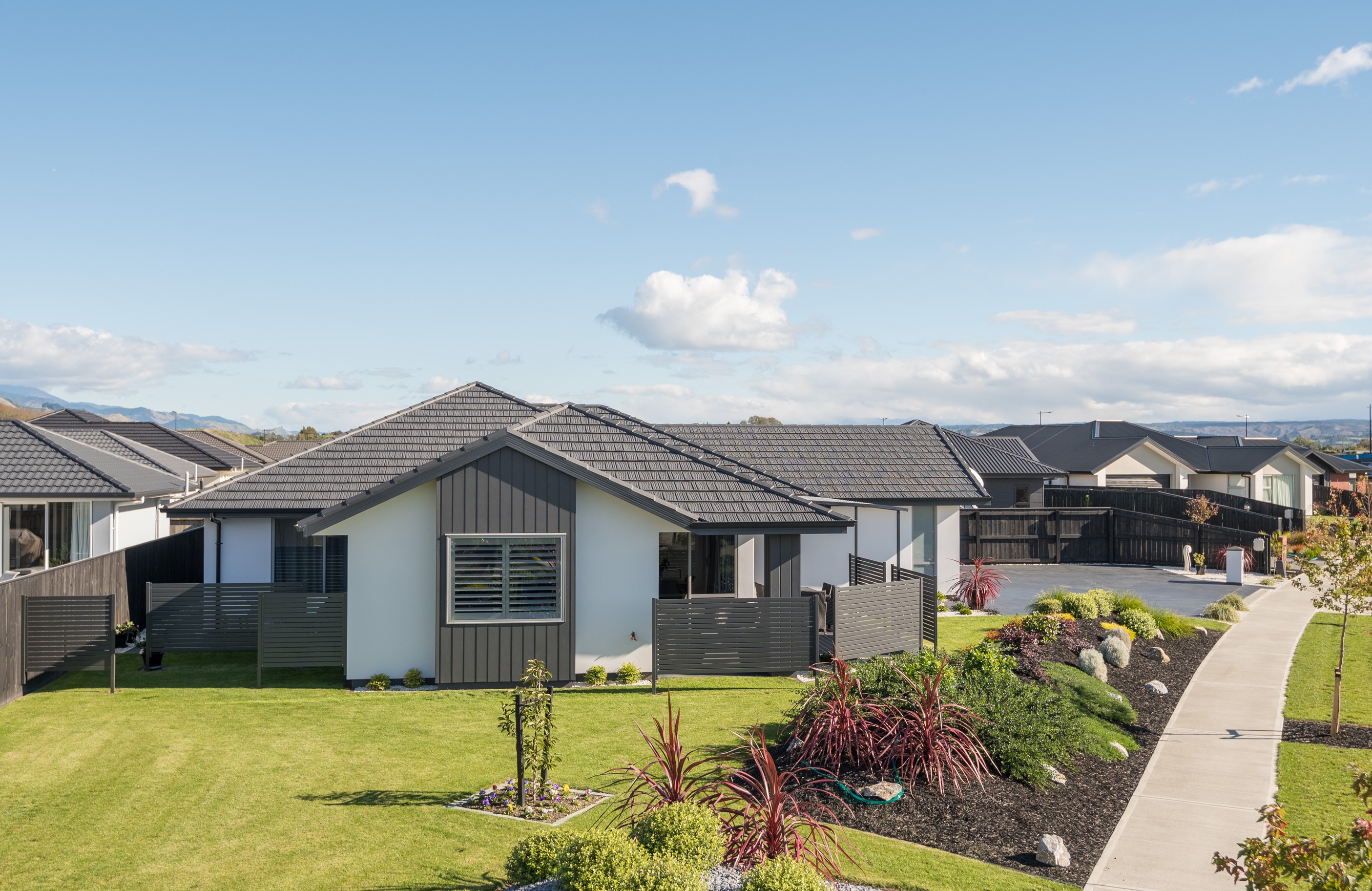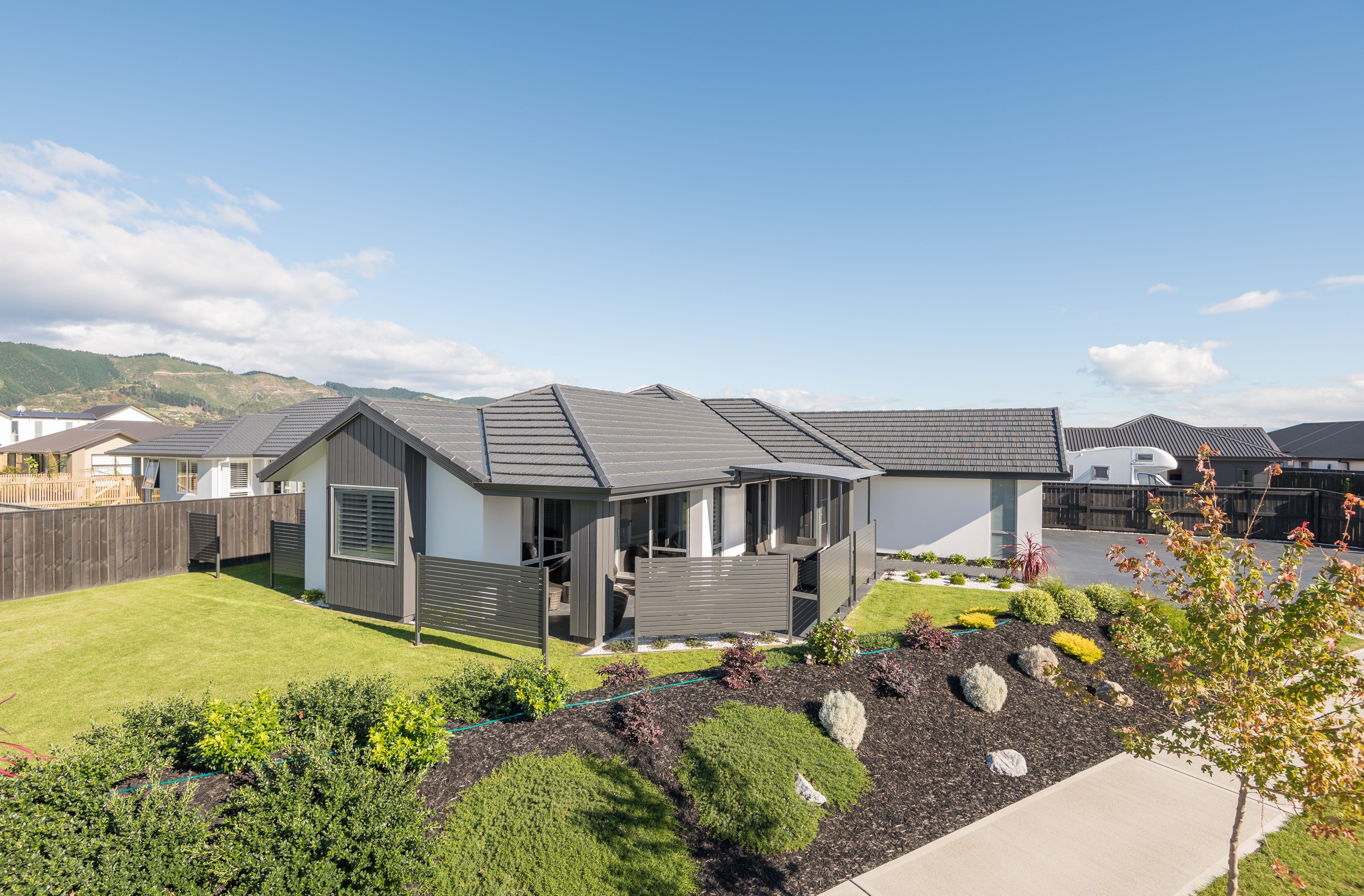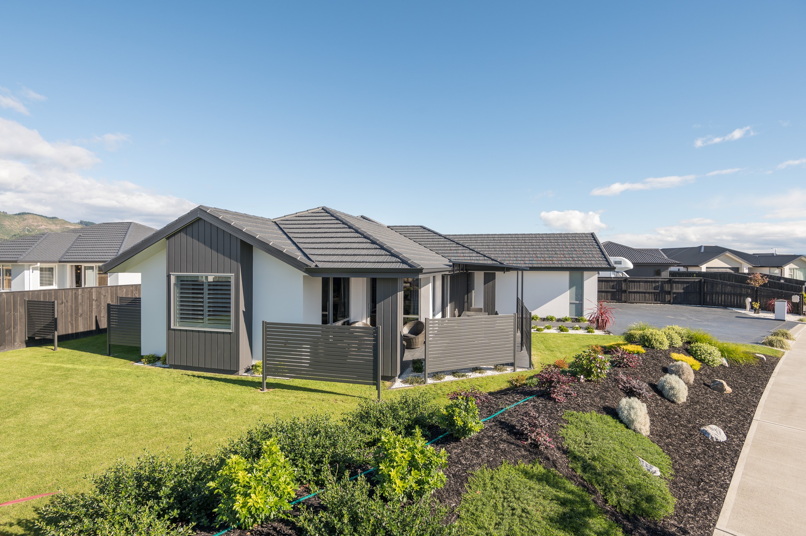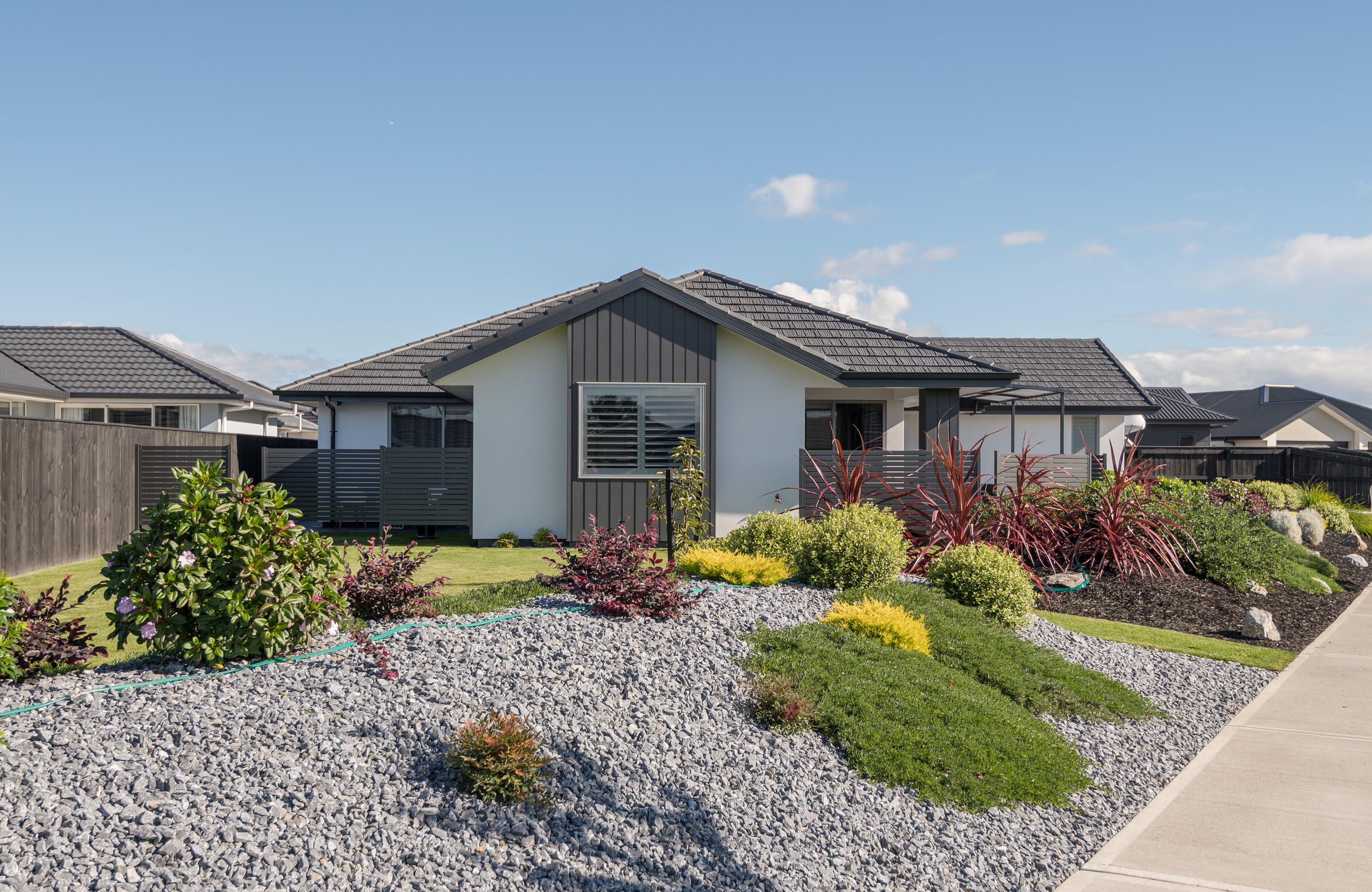 Designed for a retired couple, this single-level three-bedroom, two-bathroom home is exactly right for the owners’ lifestyle. It’s warm, sunny and open-plan. There’s plenty of room for vehicles, and even a space for a boat or campervan. And the maintenance? It’s a cinch, with powder-coated aluminium joinery, roof tiles and Linea weatherboards and plaster cladding on the exterior. The layout is ideal too. In the 186sqm floorplan you’ll find flowing living, dining and lounge spaces plus two sunny, covered alfresco areas, so sipping coffee outside is always an option. Screens provide privacy and shelter. The glossy kitchen is at the centre of everything and has a pantry and decent-sized breakfast bar – always a good place for visitors to gather or for chatting to the cook. Capturing the sun was also a major consideration in this build. The house is positioned to allow light to flood in and provide natural warmth. The main bedroom is a place of true relaxation, with a fresh, tiled ensuite and walk-in wardrobe. This home has plenty of storage options too – in the double garage and linen cupboard. In fact, it has it all.