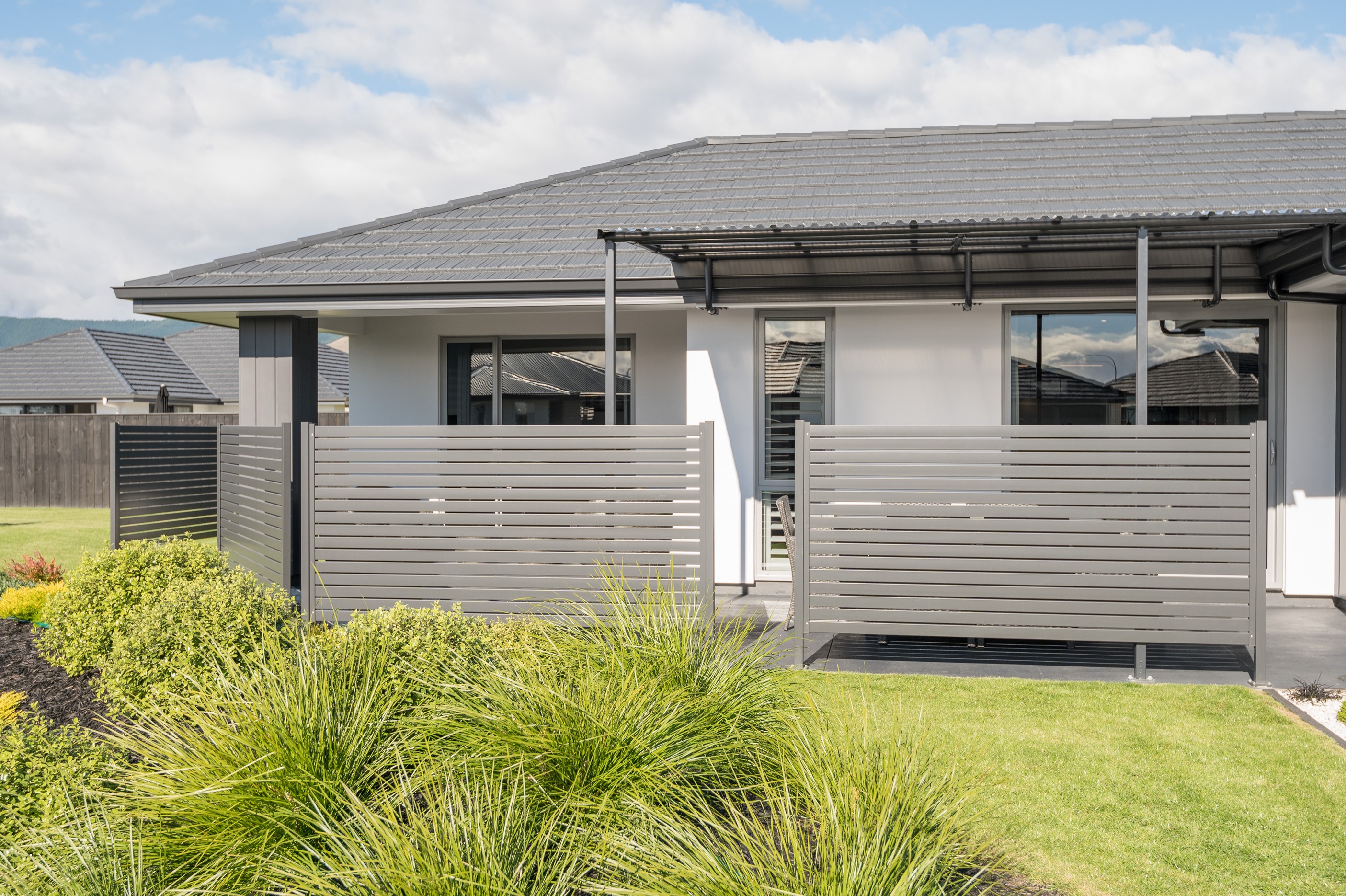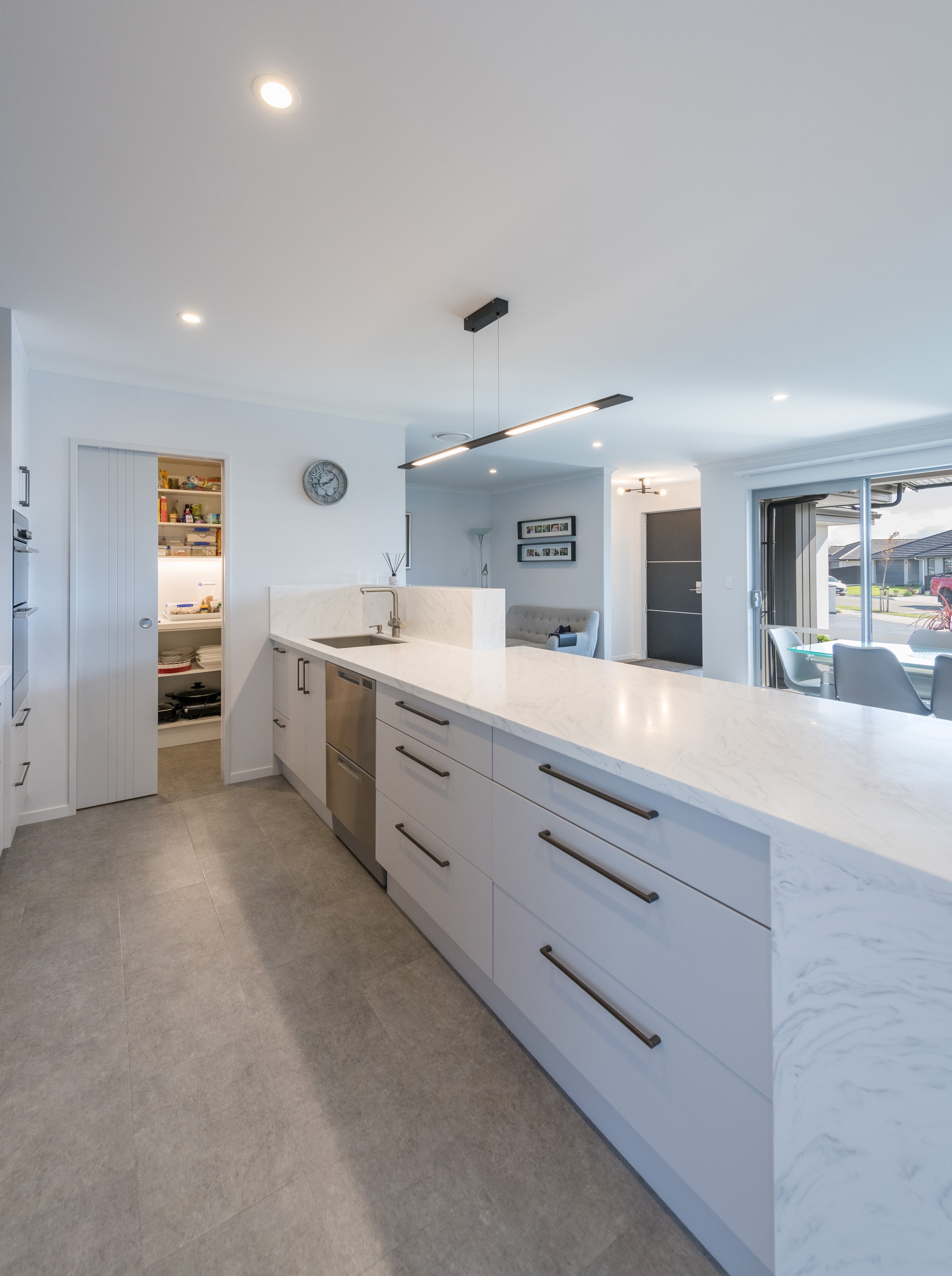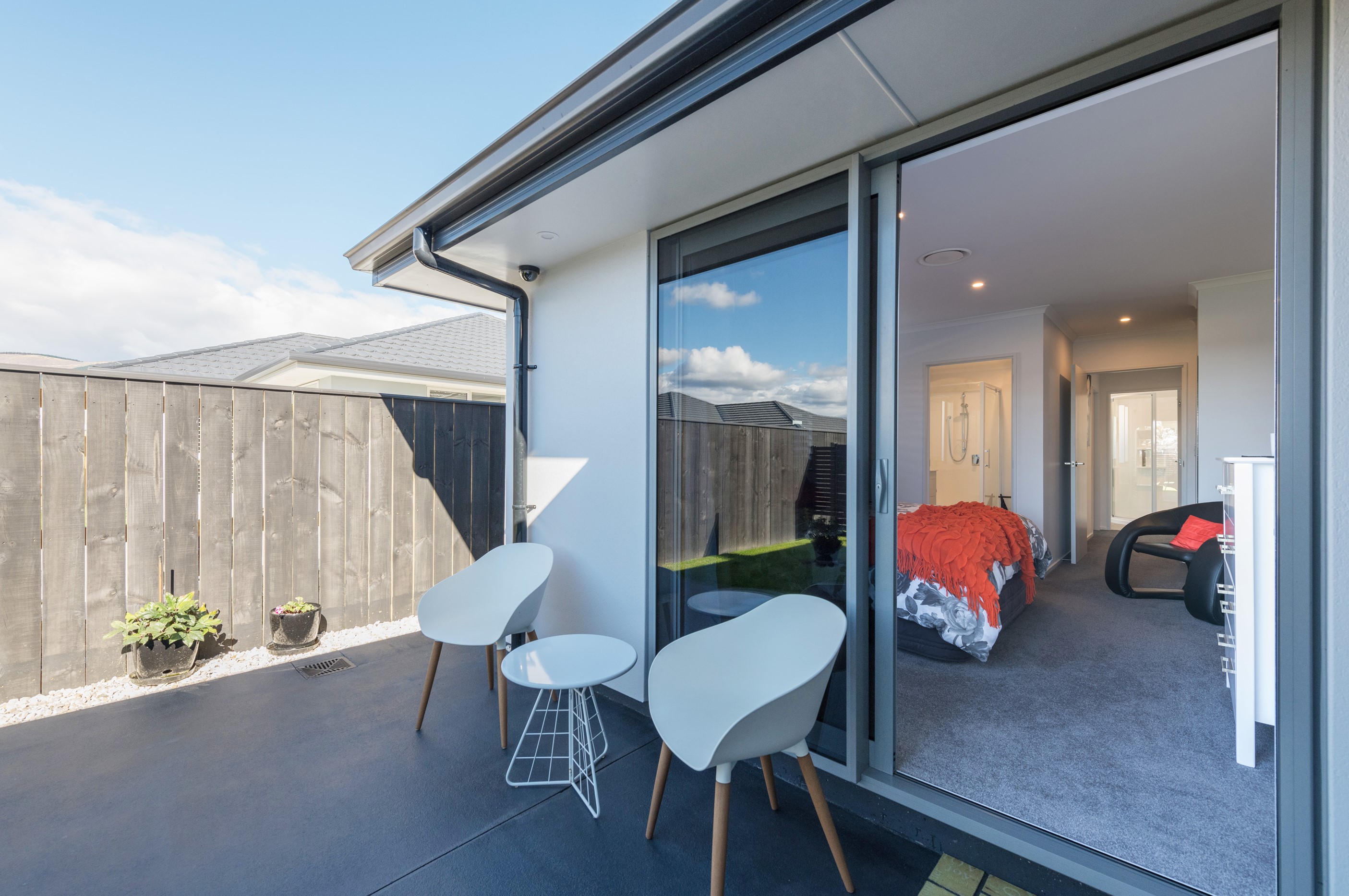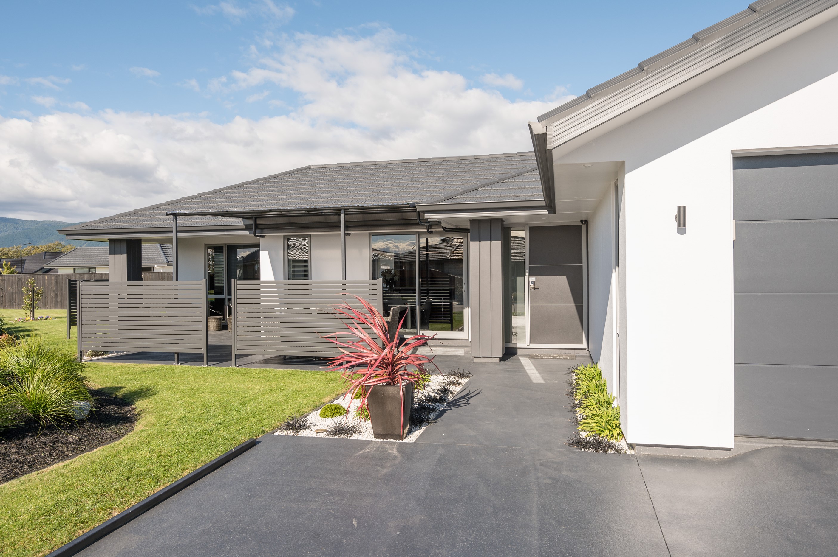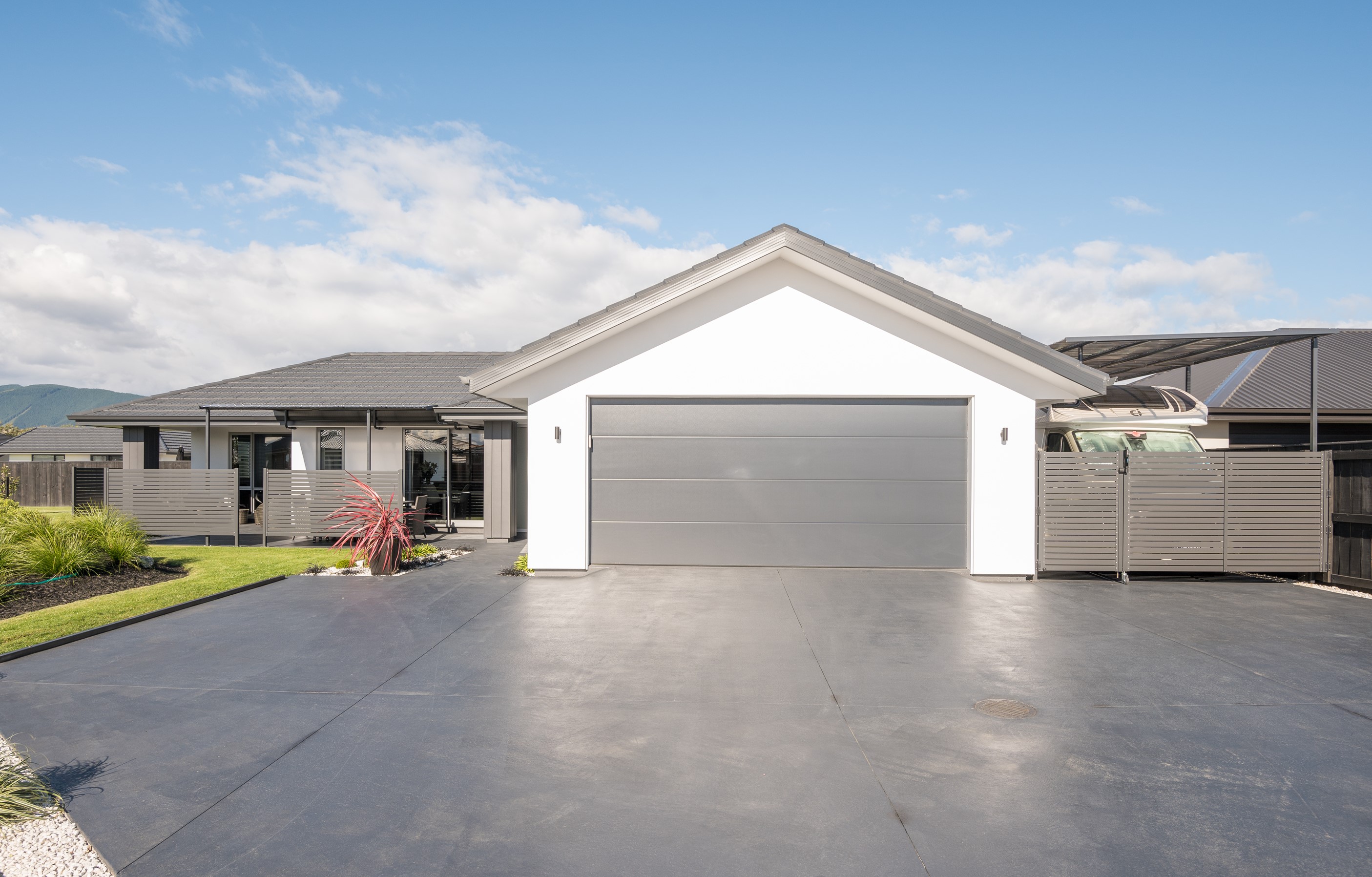 Designed for a retired couple, this single-level three-bedroom, two-bathroom home is exactly right for the owners’ lifestyle. It’s warm, sunny and open-plan. There’s plenty of room for vehicles, and even a space for a boat or campervan. And the maintenance? It’s a cinch, with powder-coated aluminium joinery, roof tiles and Linea weatherboards and plaster cladding on the exterior. The layout is ideal too. In the 186sqm floorplan you’ll find flowing living, dining and lounge spaces plus two sunny, covered alfresco areas, so sipping coffee outside is always an option. Screens provide privacy and shelter. The glossy kitchen is at the centre of everything and has a pantry and decent-sized breakfast bar – always a good place for visitors to gather or for chatting to the cook. Capturing the sun was also a major consideration in this build. The house is positioned to allow light to flood in and provide natural warmth. The main bedroom is a place of true relaxation, with a fresh, tiled ensuite and walk-in wardrobe. This home has plenty of storage options too – in the double garage and linen cupboard. In fact, it has it all.