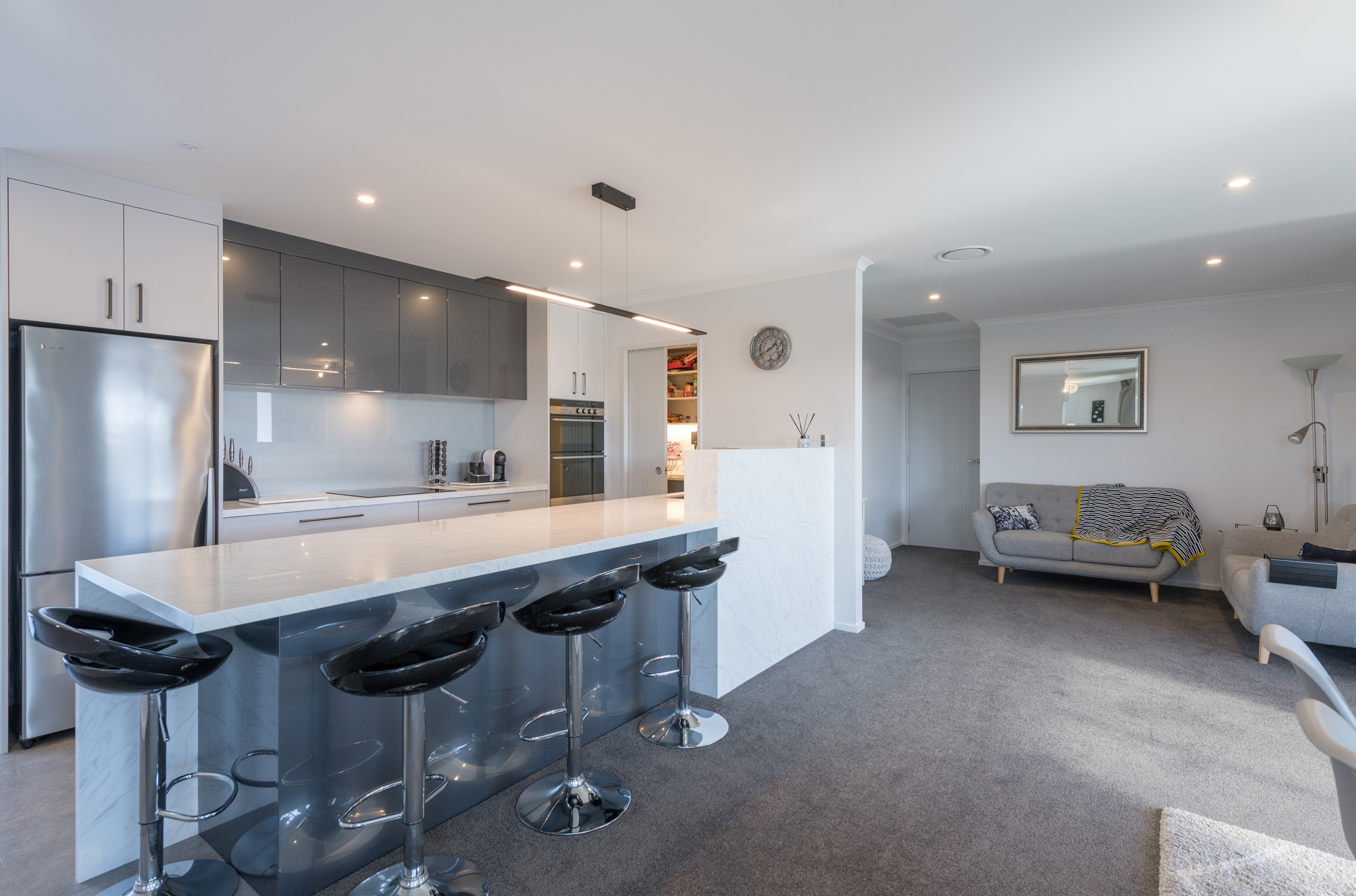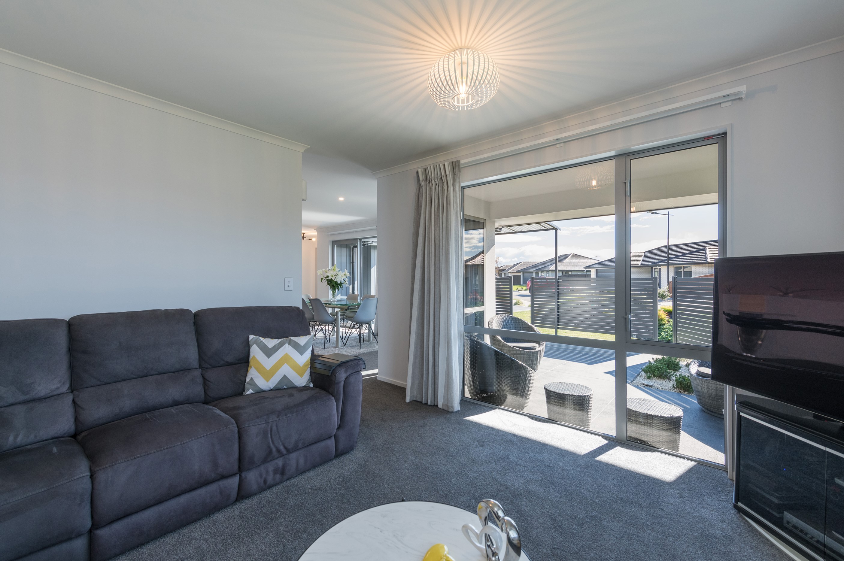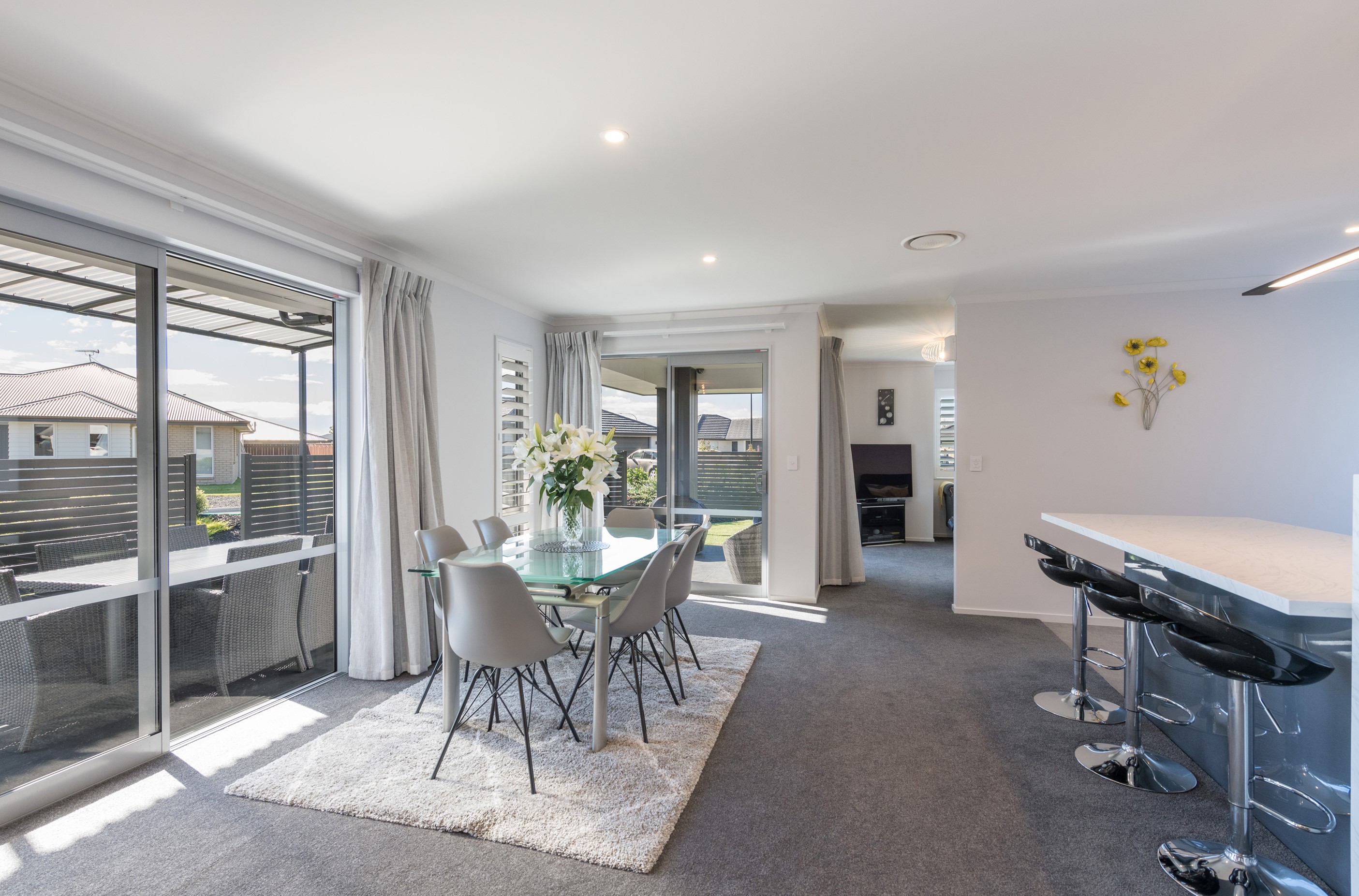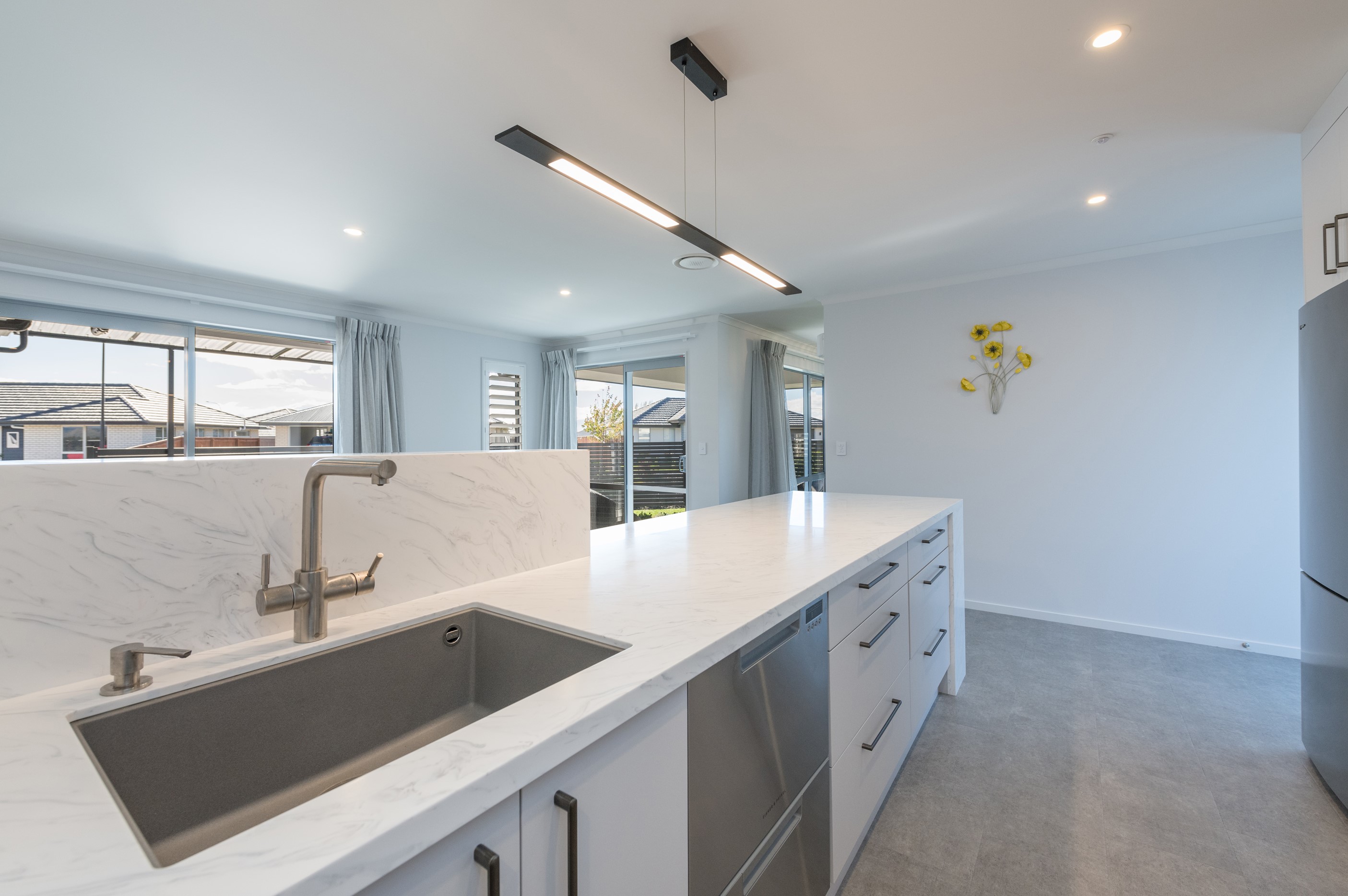 Designed for a retired couple, this single-level three-bedroom, two-bathroom home is exactly right for the owners’ lifestyle. It’s warm, sunny and open-plan. There’s plenty of room for vehicles, and even a space for a boat or campervan. And the maintenance? It’s a cinch, with powder-coated aluminium joinery, roof tiles and Linea weatherboards and plaster cladding on the exterior. The layout is ideal too. In the 186sqm floorplan you’ll find flowing living, dining and lounge spaces plus two sunny, covered alfresco areas, so sipping coffee outside is always an option. Screens provide privacy and shelter. The glossy kitchen is at the centre of everything and has a pantry and decent-sized breakfast bar – always a good place for visitors to gather or for chatting to the cook. Capturing the sun was also a major consideration in this build. The house is positioned to allow light to flood in and provide natural warmth. The main bedroom is a place of true relaxation, with a fresh, tiled ensuite and walk-in wardrobe. This home has plenty of storage options too – in the double garage and linen cupboard. In fact, it has it all.