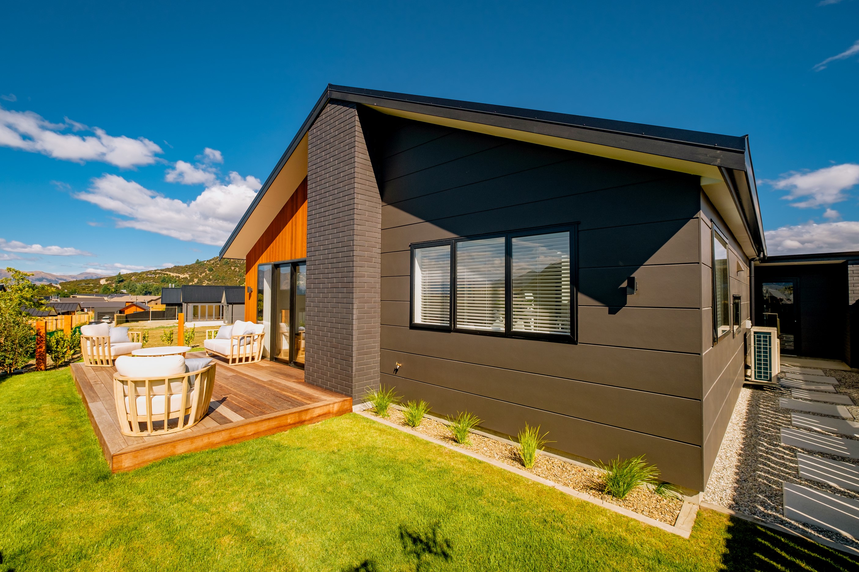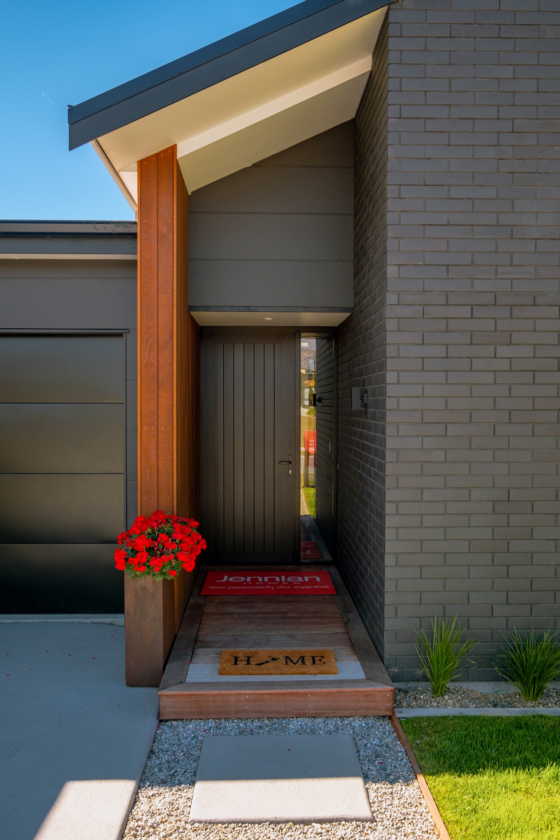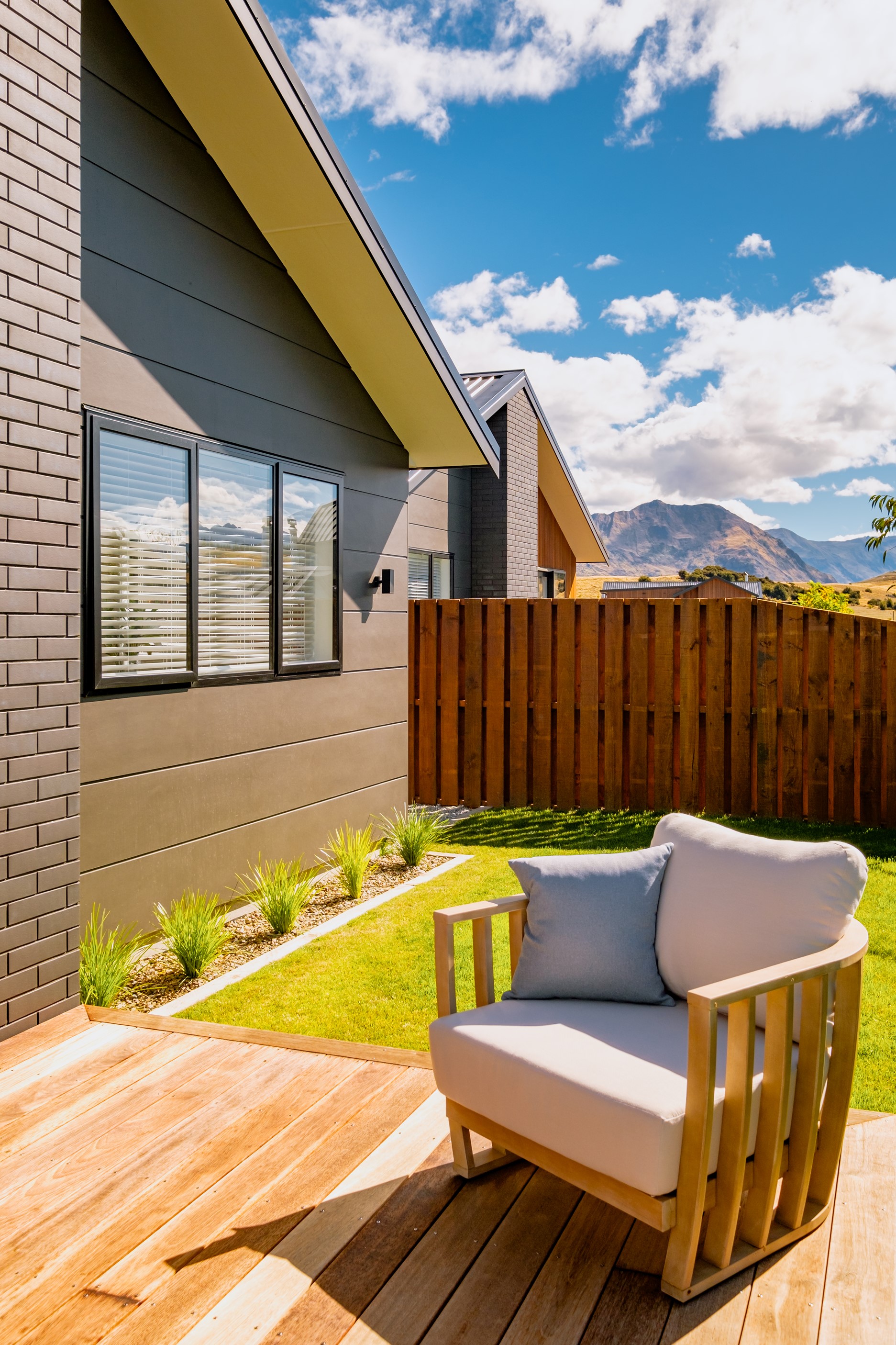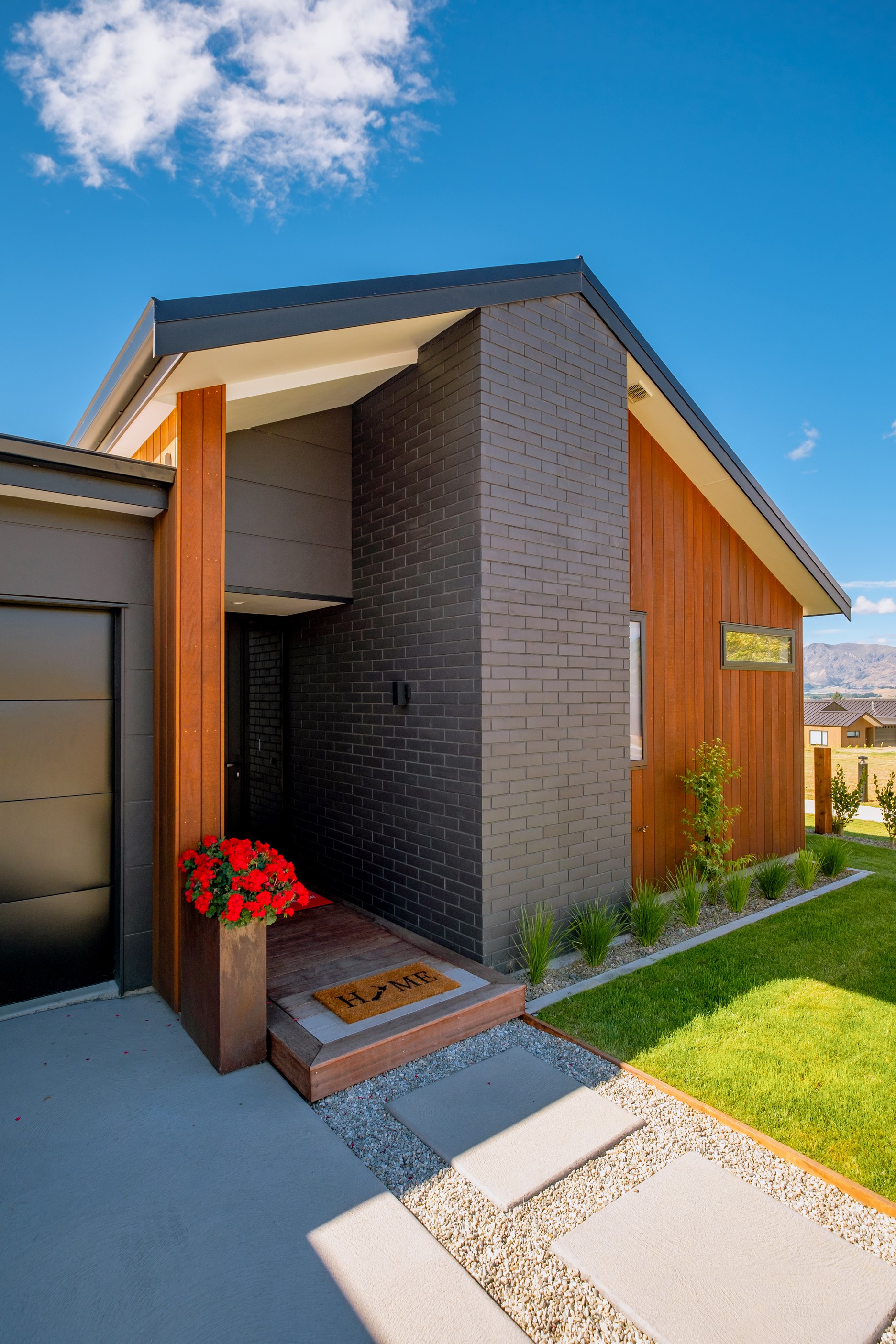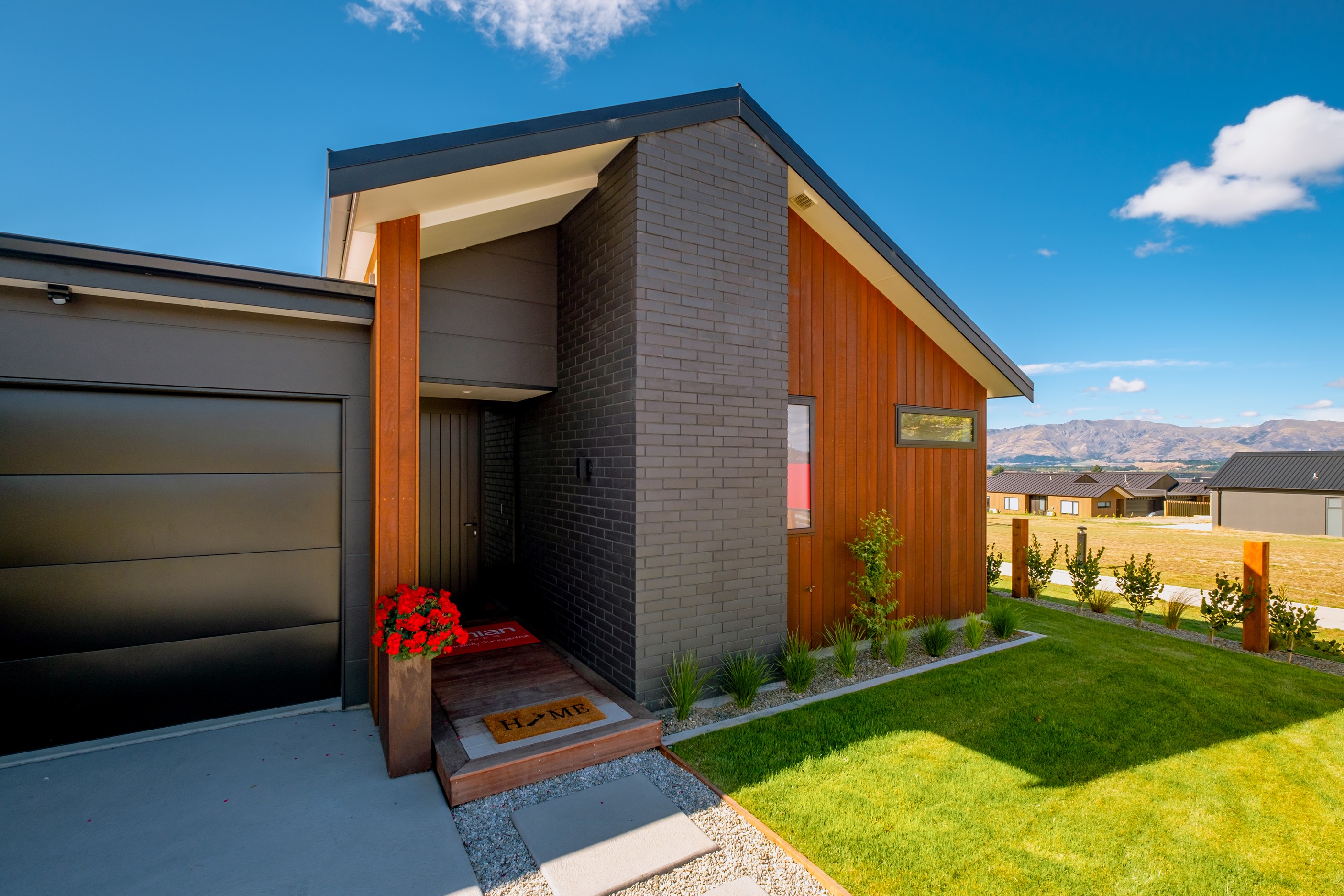 How do you build a duplex so that both homes make the most of the available vistas? You stagger them, just as the Jennian team has done on this elevated site. The satisfying outcome is that both three-bedroom, two-bathroom homes, joined at the garages, have views of the inspiring Central Otago landscape and sky. The builder’s favourite parts include hidden internal garage entry and full-height cavity sliders into the living areas with vaulted ceilings. Skylights allow natural light to fill the kitchens, bathrooms and hallways. The beautiful herringbone tiling behind the bath is among the features visitors comment on, as well as the generous storage in the hallway cupboards and garages. The ducted heating system ensures each room remains at the optimum temperature all-year around. Another plus of the properties: they showcase the range and diversity of builds with Jennian Homes, the suppliers and the products available. The brick and cedar entries and hallways – sure to make a lasting impression – are fine examples of attention to detail and showcase what can be achieved by bringing the outdoors in.