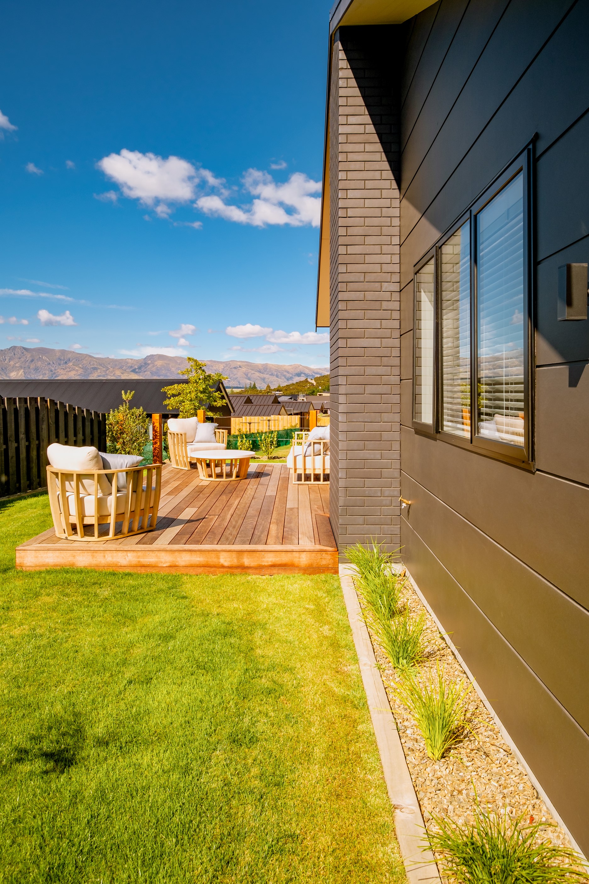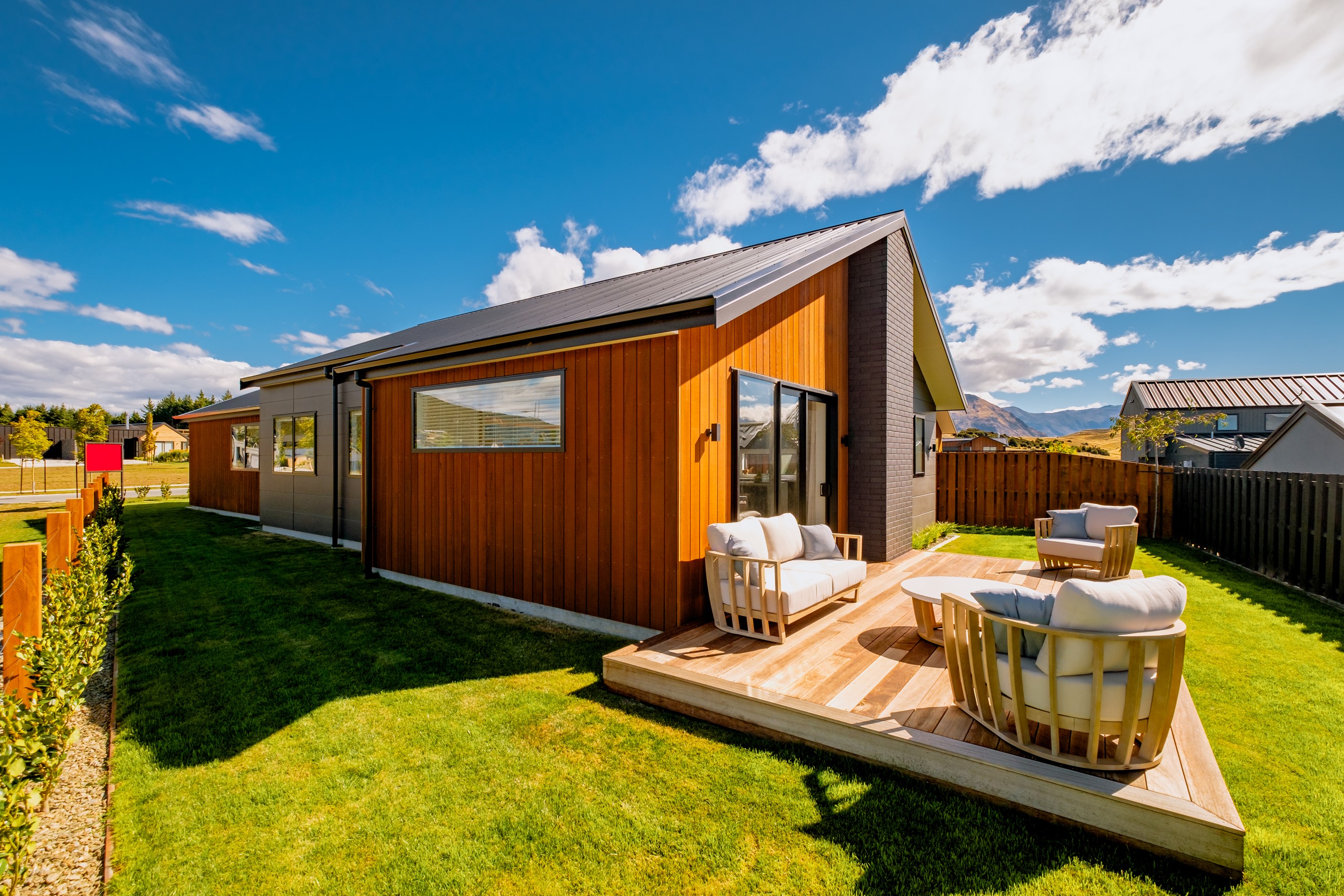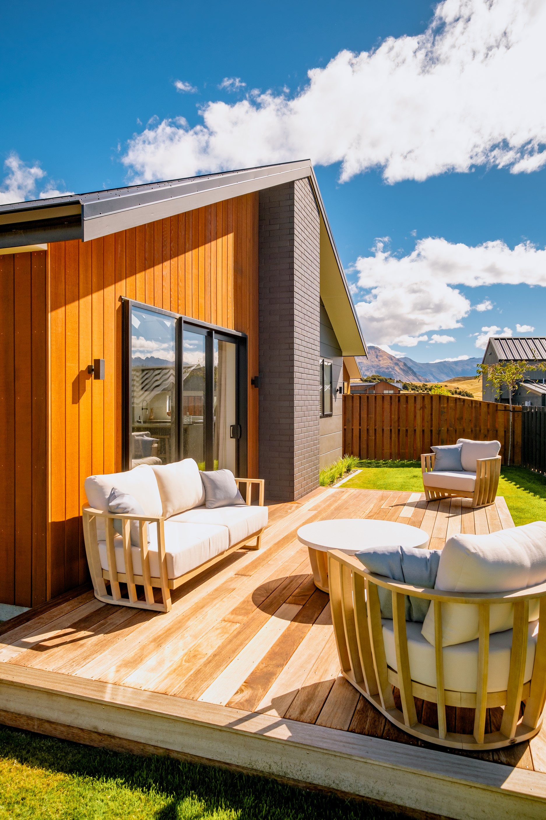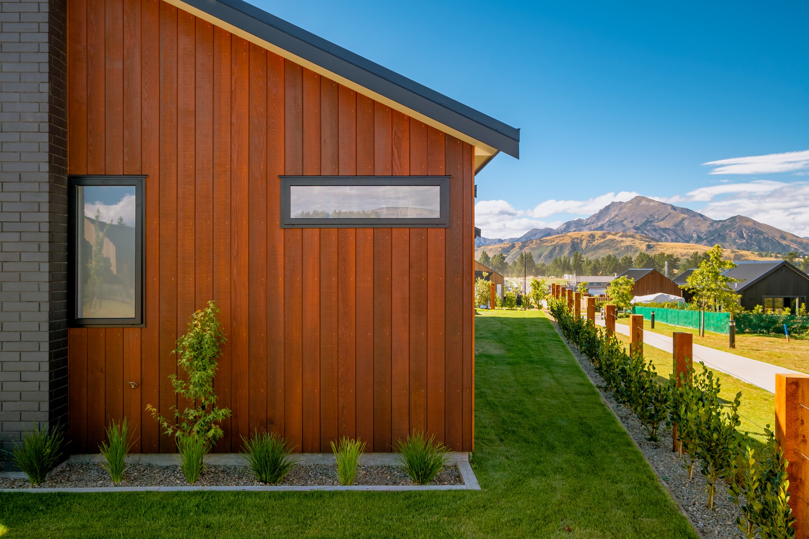 How do you build a duplex so that both homes make the most of the available vistas? You stagger them, just as the Jennian team has done on this elevated site. The satisfying outcome is that both three-bedroom, two-bathroom homes, joined at the garages, have views of the inspiring Central Otago landscape and sky. The builder’s favourite parts include hidden internal garage entry and full-height cavity sliders into the living areas with vaulted ceilings. Skylights allow natural light to fill the kitchens, bathrooms and hallways. The beautiful herringbone tiling behind the bath is among the features visitors comment on, as well as the generous storage in the hallway cupboards and garages. The ducted heating system ensures each room remains at the optimum temperature all-year around. Another plus of the properties: they showcase the range and diversity of builds with Jennian Homes, the suppliers and the products available. The brick and cedar entries and hallways – sure to make a lasting impression – are fine examples of attention to detail and showcase what can be achieved by bringing the outdoors in.