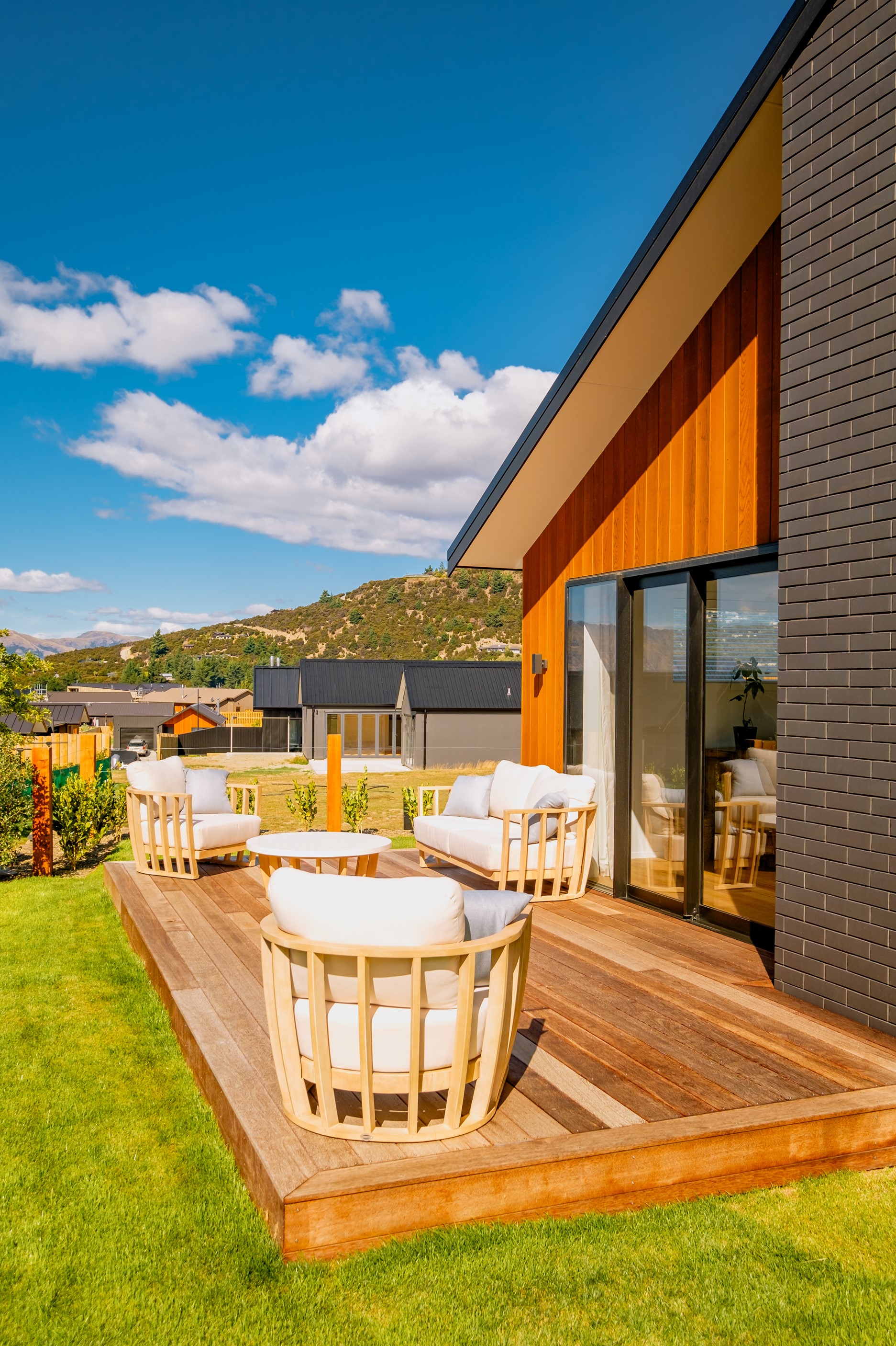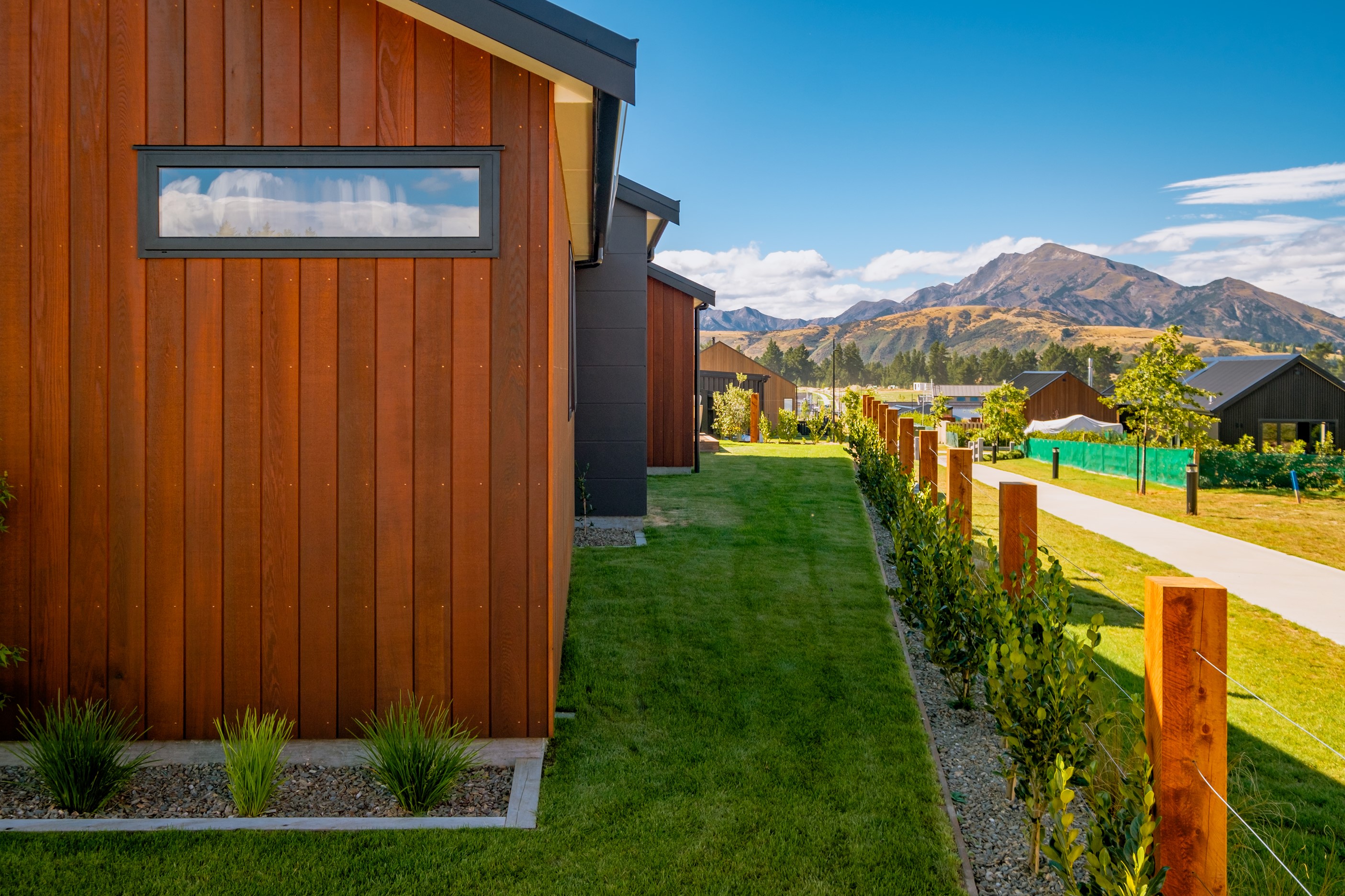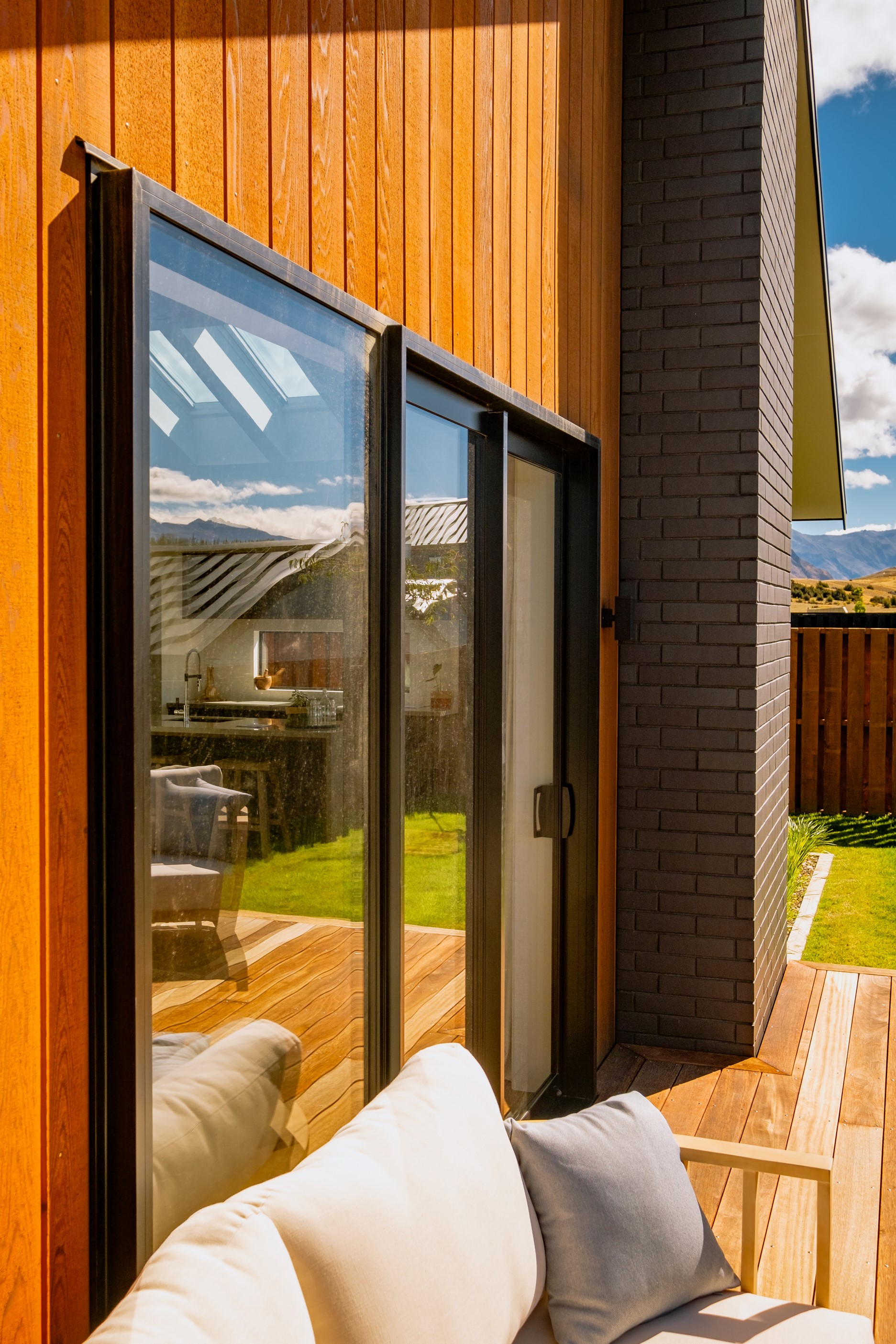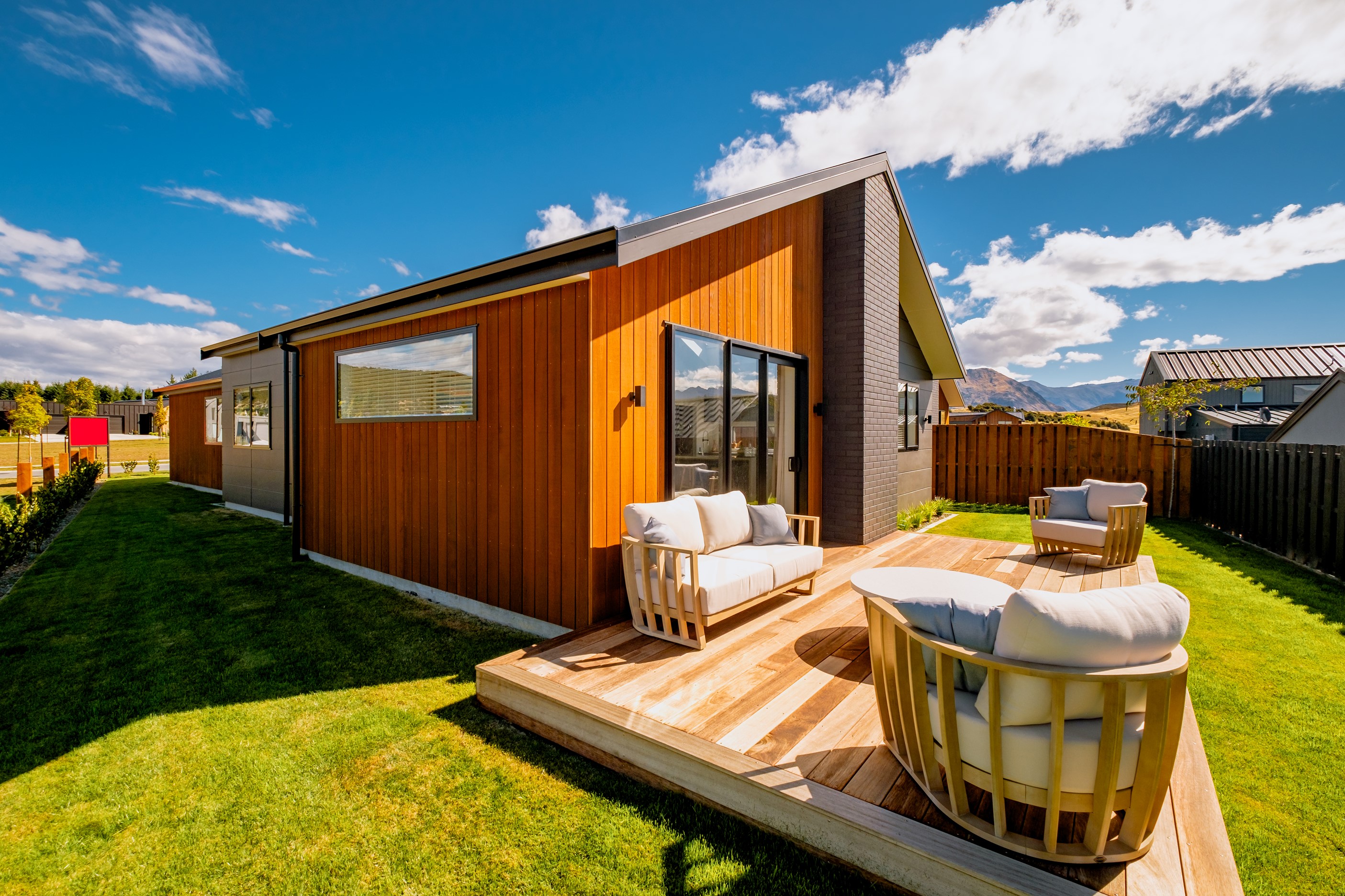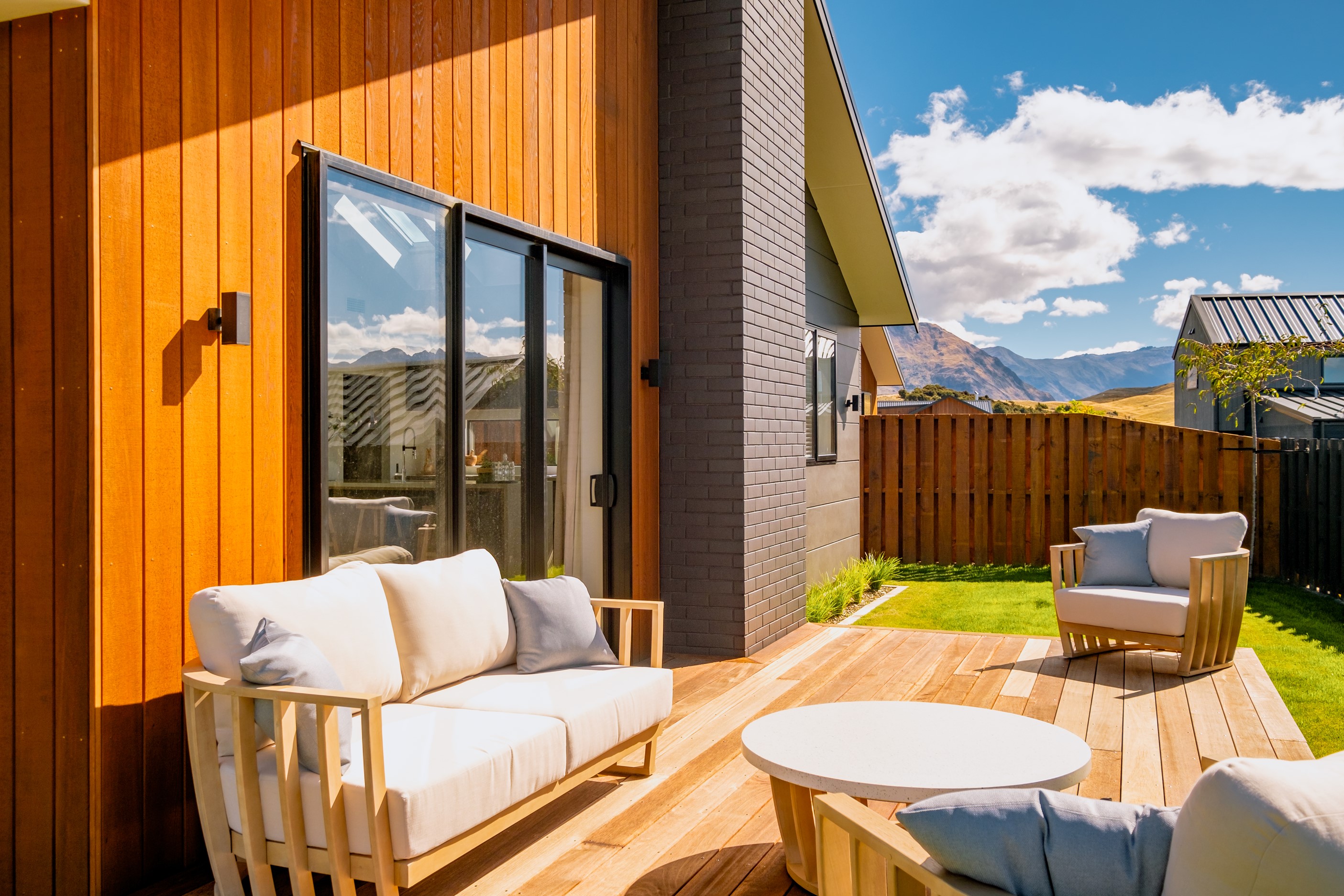 How do you build a duplex so that both homes make the most of the available vistas? You stagger them, just as the Jennian team has done on this elevated site. The satisfying outcome is that both three-bedroom, two-bathroom homes, joined at the garages, have views of the inspiring Central Otago landscape and sky. The builder’s favourite parts include hidden internal garage entry and full-height cavity sliders into the living areas with vaulted ceilings. Skylights allow natural light to fill the kitchens, bathrooms and hallways. The beautiful herringbone tiling behind the bath is among the features visitors comment on, as well as the generous storage in the hallway cupboards and garages. The ducted heating system ensures each room remains at the optimum temperature all-year around. Another plus of the properties: they showcase the range and diversity of builds with Jennian Homes, the suppliers and the products available. The brick and cedar entries and hallways – sure to make a lasting impression – are fine examples of attention to detail and showcase what can be achieved by bringing the outdoors in.