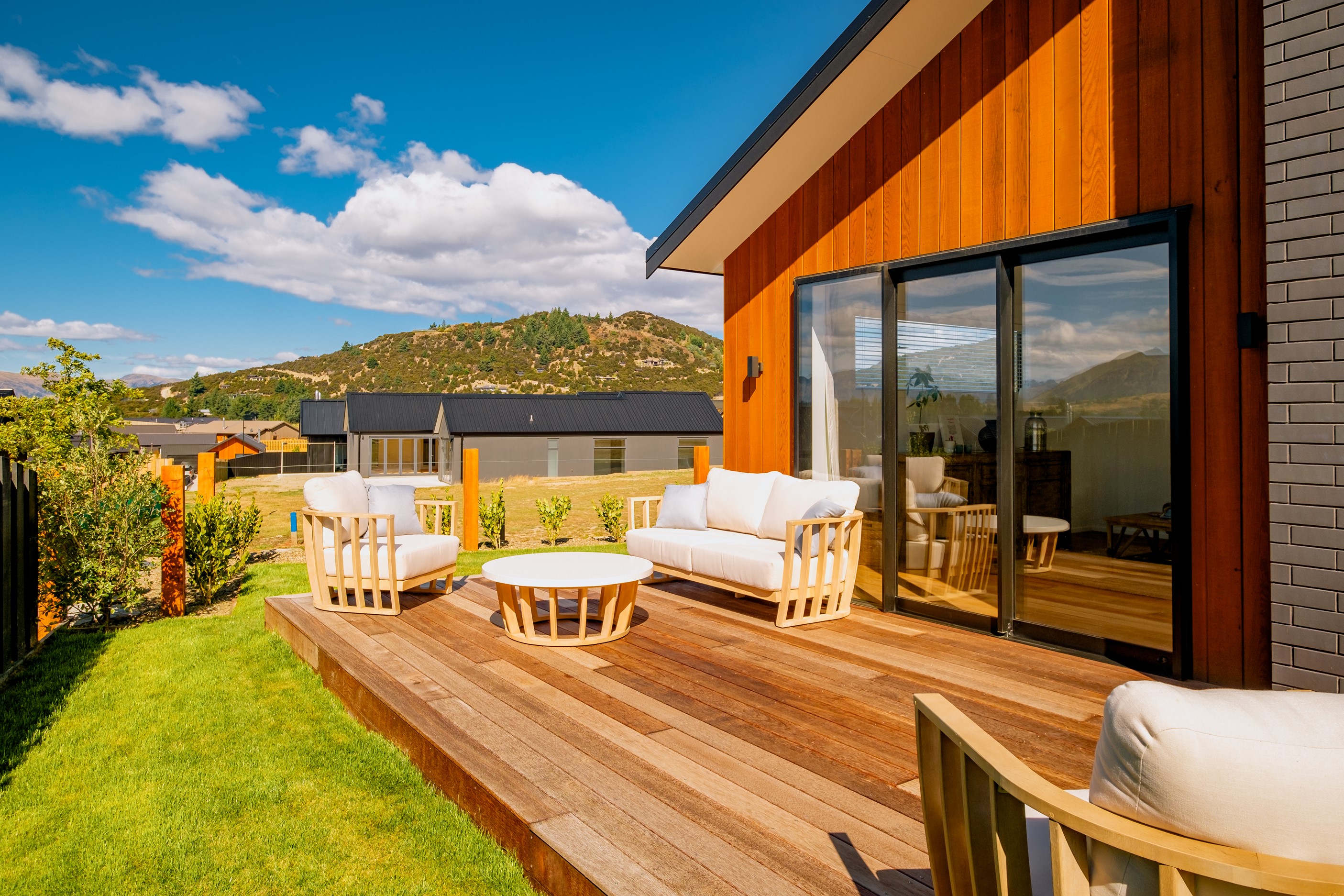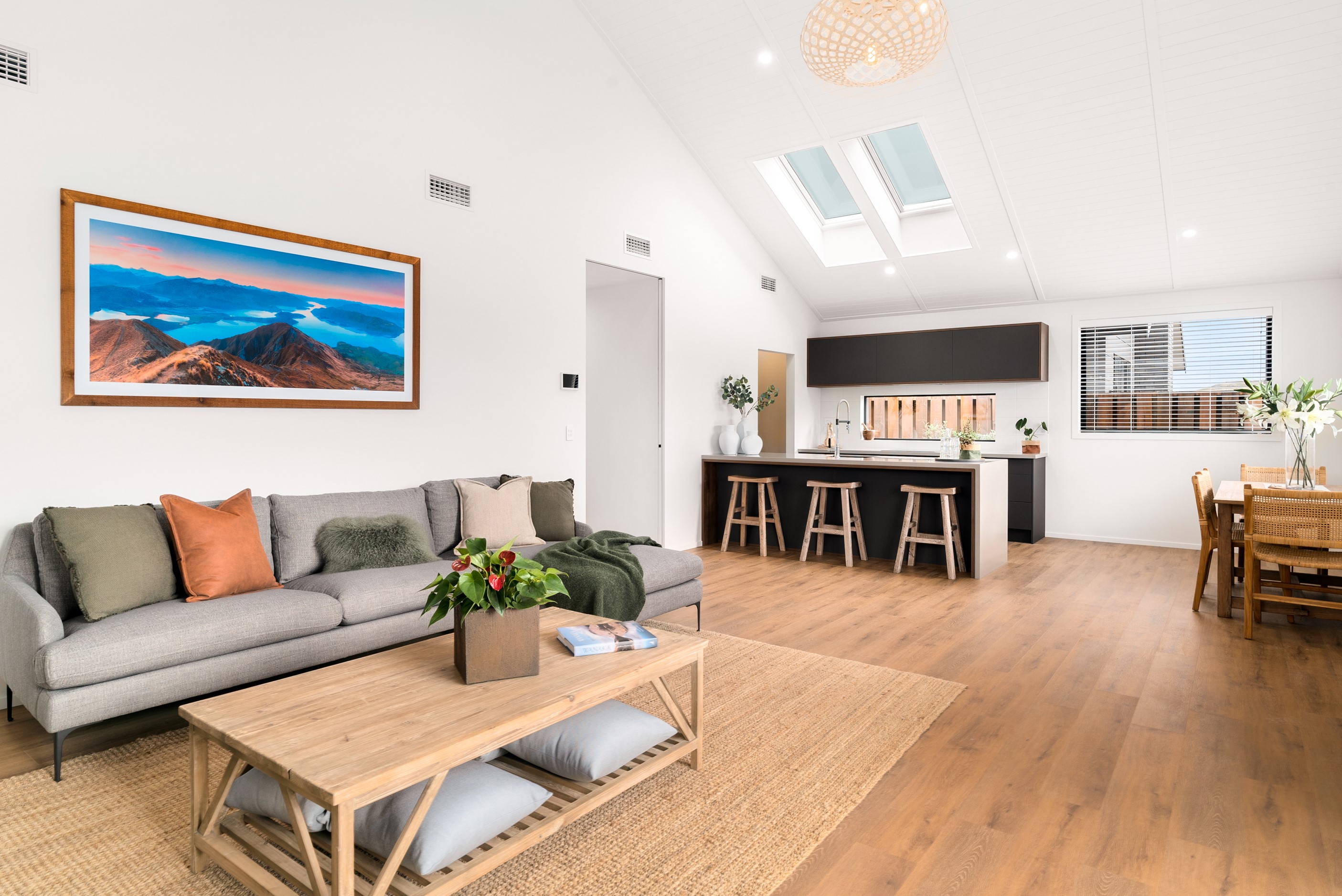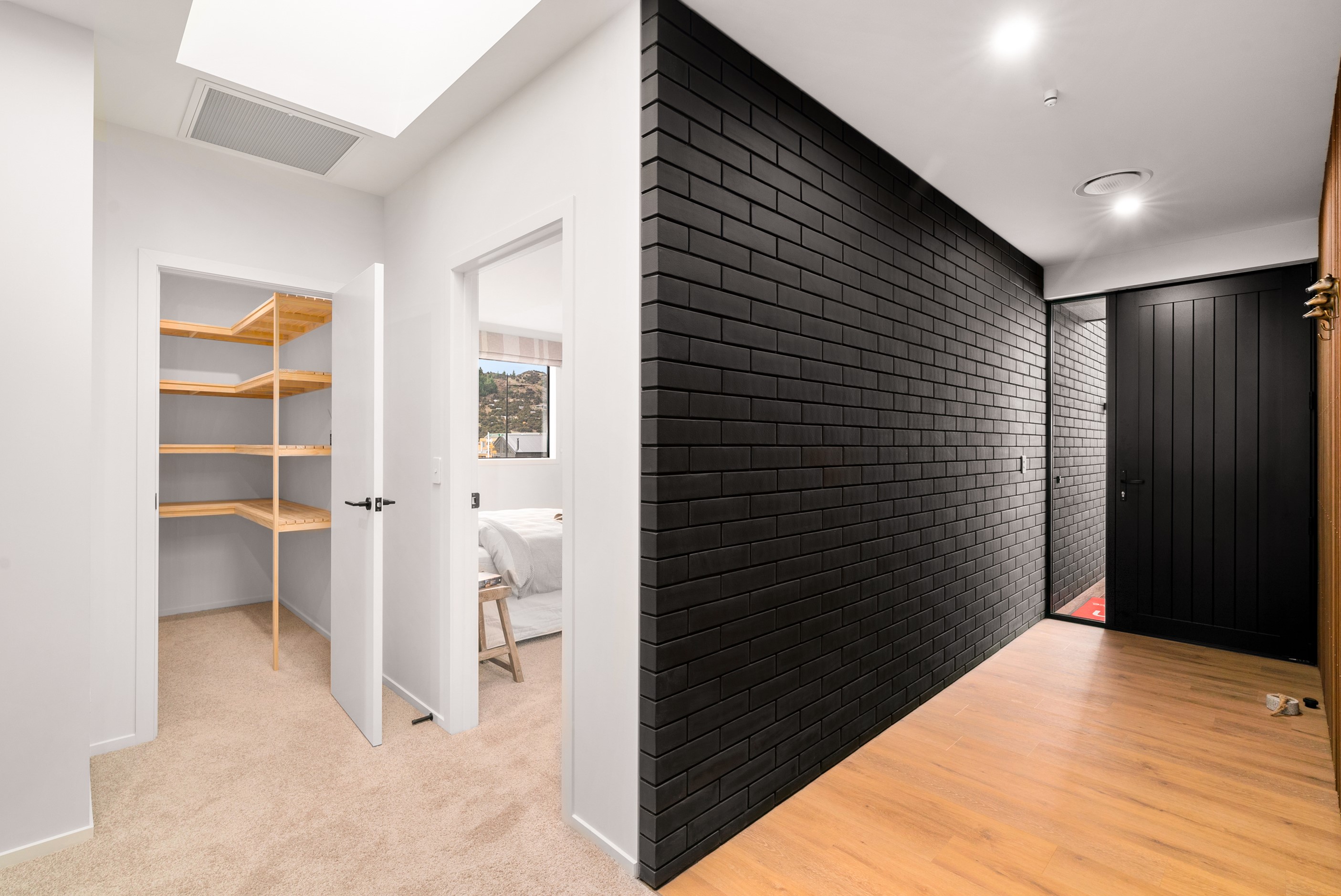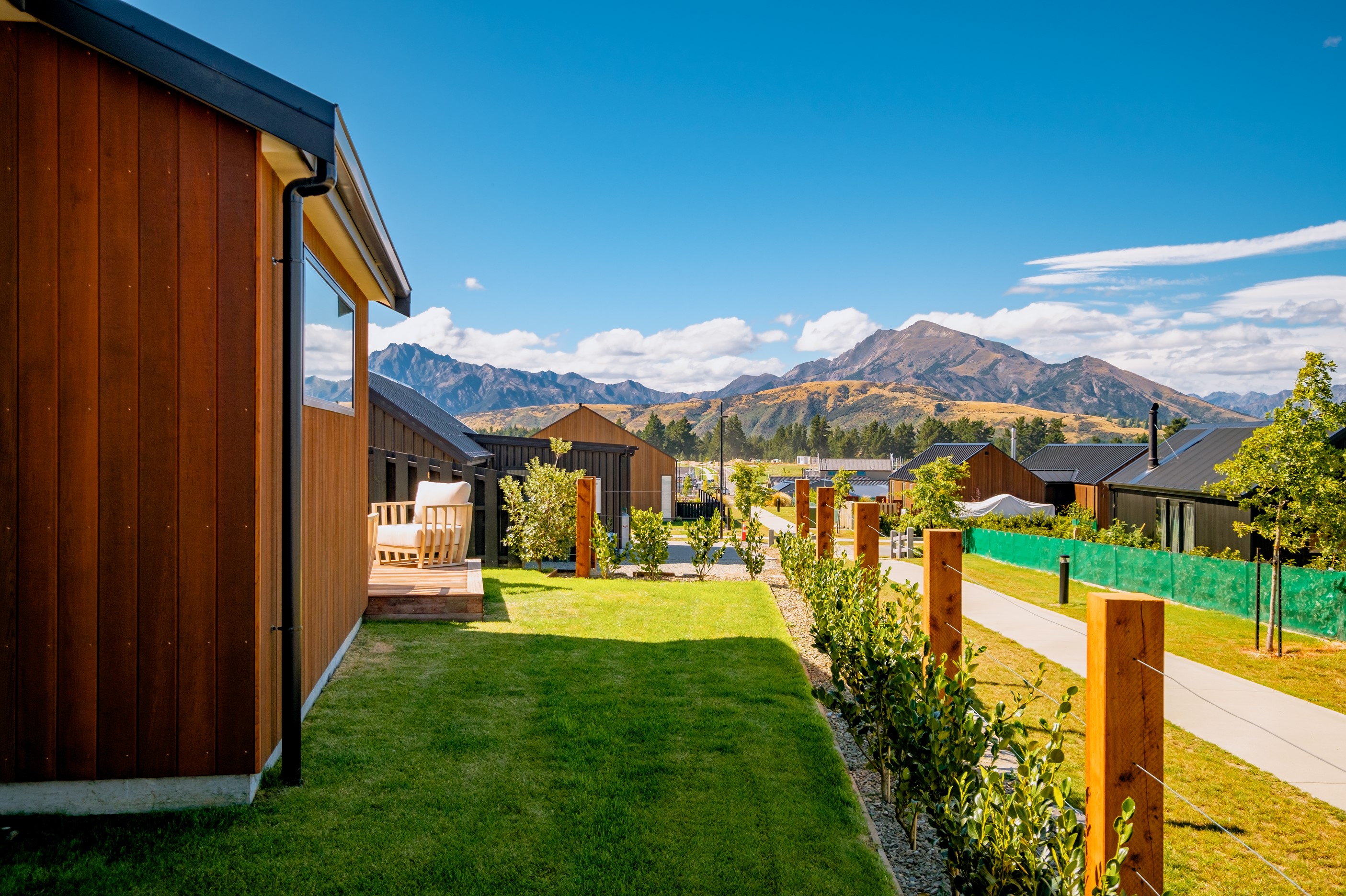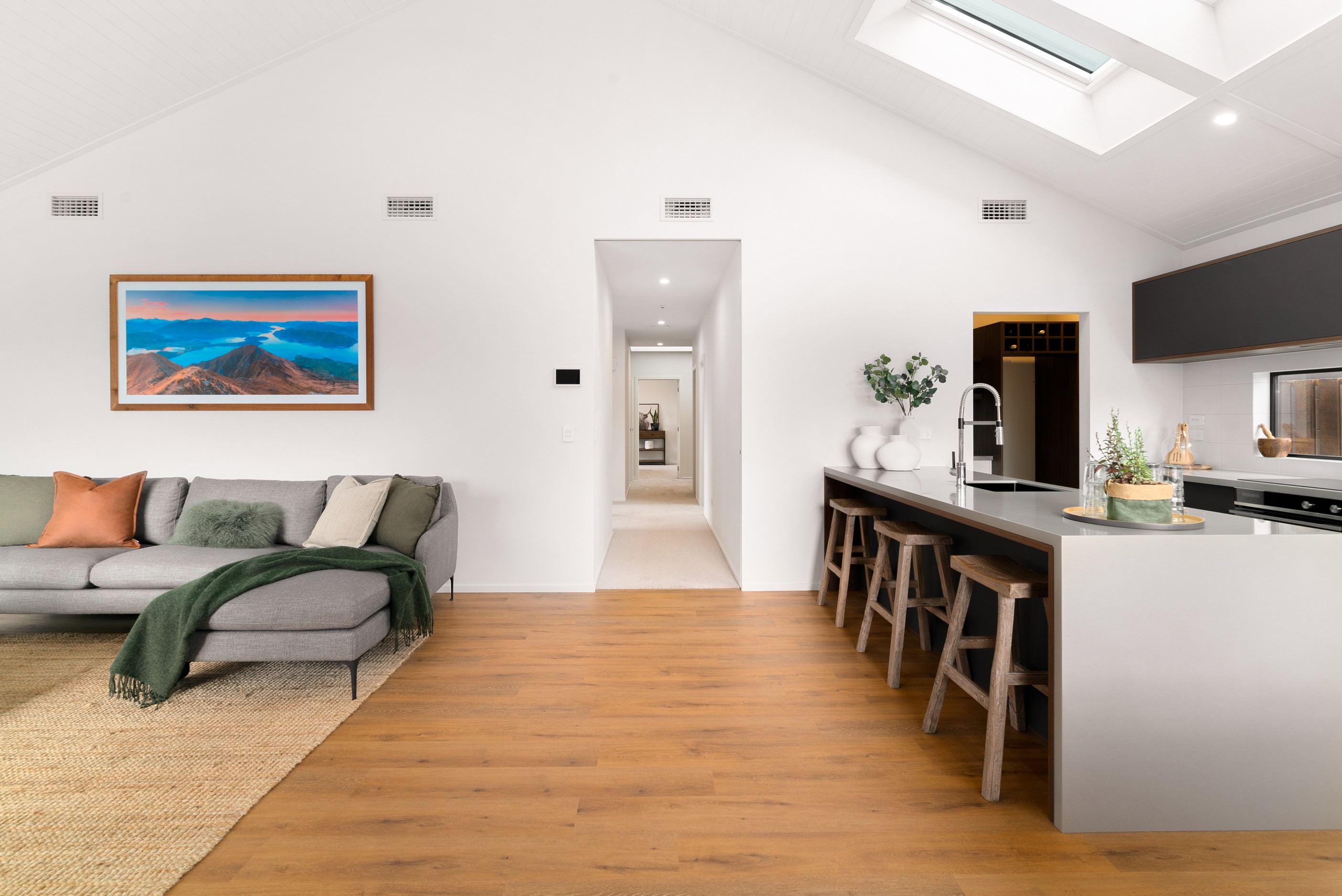How do you build a duplex so that both homes make the most of the available vistas? You stagger them, just as the Jennian team has done on this elevated site. The satisfying outcome is that both three-bedroom, two-bathroom homes, joined at the garages, have views of the inspiring Central Otago landscape and sky. The builder’s favourite parts include hidden internal garage entry and full-height cavity sliders into the living areas with vaulted ceilings. Skylights allow natural light to fill the kitchens, bathrooms and hallways. The beautiful herringbone tiling behind the bath is among the features visitors comment on, as well as the generous storage in the hallway cupboards and garages. The ducted heating system ensures each room remains at the optimum temperature all-year around. Another plus of the properties: they showcase the range and diversity of builds with Jennian Homes, the suppliers and the products available. The brick and cedar entries and hallways – sure to make a lasting impression – are fine examples of attention to detail and showcase what can be achieved by bringing the outdoors in.