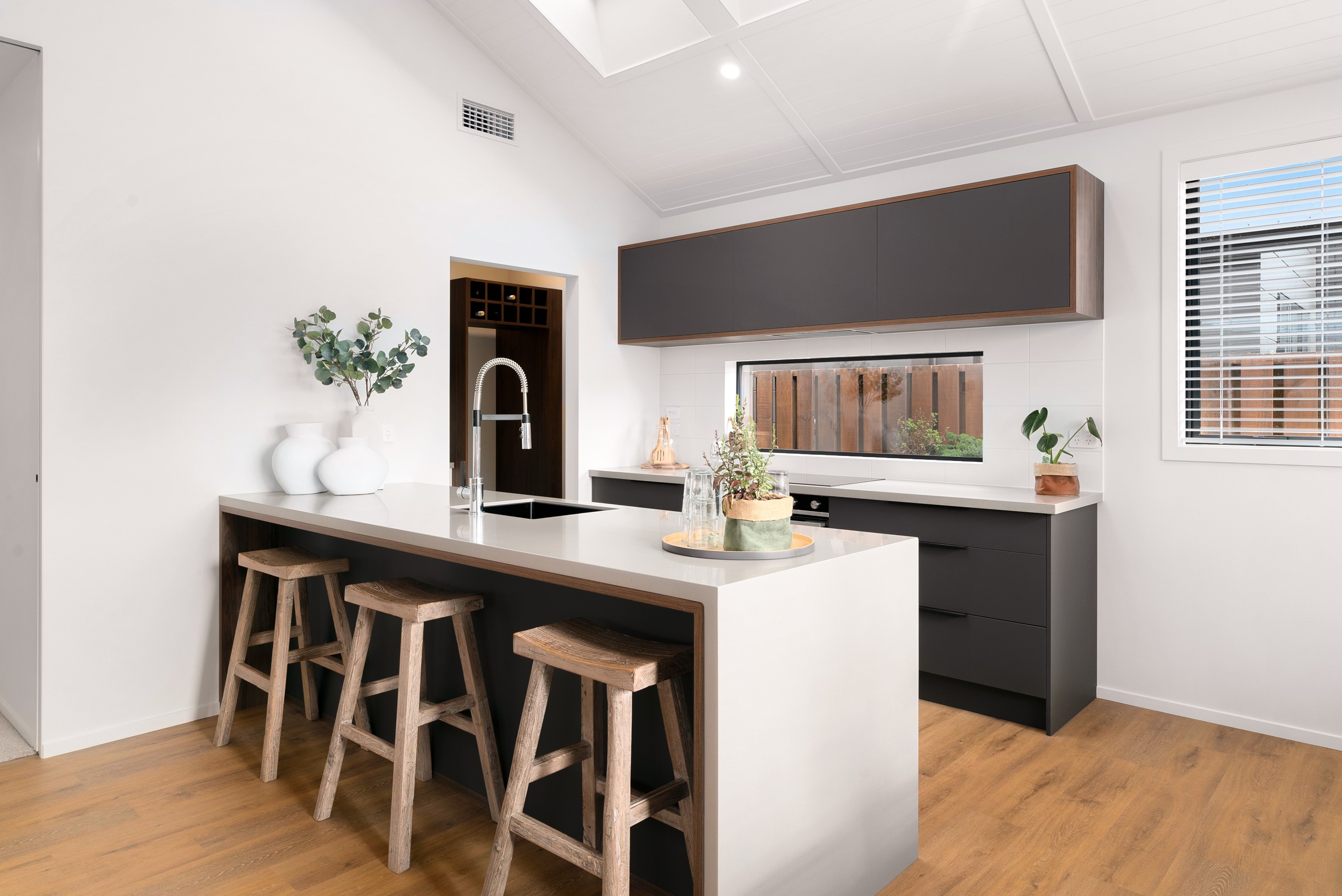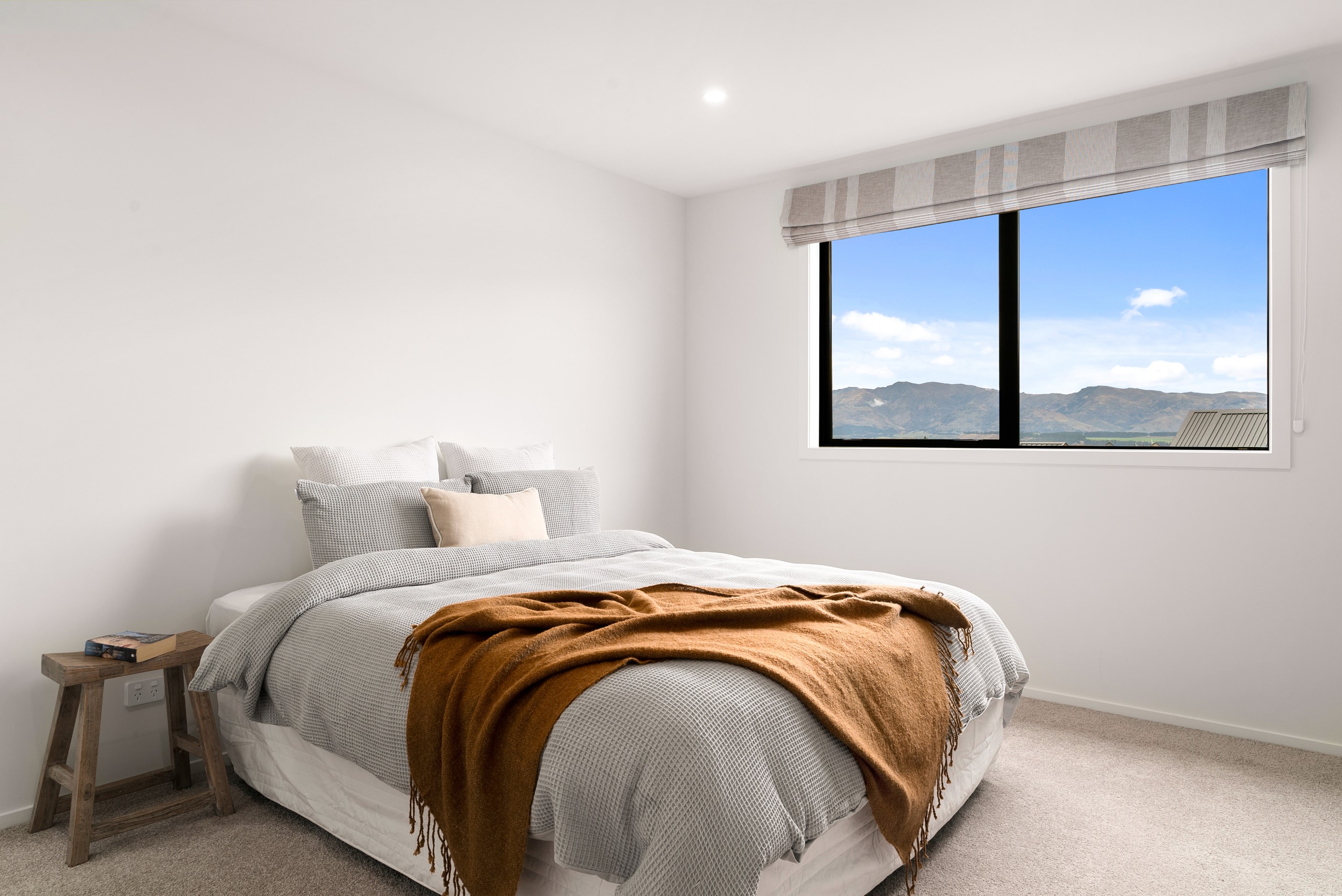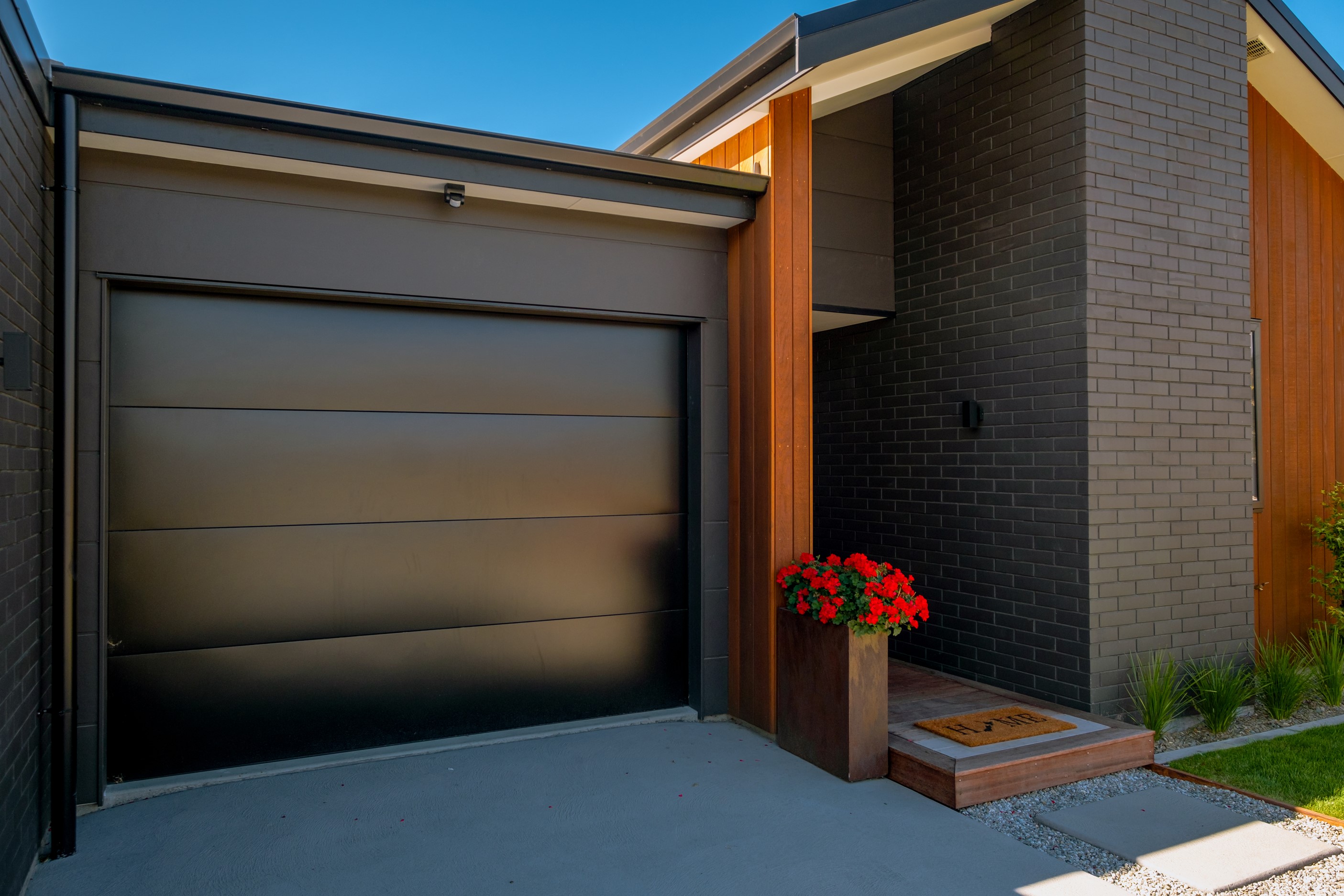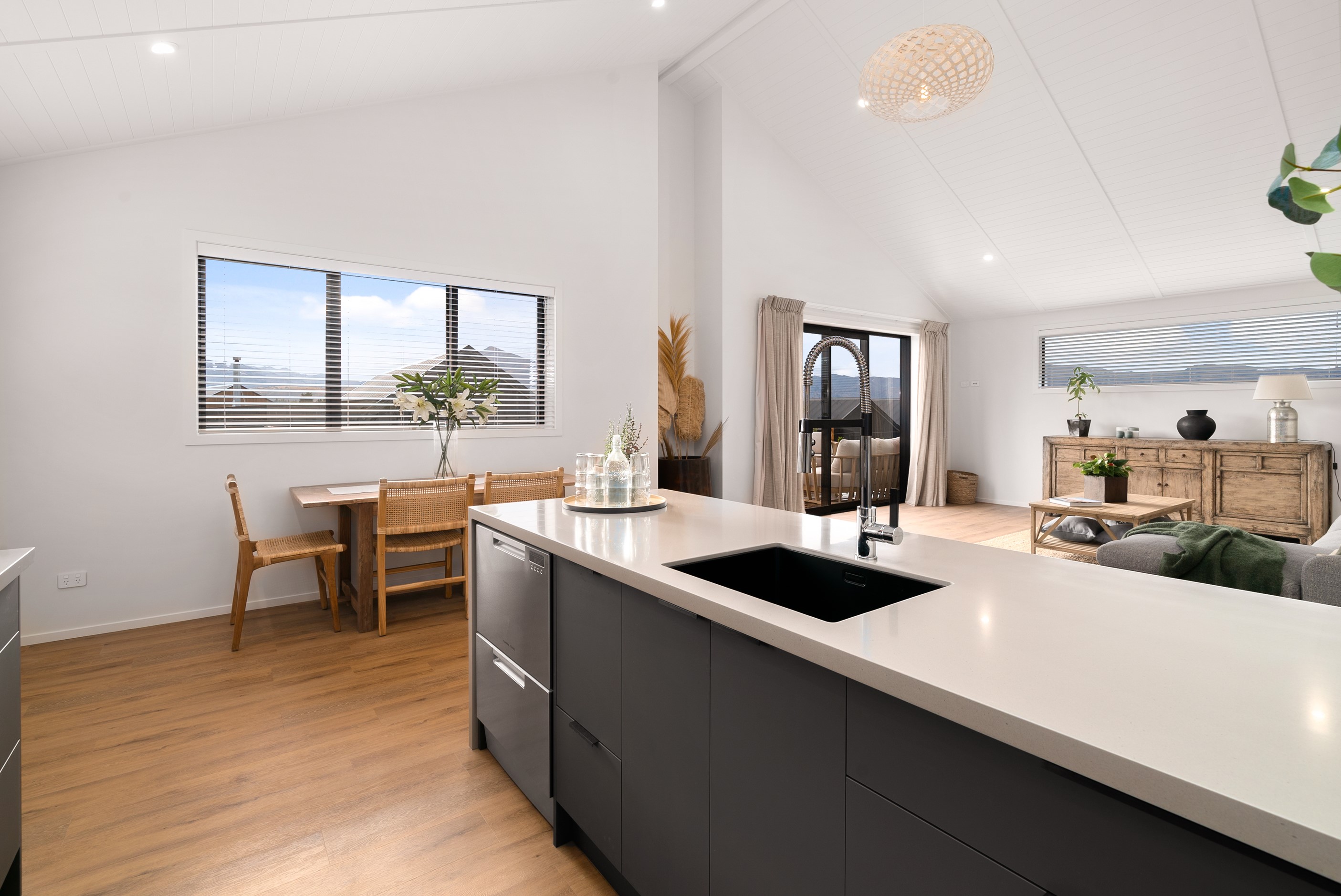 How do you build a duplex so that both homes make the most of the available vistas? You stagger them, just as the Jennian team has done on this elevated site. The satisfying outcome is that both three-bedroom, two-bathroom homes, joined at the garages, have views of the inspiring Central Otago landscape and sky. The builder’s favourite parts include hidden internal garage entry and full-height cavity sliders into the living areas with vaulted ceilings. Skylights allow natural light to fill the kitchens, bathrooms and hallways. The beautiful herringbone tiling behind the bath is among the features visitors comment on, as well as the generous storage in the hallway cupboards and garages. The ducted heating system ensures each room remains at the optimum temperature all-year around. Another plus of the properties: they showcase the range and diversity of builds with Jennian Homes, the suppliers and the products available. The brick and cedar entries and hallways – sure to make a lasting impression – are fine examples of attention to detail and showcase what can be achieved by bringing the outdoors in.