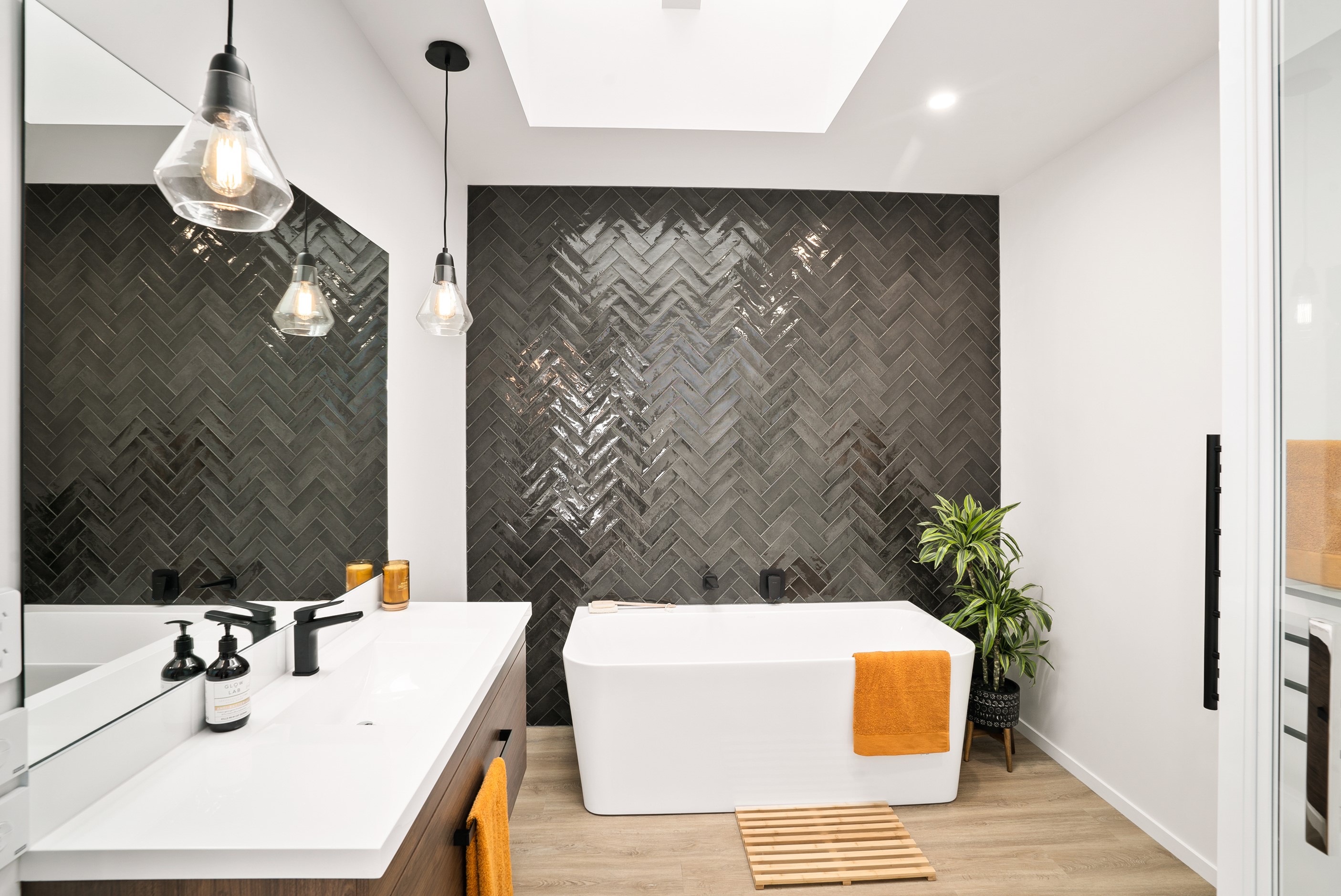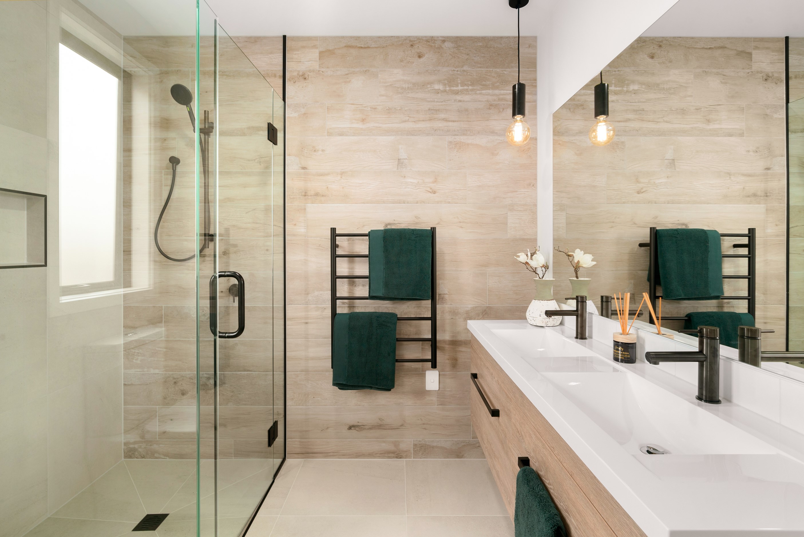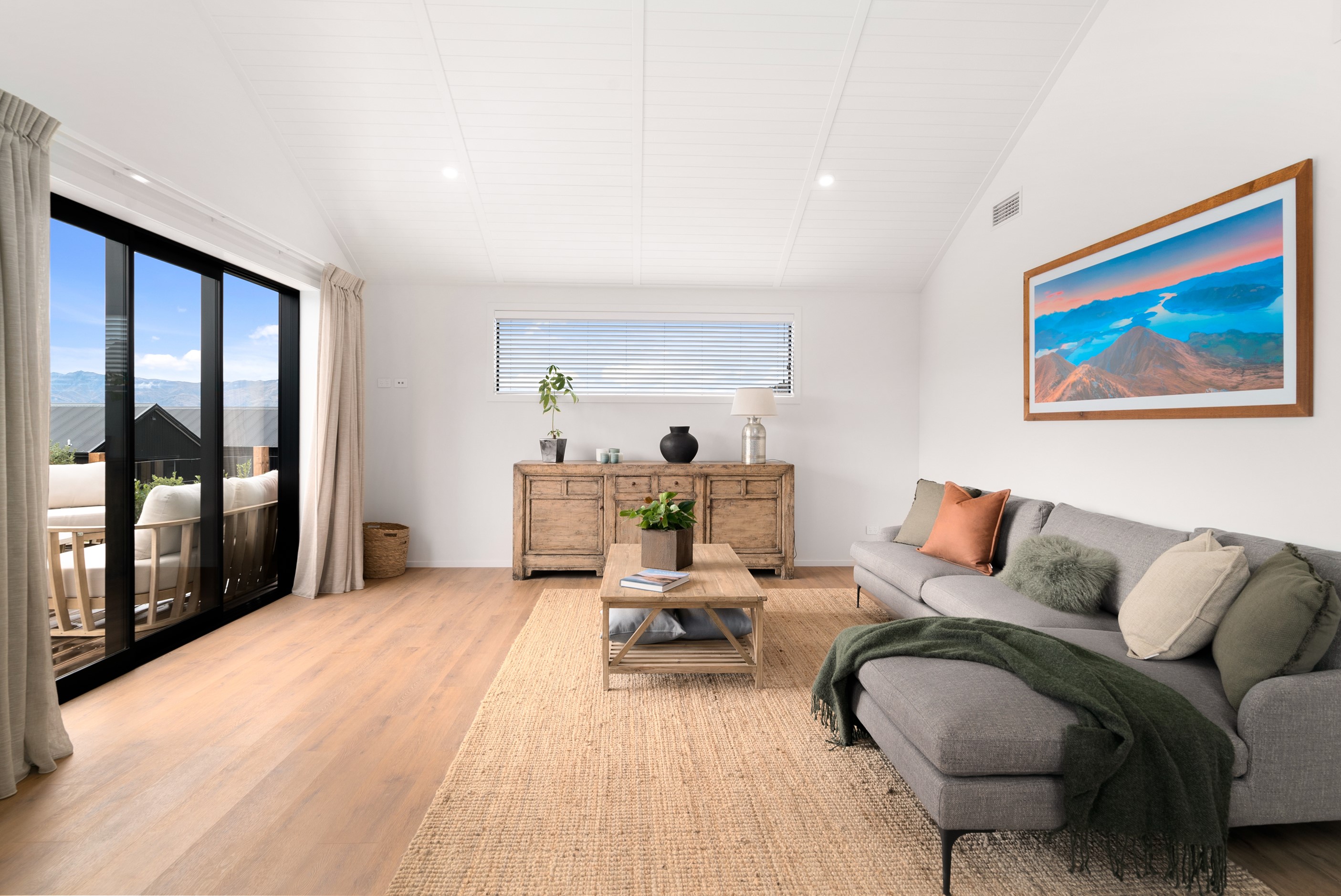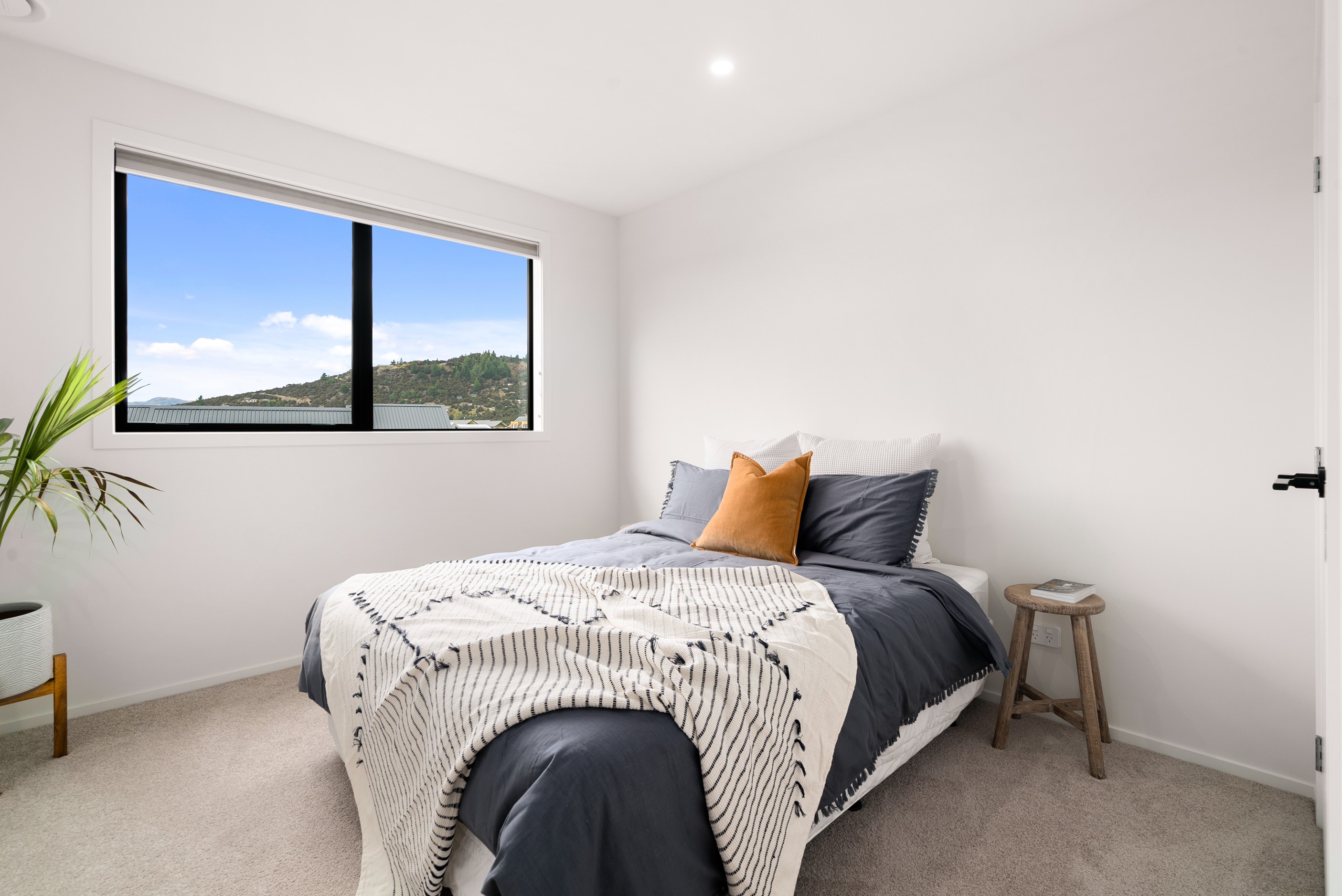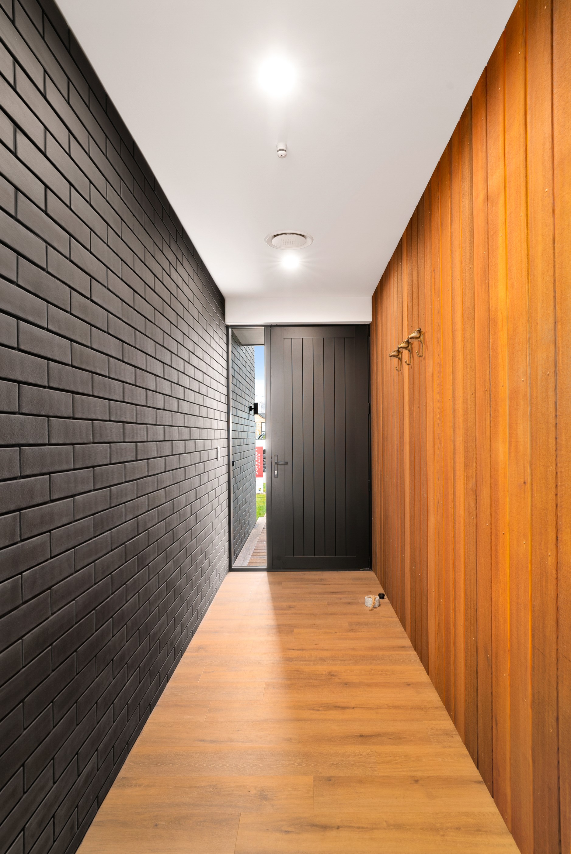 How do you build a duplex so that both homes make the most of the available vistas? You stagger them, just as the Jennian team has done on this elevated site. The satisfying outcome is that both three-bedroom, two-bathroom homes, joined at the garages, have views of the inspiring Central Otago landscape and sky. The builder’s favourite parts include hidden internal garage entry and full-height cavity sliders into the living areas with vaulted ceilings. Skylights allow natural light to fill the kitchens, bathrooms and hallways. The beautiful herringbone tiling behind the bath is among the features visitors comment on, as well as the generous storage in the hallway cupboards and garages. The ducted heating system ensures each room remains at the optimum temperature all-year around. Another plus of the properties: they showcase the range and diversity of builds with Jennian Homes, the suppliers and the products available. The brick and cedar entries and hallways – sure to make a lasting impression – are fine examples of attention to detail and showcase what can be achieved by bringing the outdoors in.