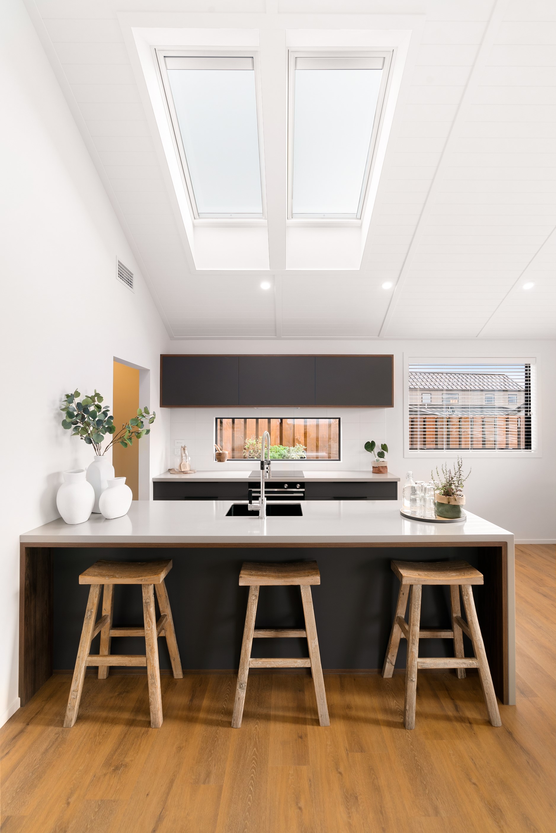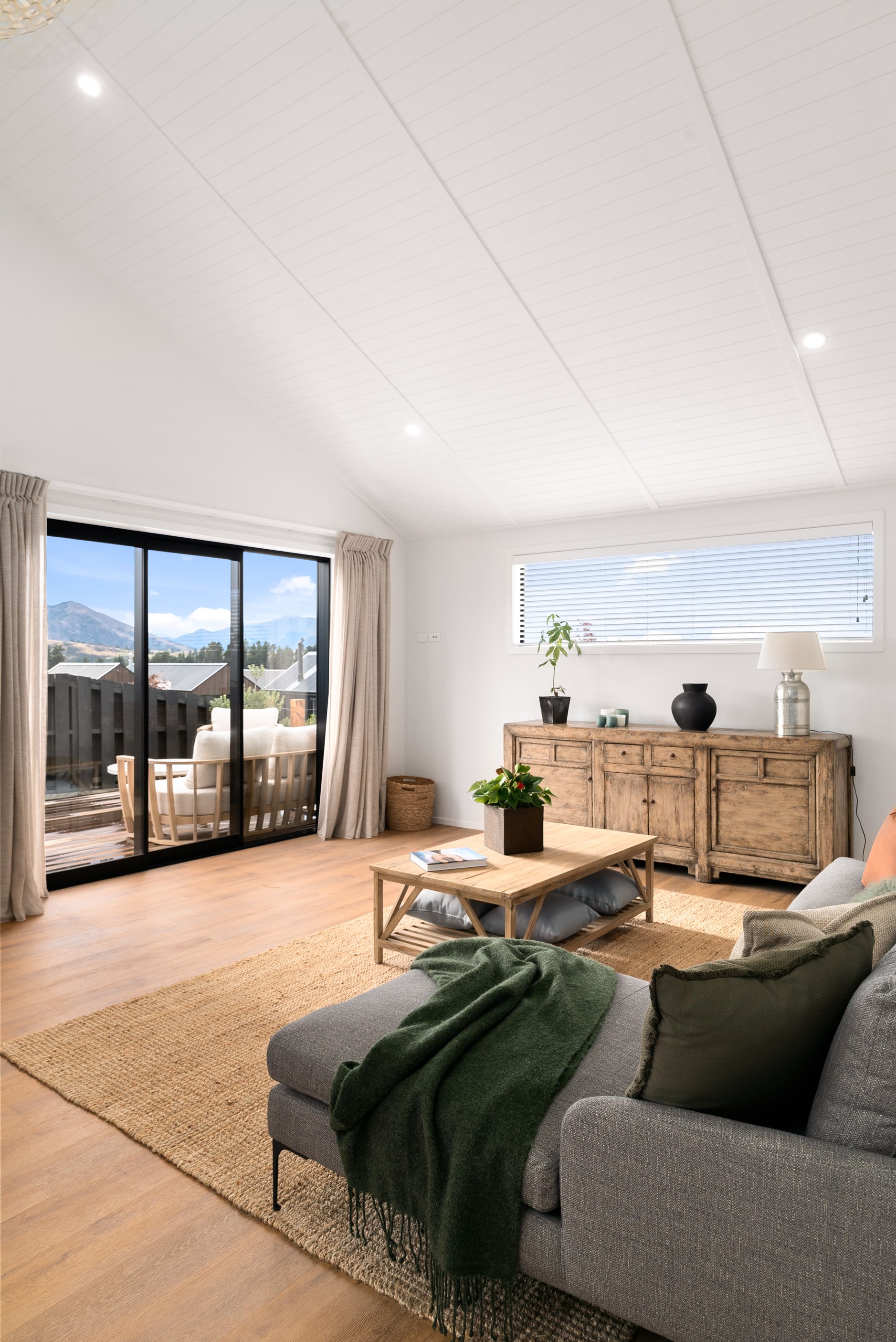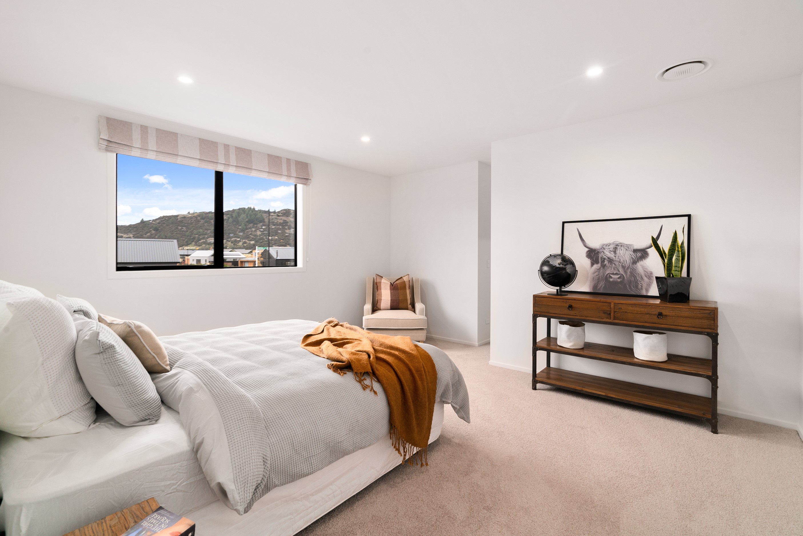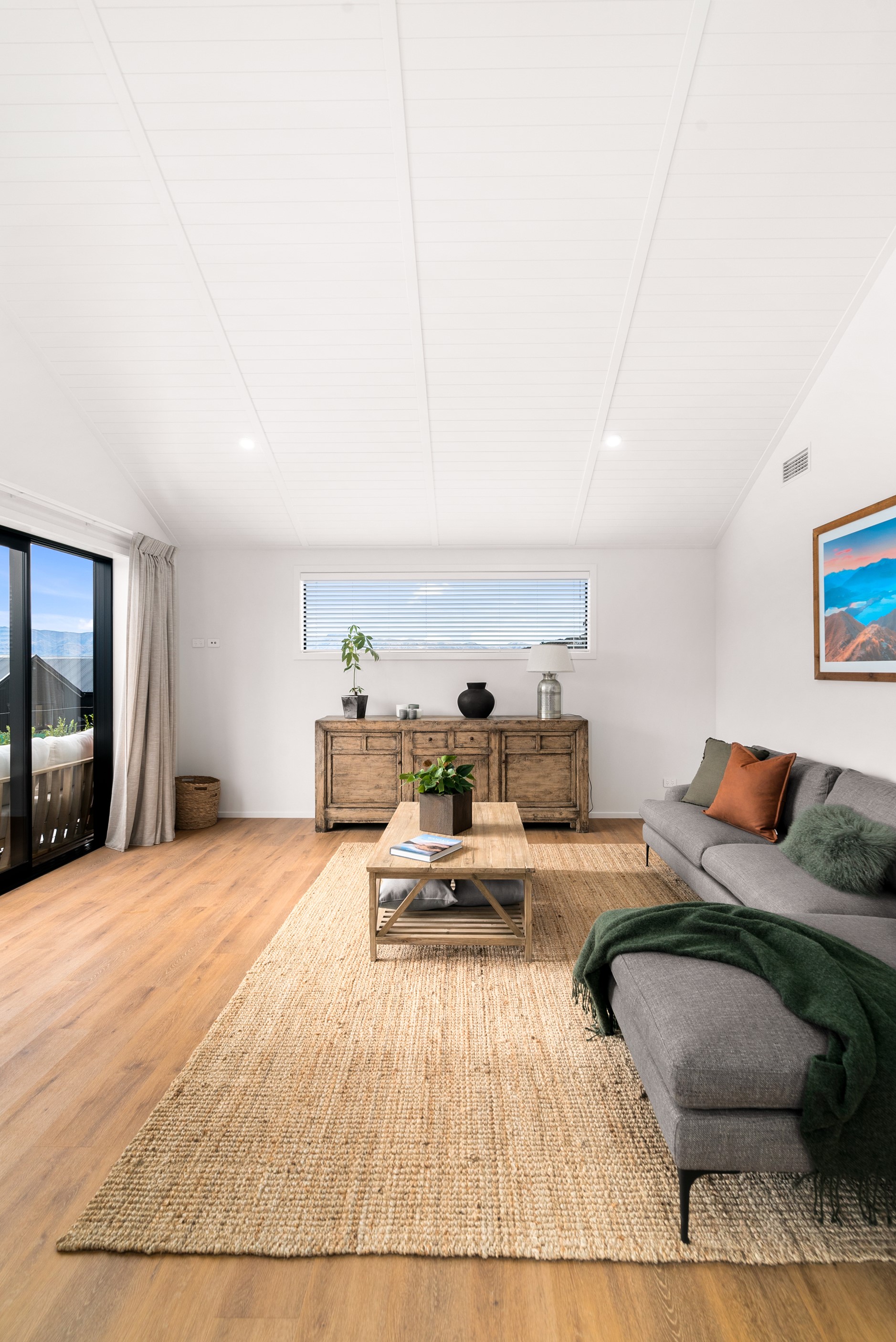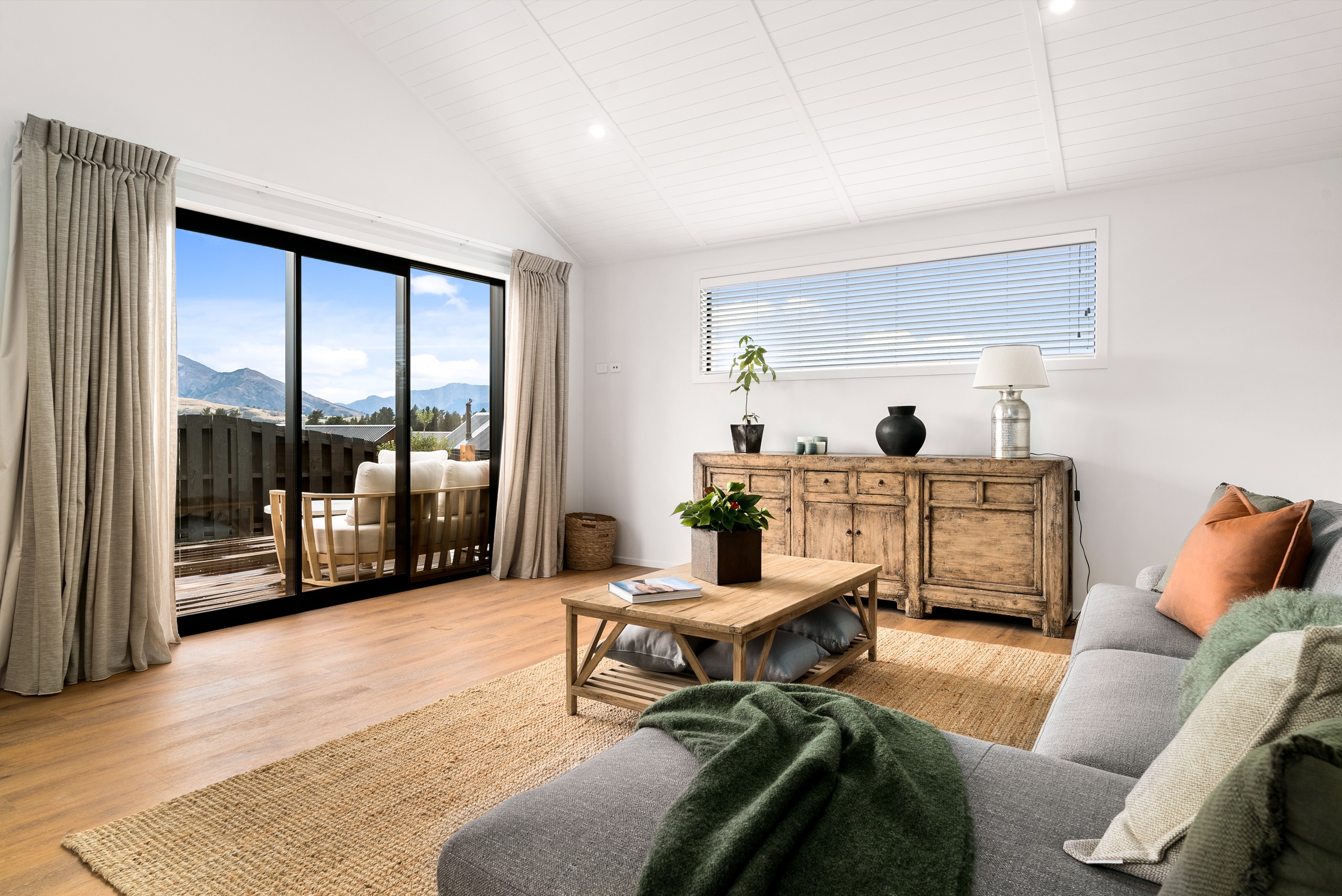 How do you build a duplex so that both homes make the most of the available vistas? You stagger them, just as the Jennian team has done on this elevated site. The satisfying outcome is that both three-bedroom, two-bathroom homes, joined at the garages, have views of the inspiring Central Otago landscape and sky. The builder’s favourite parts include hidden internal garage entry and full-height cavity sliders into the living areas with vaulted ceilings. Skylights allow natural light to fill the kitchens, bathrooms and hallways. The beautiful herringbone tiling behind the bath is among the features visitors comment on, as well as the generous storage in the hallway cupboards and garages. The ducted heating system ensures each room remains at the optimum temperature all-year around. Another plus of the properties: they showcase the range and diversity of builds with Jennian Homes, the suppliers and the products available. The brick and cedar entries and hallways – sure to make a lasting impression – are fine examples of attention to detail and showcase what can be achieved by bringing the outdoors in.
