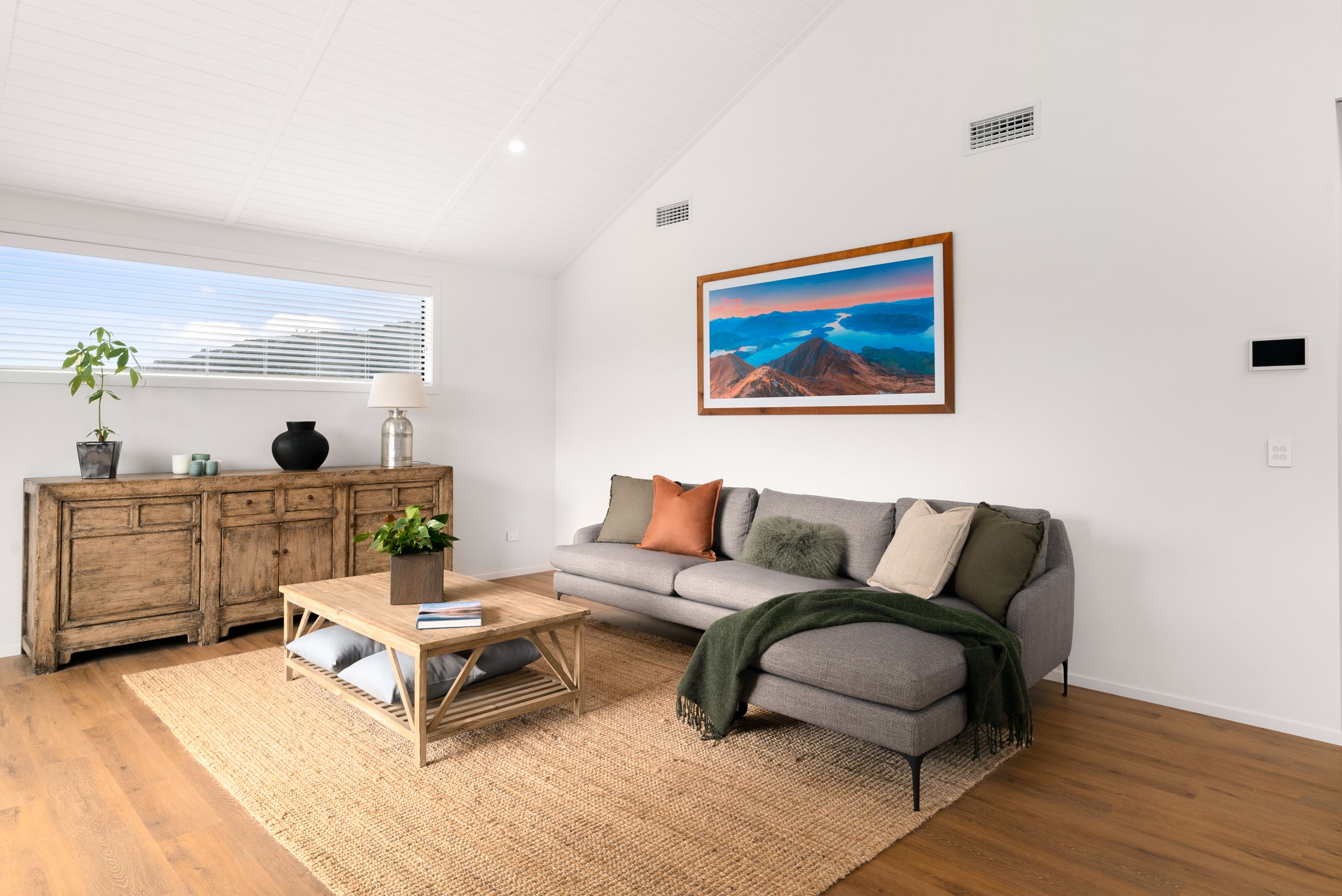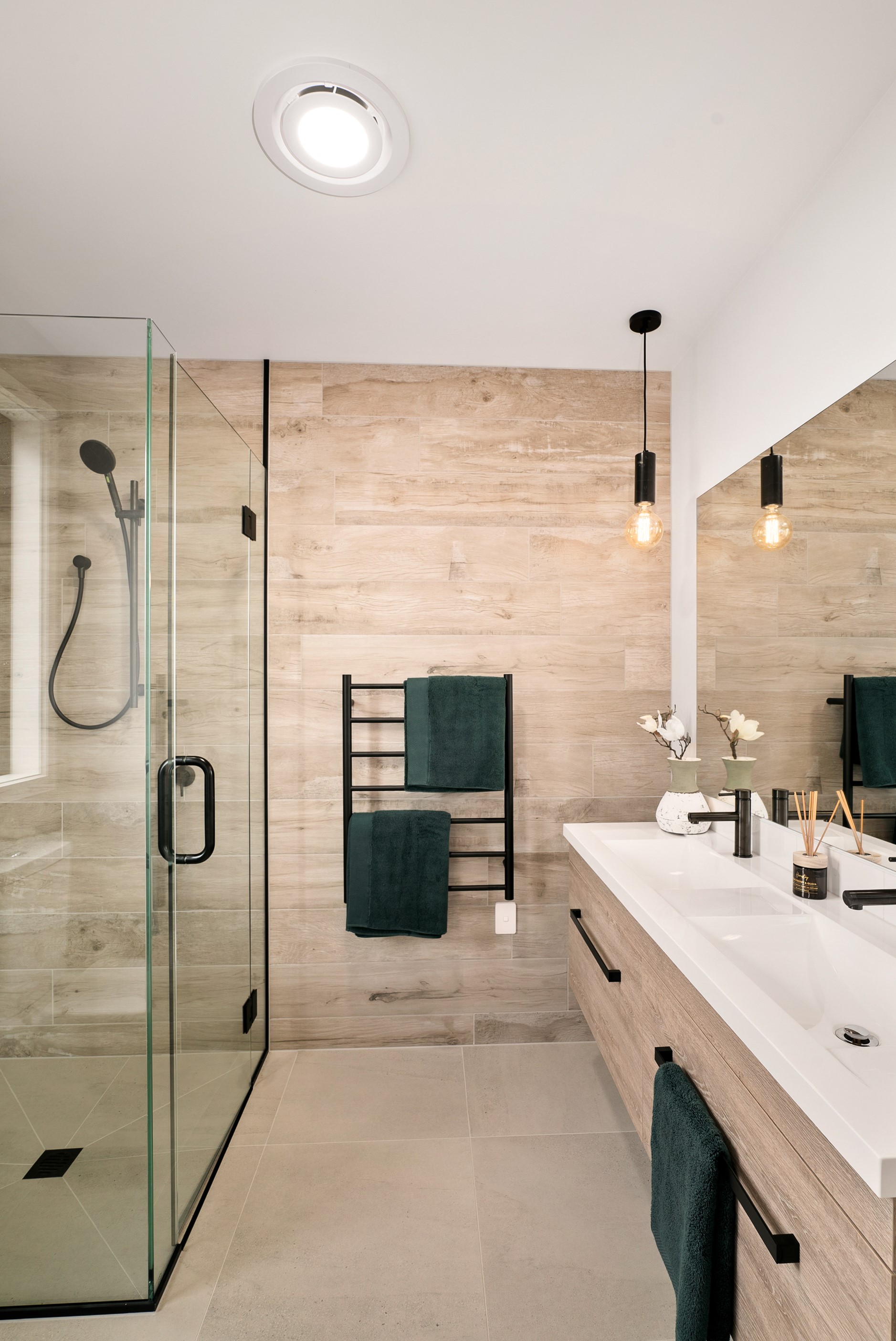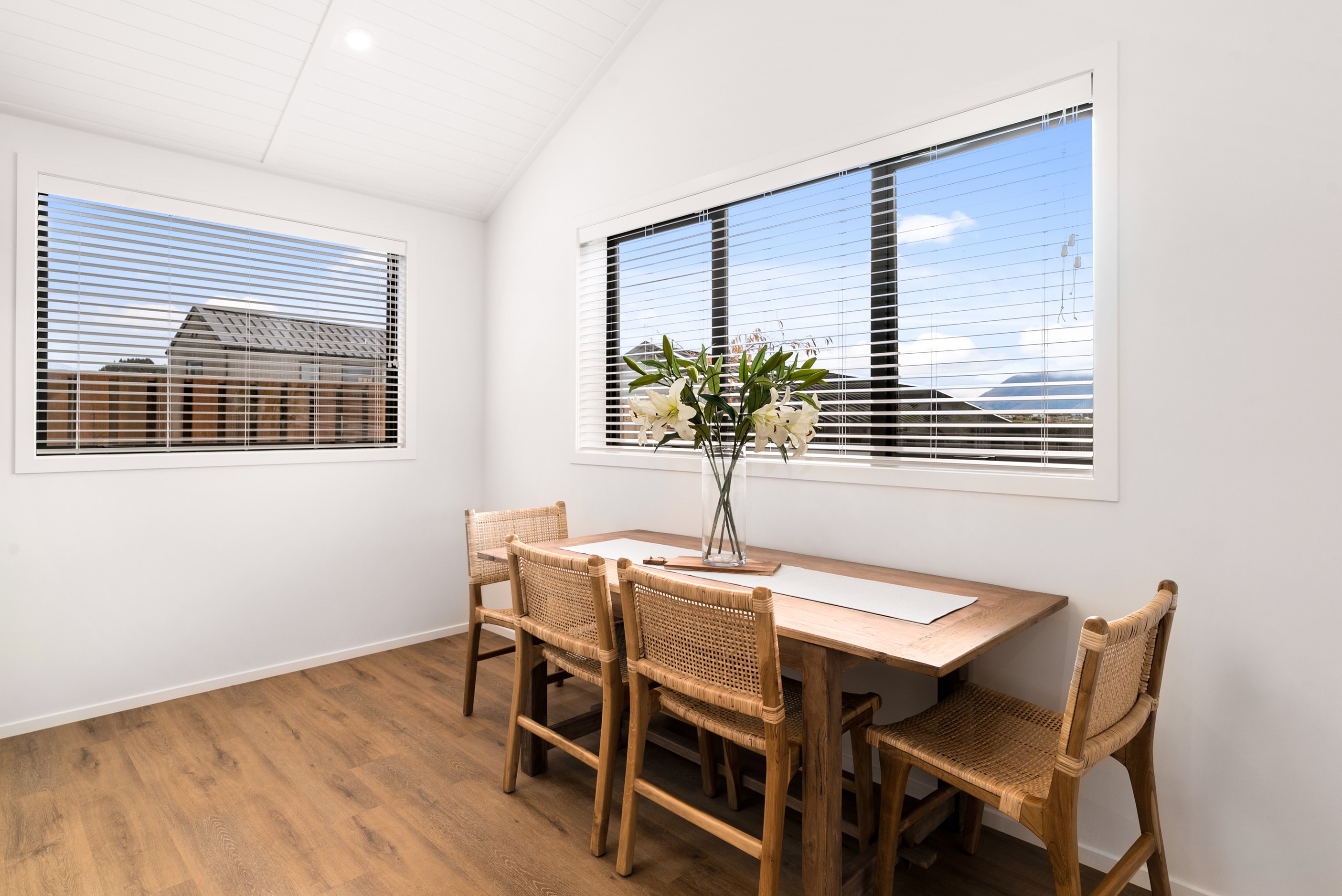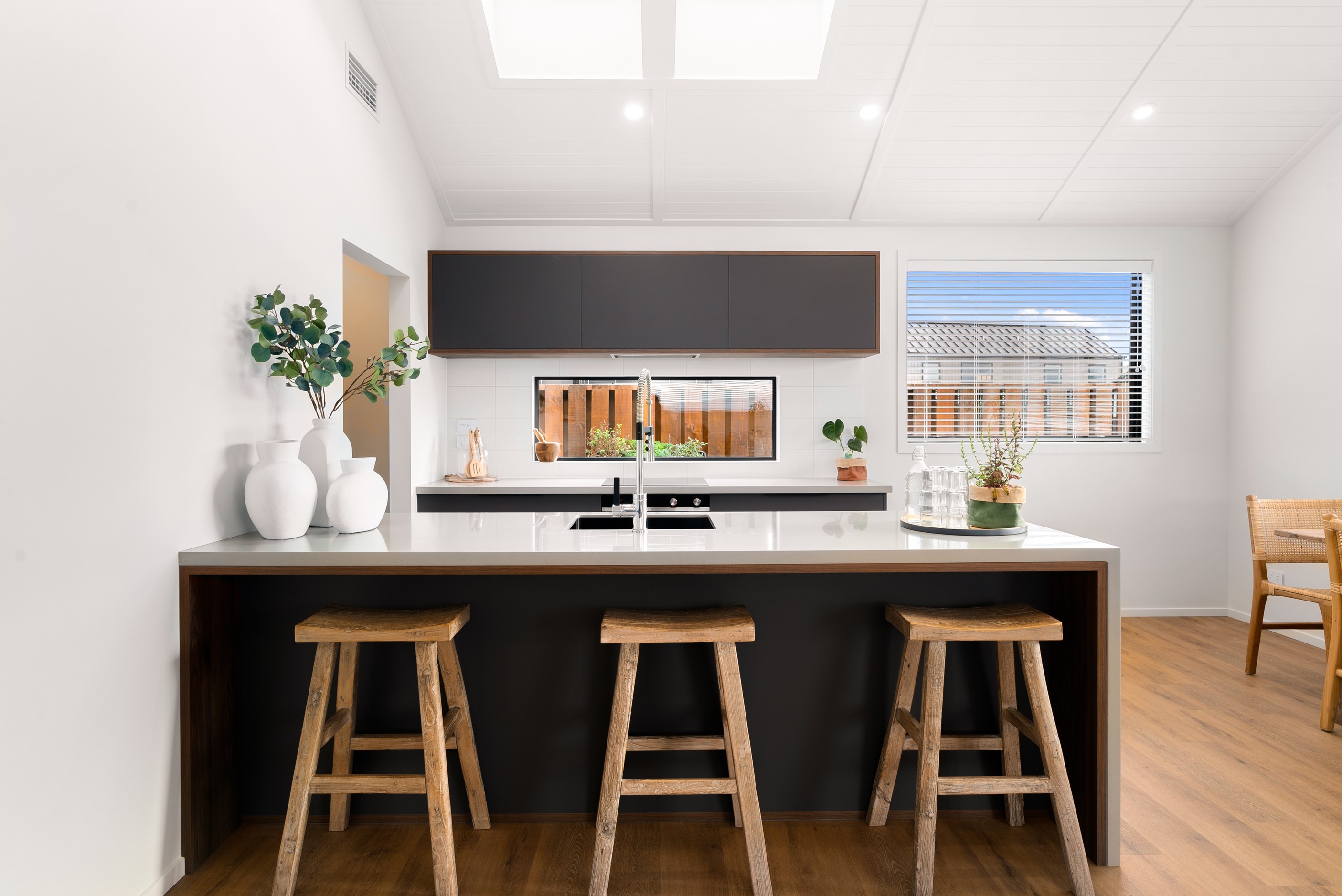 How do you build a duplex so that both homes make the most of the available vistas? You stagger them, just as the Jennian team has done on this elevated site. The satisfying outcome is that both three-bedroom, two-bathroom homes, joined at the garages, have views of the inspiring Central Otago landscape and sky. The builder’s favourite parts include hidden internal garage entry and full-height cavity sliders into the living areas with vaulted ceilings. Skylights allow natural light to fill the kitchens, bathrooms and hallways. The beautiful herringbone tiling behind the bath is among the features visitors comment on, as well as the generous storage in the hallway cupboards and garages. The ducted heating system ensures each room remains at the optimum temperature all-year around. Another plus of the properties: they showcase the range and diversity of builds with Jennian Homes, the suppliers and the products available. The brick and cedar entries and hallways – sure to make a lasting impression – are fine examples of attention to detail and showcase what can be achieved by bringing the outdoors in.