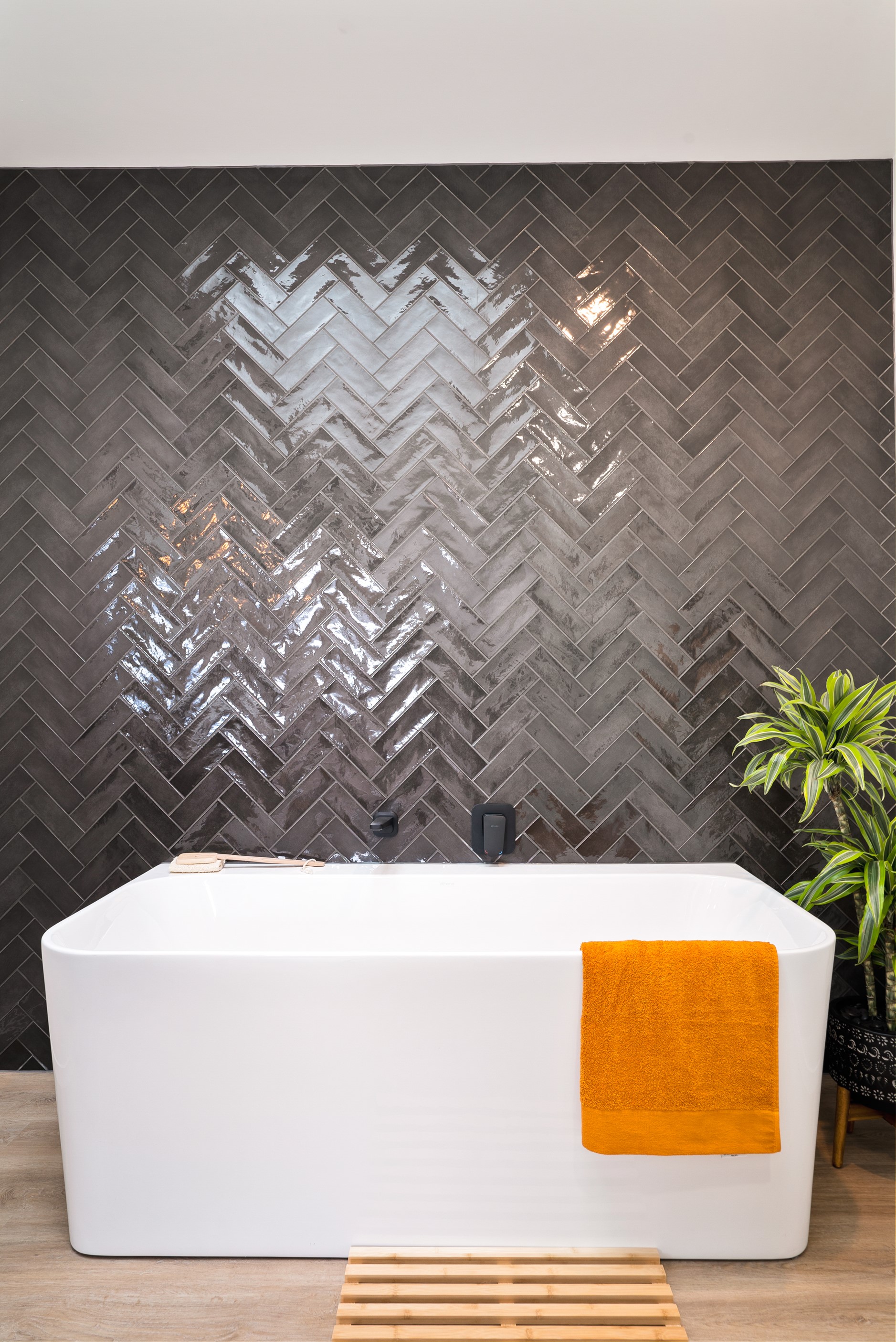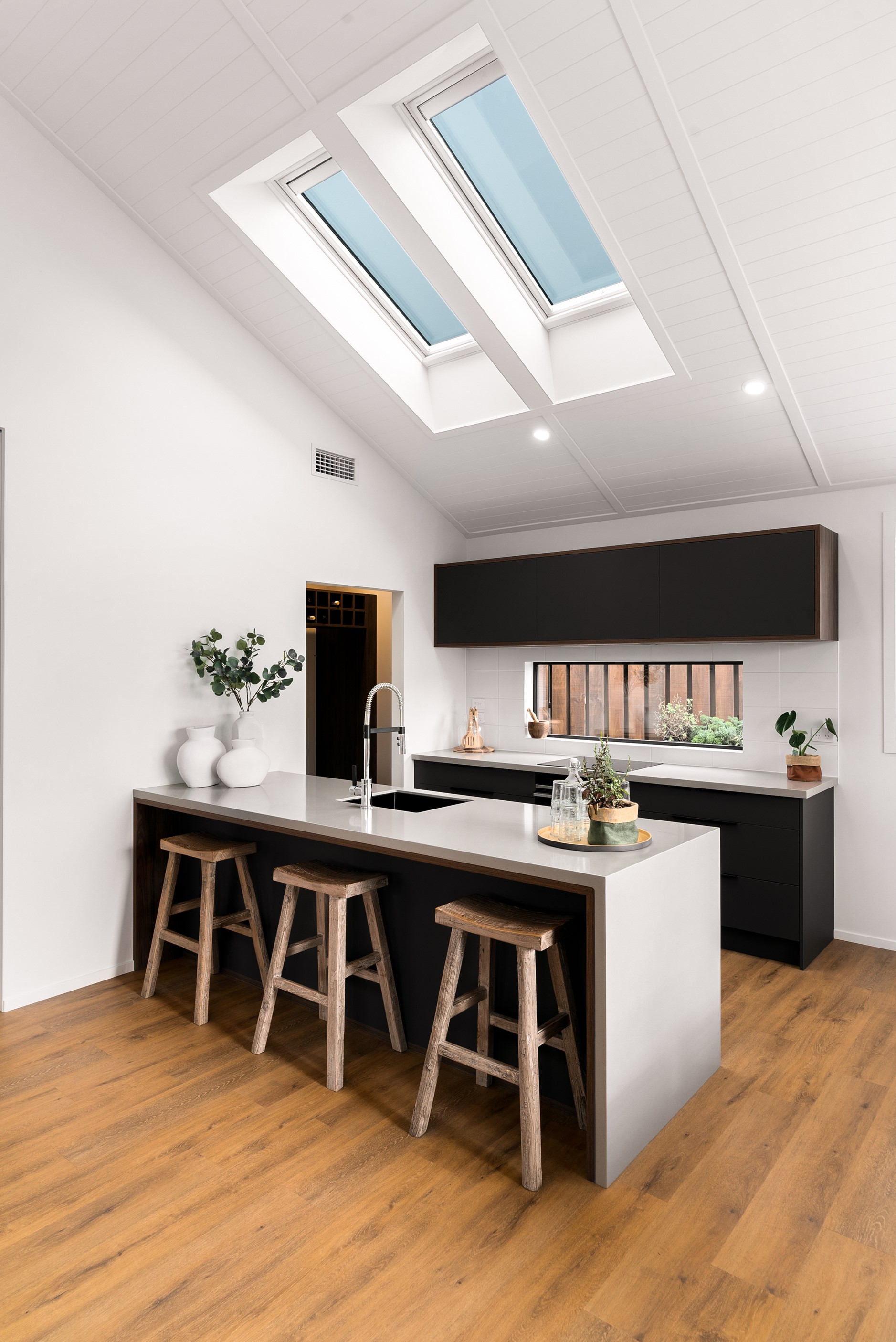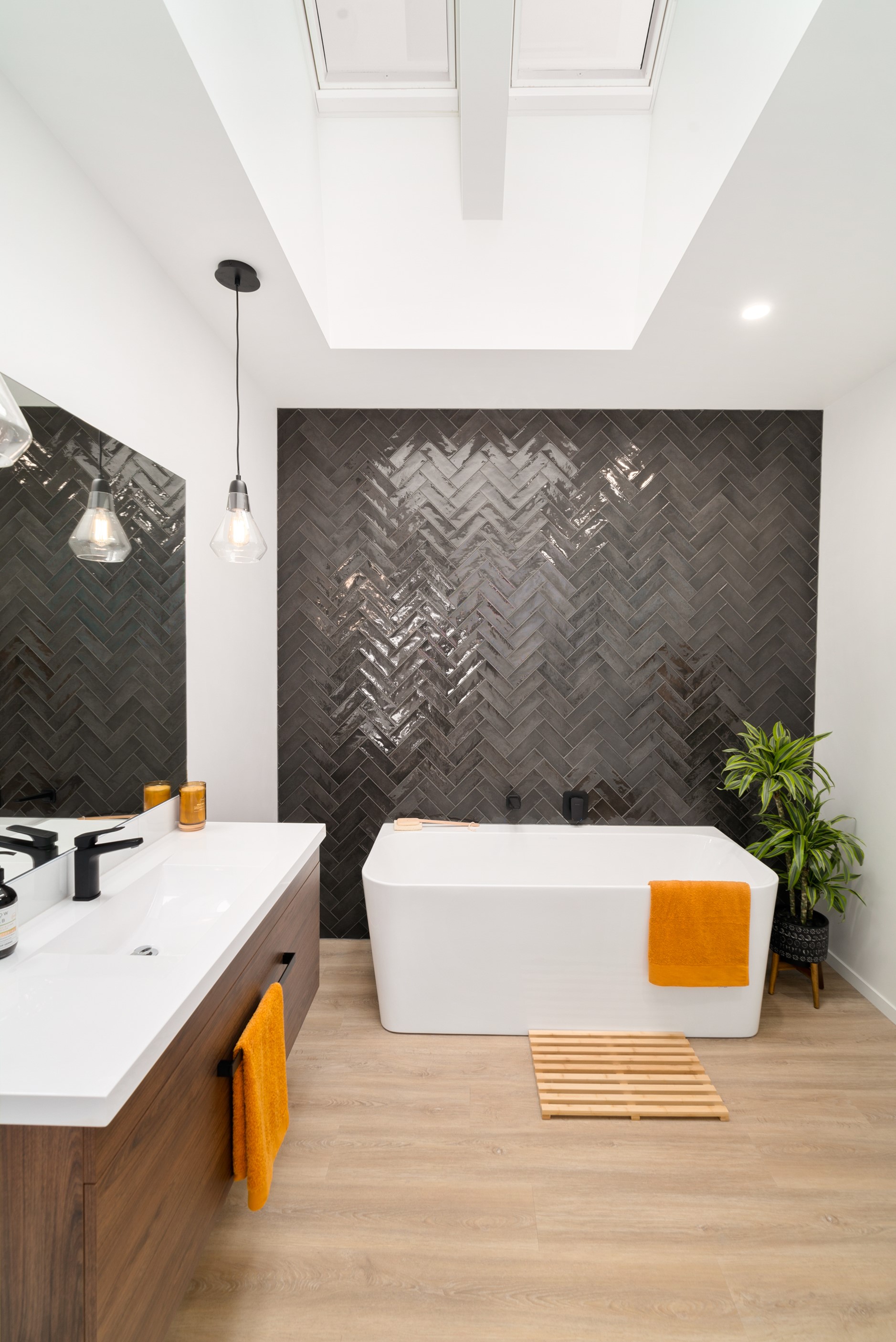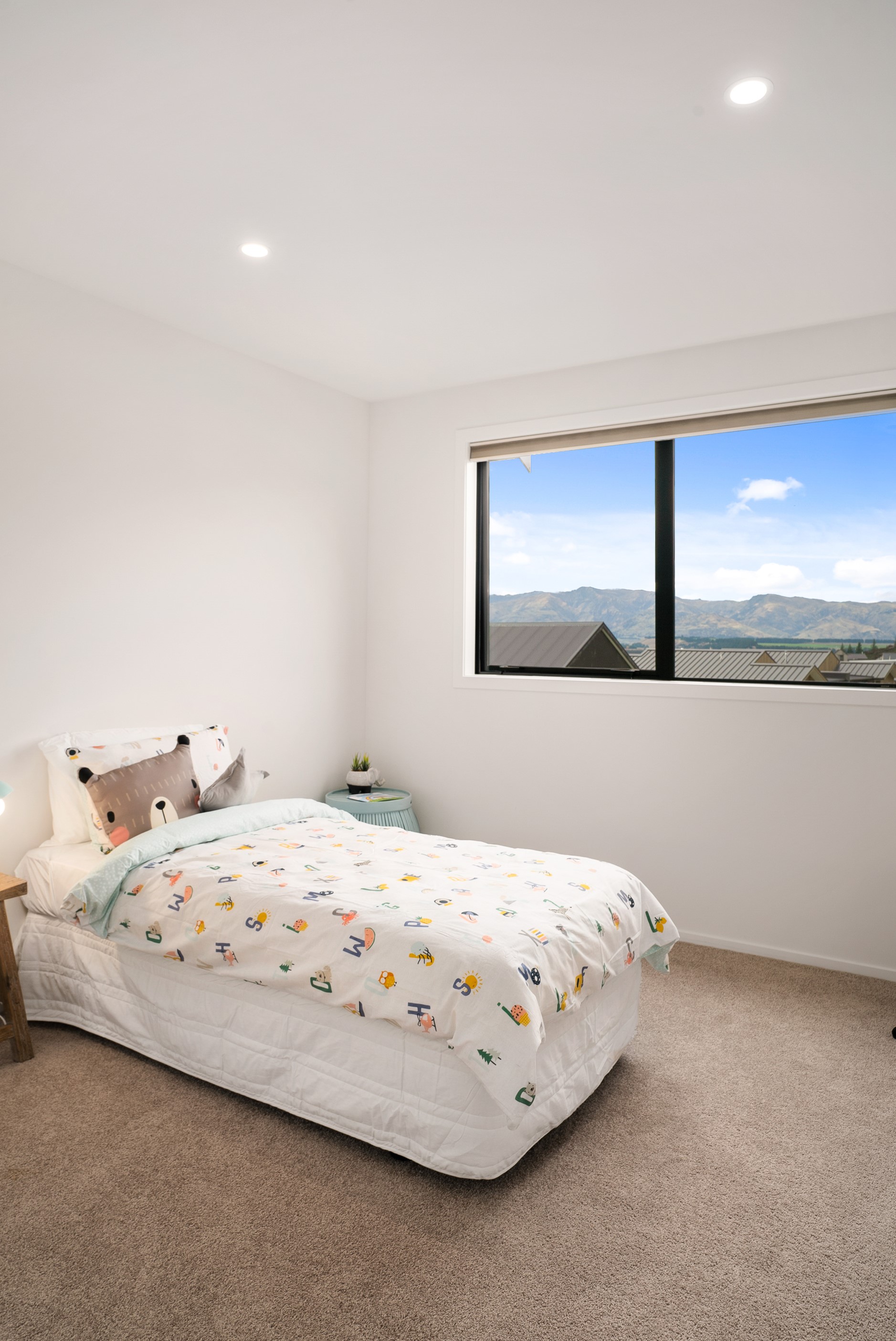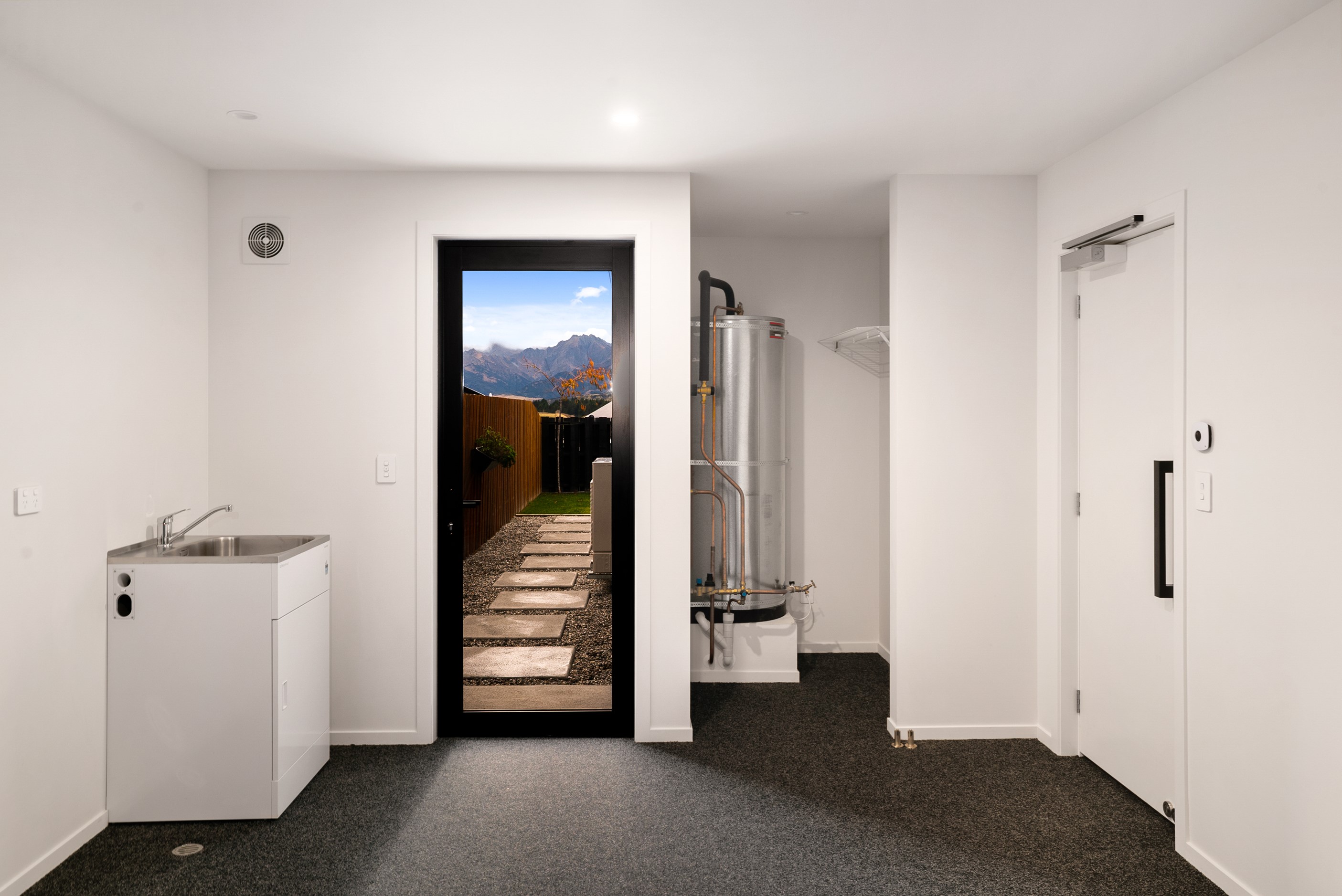 How do you build a duplex so that both homes make the most of the available vistas? You stagger them, just as the Jennian team has done on this elevated site. The satisfying outcome is that both three-bedroom, two-bathroom homes, joined at the garages, have views of the inspiring Central Otago landscape and sky. The builder’s favourite parts include hidden internal garage entry and full-height cavity sliders into the living areas with vaulted ceilings. Skylights allow natural light to fill the kitchens, bathrooms and hallways. The beautiful herringbone tiling behind the bath is among the features visitors comment on, as well as the generous storage in the hallway cupboards and garages. The ducted heating system ensures each room remains at the optimum temperature all-year around. Another plus of the properties: they showcase the range and diversity of builds with Jennian Homes, the suppliers and the products available. The brick and cedar entries and hallways – sure to make a lasting impression – are fine examples of attention to detail and showcase what can be achieved by bringing the outdoors in.