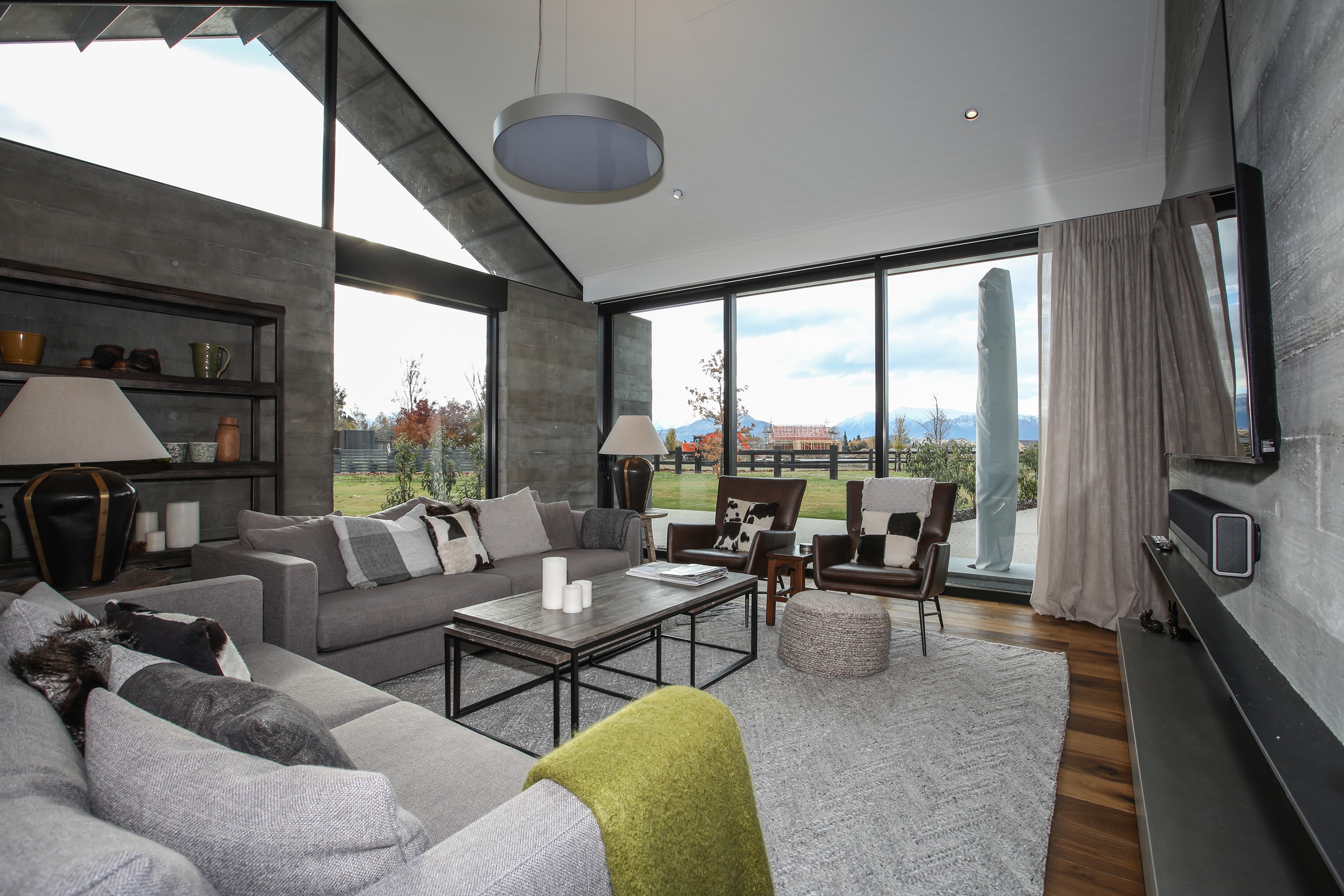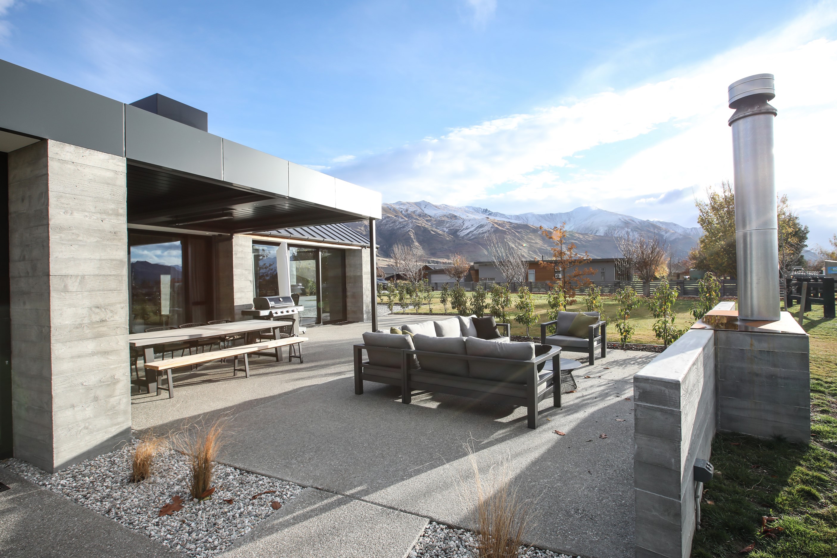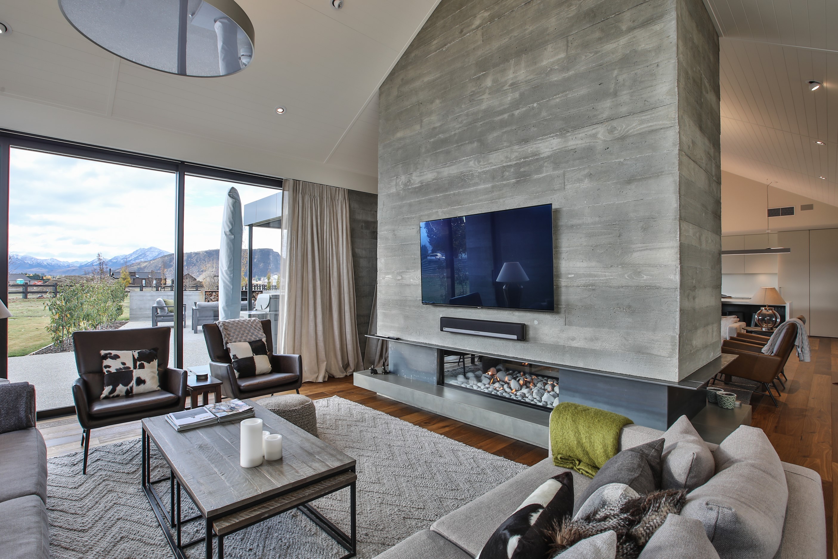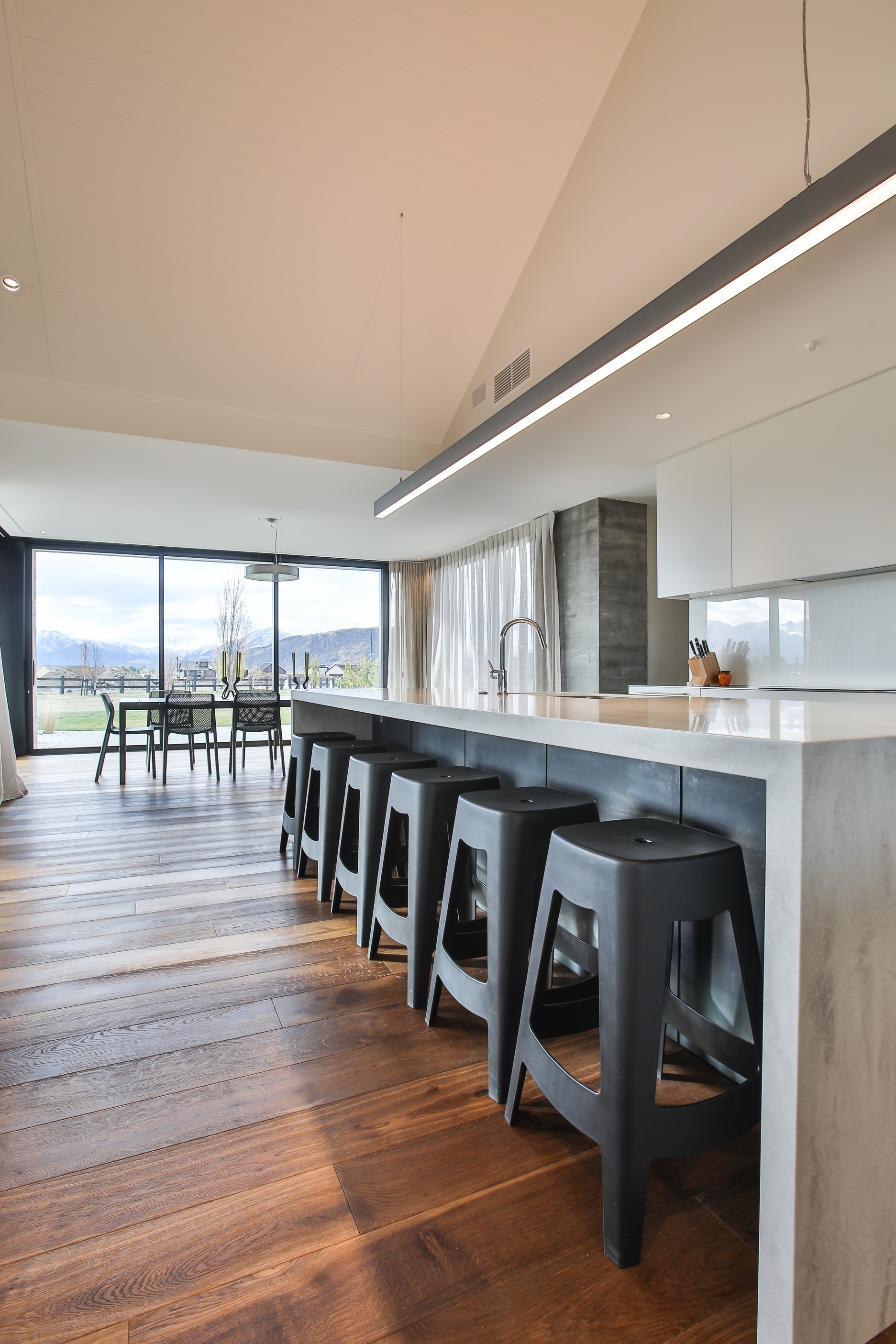 A striking presence. That’s how this bold home in the mountains has been described. Solid raw materials – the likes of steel and concrete – enhance the clean lines of the single-storey exterior, yet also anchor it to the beautiful but sometimes arid natural environment. And this is no small home: in its 391sqm floorplan it has more than five bedrooms that can accommodate up to 14 people. Inside, the aesthetic is softened with the warmth of timber flooring, clever furnishings and shuttered concrete walls that link the inside to the out. Living areas flow into the impressive outdoor area – designed to be used in all weather – and the wide open spaces beyond. The large, well-equipped kitchen, with scullery, is a paradise for entertainers. The cook is never going to miss out on the conversation in this house. There’s also a sense of serenity here, thanks to muted tones, natural materials, and the concrete, which makes a feature of the fireplace and some walls. For all the beauty inside, the home never fails to invite in the scenery of the land it inhabits. Large-scale windows and doors frame the majesty of Central Otago.