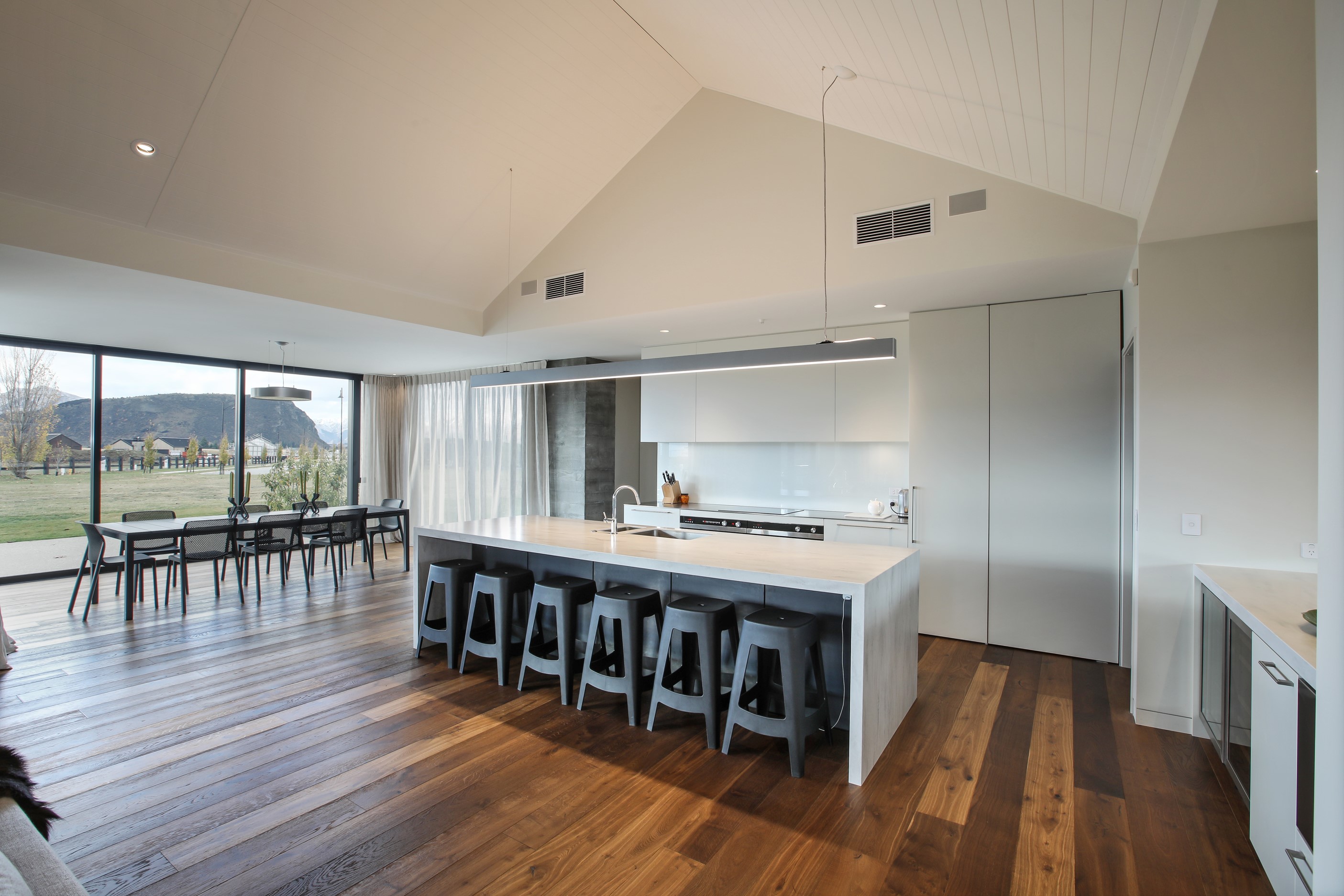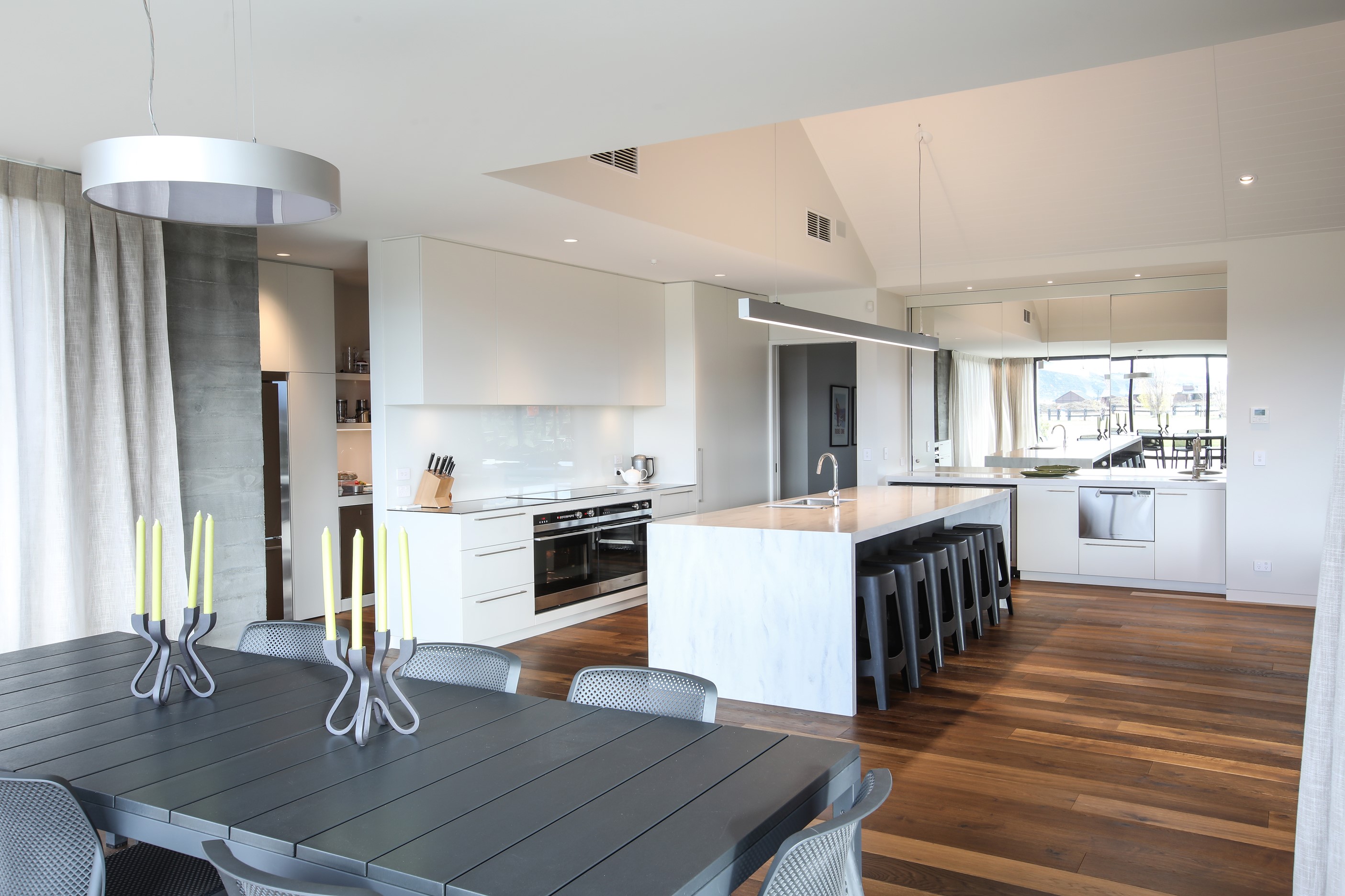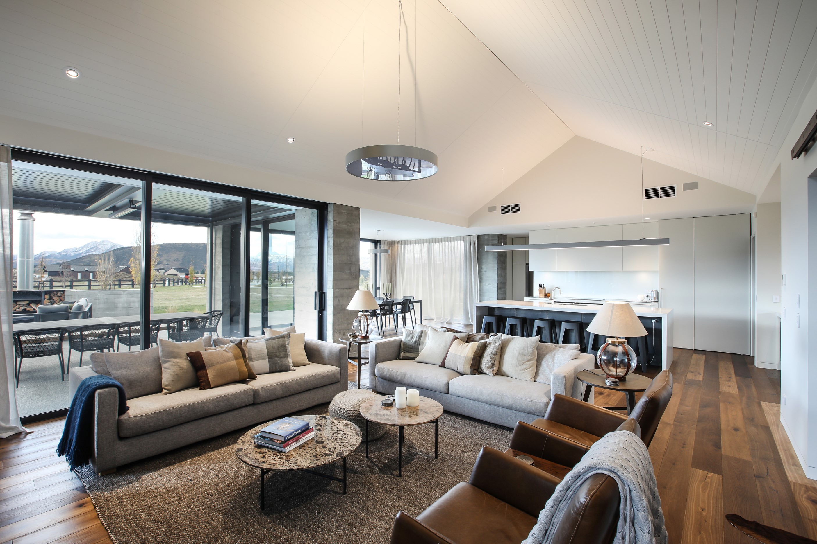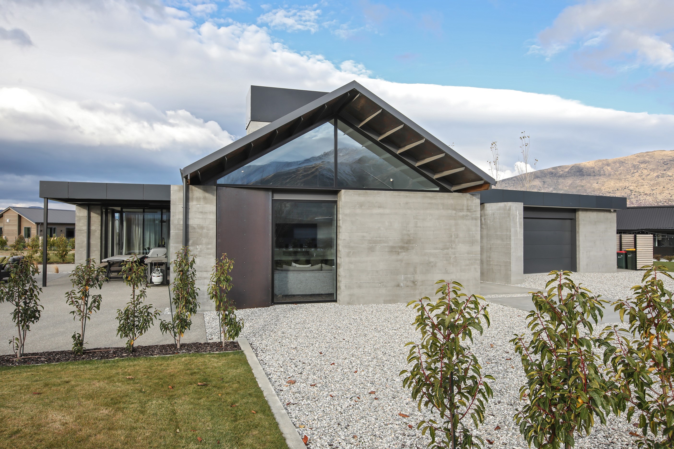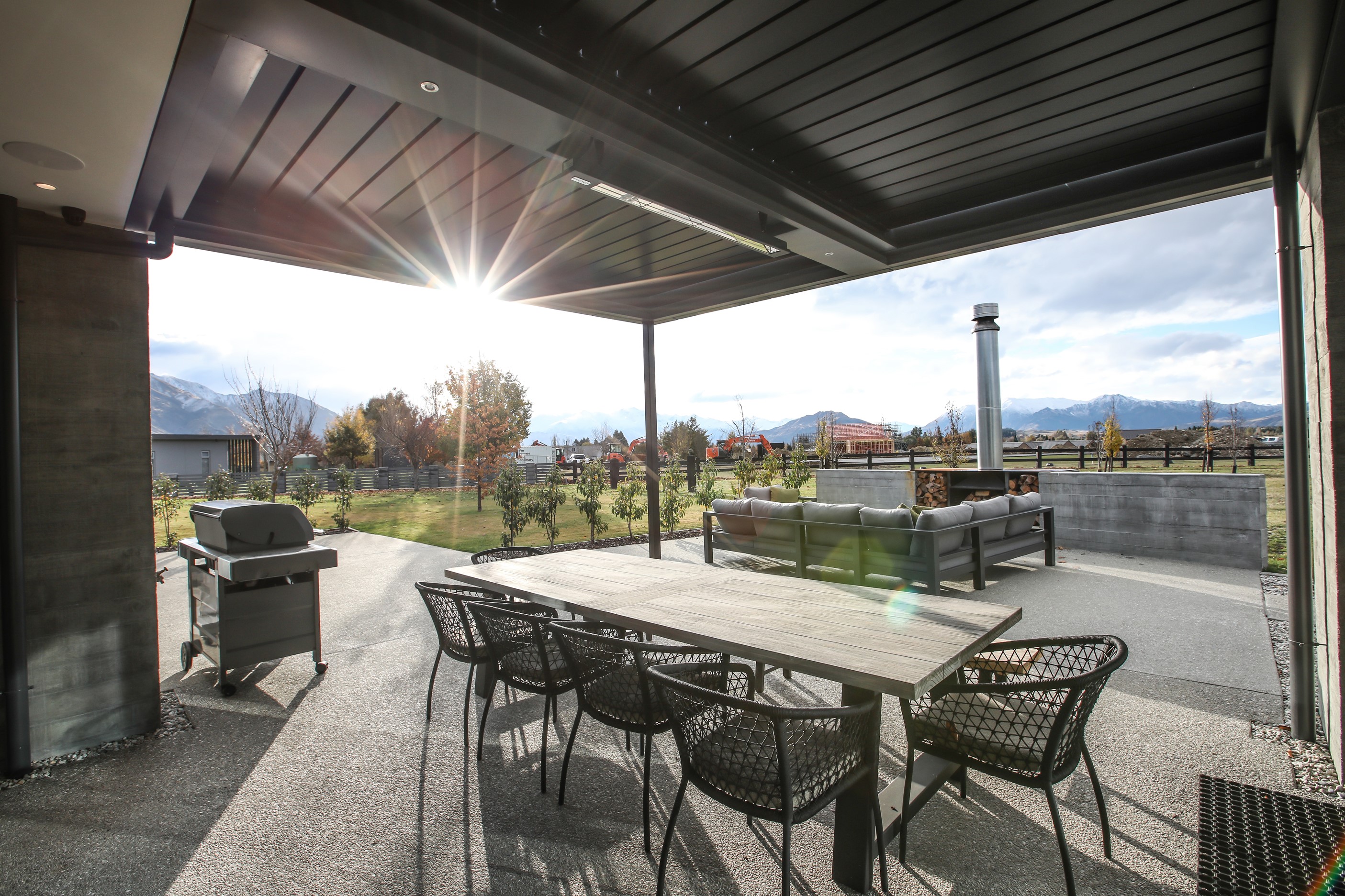 A striking presence. That’s how this bold home in the mountains has been described. Solid raw materials – the likes of steel and concrete – enhance the clean lines of the single-storey exterior, yet also anchor it to the beautiful but sometimes arid natural environment. And this is no small home: in its 391sqm floorplan it has more than five bedrooms that can accommodate up to 14 people. Inside, the aesthetic is softened with the warmth of timber flooring, clever furnishings and shuttered concrete walls that link the inside to the out. Living areas flow into the impressive outdoor area – designed to be used in all weather – and the wide open spaces beyond. The large, well-equipped kitchen, with scullery, is a paradise for entertainers. The cook is never going to miss out on the conversation in this house. There’s also a sense of serenity here, thanks to muted tones, natural materials, and the concrete, which makes a feature of the fireplace and some walls. For all the beauty inside, the home never fails to invite in the scenery of the land it inhabits. Large-scale windows and doors frame the majesty of Central Otago.