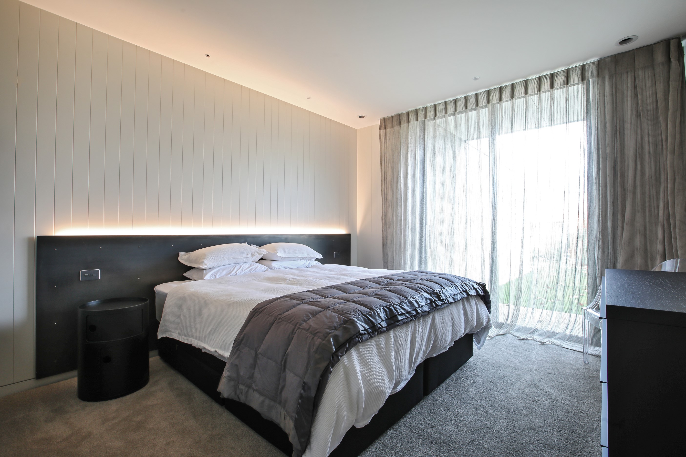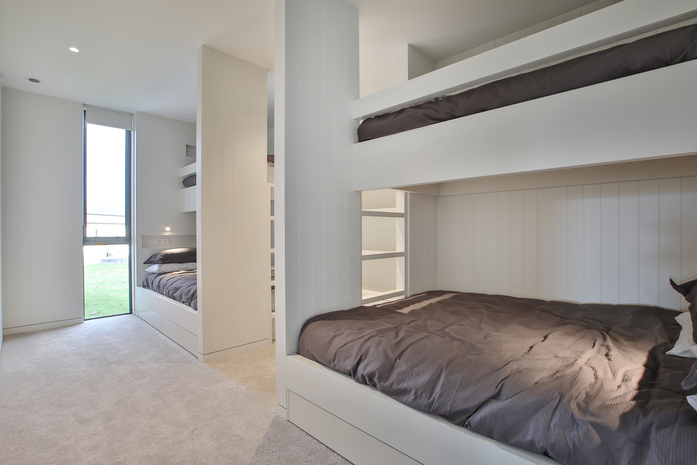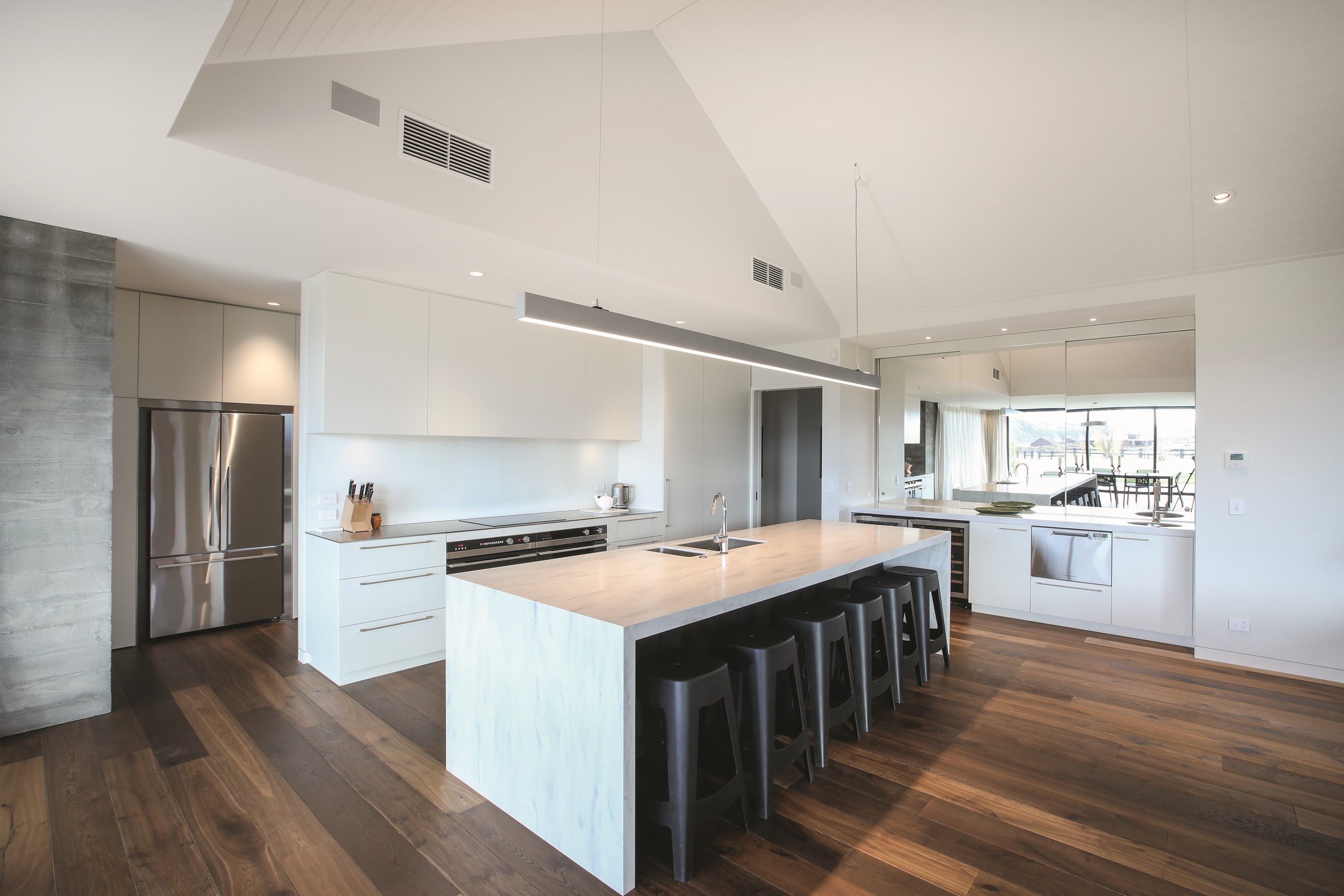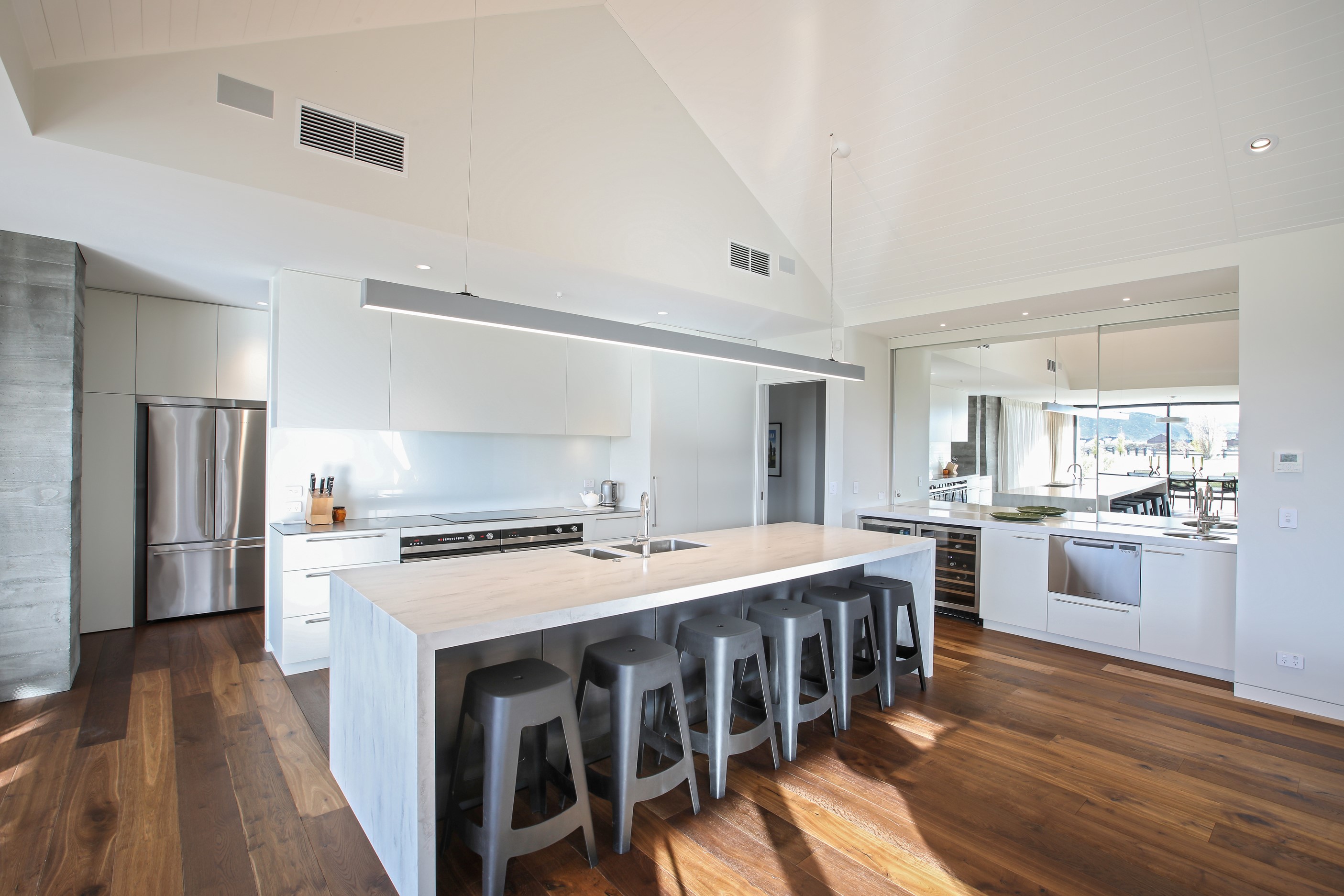 A striking presence. That’s how this bold home in the mountains has been described. Solid raw materials – the likes of steel and concrete – enhance the clean lines of the single-storey exterior, yet also anchor it to the beautiful but sometimes arid natural environment. And this is no small home: in its 391sqm floorplan it has more than five bedrooms that can accommodate up to 14 people. Inside, the aesthetic is softened with the warmth of timber flooring, clever furnishings and shuttered concrete walls that link the inside to the out. Living areas flow into the impressive outdoor area – designed to be used in all weather – and the wide open spaces beyond. The large, well-equipped kitchen, with scullery, is a paradise for entertainers. The cook is never going to miss out on the conversation in this house. There’s also a sense of serenity here, thanks to muted tones, natural materials, and the concrete, which makes a feature of the fireplace and some walls. For all the beauty inside, the home never fails to invite in the scenery of the land it inhabits. Large-scale windows and doors frame the majesty of Central Otago.
