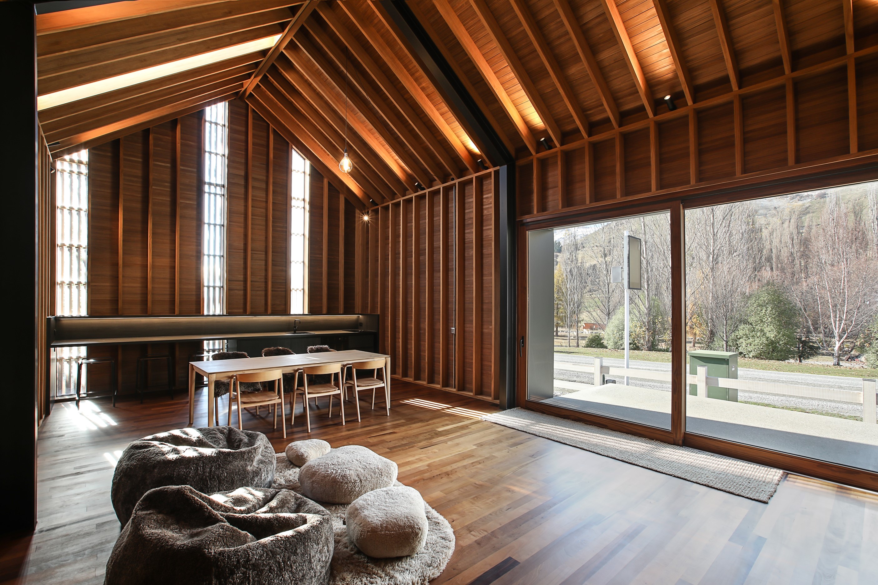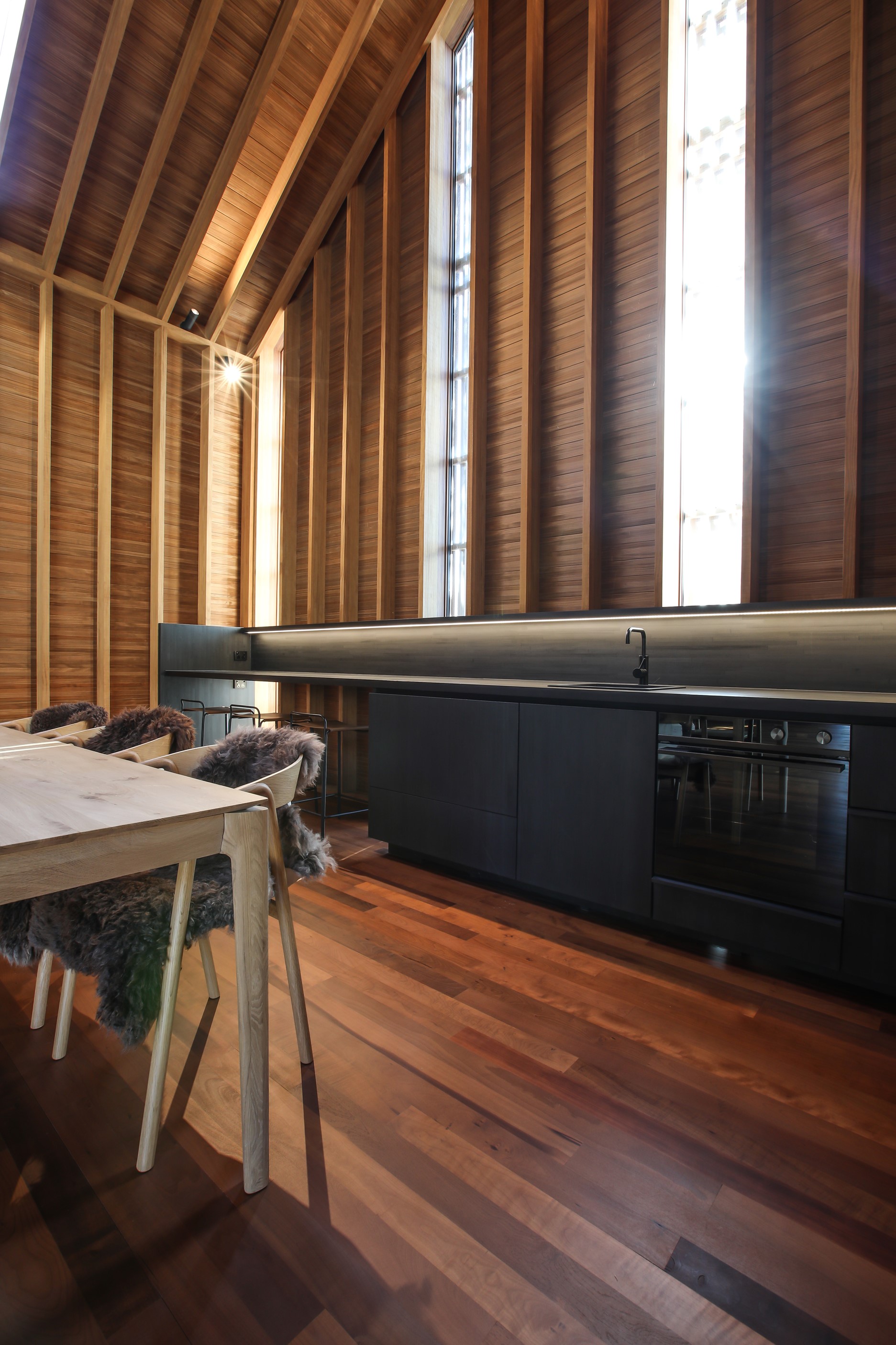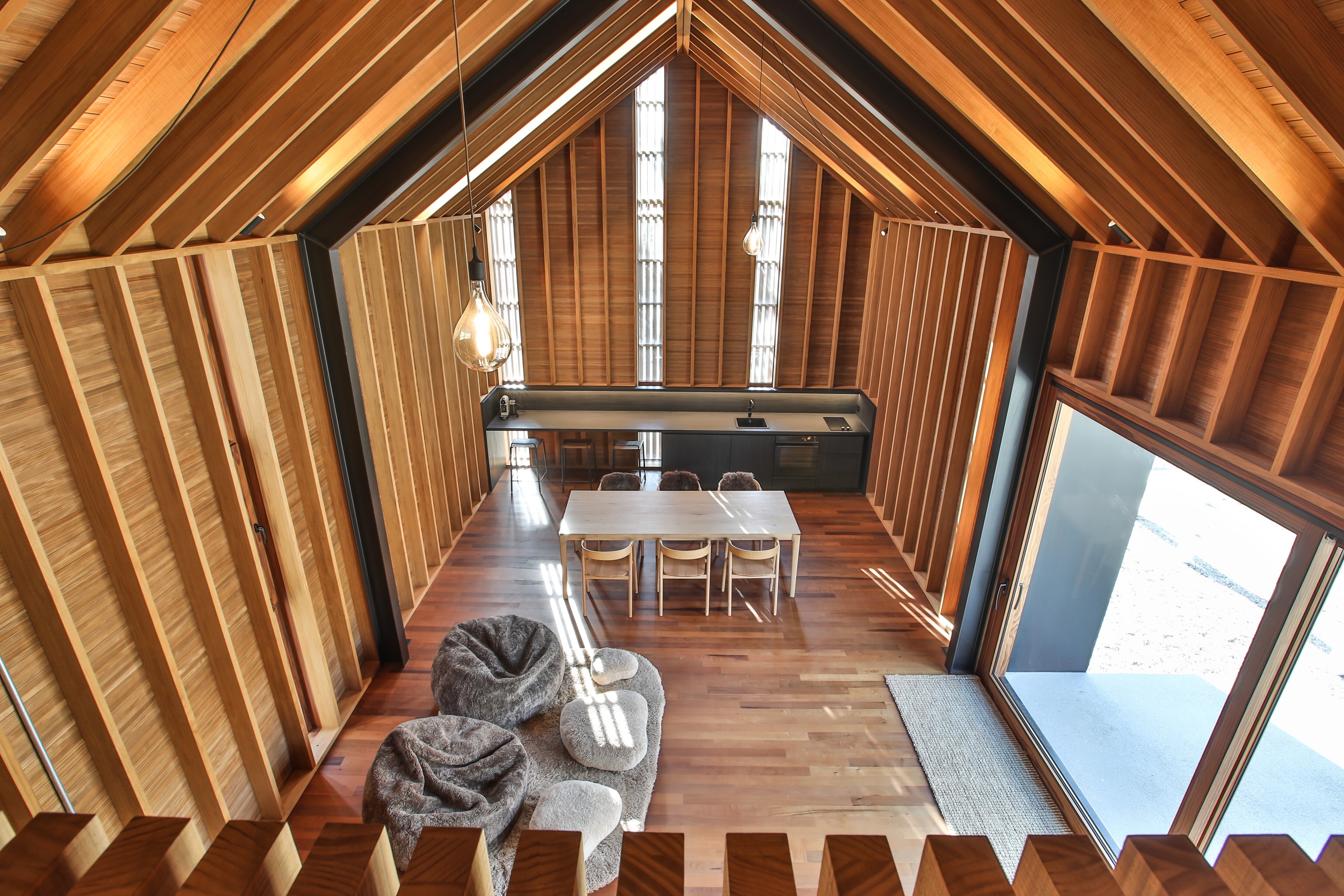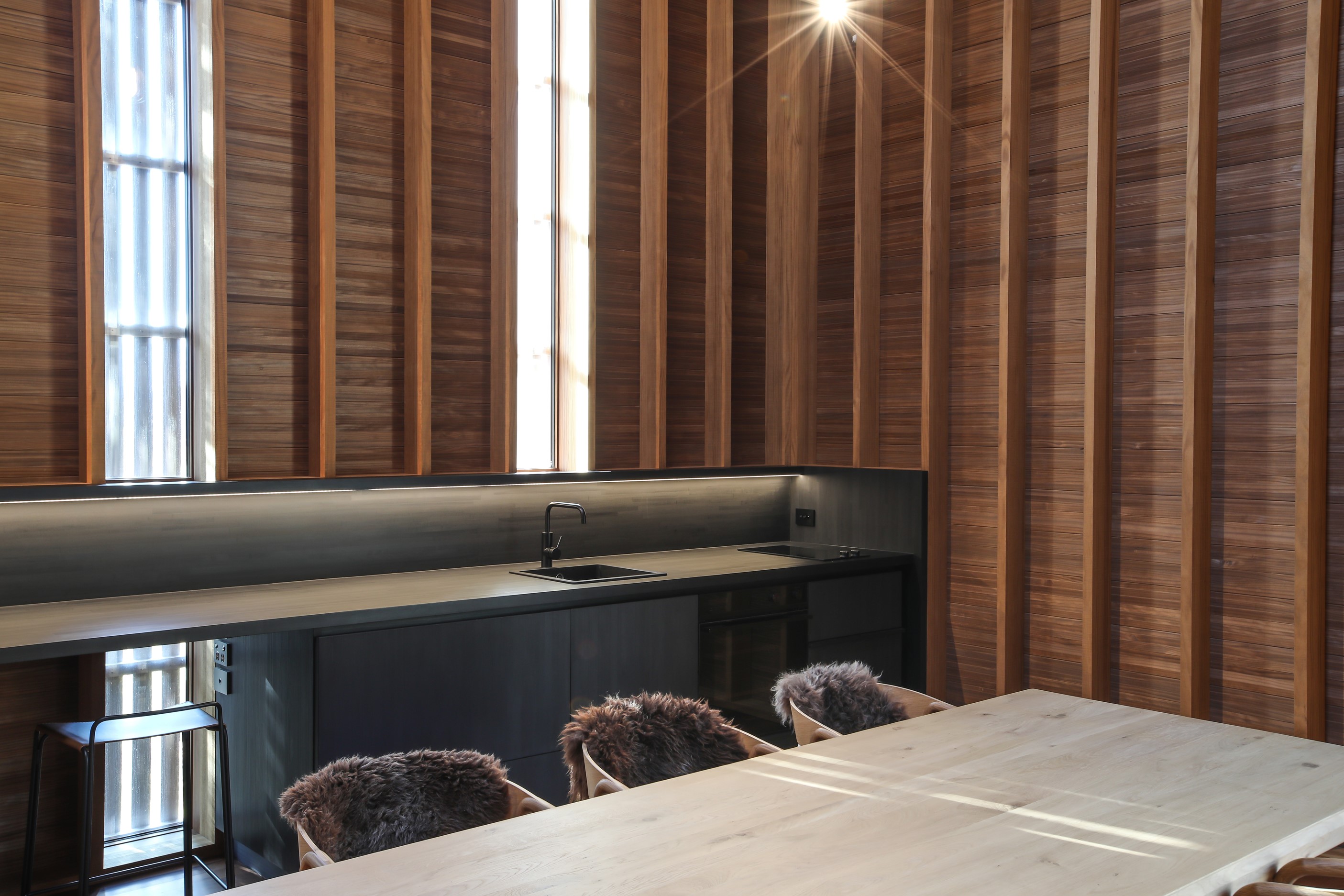Now for something completely different. Here’s a holiday cabin that’s also a showcase of Abodo thermally modified timber products – for cladding, structure, linings, flooring, joinery, furnishing and fence posts. It’s clear from the fully exposed timber interior that precision craftsmanship is on show here too. Using heat rather than chemicals, Abodo converts rapidly renewable, locally grown radiata pine into high-performance timbers that withstand the harsh local conditions. The trees are New Zealand grown and Forest Stewardship Council (FSC®) certified. Abodo’s Vulcan Cladding is the first verified carbon-negative feature timber. The 112sqm cabin, a simple shape inspired by the Central Otago stone shed, has a high-performance thermal envelope and, had a rangehood been installed, it would have garnered a Homestar 7 rating. Step through the steel archway framing the entrance and you’ll see an open space with a bathroom and an office or bunk room. A bedroom loft above the laundry is accessed by a ladder stair. Exposed studs and rafters are positioned over tongue-and-groove walls and ceilings. Beautiful.