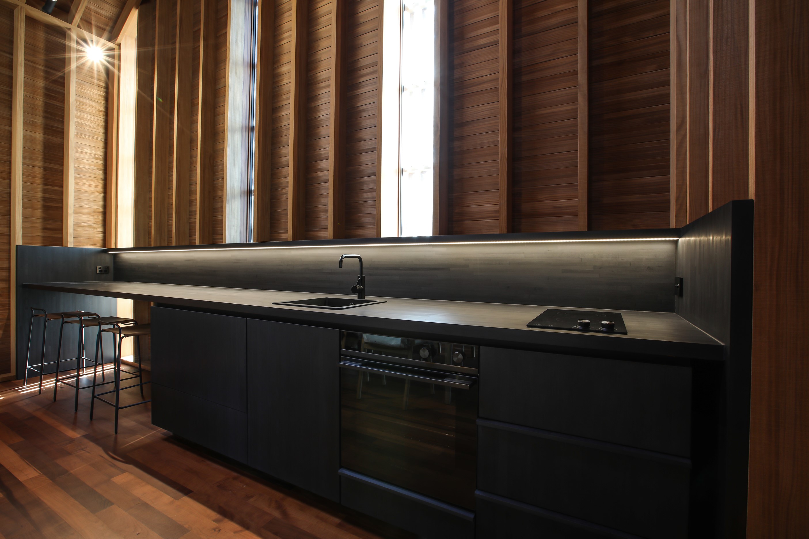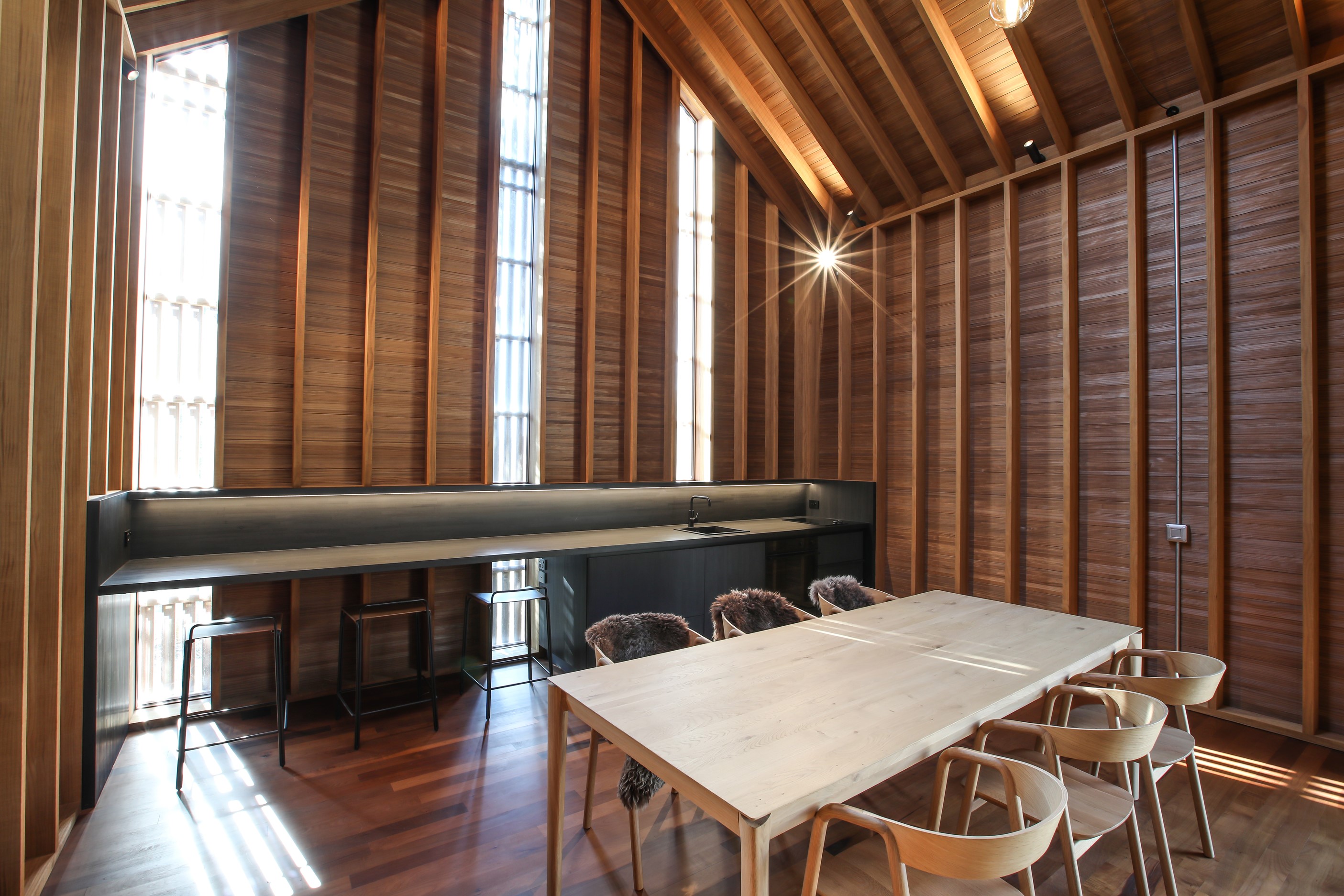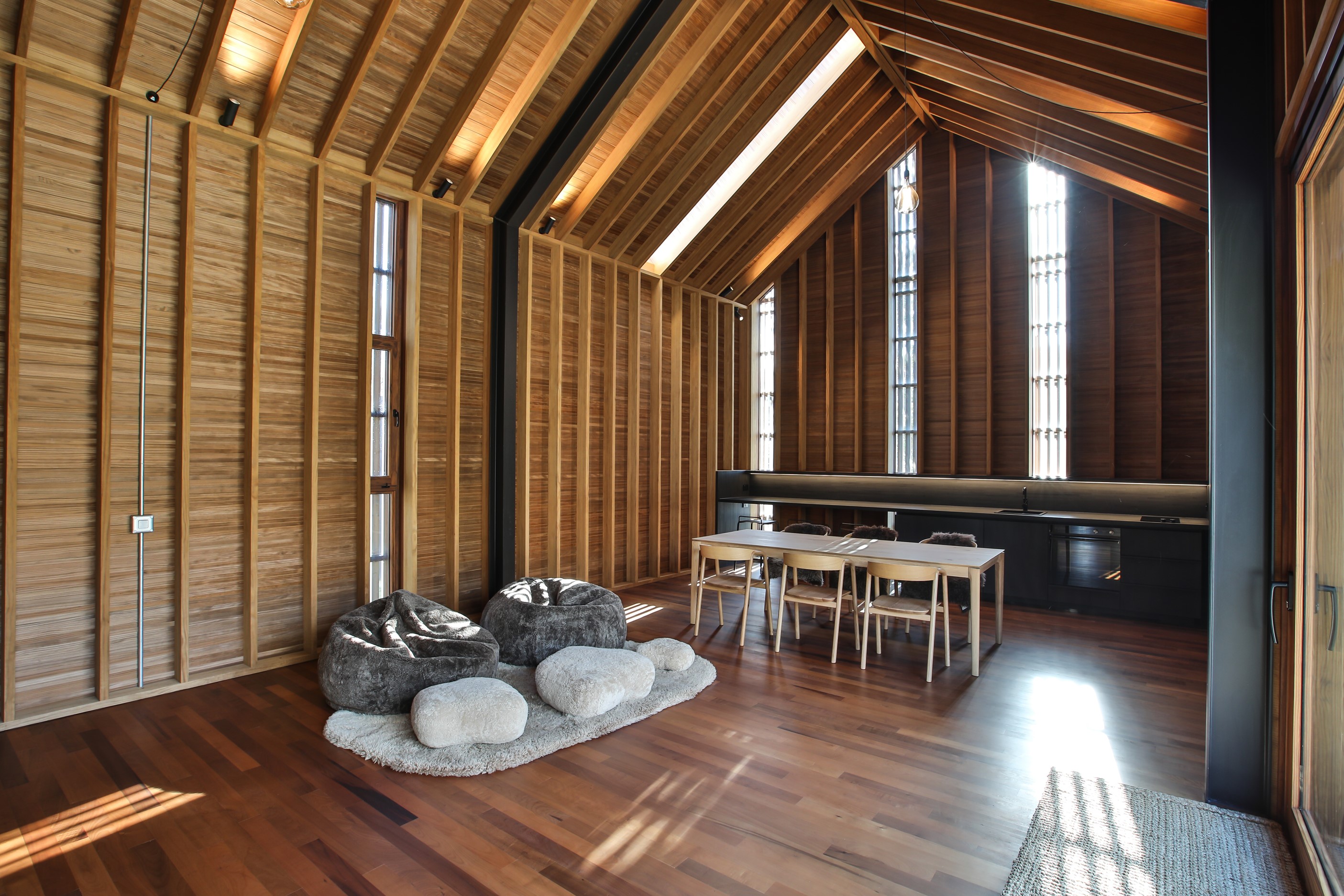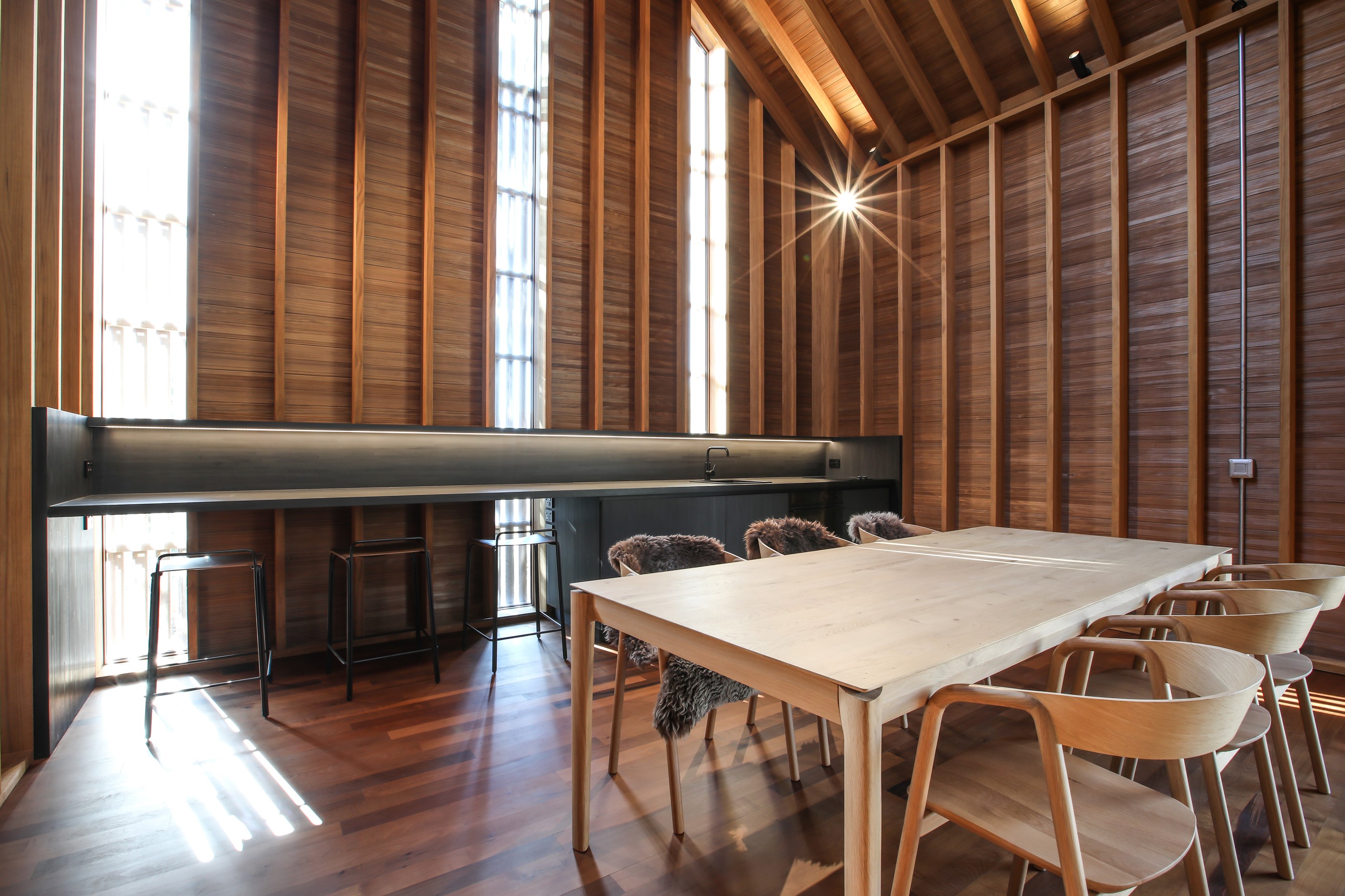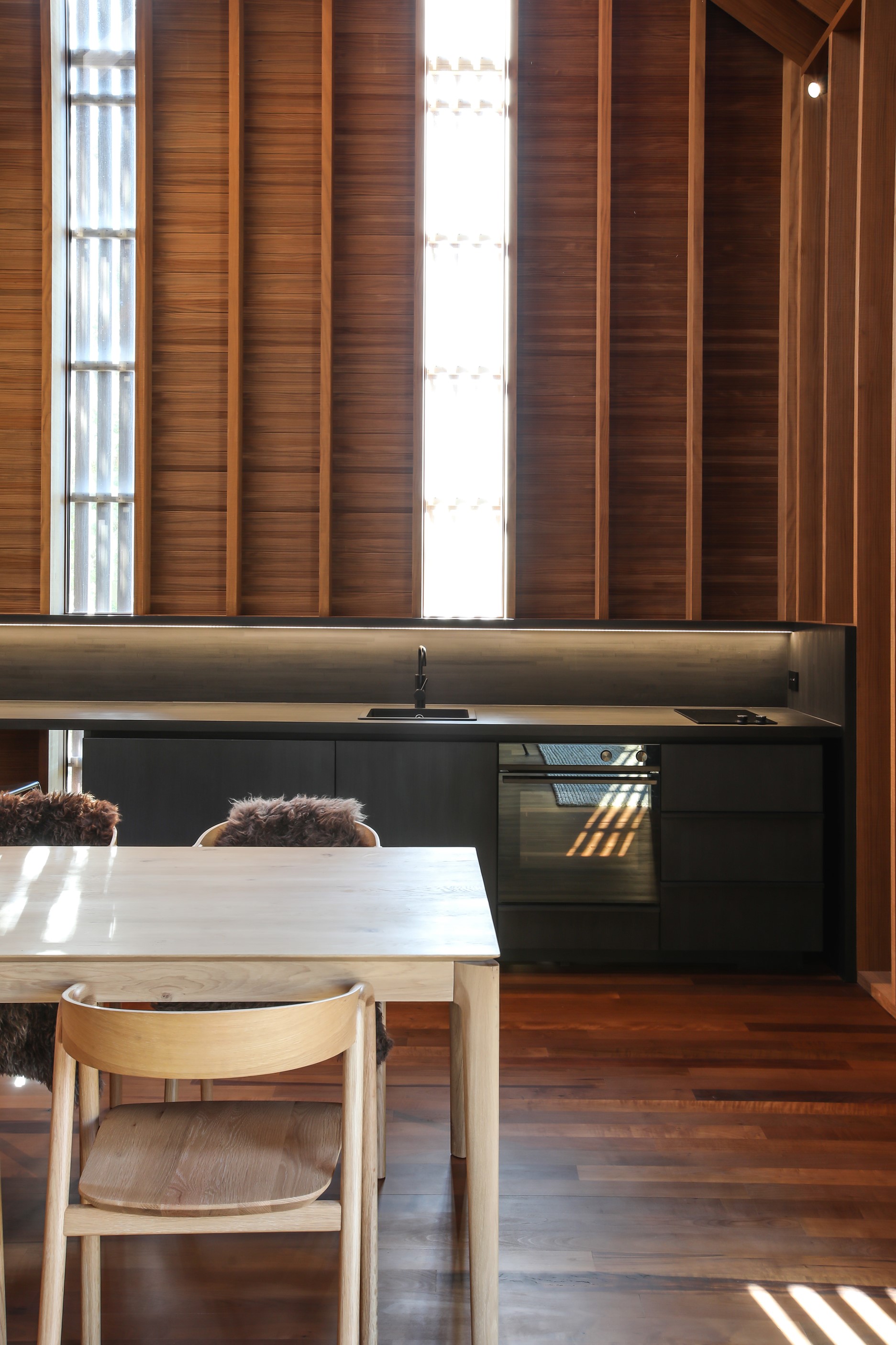 Now for something completely different. Here’s a holiday cabin that’s also a showcase of Abodo thermally modified timber products – for cladding, structure, linings, flooring, joinery, furnishing and fence posts. It’s clear from the fully exposed timber interior that precision craftsmanship is on show here too. Using heat rather than chemicals, Abodo converts rapidly renewable, locally grown radiata pine into high-performance timbers that withstand the harsh local conditions. The trees are New Zealand grown and Forest Stewardship Council (FSC®) certified. Abodo’s Vulcan Cladding is the first verified carbon-negative feature timber. The 112sqm cabin, a simple shape inspired by the Central Otago stone shed, has a high-performance thermal envelope and, had a rangehood been installed, it would have garnered a Homestar 7 rating. Step through the steel archway framing the entrance and you’ll see an open space with a bathroom and an office or bunk room. A bedroom loft above the laundry is accessed by a ladder stair. Exposed studs and rafters are positioned over tongue-and-groove walls and ceilings. Beautiful.
