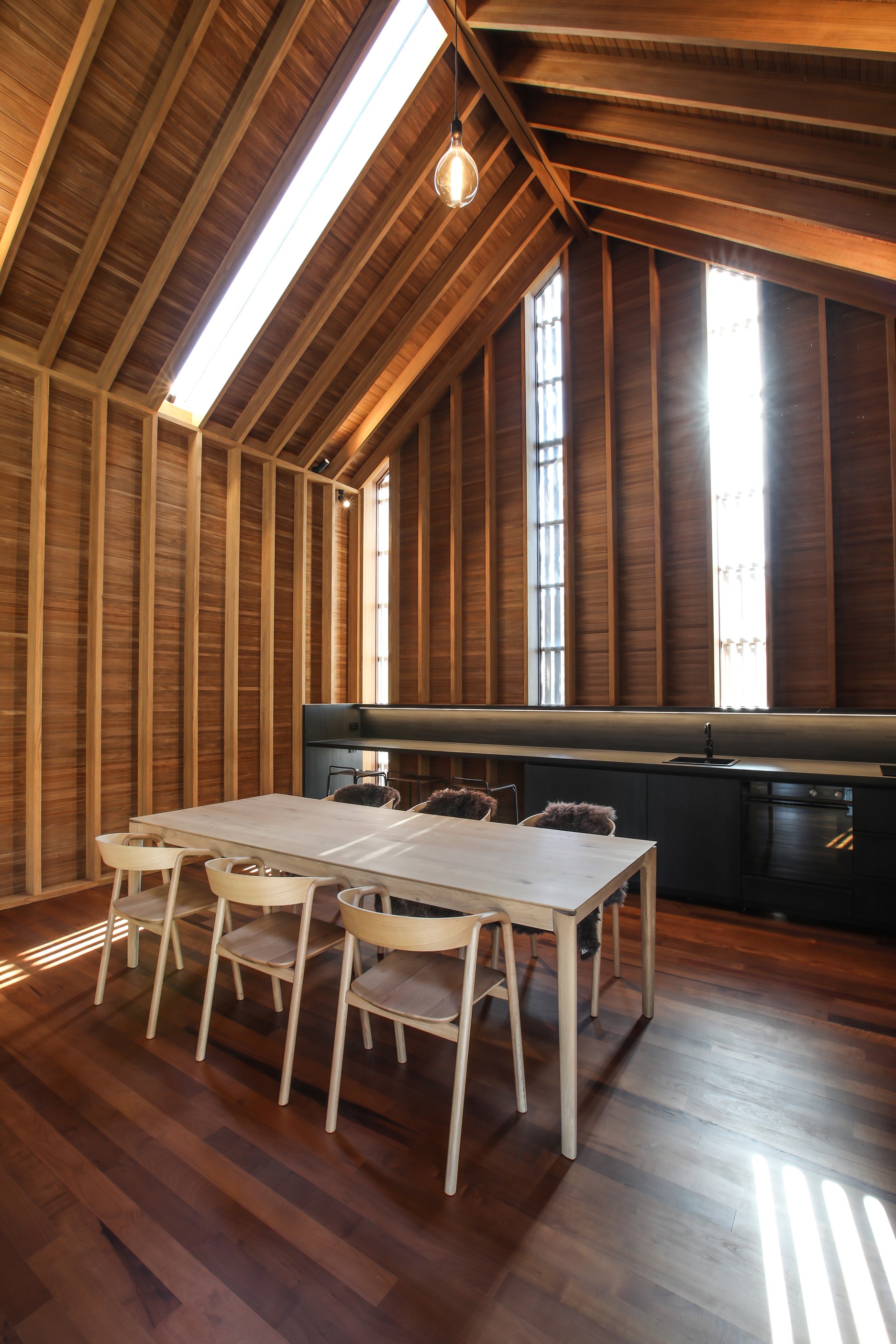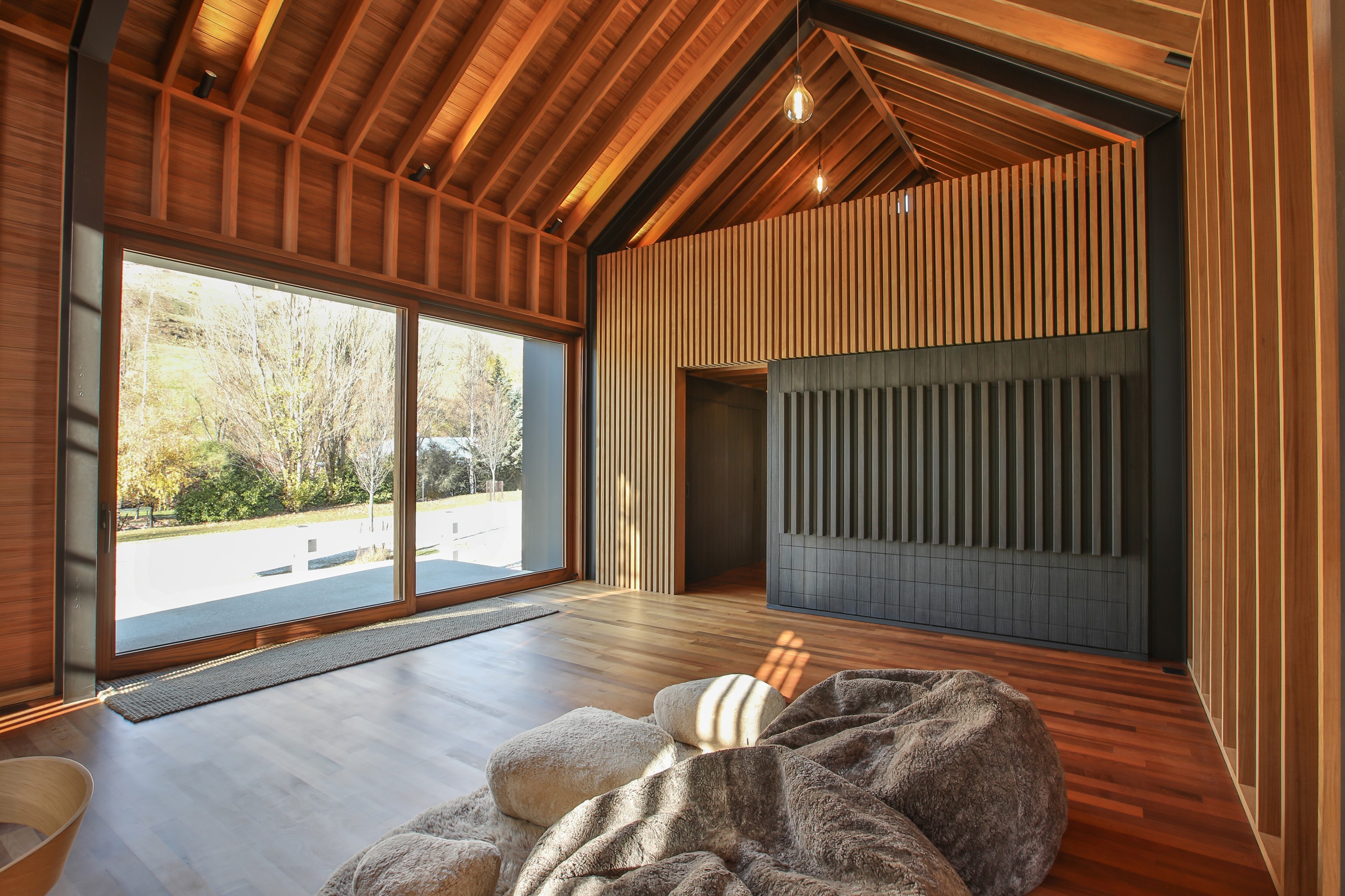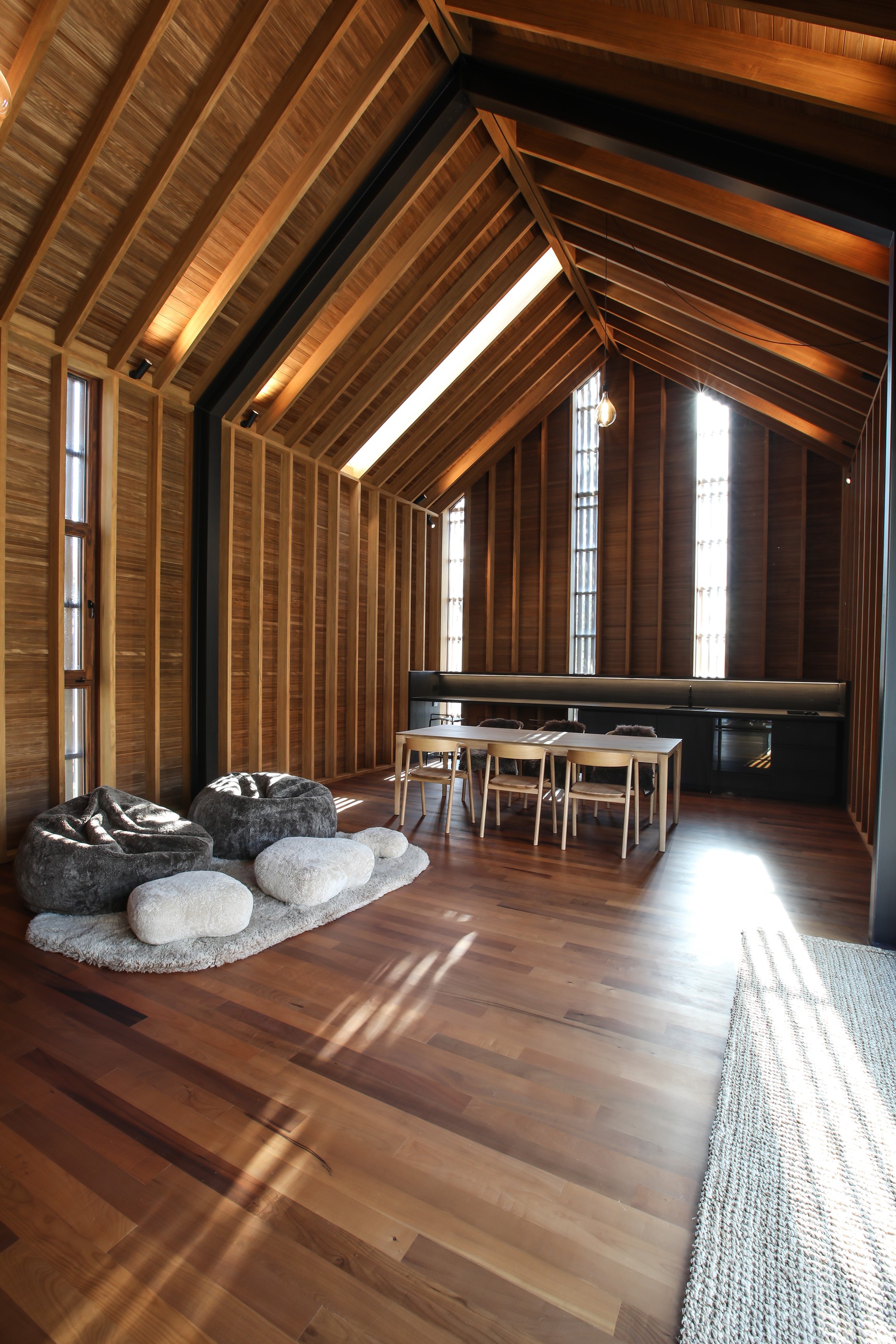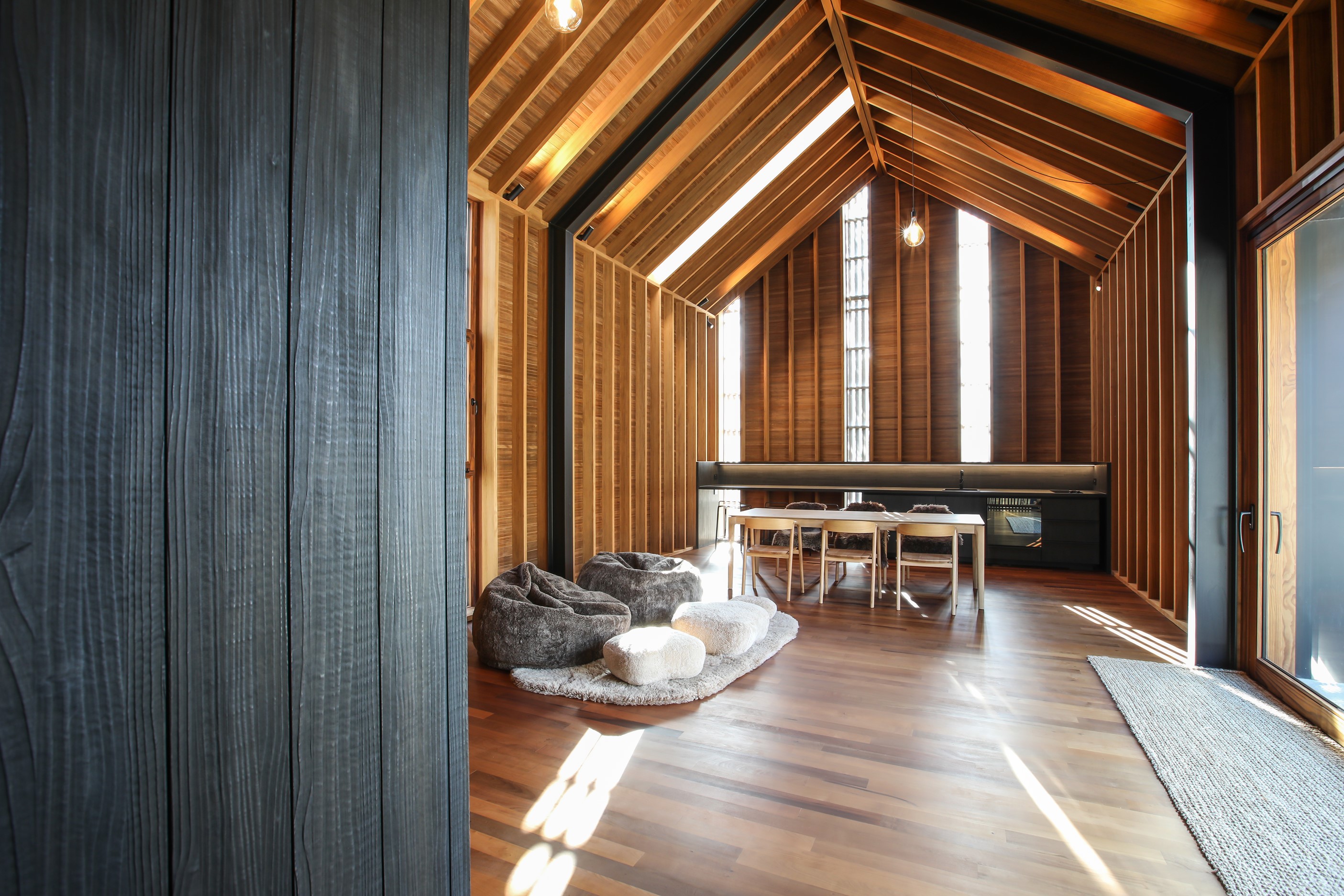 Now for something completely different. Here’s a holiday cabin that’s also a showcase of Abodo thermally modified timber products – for cladding, structure, linings, flooring, joinery, furnishing and fence posts. It’s clear from the fully exposed timber interior that precision craftsmanship is on show here too. Using heat rather than chemicals, Abodo converts rapidly renewable, locally grown radiata pine into high-performance timbers that withstand the harsh local conditions. The trees are New Zealand grown and Forest Stewardship Council (FSC®) certified. Abodo’s Vulcan Cladding is the first verified carbon-negative feature timber. The 112sqm cabin, a simple shape inspired by the Central Otago stone shed, has a high-performance thermal envelope and, had a rangehood been installed, it would have garnered a Homestar 7 rating. Step through the steel archway framing the entrance and you’ll see an open space with a bathroom and an office or bunk room. A bedroom loft above the laundry is accessed by a ladder stair. Exposed studs and rafters are positioned over tongue-and-groove walls and ceilings. Beautiful.