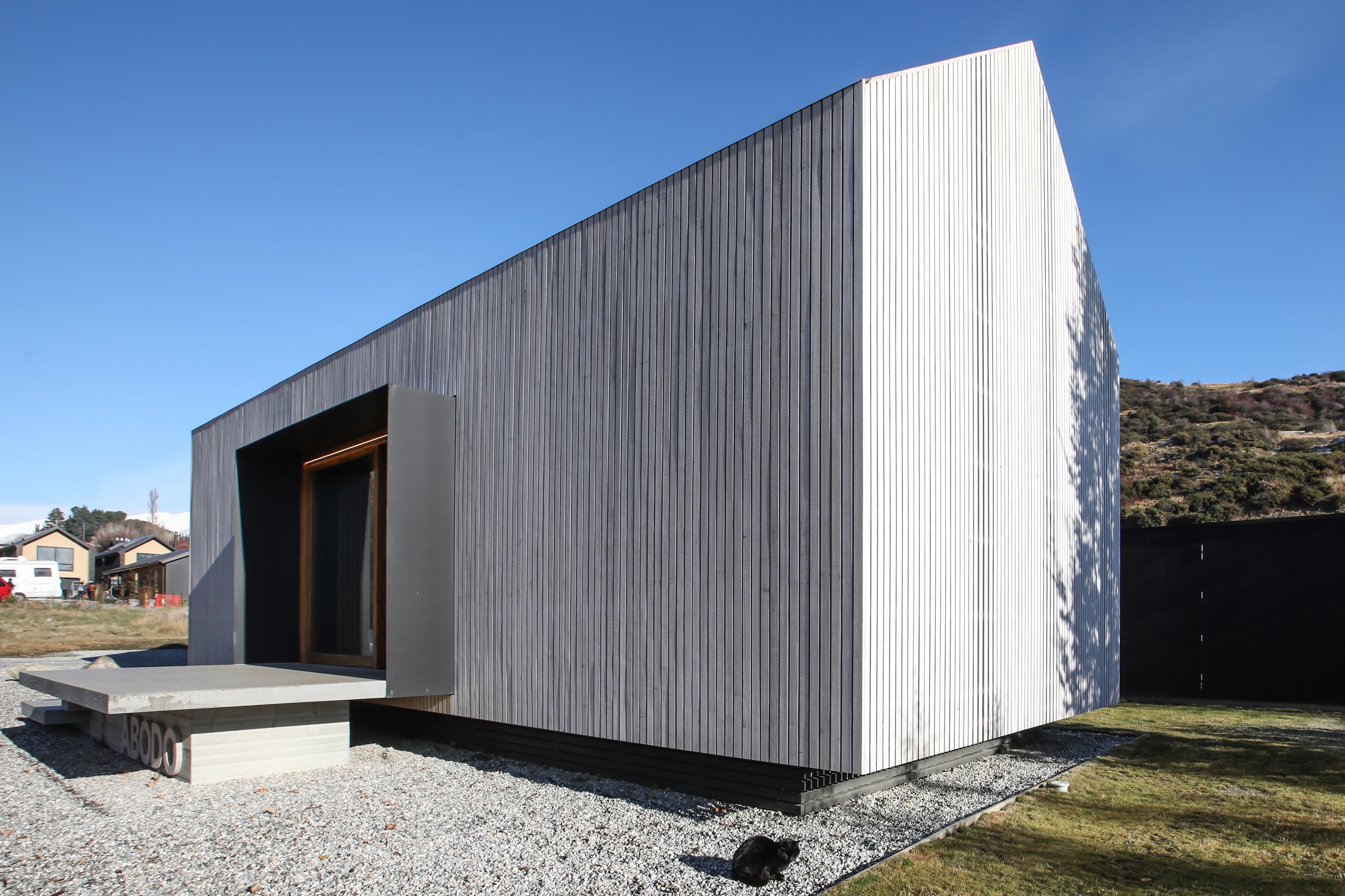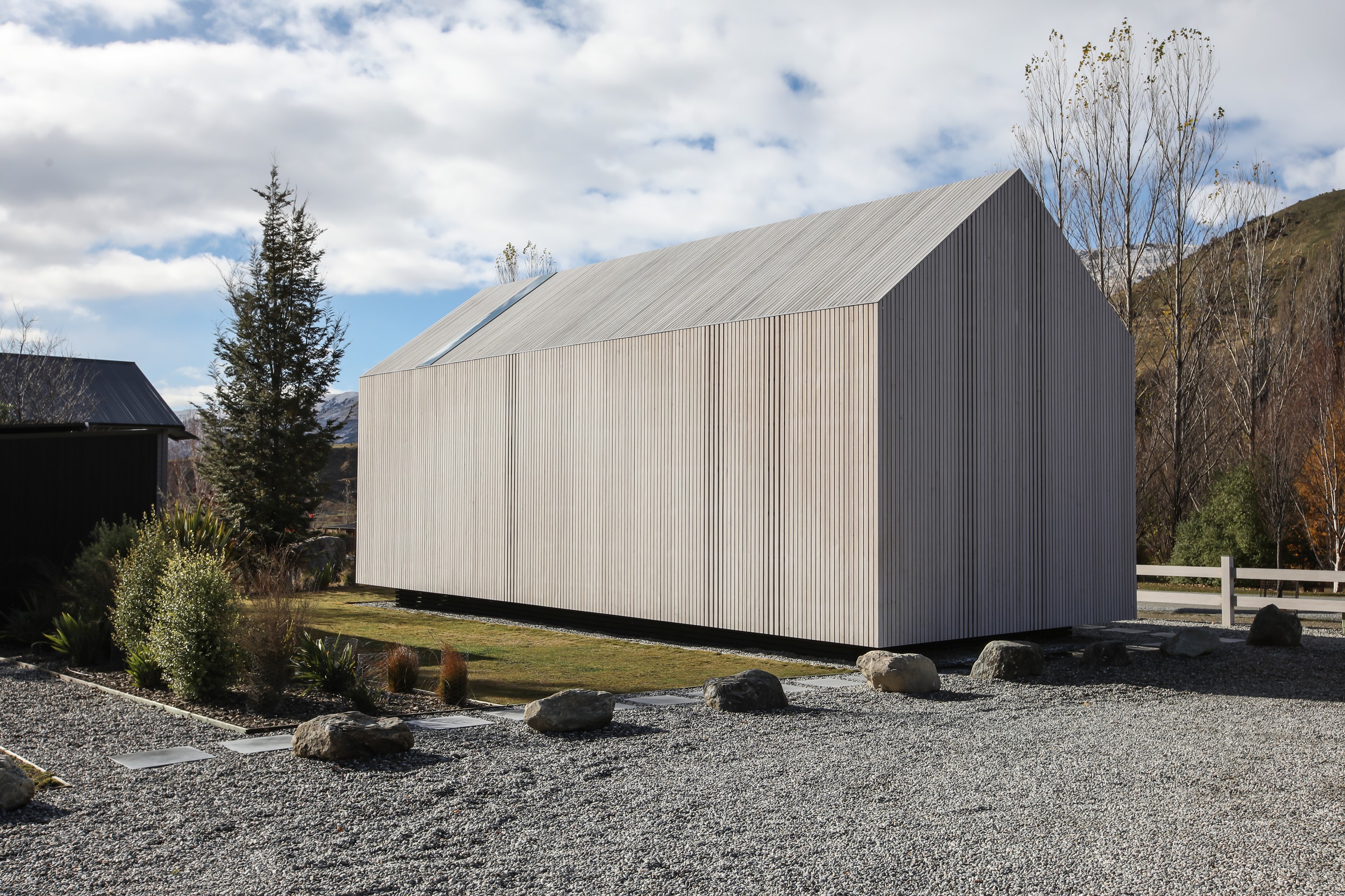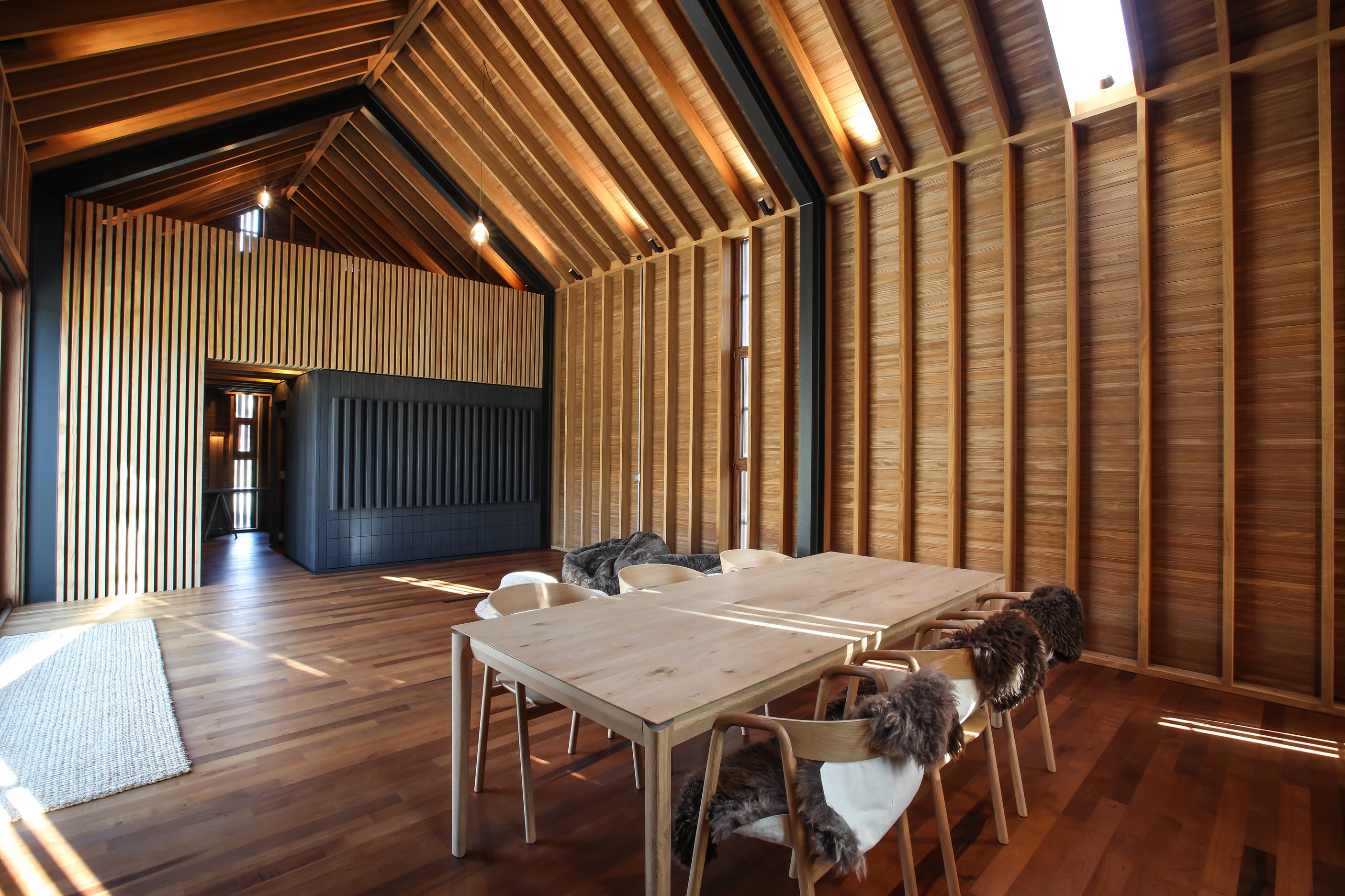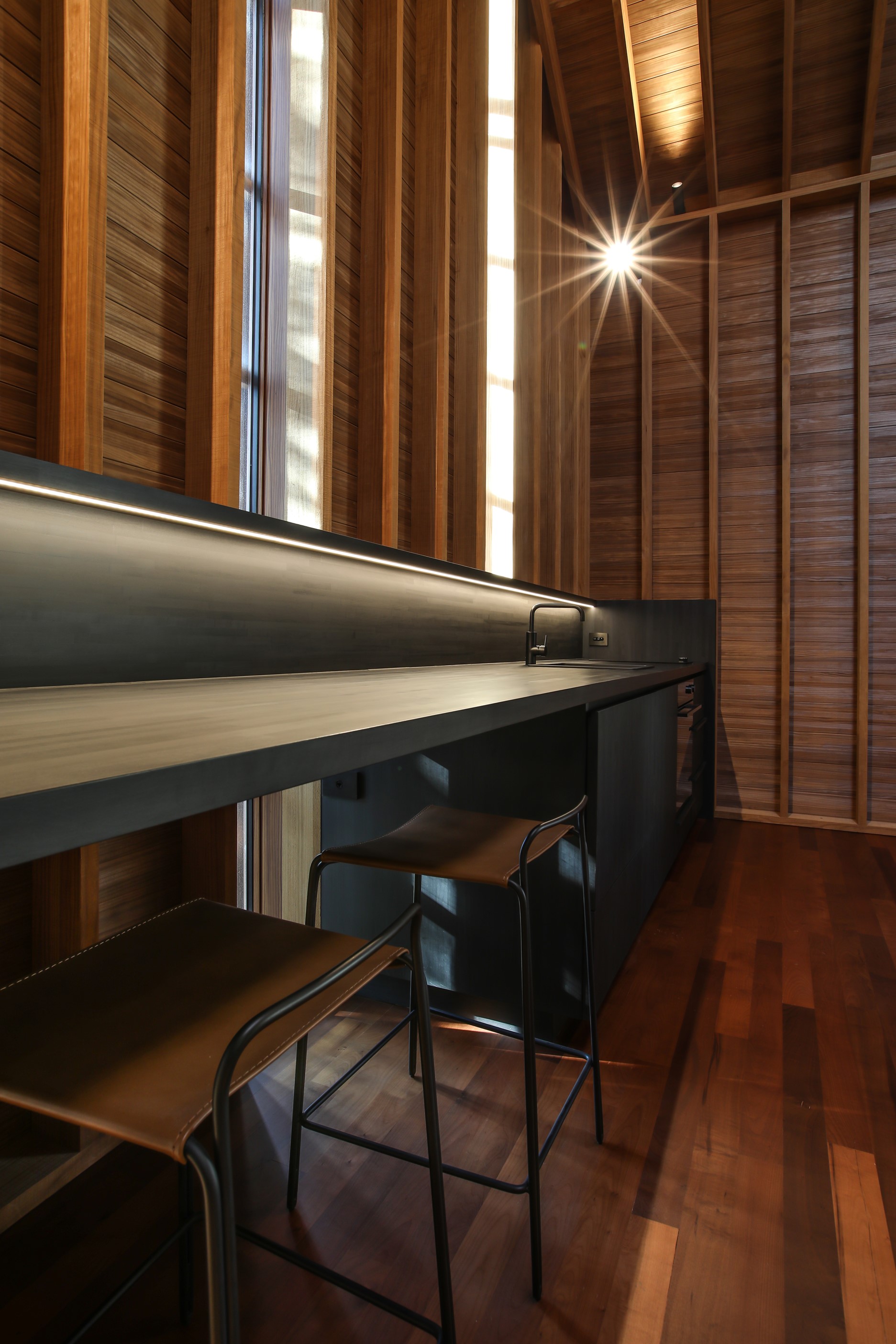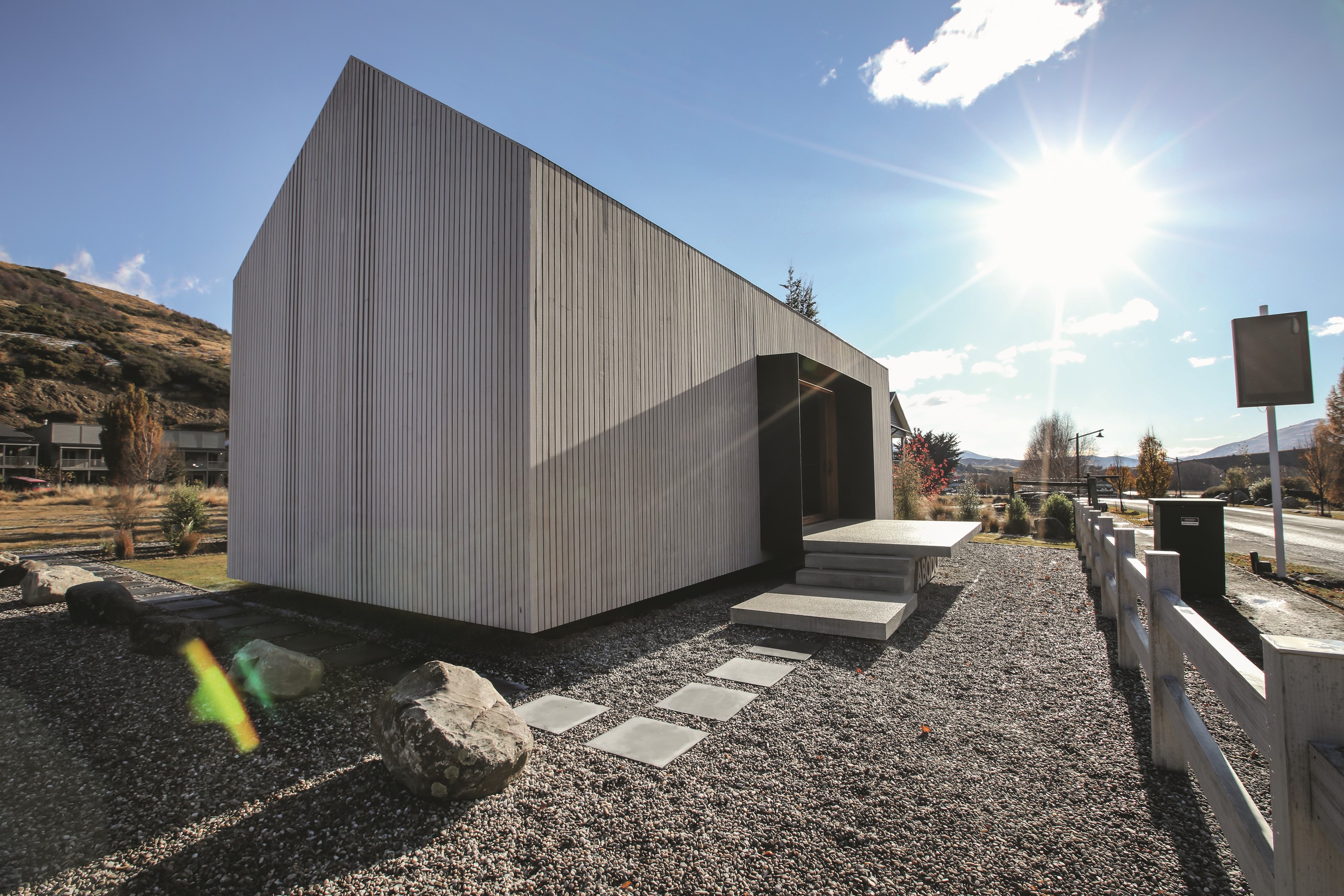 Now for something completely different. Here’s a holiday cabin that’s also a showcase of Abodo thermally modified timber products – for cladding, structure, linings, flooring, joinery, furnishing and fence posts. It’s clear from the fully exposed timber interior that precision craftsmanship is on show here too. Using heat rather than chemicals, Abodo converts rapidly renewable, locally grown radiata pine into high-performance timbers that withstand the harsh local conditions. The trees are New Zealand grown and Forest Stewardship Council (FSC®) certified. Abodo’s Vulcan Cladding is the first verified carbon-negative feature timber. The 112sqm cabin, a simple shape inspired by the Central Otago stone shed, has a high-performance thermal envelope and, had a rangehood been installed, it would have garnered a Homestar 7 rating. Step through the steel archway framing the entrance and you’ll see an open space with a bathroom and an office or bunk room. A bedroom loft above the laundry is accessed by a ladder stair. Exposed studs and rafters are positioned over tongue-and-groove walls and ceilings. Beautiful.