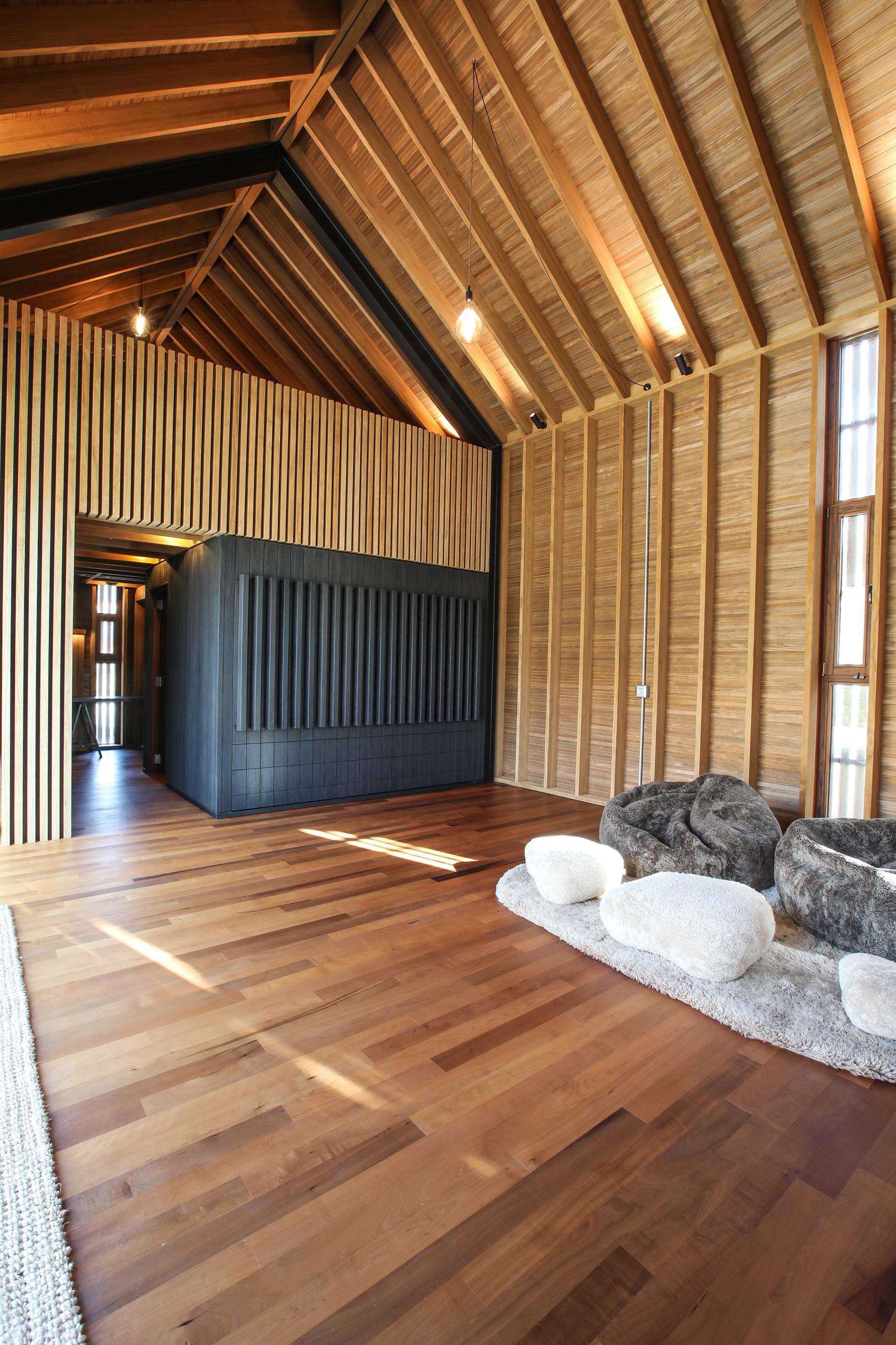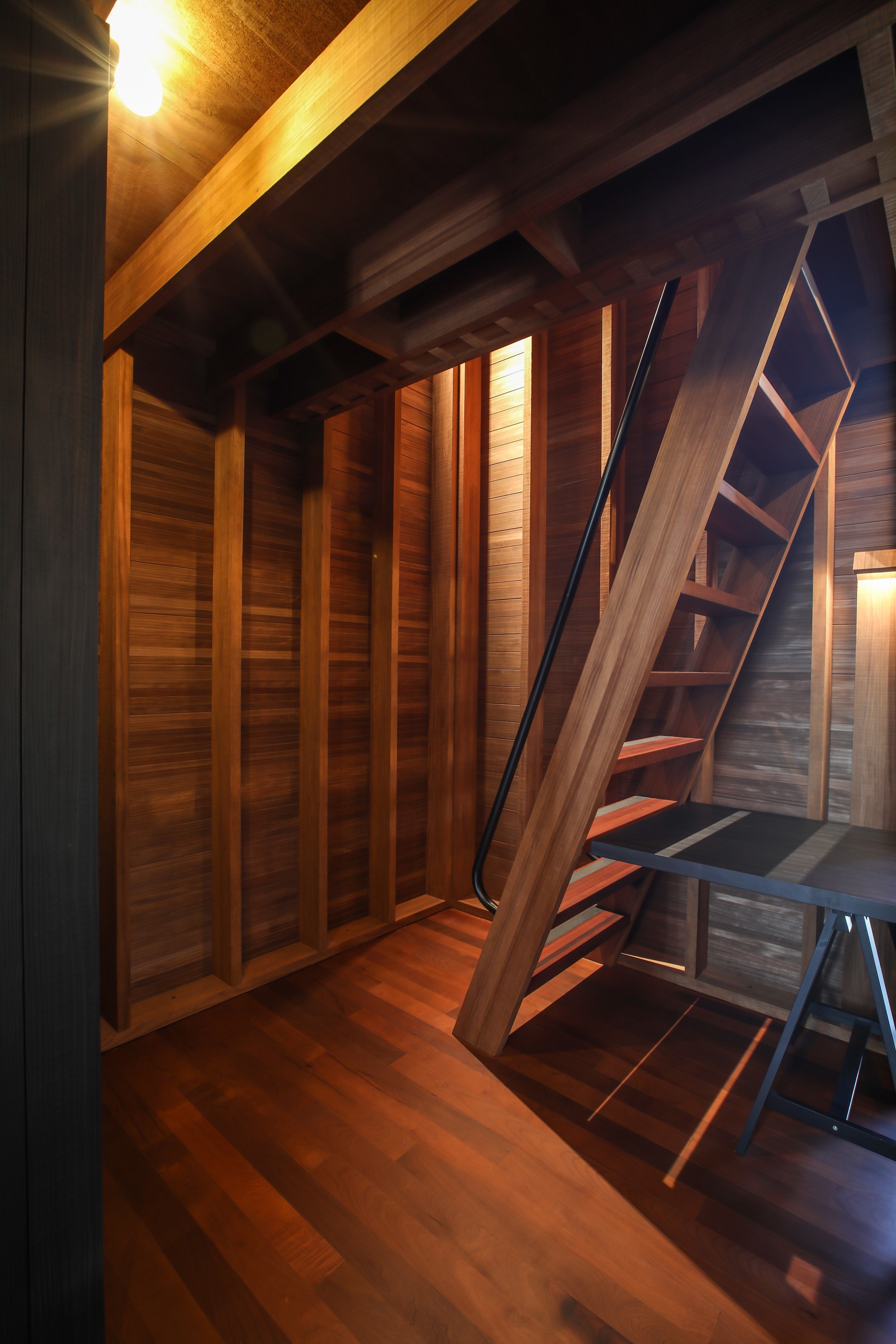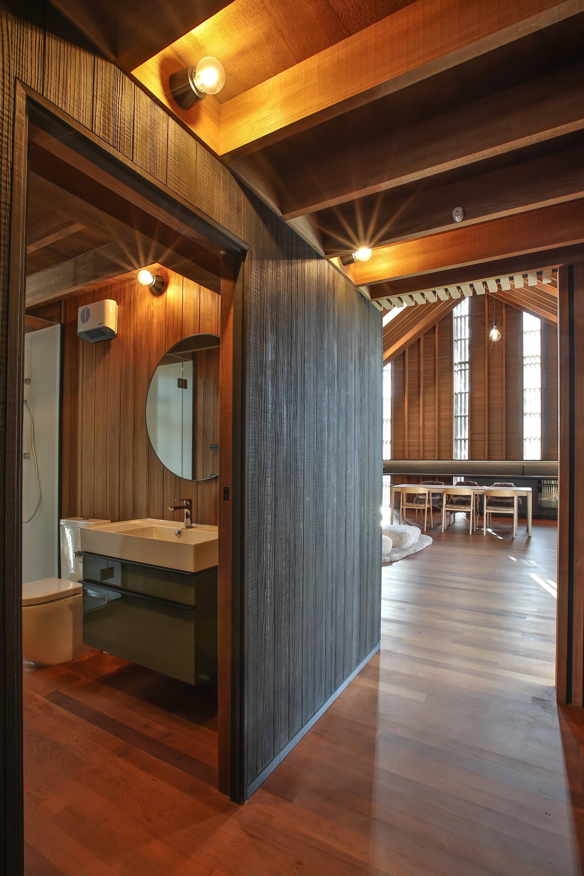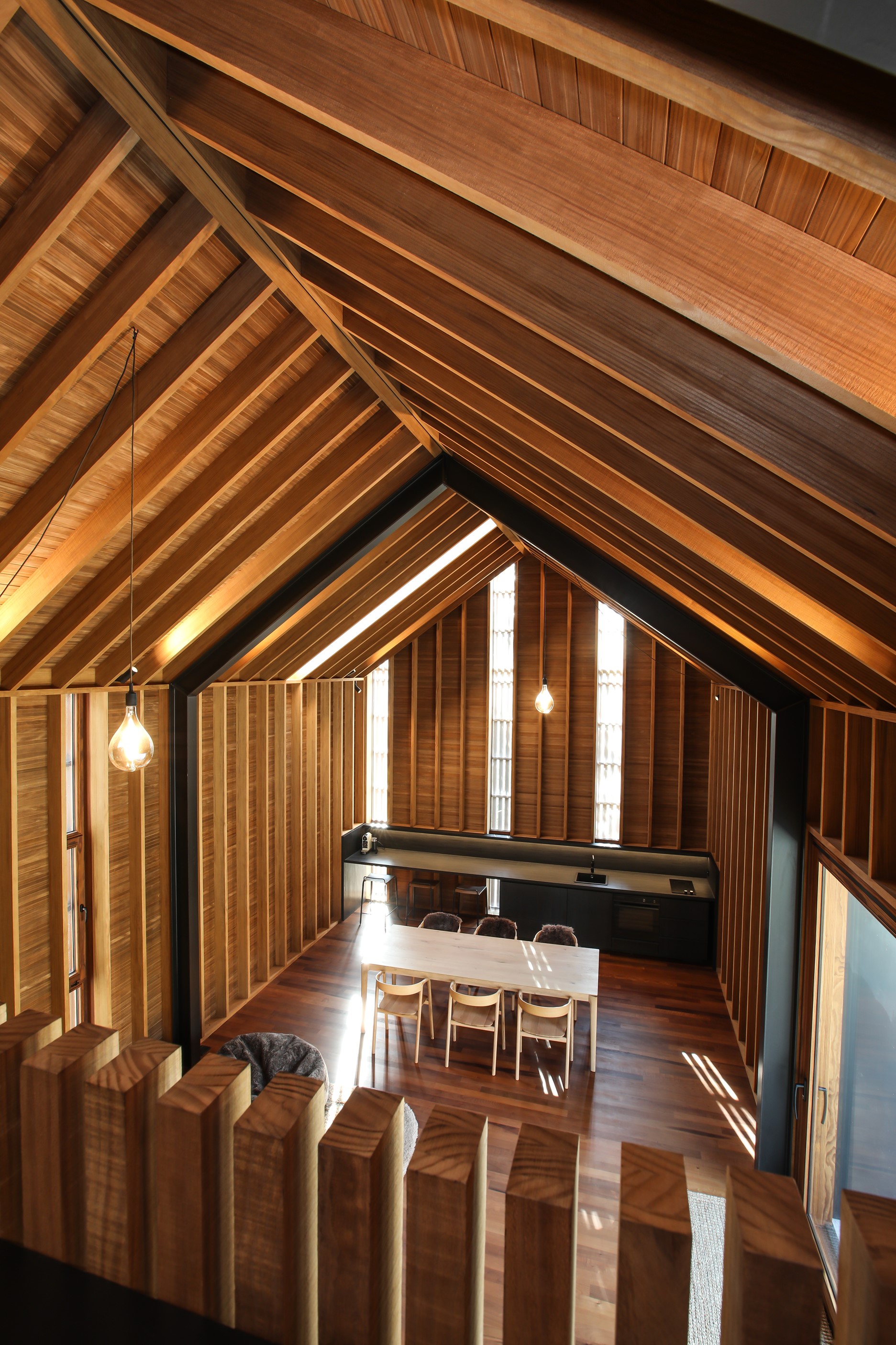 Now for something completely different. Here’s a holiday cabin that’s also a showcase of Abodo thermally modified timber products – for cladding, structure, linings, flooring, joinery, furnishing and fence posts. It’s clear from the fully exposed timber interior that precision craftsmanship is on show here too. Using heat rather than chemicals, Abodo converts rapidly renewable, locally grown radiata pine into high-performance timbers that withstand the harsh local conditions. The trees are New Zealand grown and Forest Stewardship Council (FSC®) certified. Abodo’s Vulcan Cladding is the first verified carbon-negative feature timber. The 112sqm cabin, a simple shape inspired by the Central Otago stone shed, has a high-performance thermal envelope and, had a rangehood been installed, it would have garnered a Homestar 7 rating. Step through the steel archway framing the entrance and you’ll see an open space with a bathroom and an office or bunk room. A bedroom loft above the laundry is accessed by a ladder stair. Exposed studs and rafters are positioned over tongue-and-groove walls and ceilings. Beautiful.