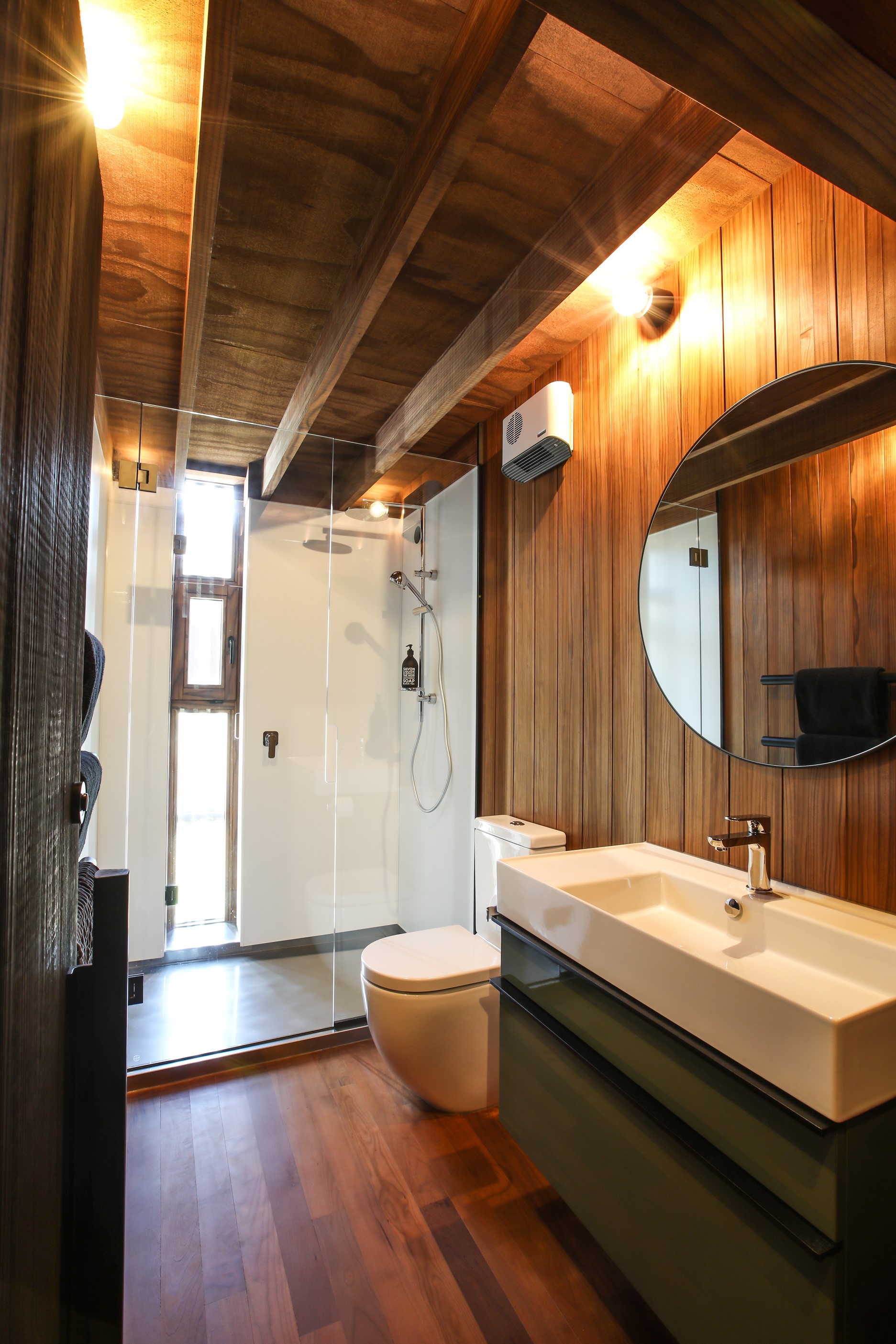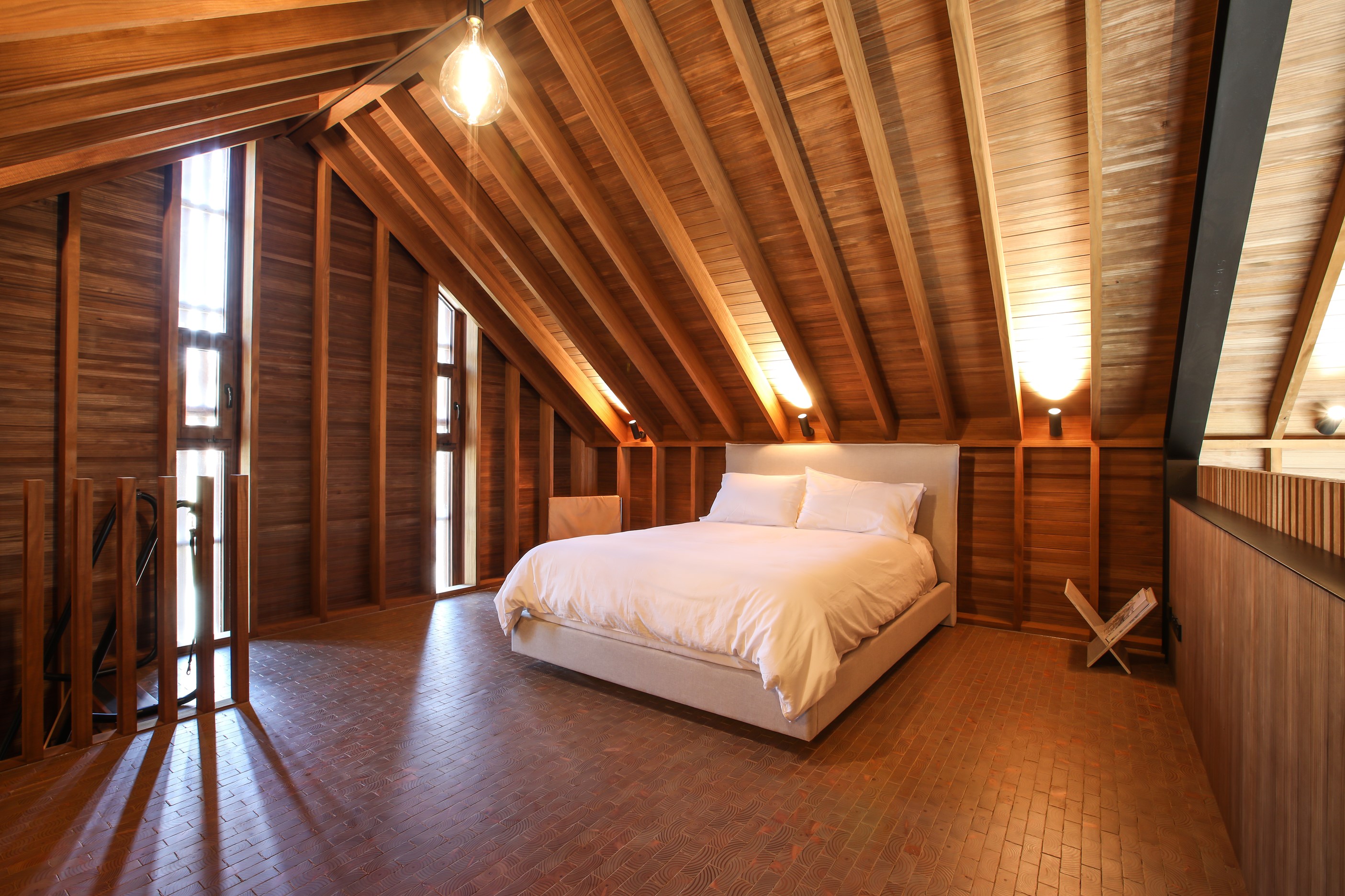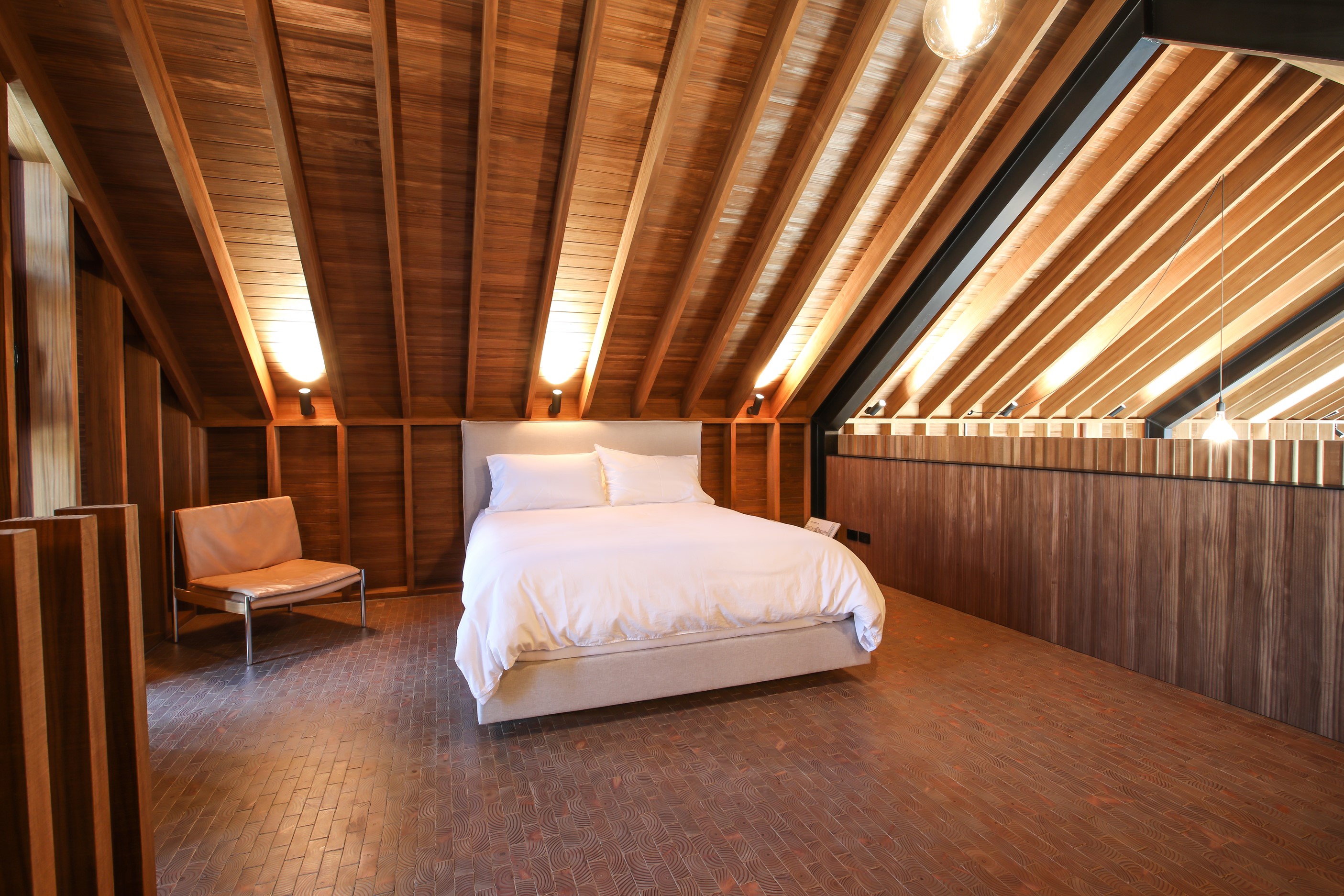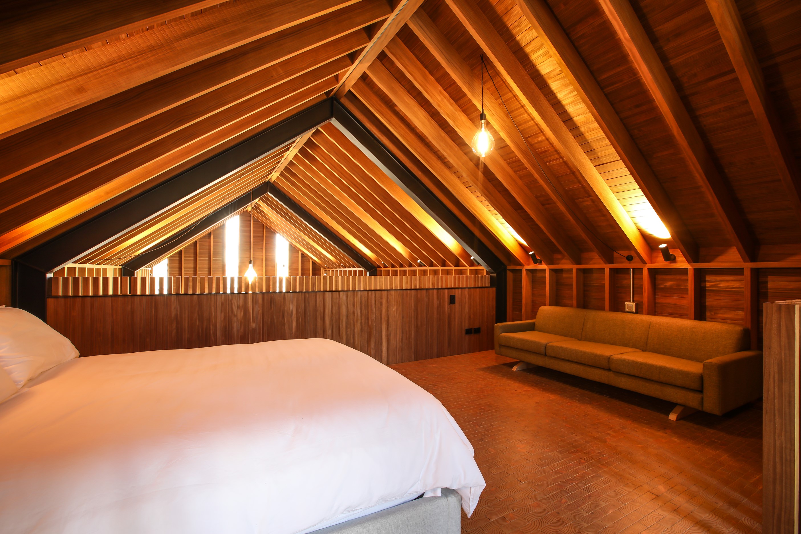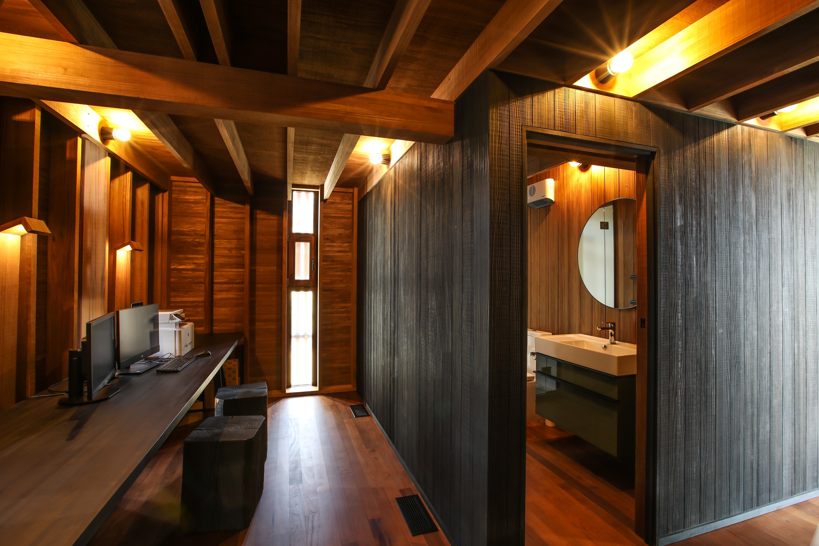 Now for something completely different. Here’s a holiday cabin that’s also a showcase of Abodo thermally modified timber products – for cladding, structure, linings, flooring, joinery, furnishing and fence posts. It’s clear from the fully exposed timber interior that precision craftsmanship is on show here too. Using heat rather than chemicals, Abodo converts rapidly renewable, locally grown radiata pine into high-performance timbers that withstand the harsh local conditions. The trees are New Zealand grown and Forest Stewardship Council (FSC®) certified. Abodo’s Vulcan Cladding is the first verified carbon-negative feature timber. The 112sqm cabin, a simple shape inspired by the Central Otago stone shed, has a high-performance thermal envelope and, had a rangehood been installed, it would have garnered a Homestar 7 rating. Step through the steel archway framing the entrance and you’ll see an open space with a bathroom and an office or bunk room. A bedroom loft above the laundry is accessed by a ladder stair. Exposed studs and rafters are positioned over tongue-and-groove walls and ceilings. Beautiful.