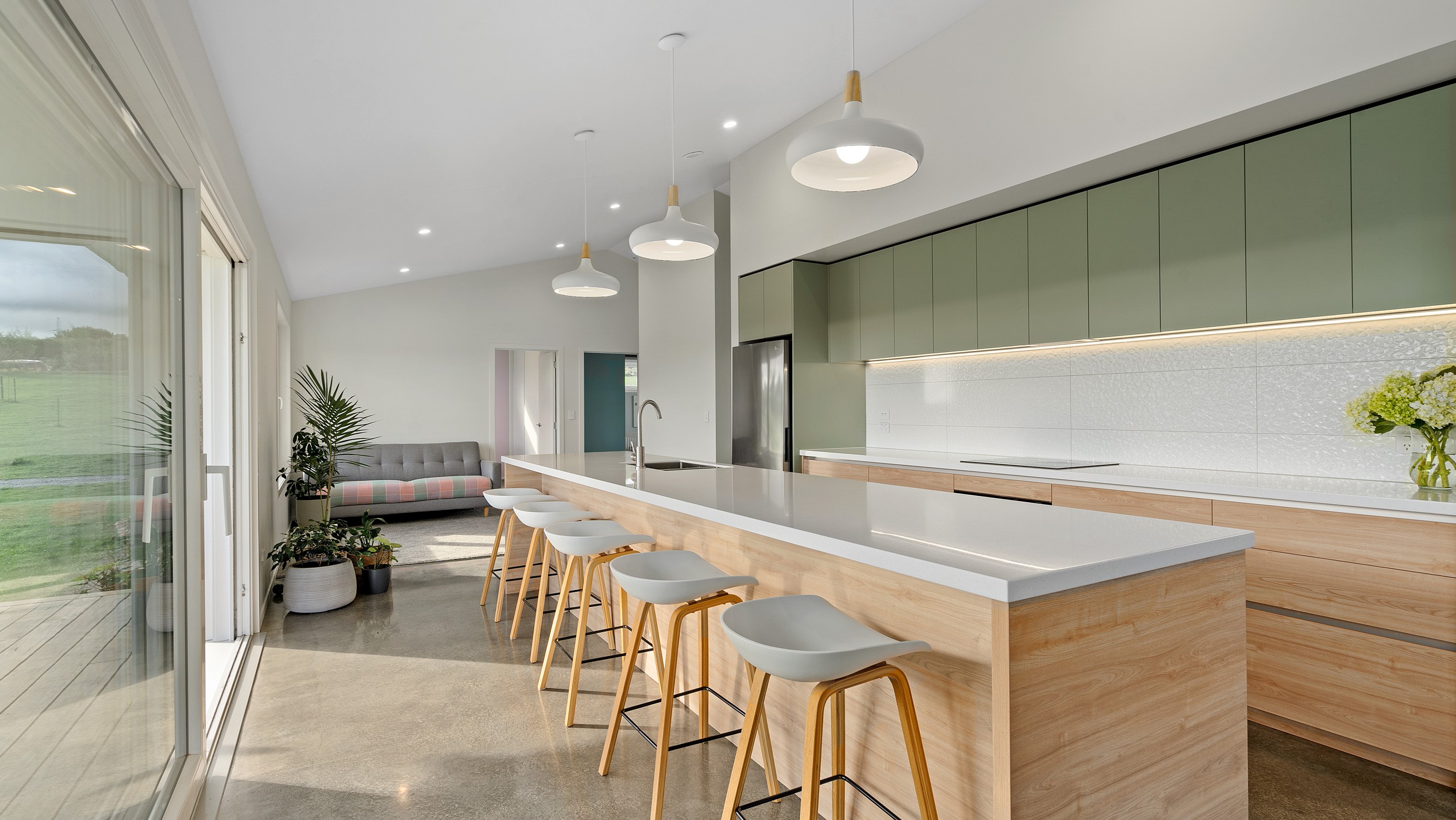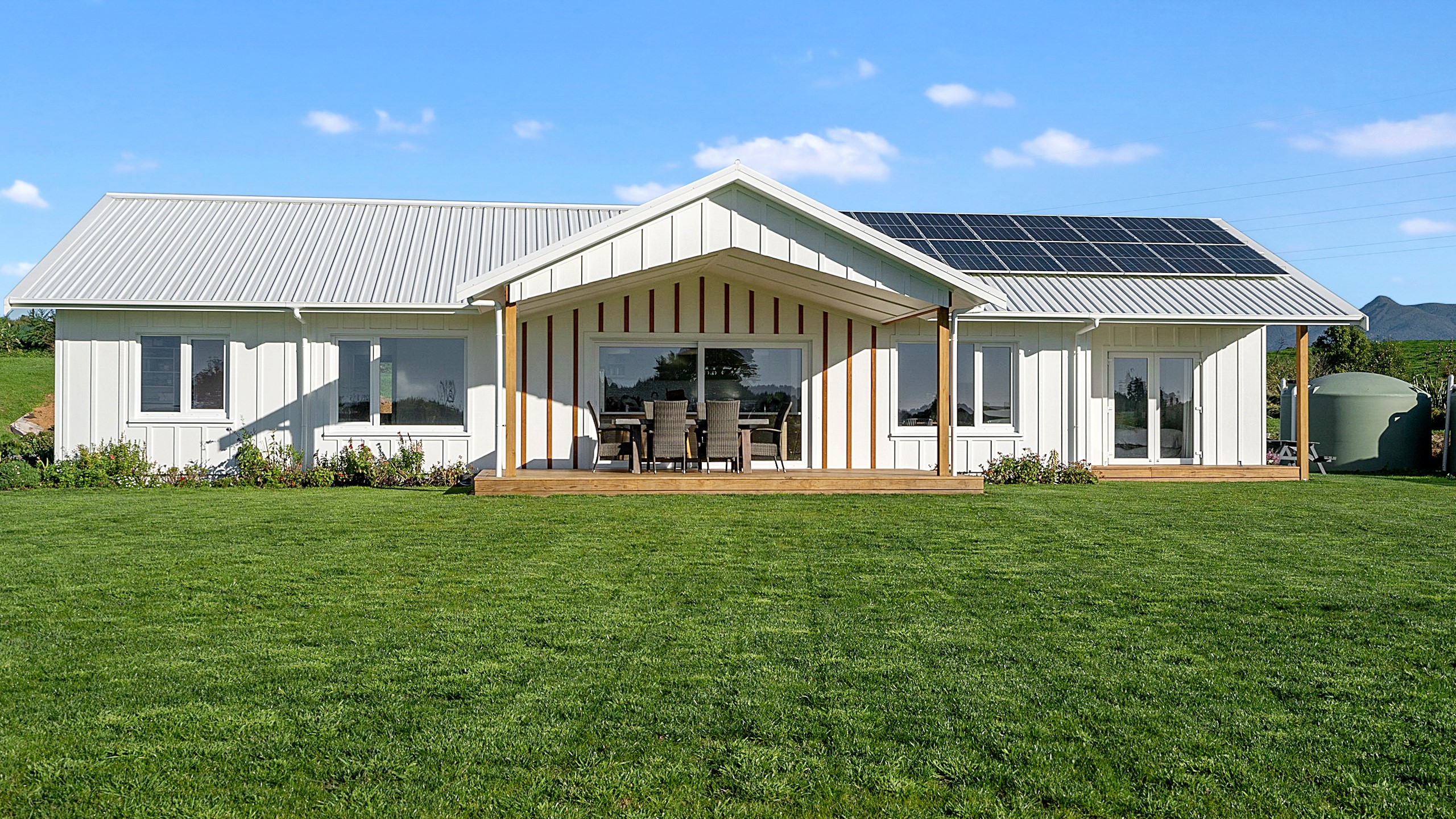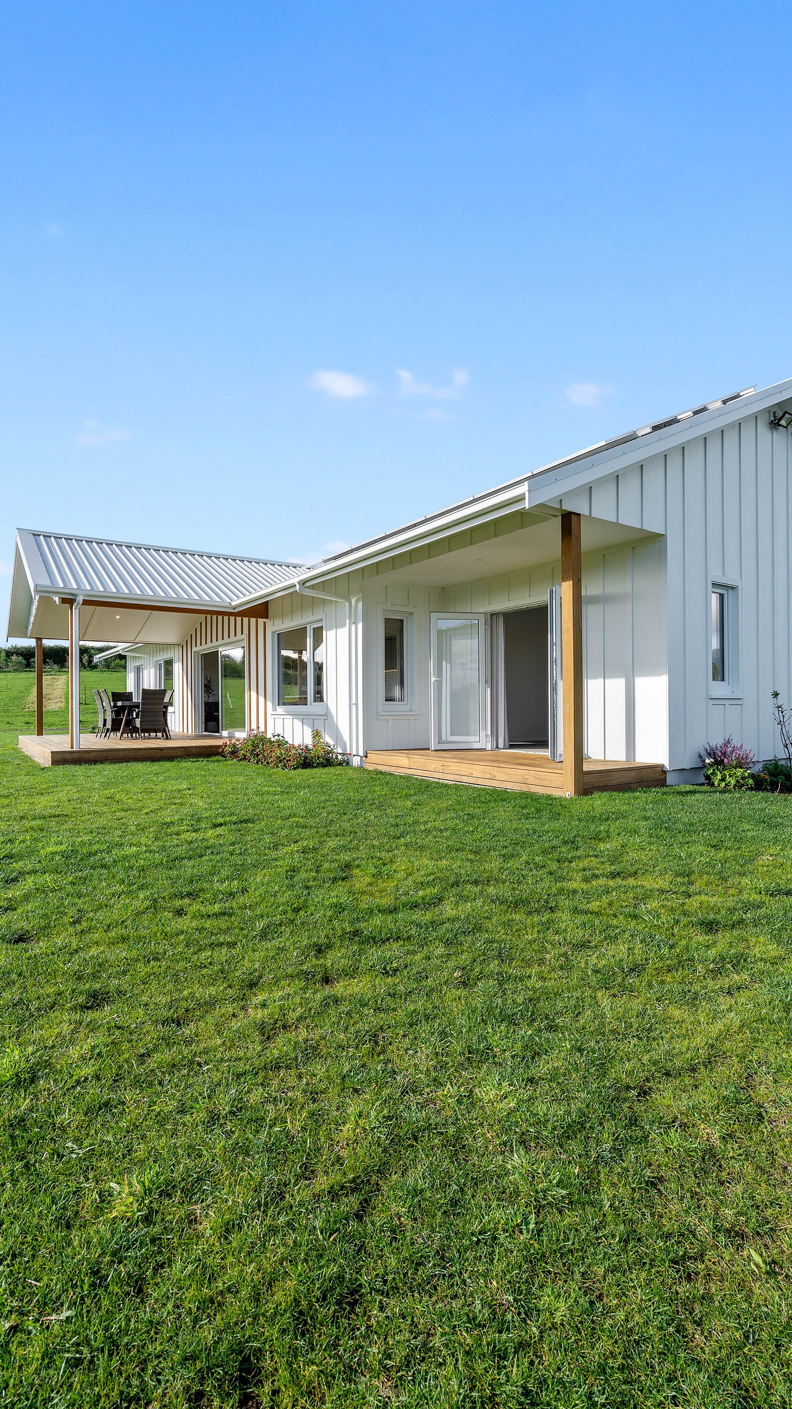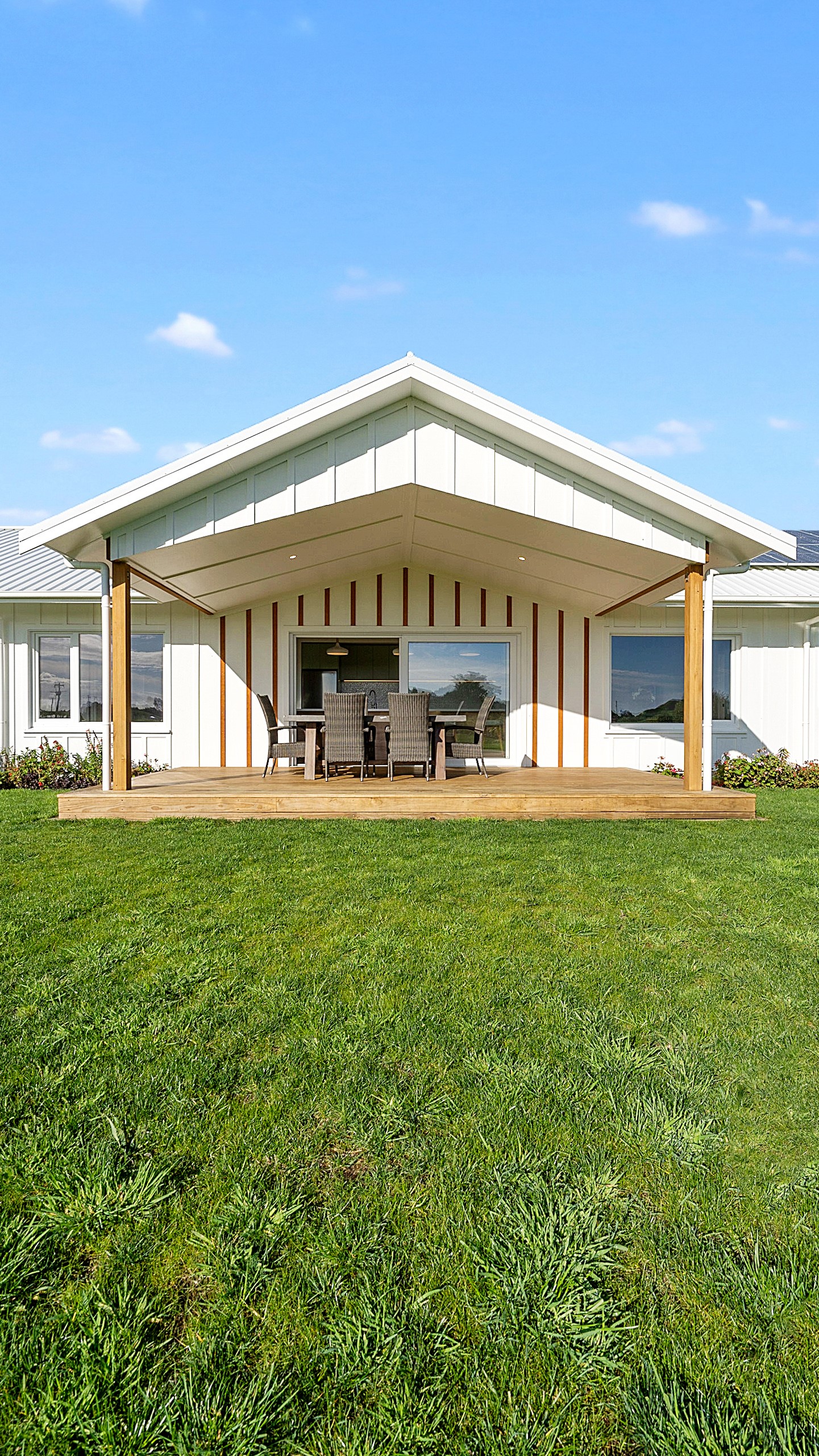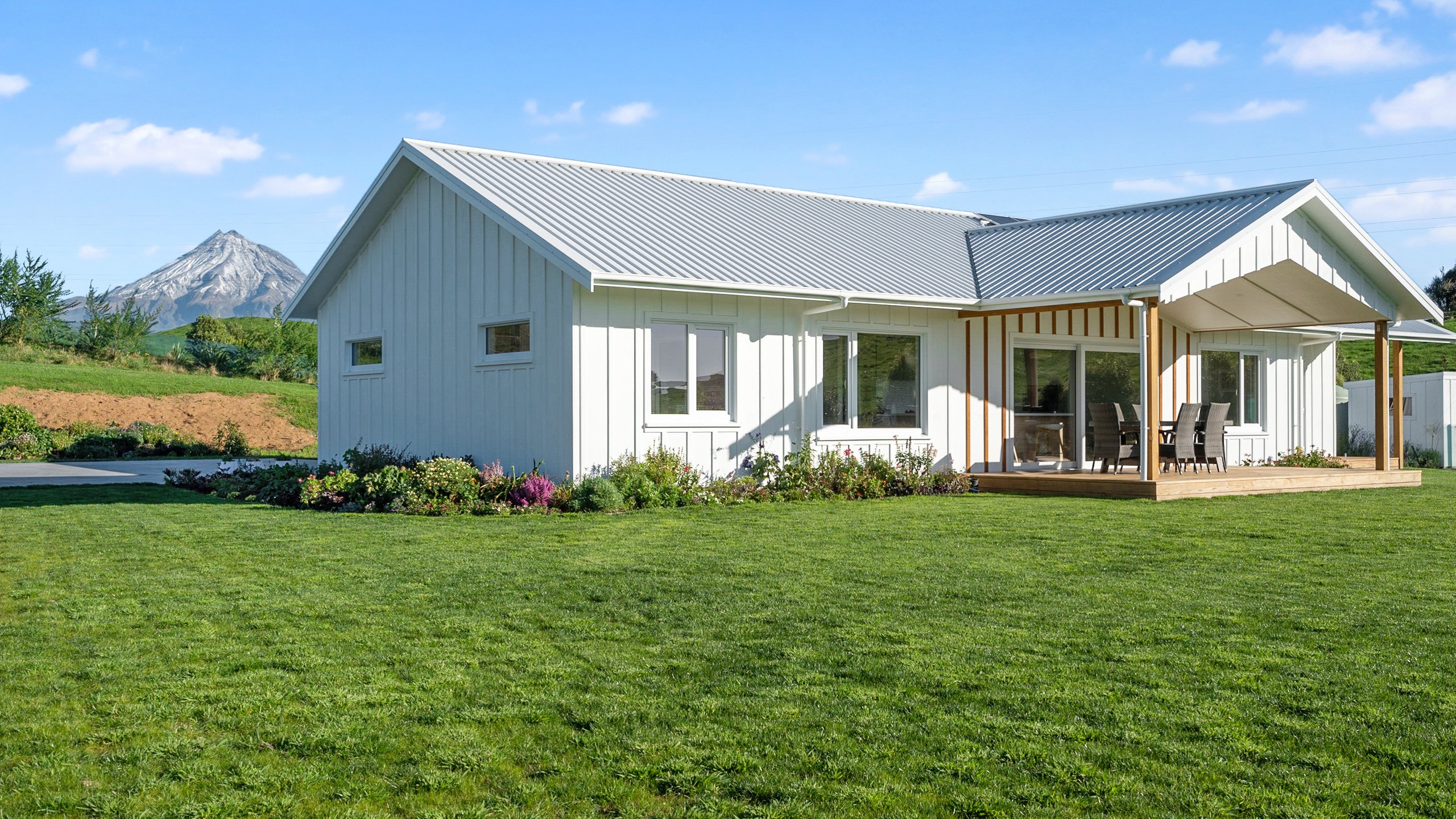 With a backdrop of rolling green hills and tranquil countryside, this four-bedroom, two-bathroom rural home is perfectly positioned for a young family. The design, with a 200sqm footprint, has been cleverly thought out to minimise wasted space and maximise family harmony. High-raking ceilings combine with open-plan living and large windows to create a sense of space and light. The living area opens out to a portico for all-weather entertaining. Meeting the internationally recognised Passive House standard, the home delivers comfort, health and energy efficiency to the occupants. The heat recovery ventilation system works quietly in the background, allowing for a constant supply of fresh air. In addition, uPVC joinery adds to the energy efficiency of the home, while enhancing the cottage-vibe aesthetic. Outside, white board-and-batten cladding with natural detailing and a gabled portico give a nod to Mount Taranaki sitting majestically in the background. With an orchard and edible gardens, the homeowners can enjoy healthy eating and time outdoors.